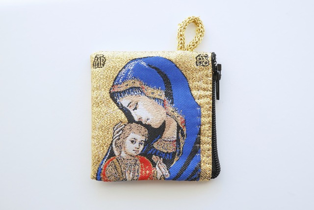 マリア様とイエスキリストの絵柄が施されています。 ジッパー付きなのでタンブルやアクセサリーなど、小物入れとしてお使いいただけます。 両面同じ絵柄です。 7.2cm x 6.5cm
