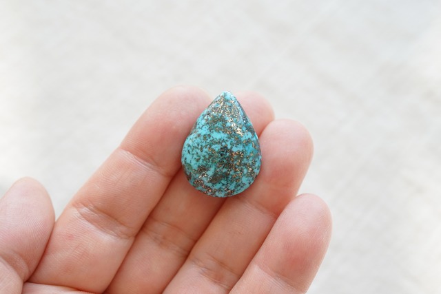 イラン・ケルマン州で産出された美しいブルーのターコイズ。カボションになっていますので、背面は平らです。こちらは涙型で全体満遍なくパイライトが入っています。ブルーとパイライトのコントラストが素敵です。 27 x 20 x 9 mm イラン産