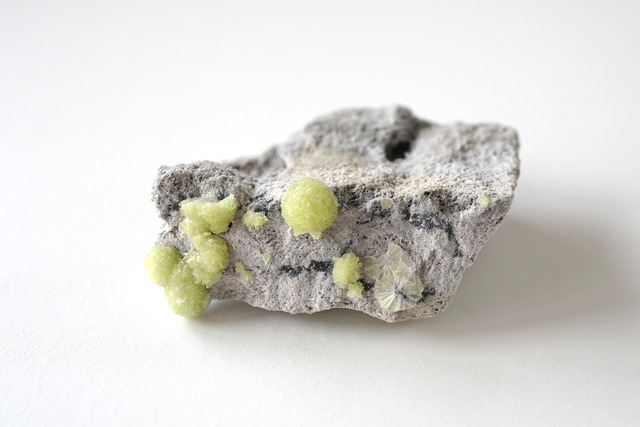 ワーベライトはリン酸塩鉱物の一種で、主に燐灰石が変化してできる二次鉱物です。針状の結晶が放射状に集合して球状やブドウ状の形になることが多く、その断面が放射状の光沢を放ち、夜空の星や花火のように見えることから、和名は「銀星石(ぎんせいせき)」と名付けられました。1805年、発見者のイギリス人医師ウィリアム・ワーベル氏にちなんで命名されています。 43 x 40 x 15 mm アメリカ産