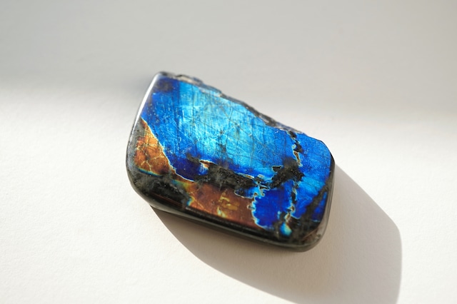 青い輝きがまぶしい卓上ラブラドライト。どっしりと重みと厚みがあります。真正面から見てもほんのり青いのがわかります。角度を少し動かせばたちまちシラーが輝きます。 https://youtube.com/shorts/hcZr06WKTh8 59 x 83 x 56 mm マダガスカル産