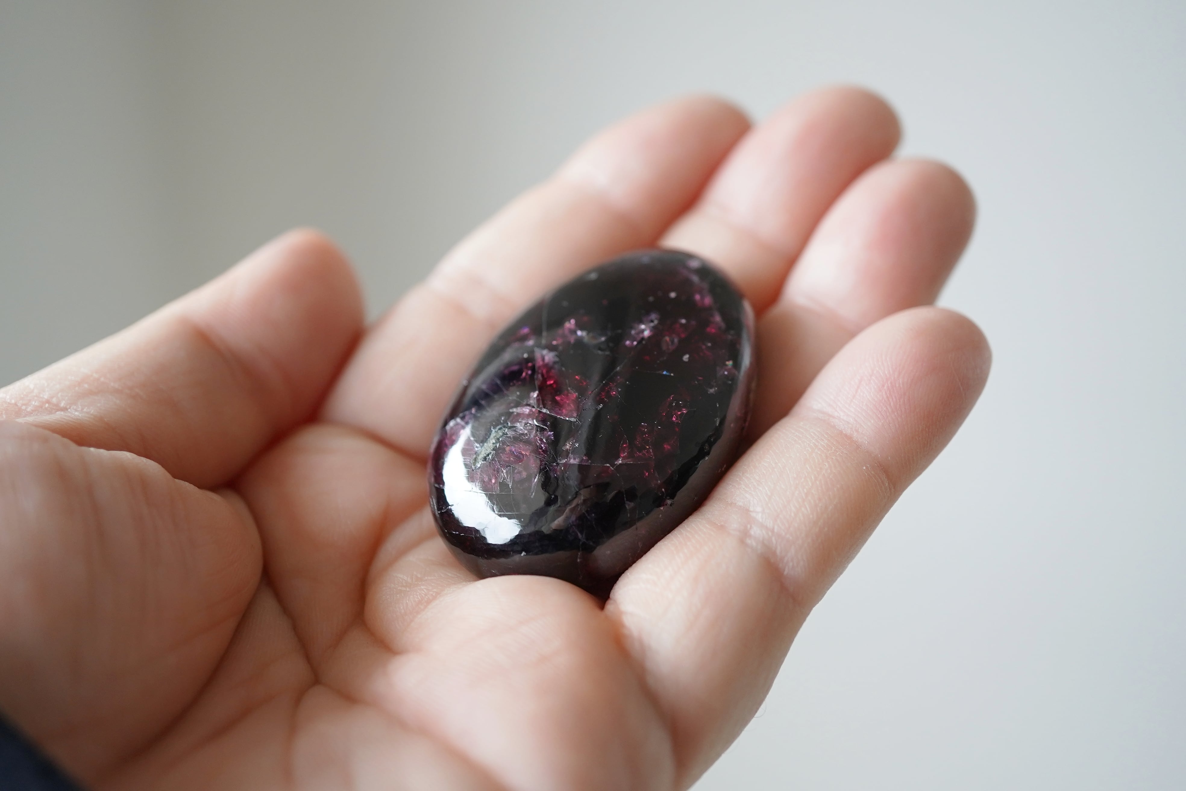 赤ワインのような赤をしたガーネットの握り石。ガーネットの石言葉は燃える情熱的な赤色から「一途な愛」や、みなぎる血の色として「生命力」と言われています。1月の誕生石としても身近に感じる石の一つです。ガーネットと人との関わりはとても古く、数千年前、赤いガーネットのネックレスはエジプト・ファラオの首を飾りであり、ミイラの遺体と共に来世への貴重な宝物として埋葬されました。古代ローマでは重要な文書を保管するための蝋印にガーネットの彫刻が施された印章指輪が用いられました。