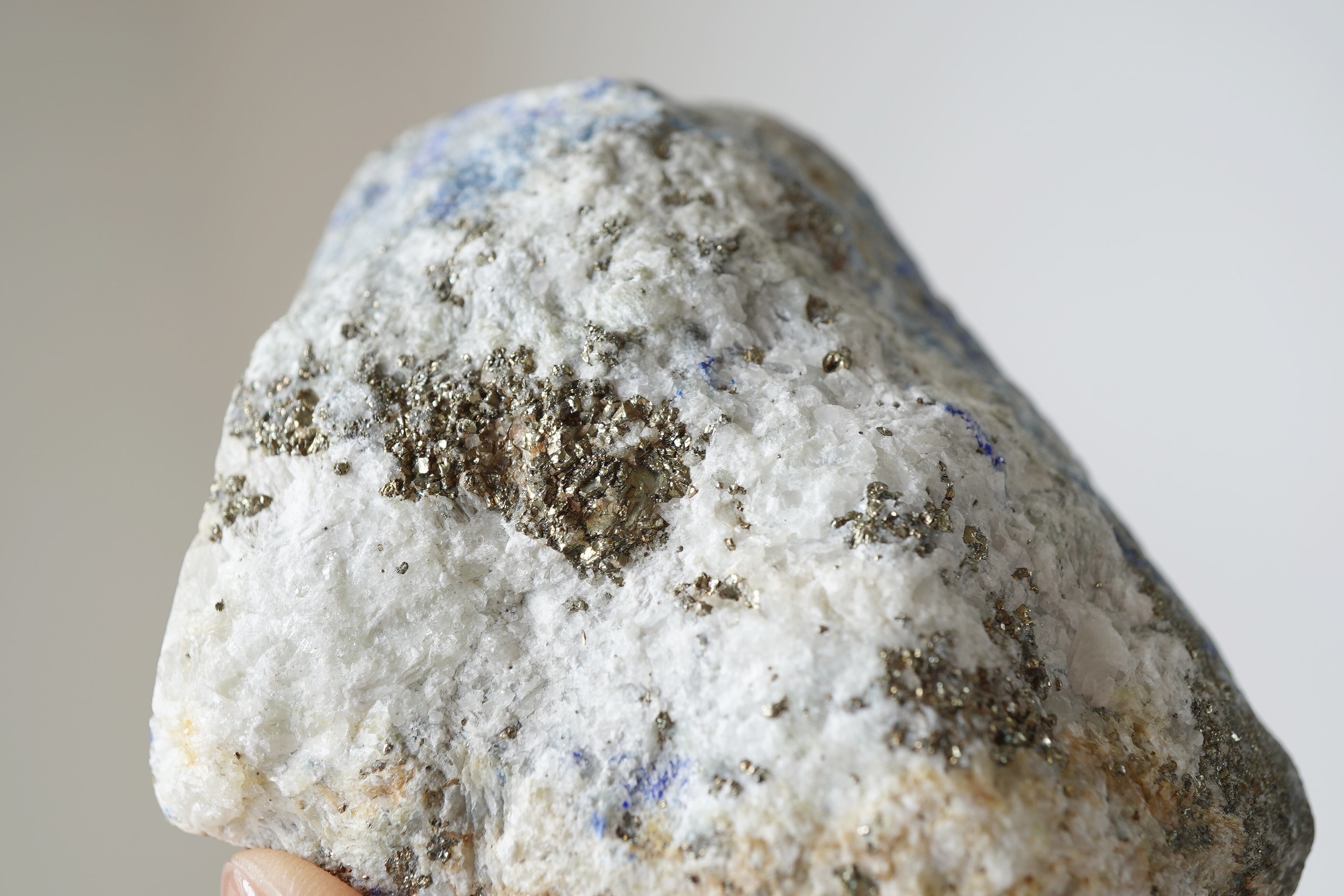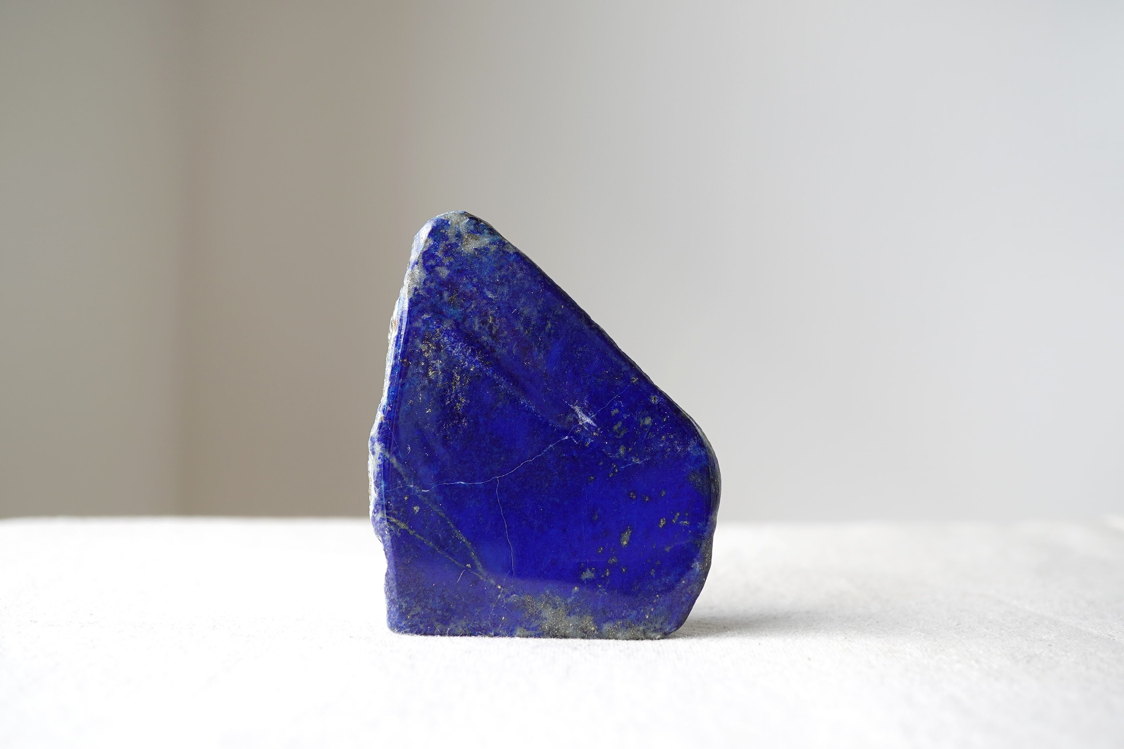 ラピスラズリはカルサイト、ソーダライト、アズライト、パイライトなど、いろんな鉱物が混ざり合って成り立っています。青が強いとラズライトとソーダライトの含有量が多いことが考えられます。片面が磨き、片面は原石のままとなっています。安定して自立するので置きやすいです。