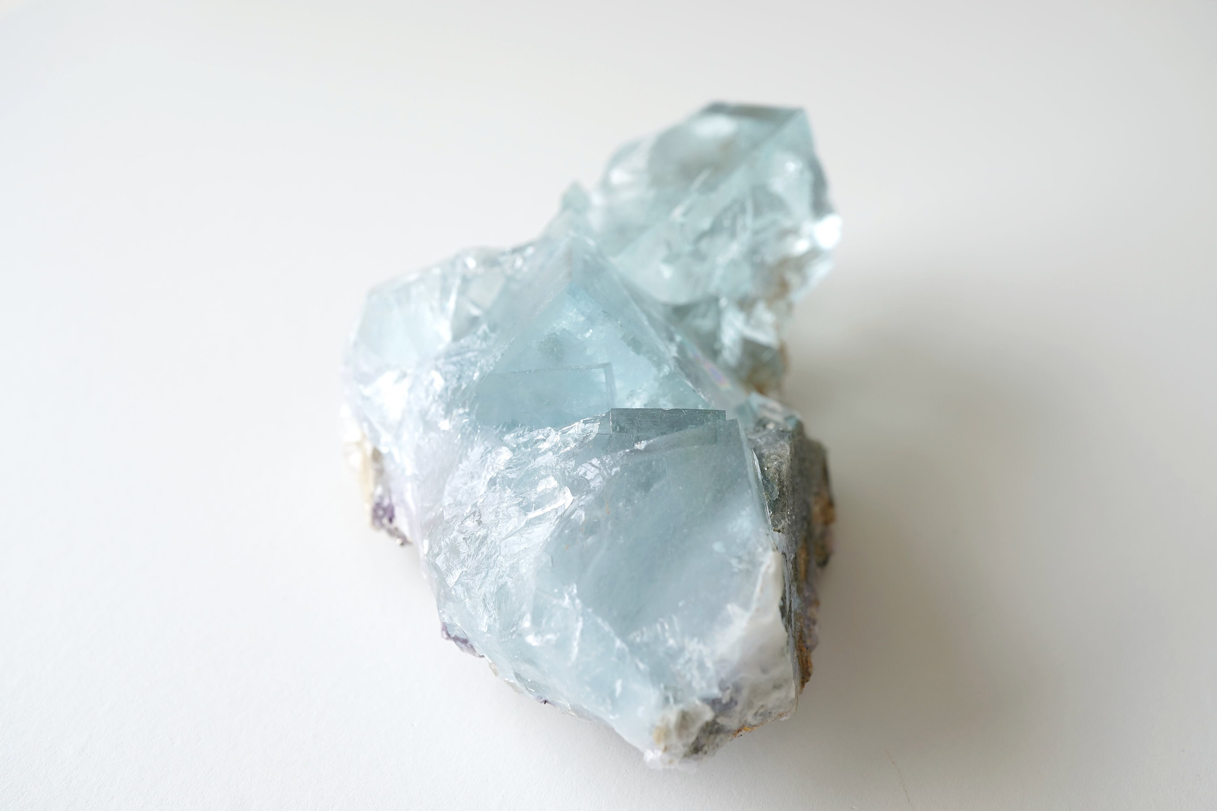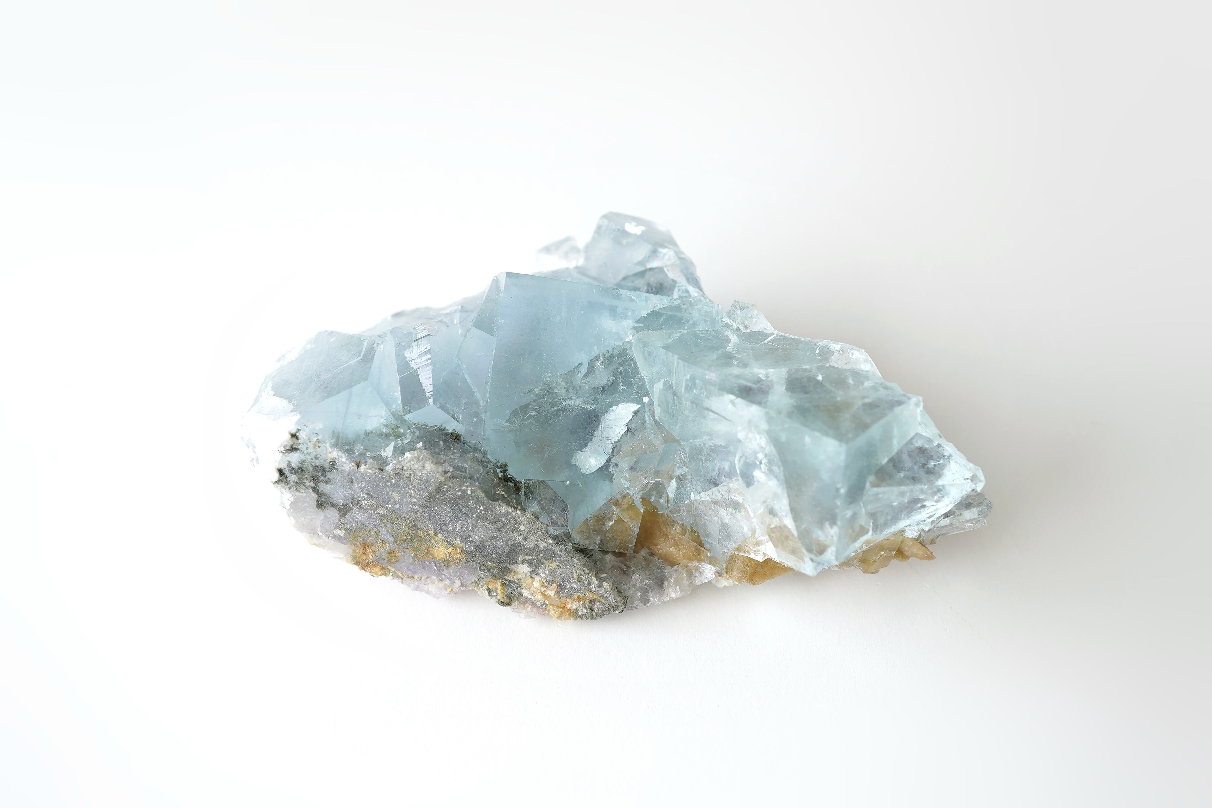 見るからにセレスタイトかと思えてしまう淡いブルーのフローライトです。底にはパイライトもくっついています。