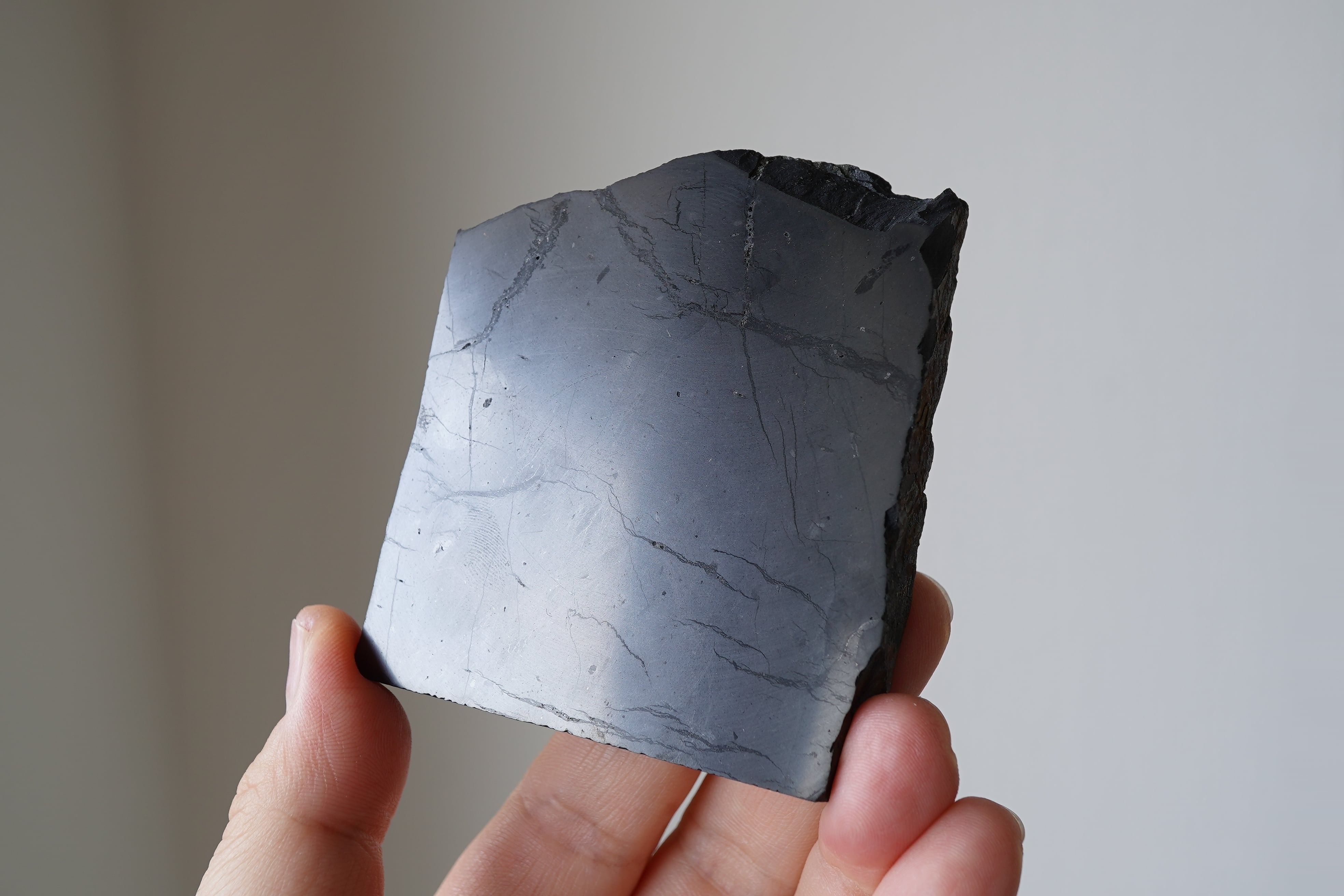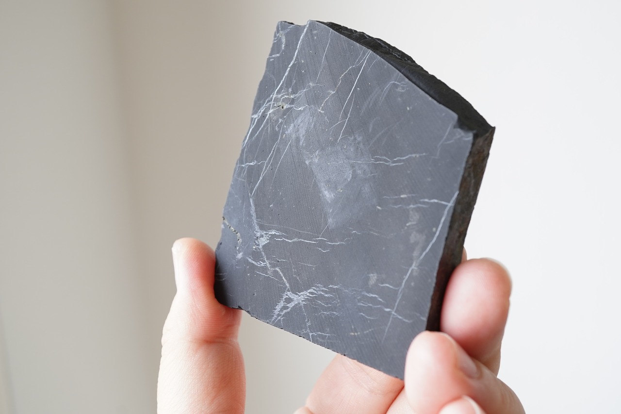 様々な効能が知られるシュンガイトの厚板です。上にお気に入りの石を置いてみたり、アクセサリーなど。お好きなものをおく台としてもお使いいただけると思います。面は磨かれていますが、サイドはカットしたままの自然な質感です。石を置いた場所が汚れることがありますのでお取り扱いの際は汚れても良い布などの上に置いてお楽しみください。また鋭利な部分もありますので、手を怪我されませんようにご注意くださいね。