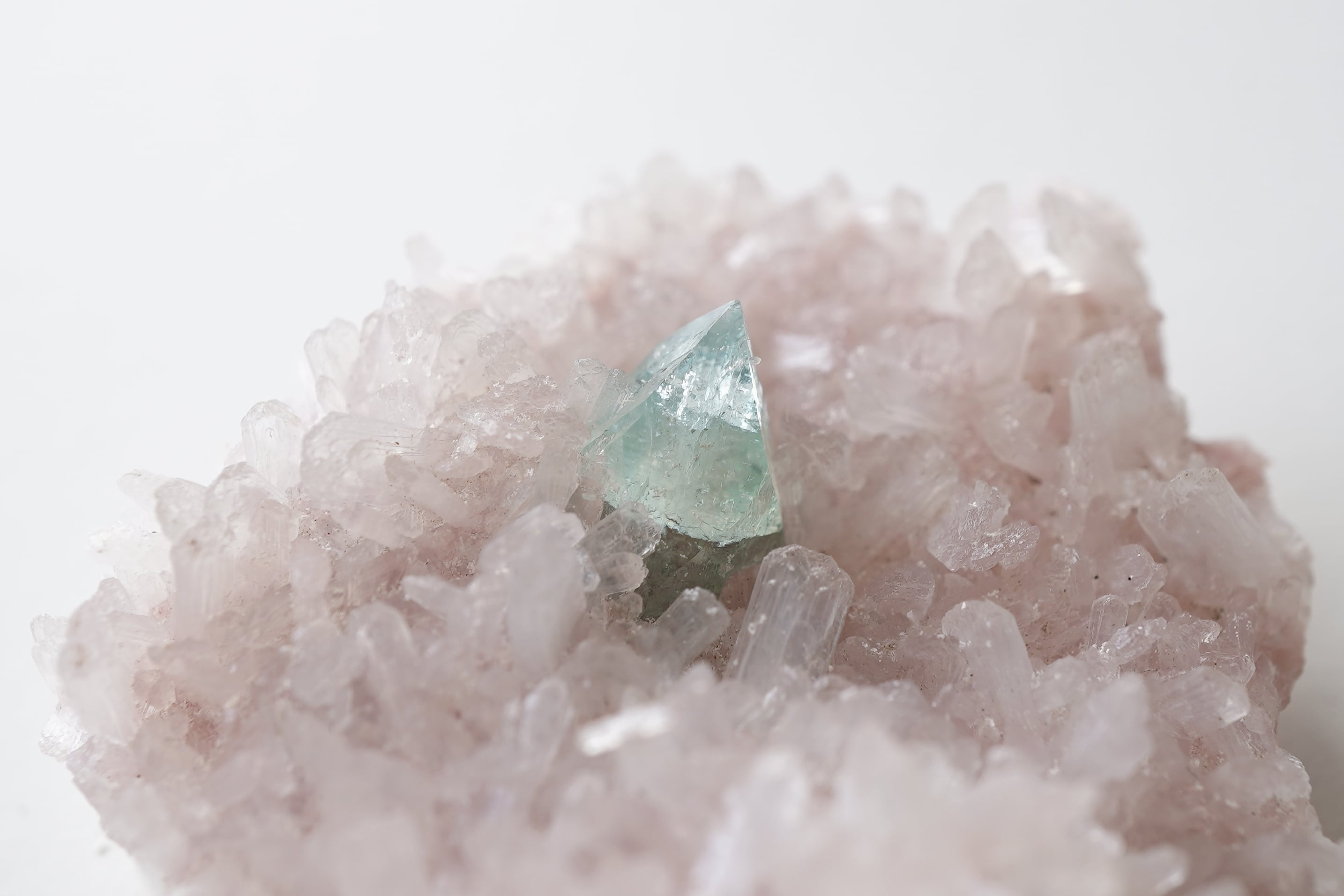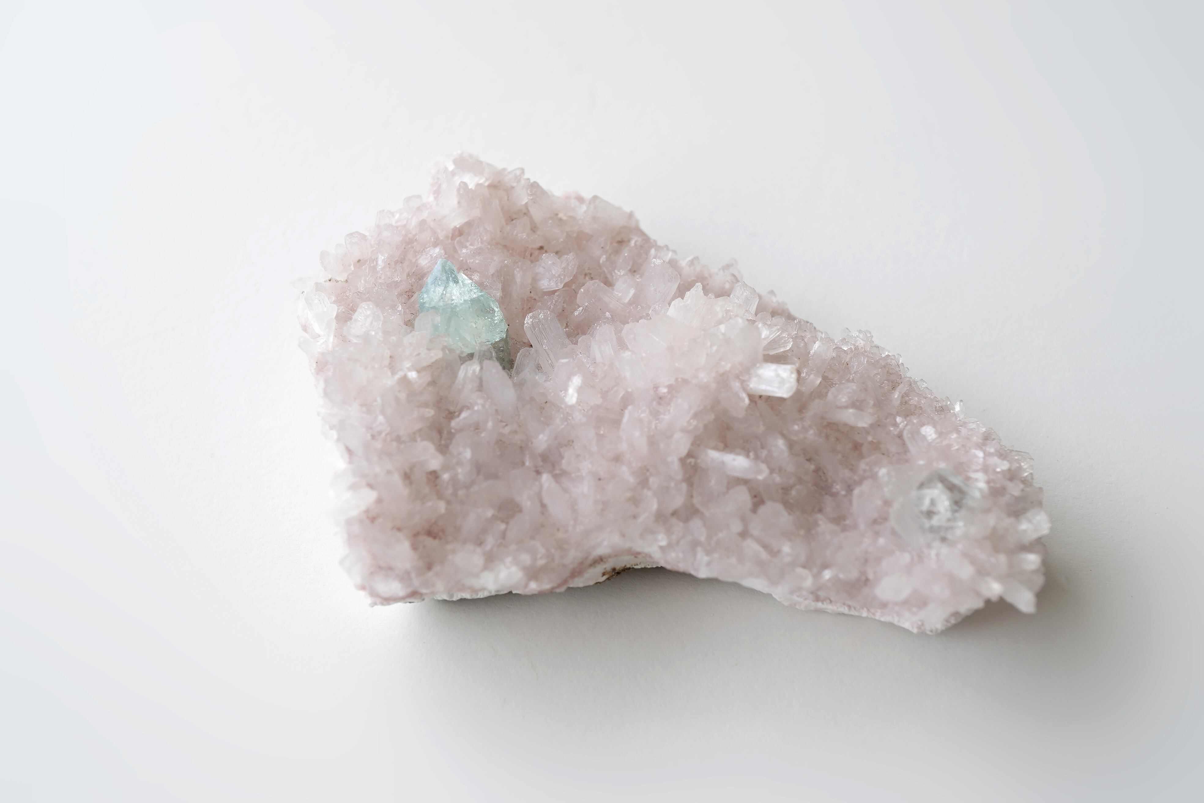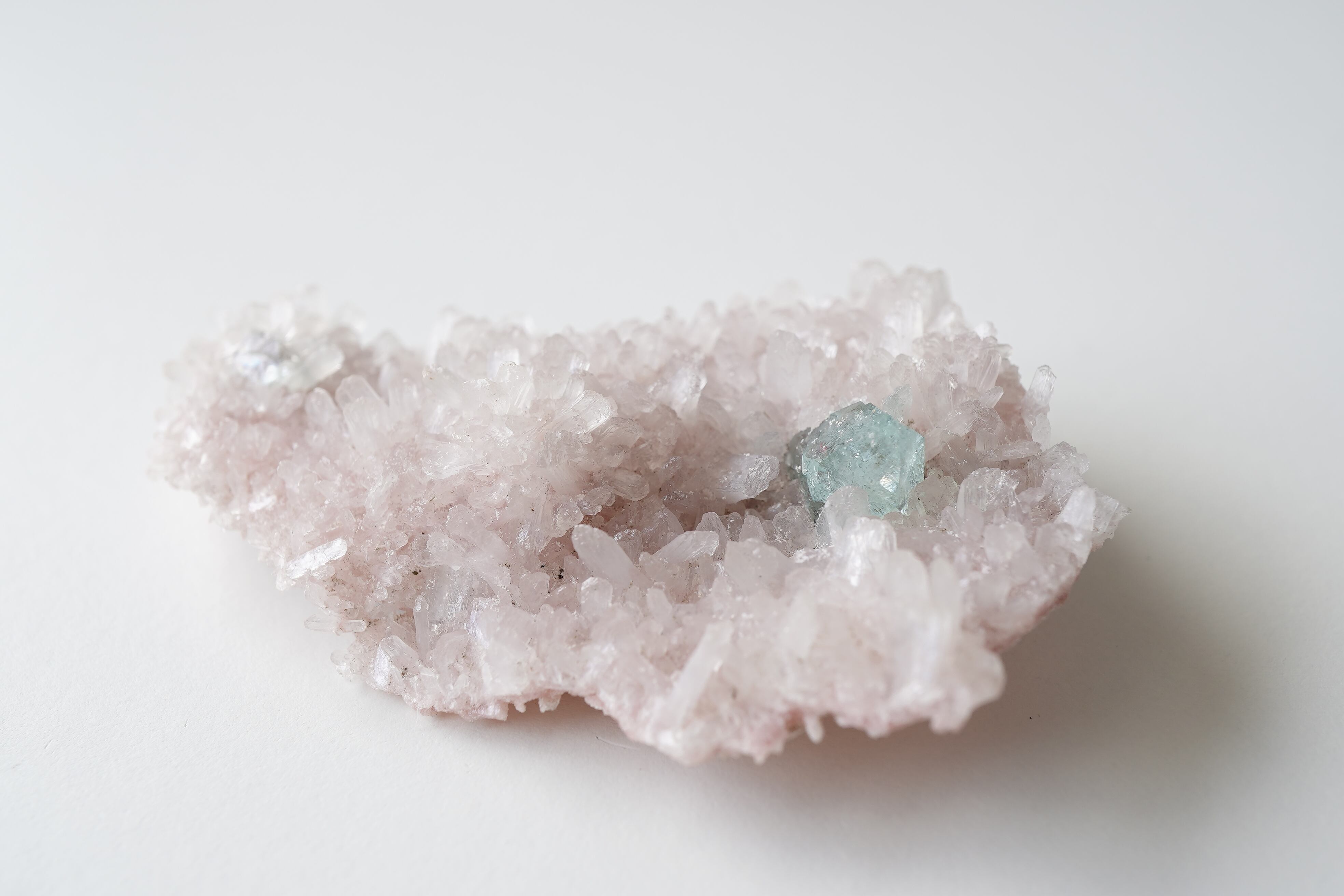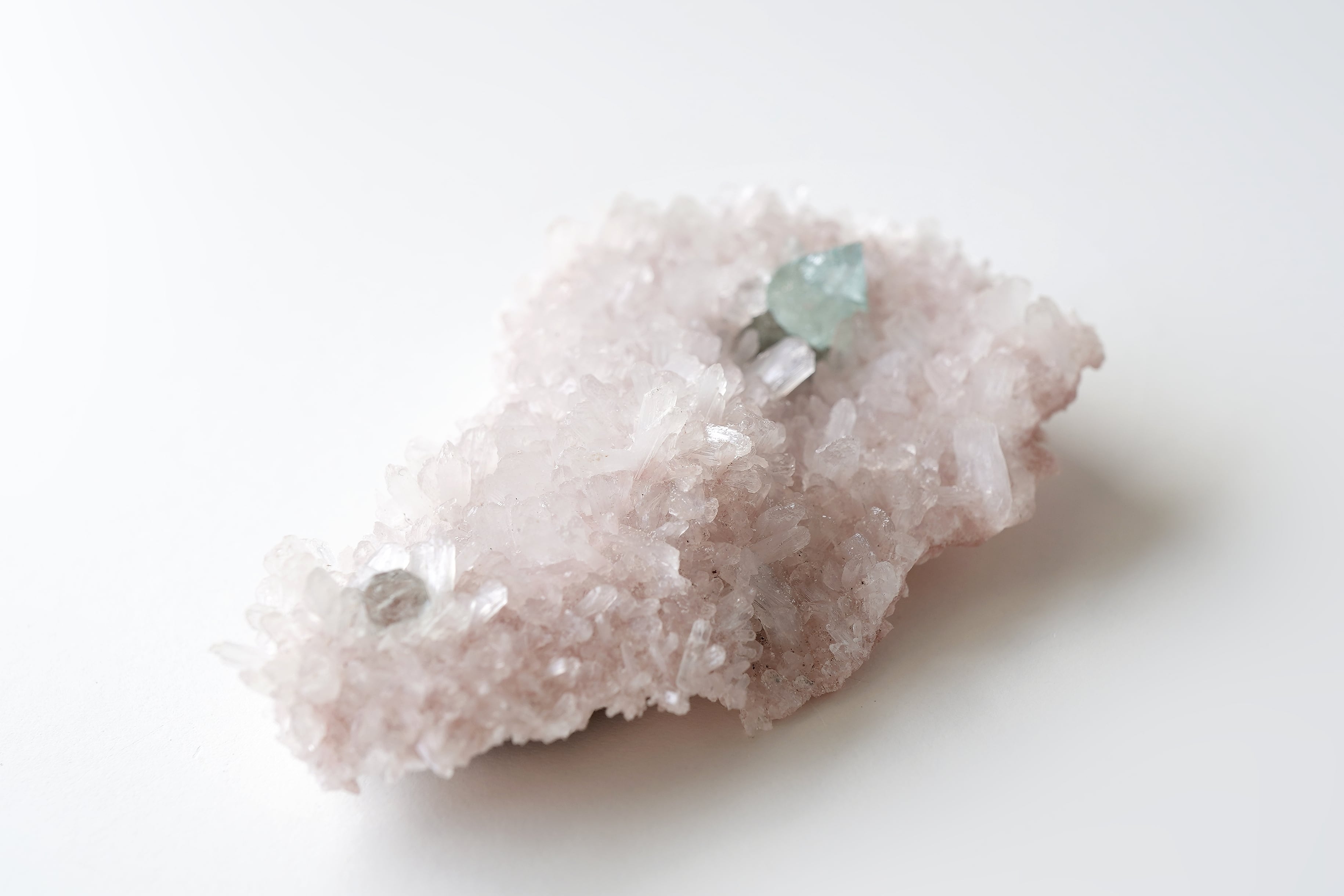 グリーンアポフィライトと淡いピンクカラーのヒューランダイトが共生したとても希少な個体です。ピンク色のヒューランダイトは主に火山空洞での形成過程で、鉄やマンガンの微量不純物が結晶構造に組み込まれるためです。主にインドで産出されるこのゼオライト鉱物は、ピンク、ピーチ、または赤の色合いを持ちその濃淡は含まれる鉱物の種類によって異なります。