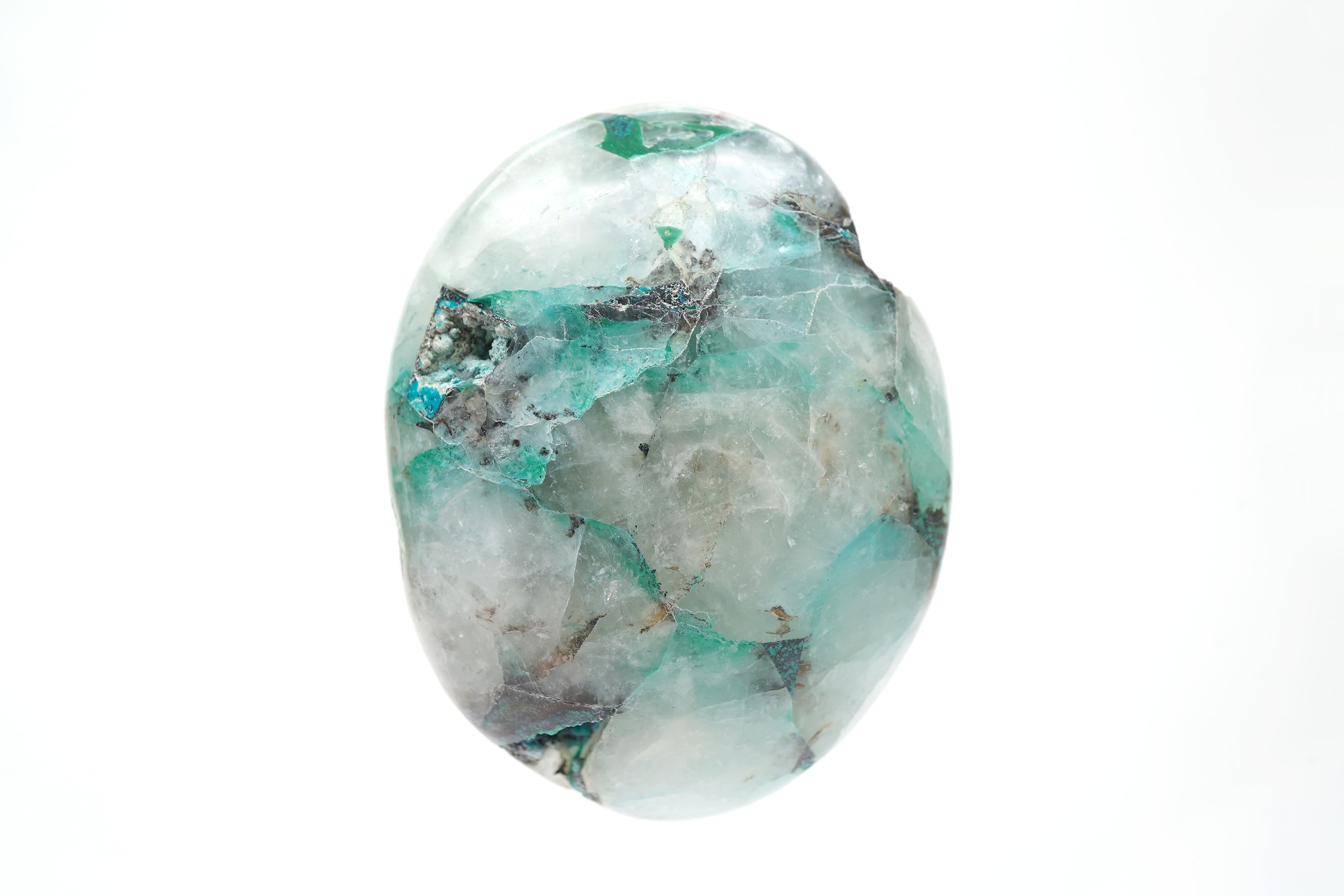 クリソコラ、マラカイト、水晶、シャッタカイトの4つの鉱物が入ったミステリアスな石として認知されたたこちら。トレードネームではクァンタムクアトロシリカと呼ばれます。シャッタカイトの有無は定かではありませんが白い水晶をベースに、鮮やかな青いグリーンのクリソコラと緑色のマラカイトが綺麗にミックスされています。ところどころ空いたポケットにはクリソコラのボールがぽこぽこと育っています。可愛い☆大きさがある握り石ですが、磨きと原石の両方を楽しめるそんな個体です。