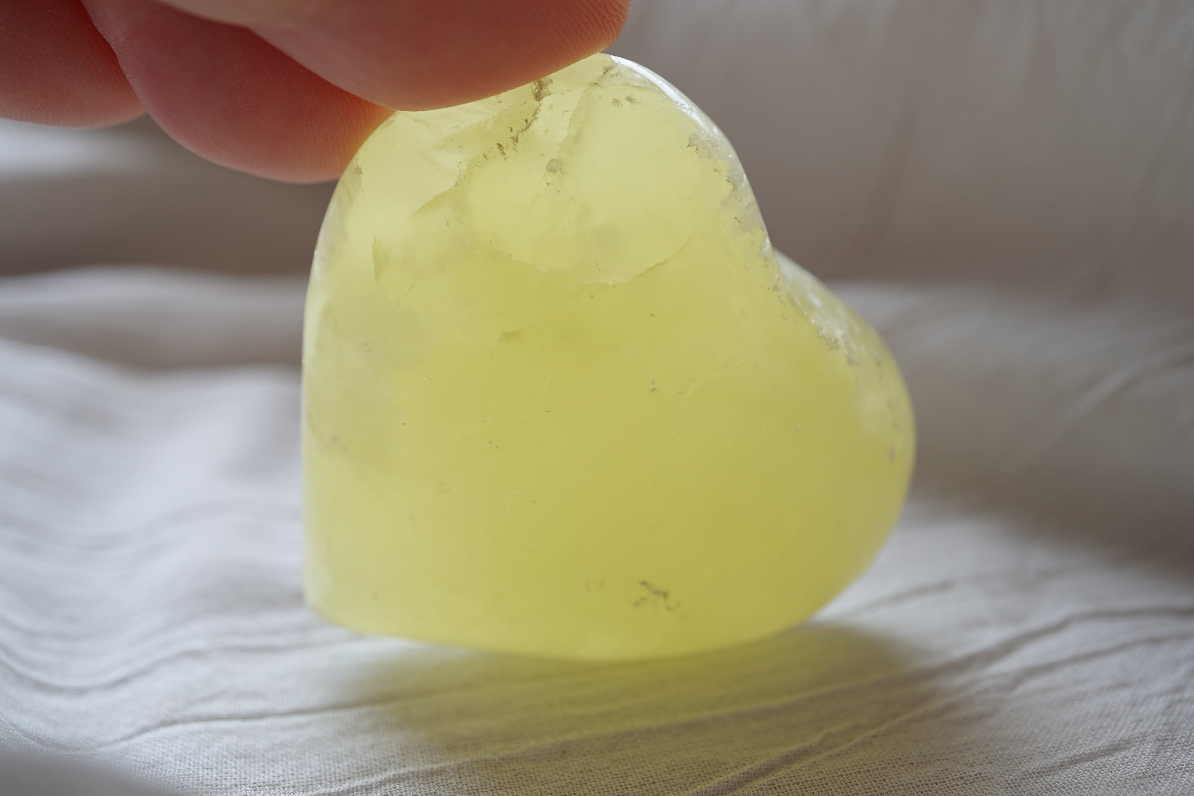 美味しそうな色をしたカルサイトのハート。近年パキスタンで発見されたカルサイトでさまざまな風合いのレモンカラーが存在しています。石に含まれる鉄の量によって色の濃淡が生まれます。