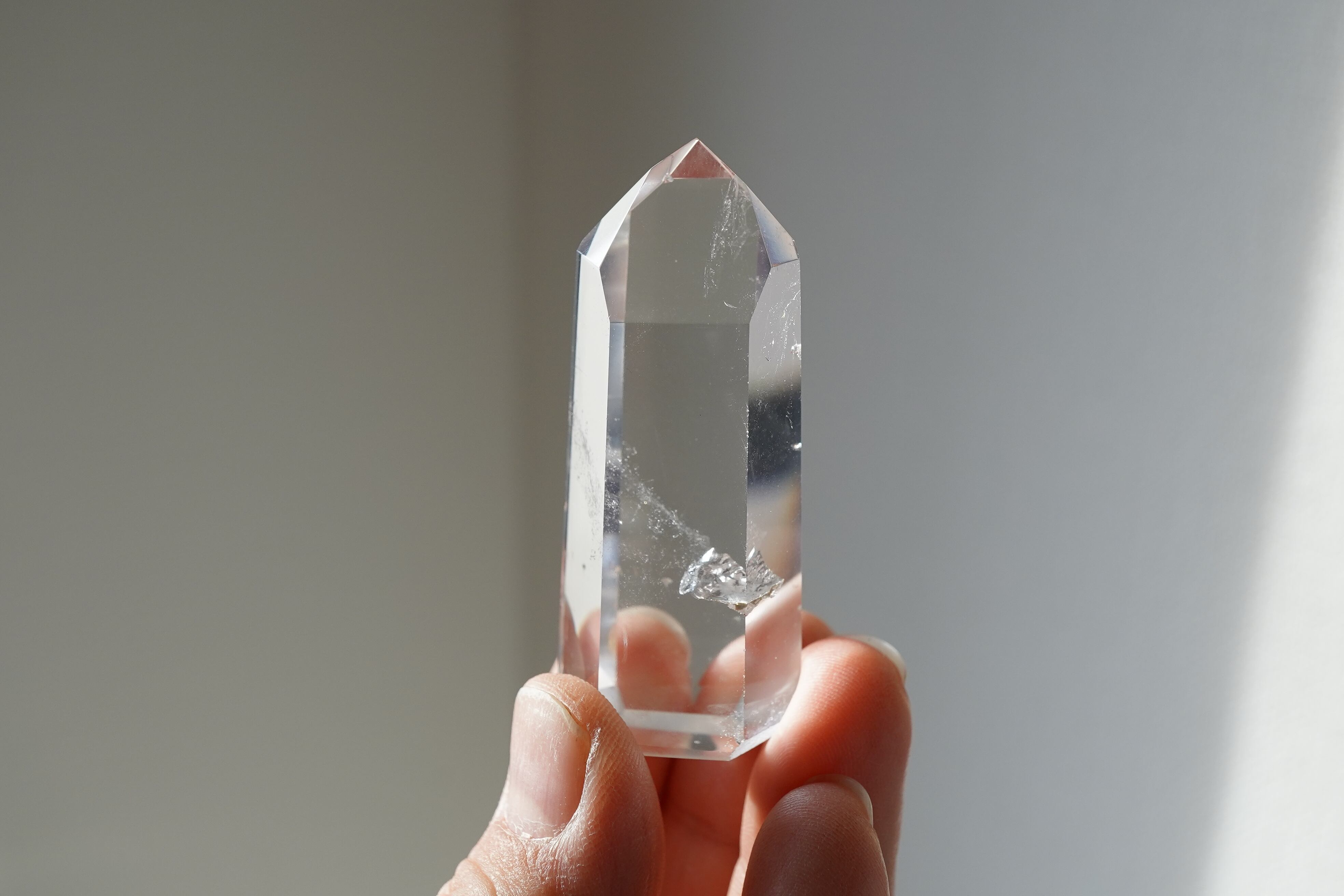 ブラジルのディアマンティーナ産水晶を丁寧に磨いた水晶タワーです。水晶の中には自然にできたクラックがあり、水の中の生き物が泳いでる姿に見えたり、流れ星に見えたり・・・。様々な景色が見る人の目に映ることでしょう。