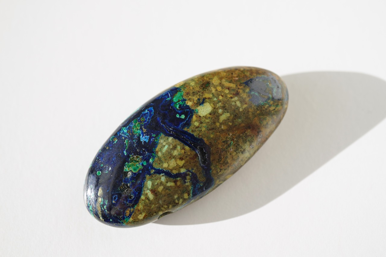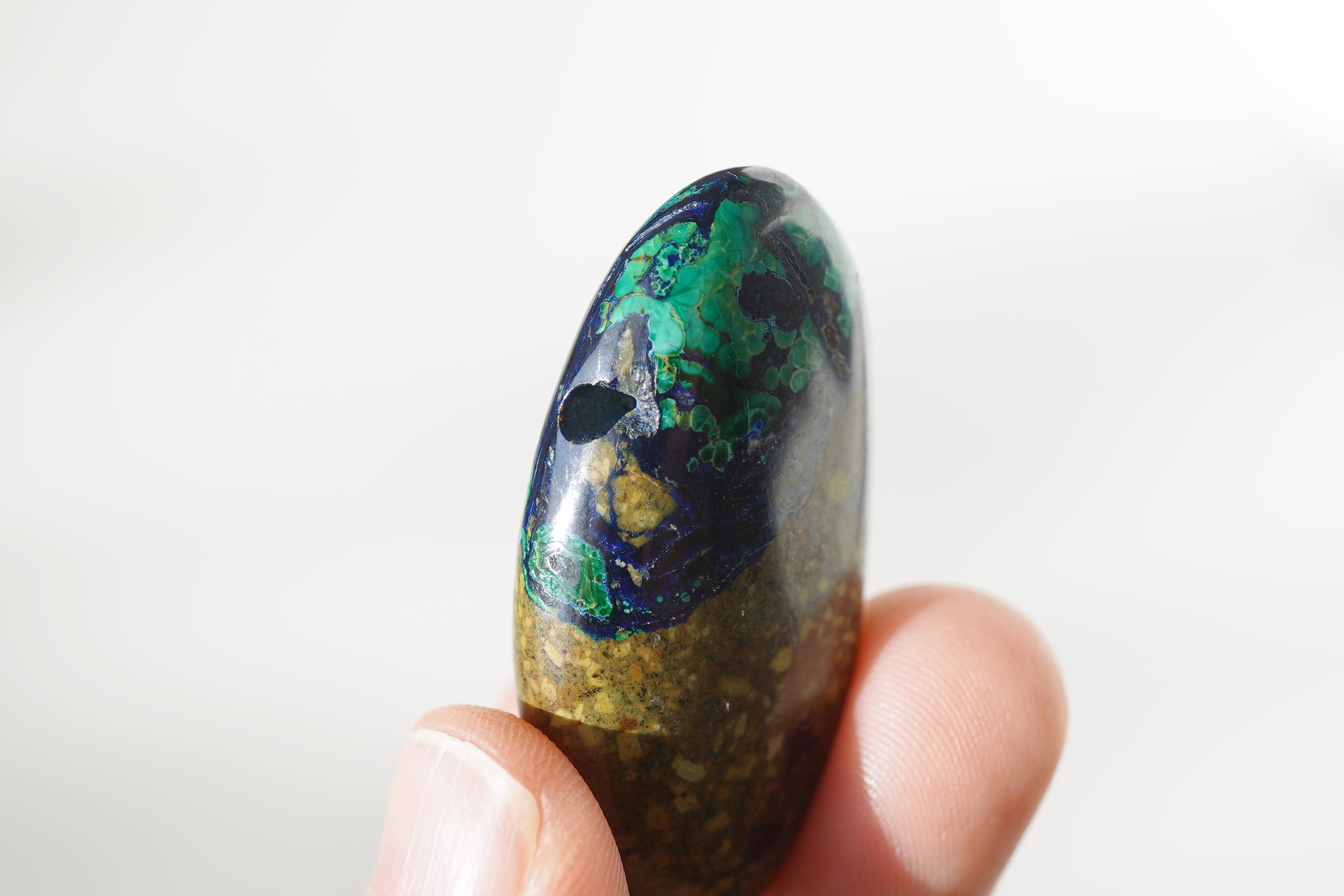 芸術的なコントラストが魅力のこちらペルー産のアズライト・マラカイトのタンブルです。両サイドに穴が貫通しているのでワイヤーやマクラメなどで加工可能です。陰陽のように色が分かれているのも面白いですね。