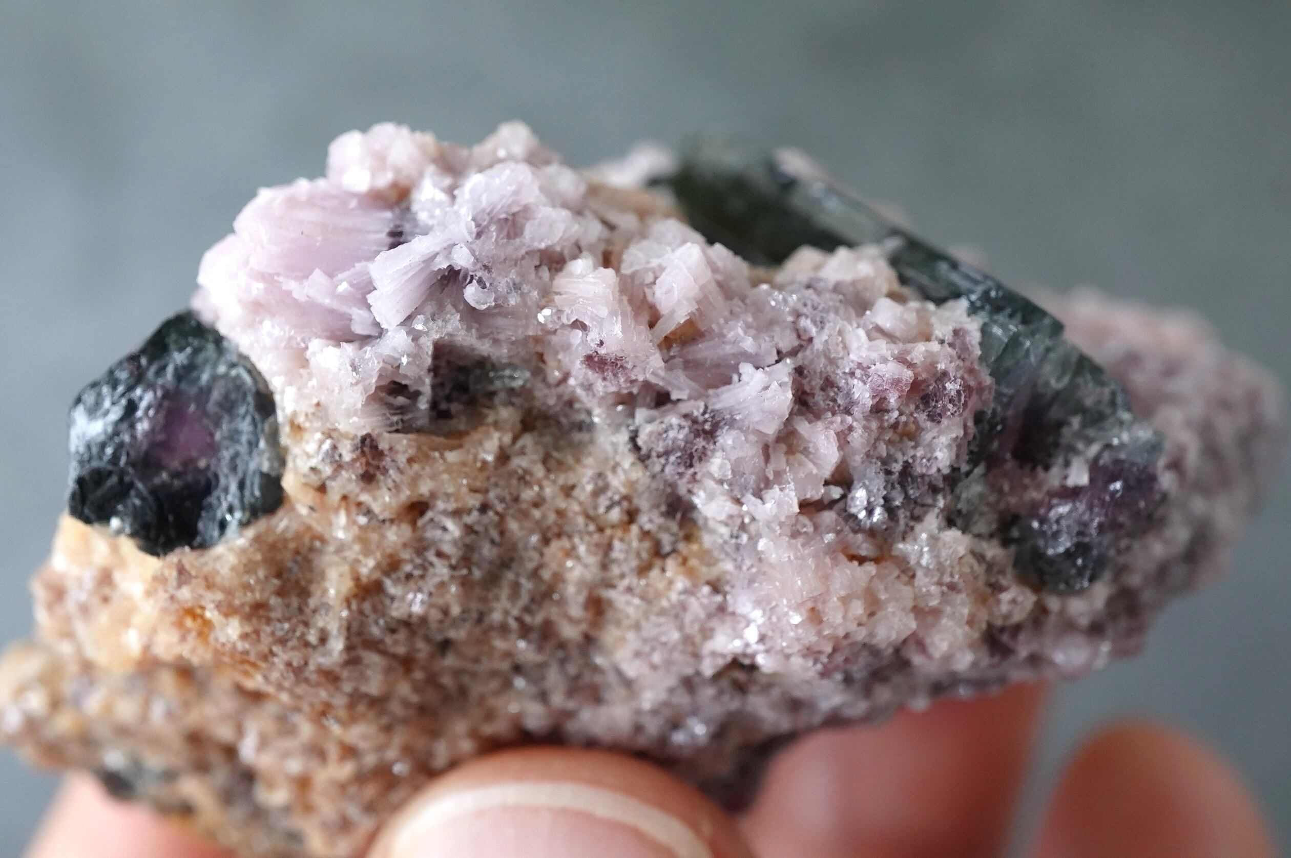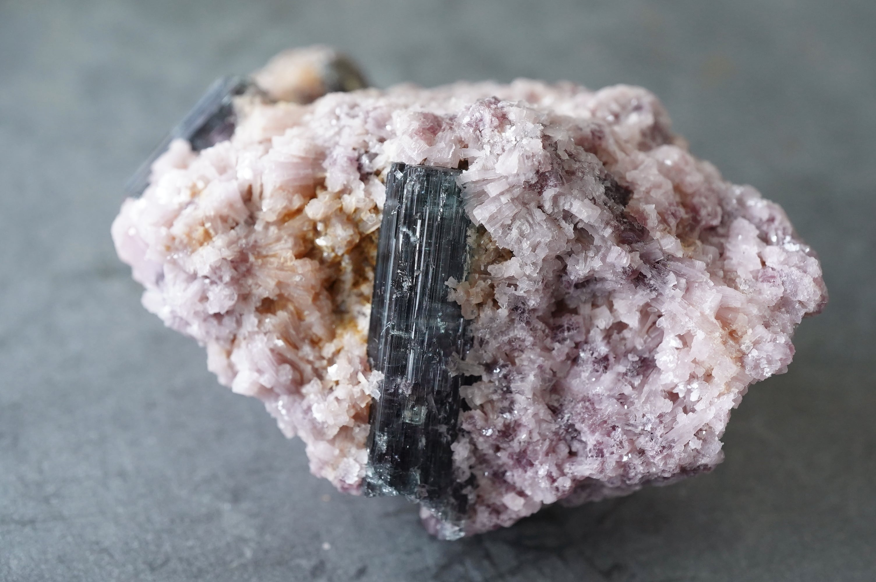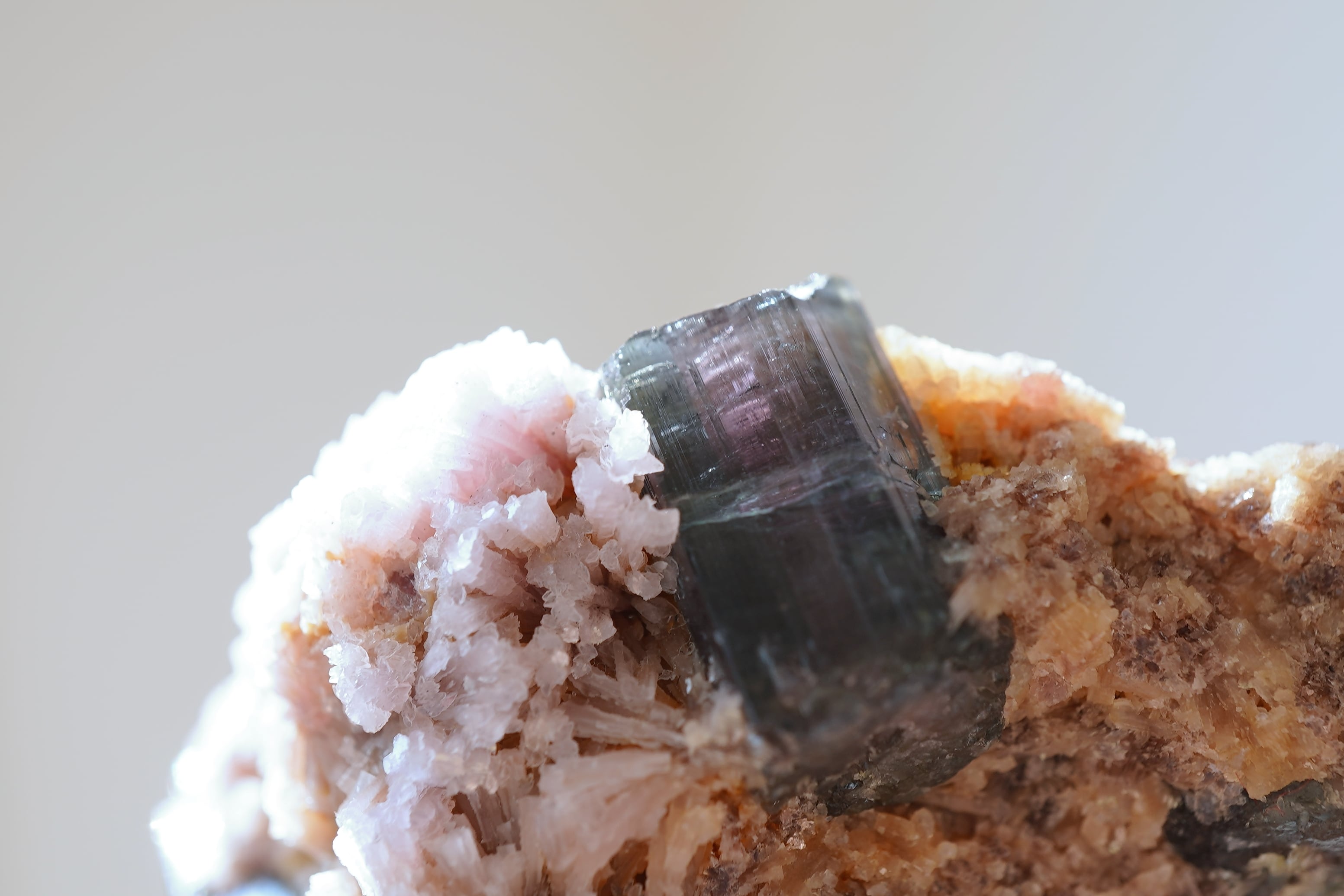 ピンクのレピドライトにトルマリンたちが鎮座。中心部がピンクで周りがネイビーっぽい色のトルマリンがサイドと裏側にあります。一番大きなトルマリンはバイカラーではなく透明感のあるネイビーです。ピンクとのコントラストがありとても綺麗です。