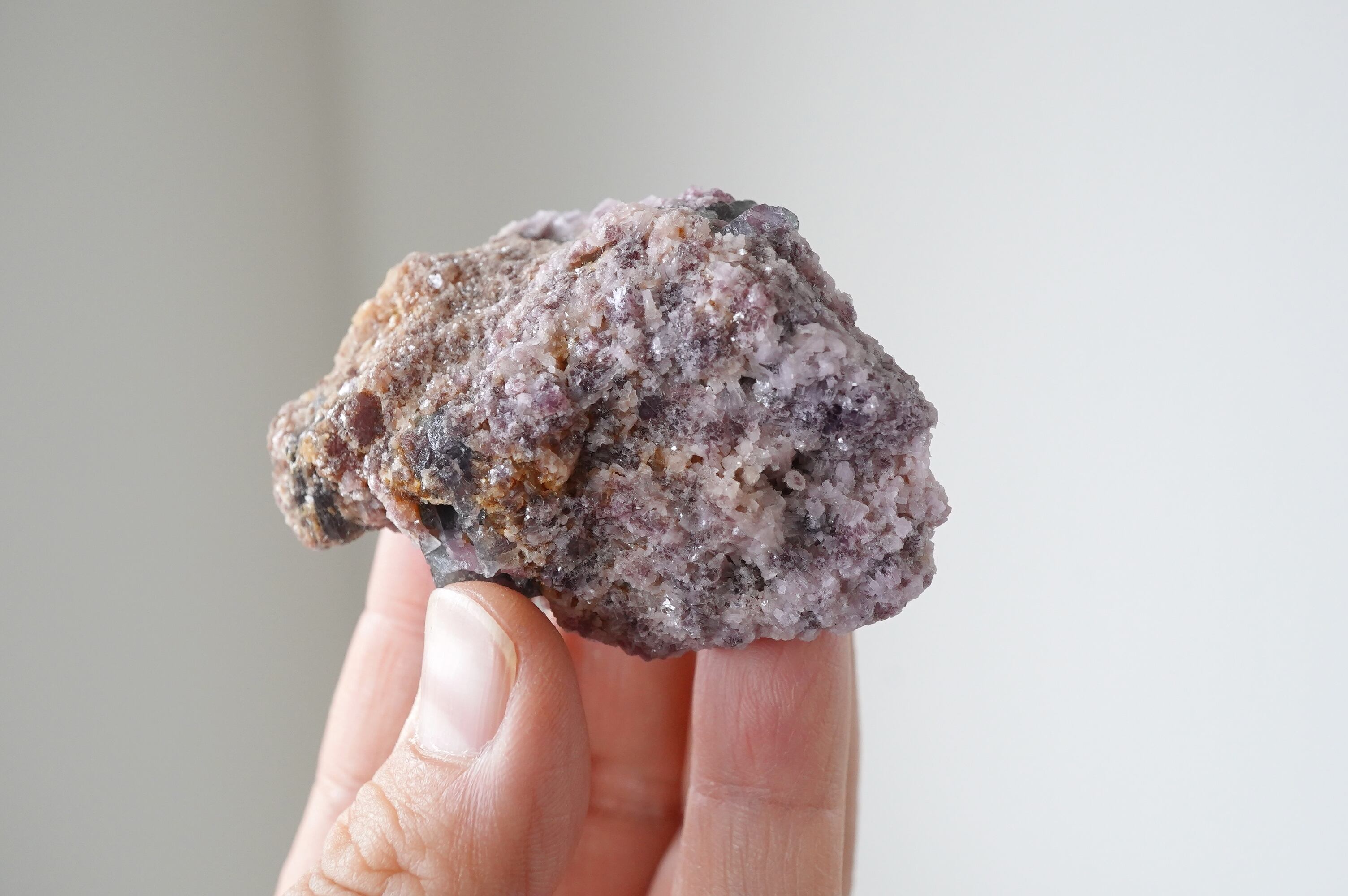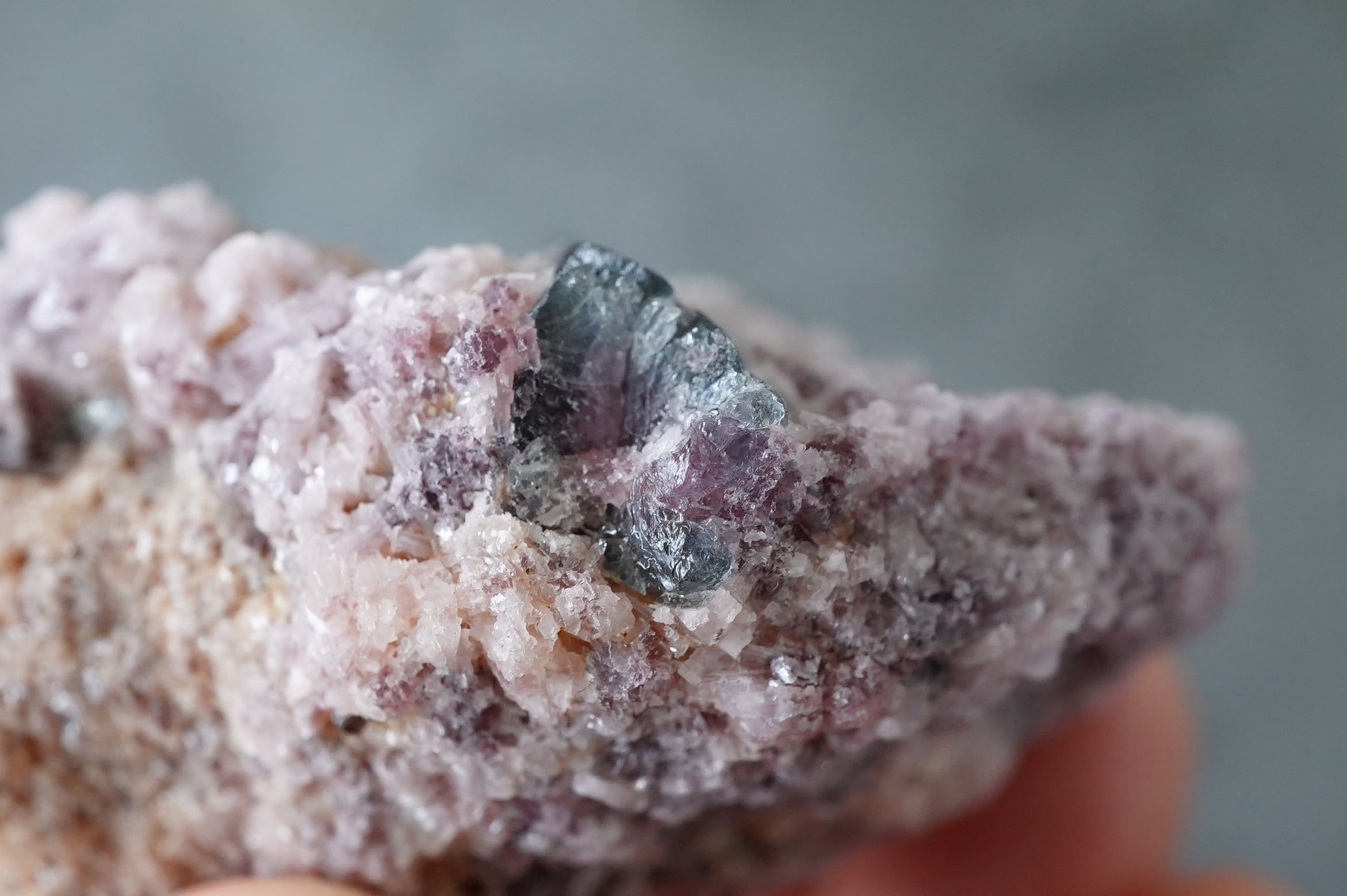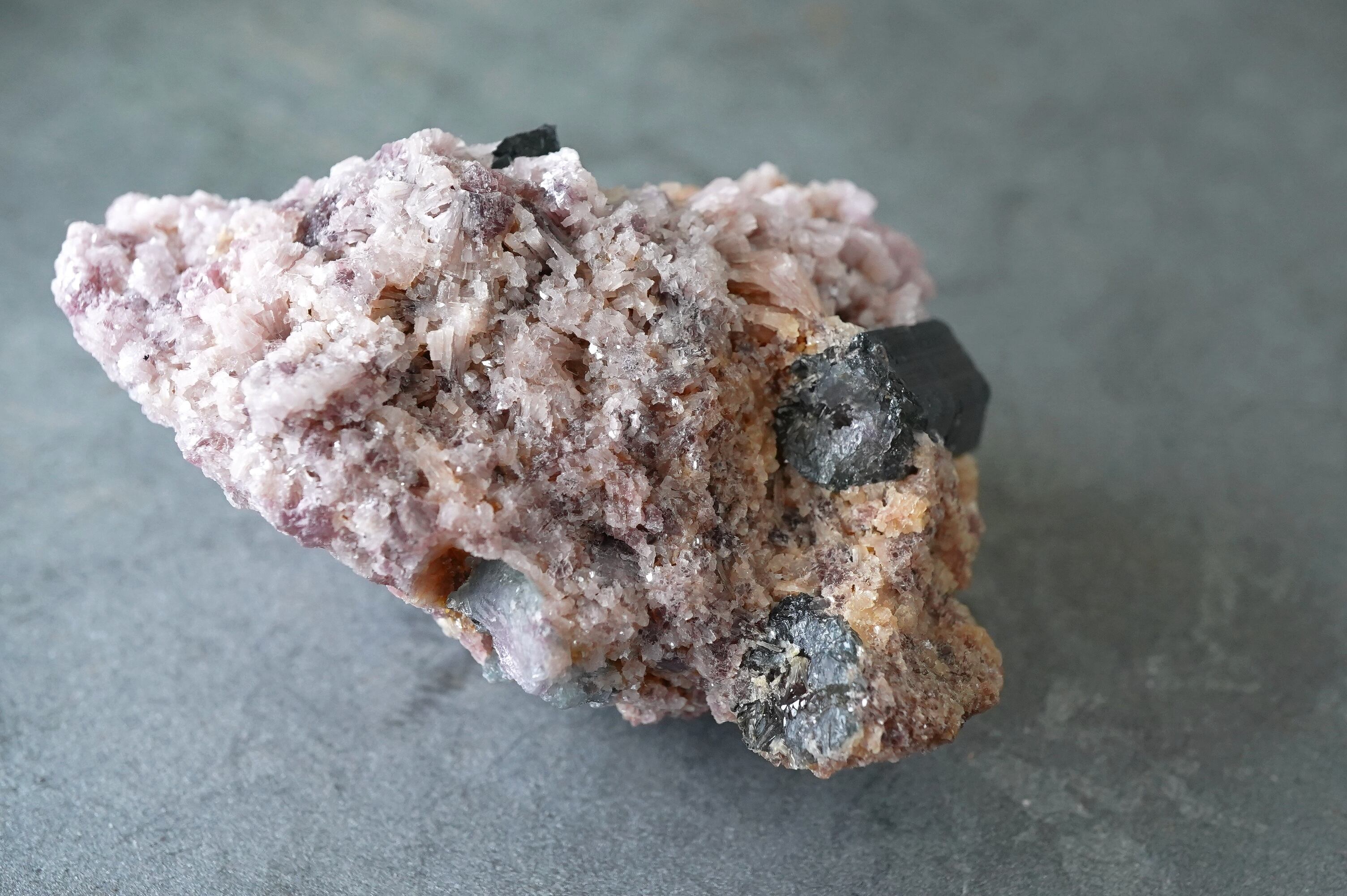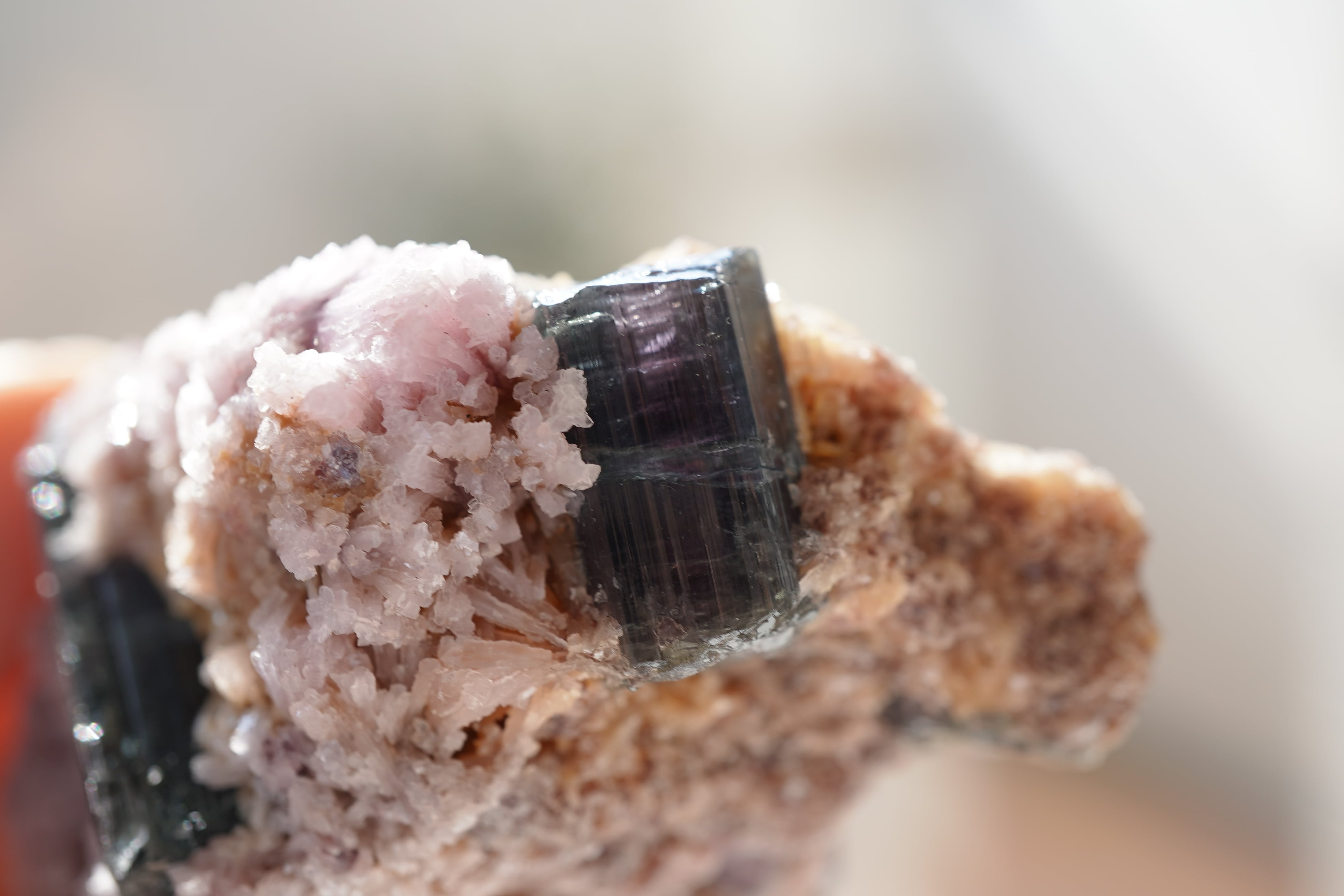 ピンクのレピドライトにトルマリンたちが鎮座。中心部がピンクで周りがネイビーっぽい色のトルマリンがサイドと裏側にあります。一番大きなトルマリンはバイカラーではなく透明感のあるネイビーです。ピンクとのコントラストがありとても綺麗です。