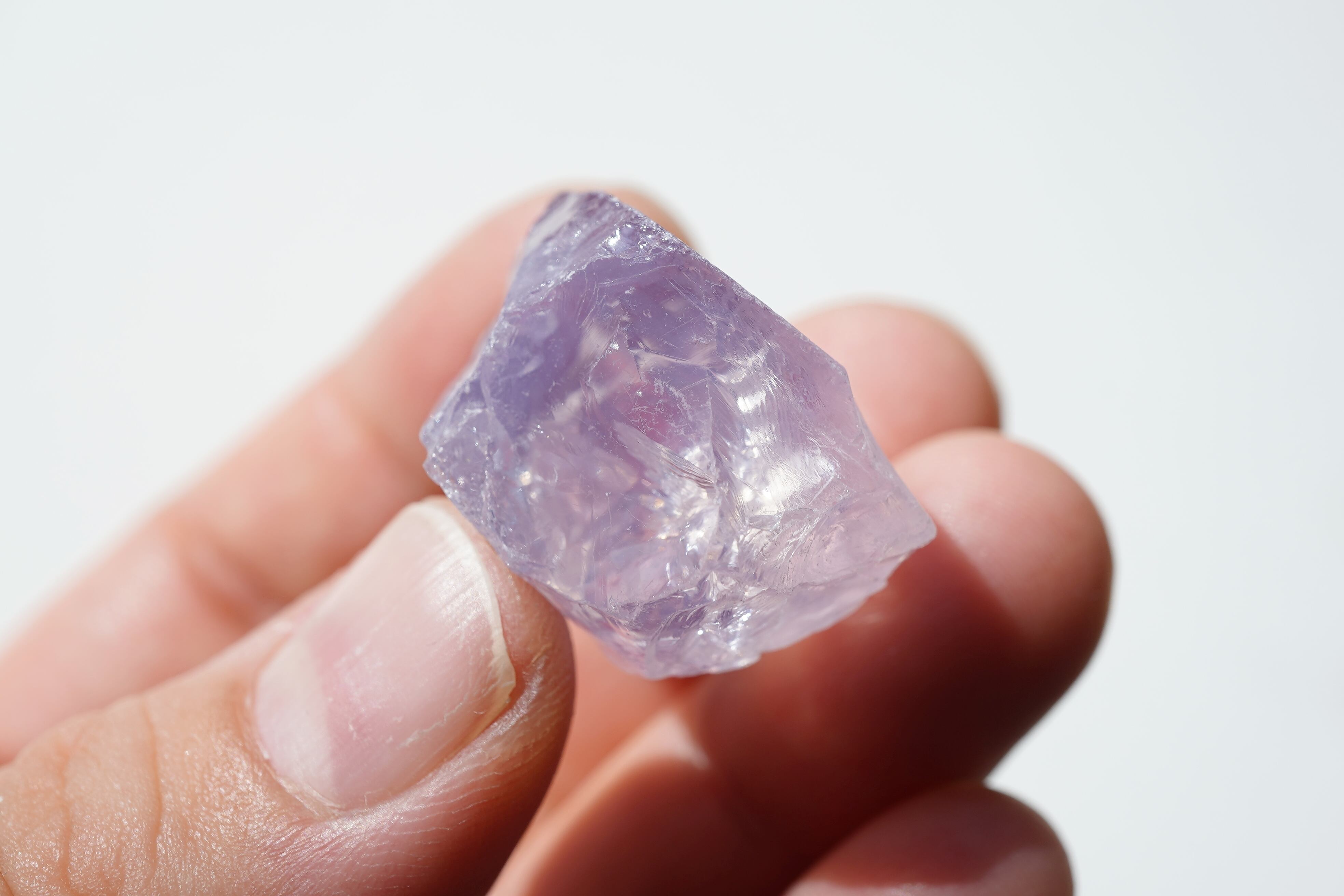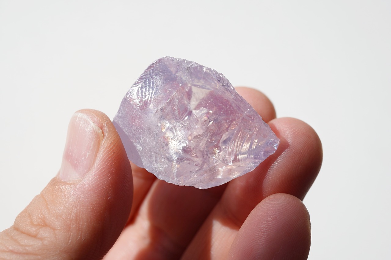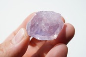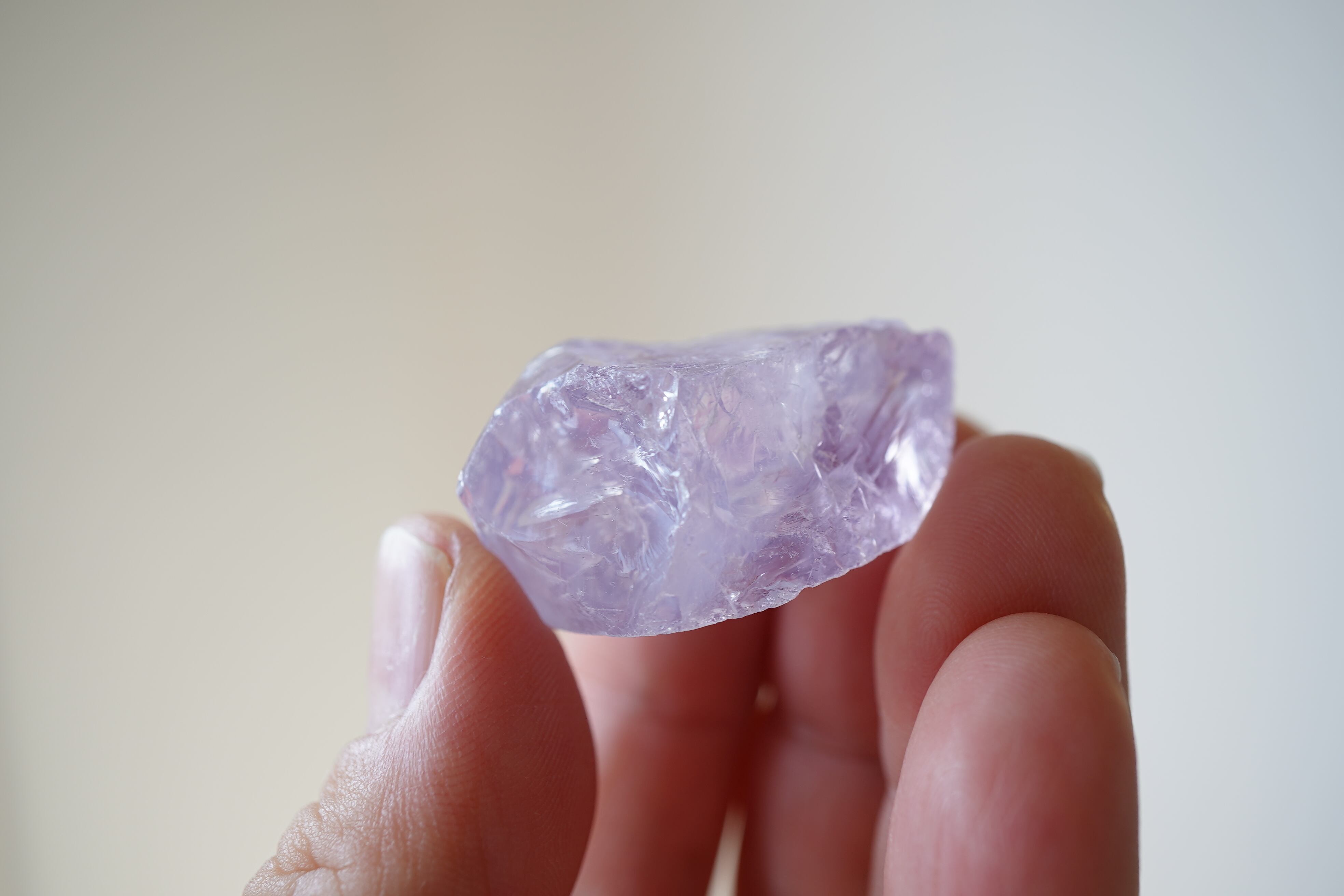 ルースやビーズ状での流通がほとんどでしょうか。こちら原石のスコロライトです。名前だけ聞くとアメジストとの関連を想像させないですが、塊状で産出されたアメジストを加熱処理してこのミルキーな紫色を生み出していると言われます。その見た目通りラベンダークォーツと表記されることの方が多いかもしれません。ローズクォーツやジラソルのような雰囲気もありながら、それらとは何かが違う。