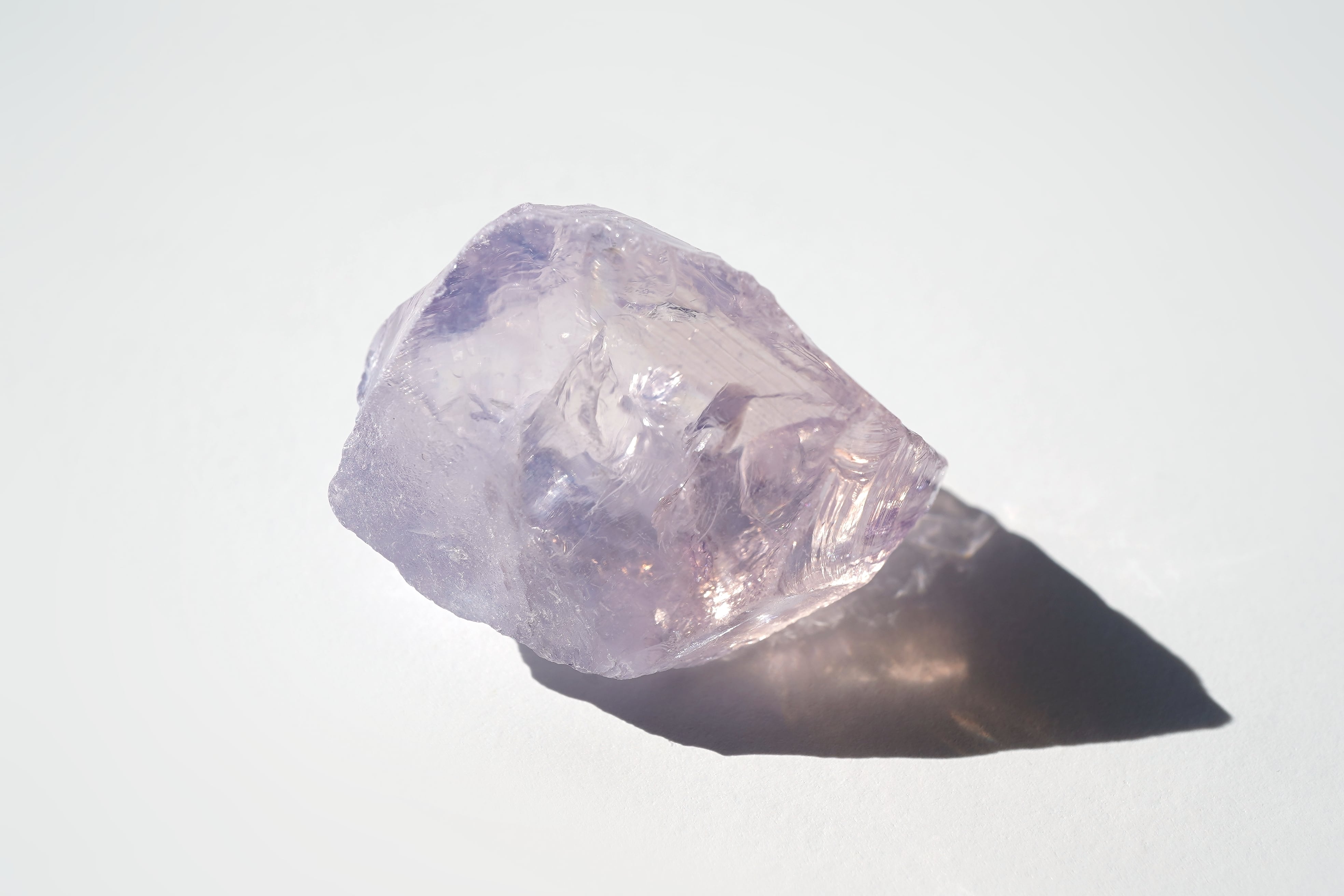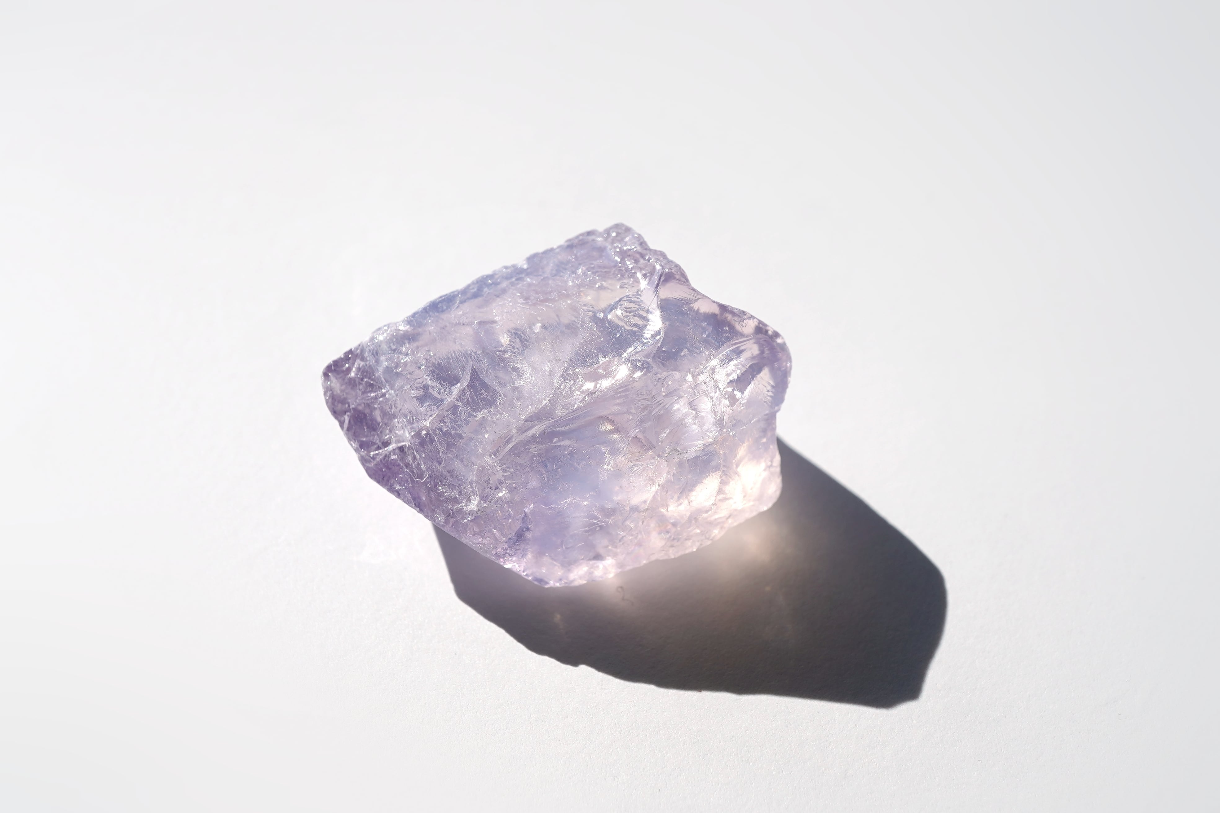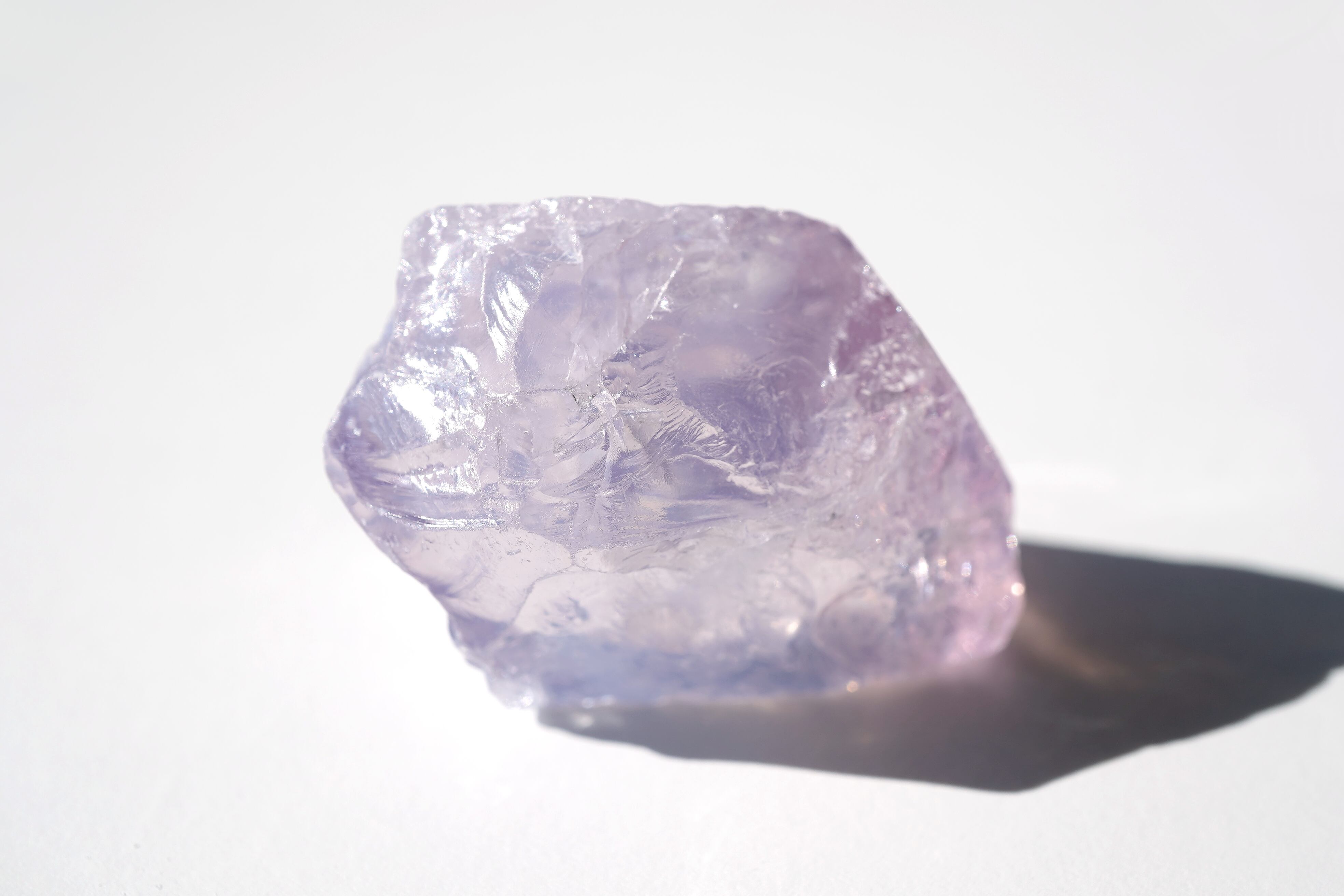 ルースやビーズ状での流通がほとんどでしょうか。こちら原石のスコロライトです。名前だけ聞くとアメジストとの関連を想像させないですが、塊状で産出されたアメジストを加熱処理してこのミルキーな紫色を生み出していると言われます。その見た目通りラベンダークォーツと表記されることの方が多いかもしれません。ローズクォーツやジラソルのような雰囲気もありながら、それらとは何かが違う。