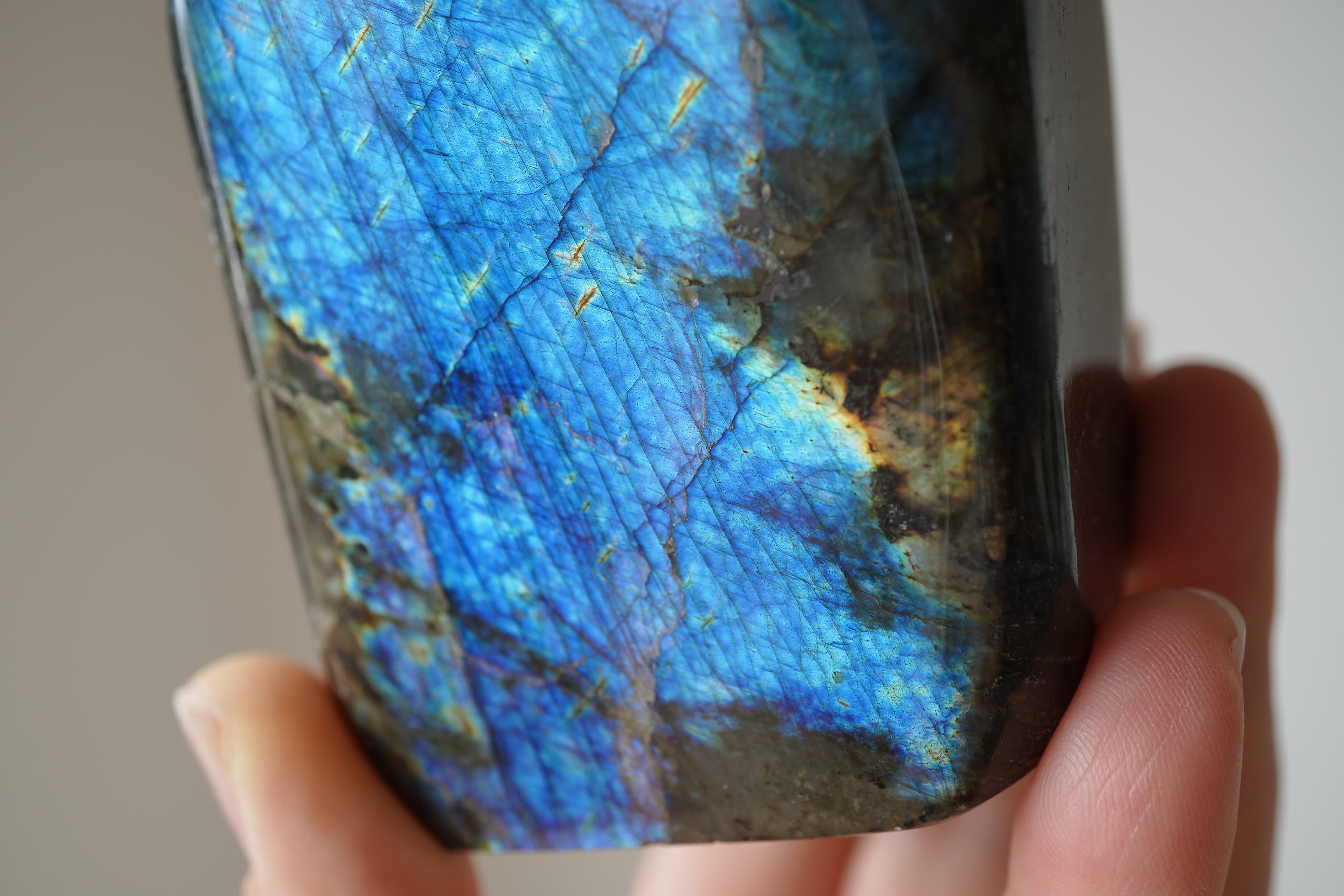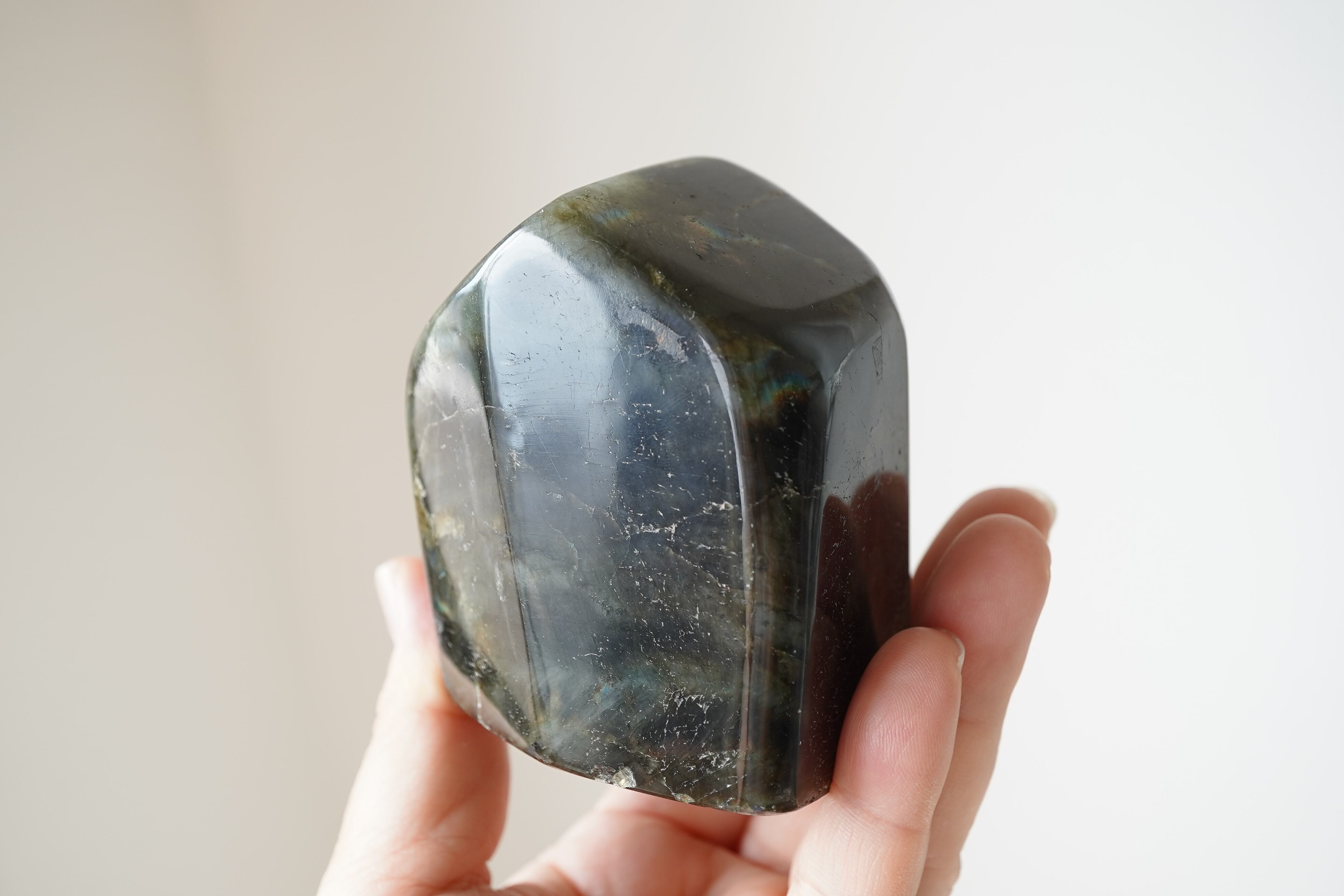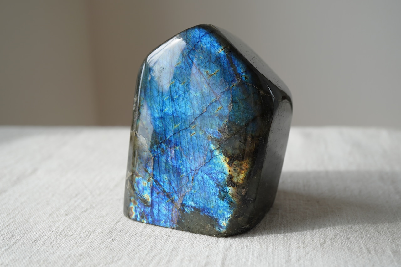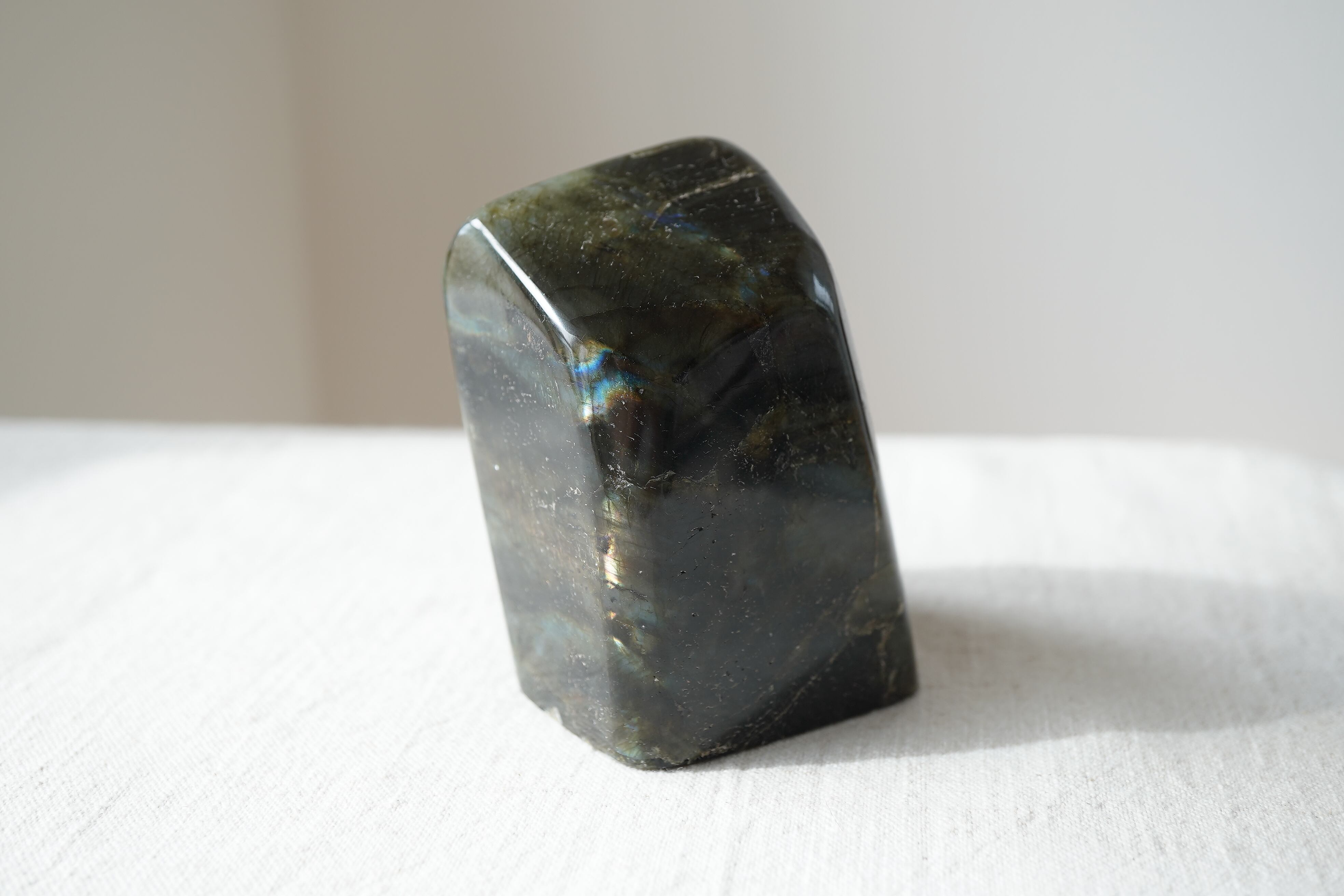 青い輝きがまぶしい卓上ラブラドライト。どっしりと重みと厚みがあります。真正面から見てもほんのり青いのがわかります。角度を少し動かせばたちまちシラーが輝きます。