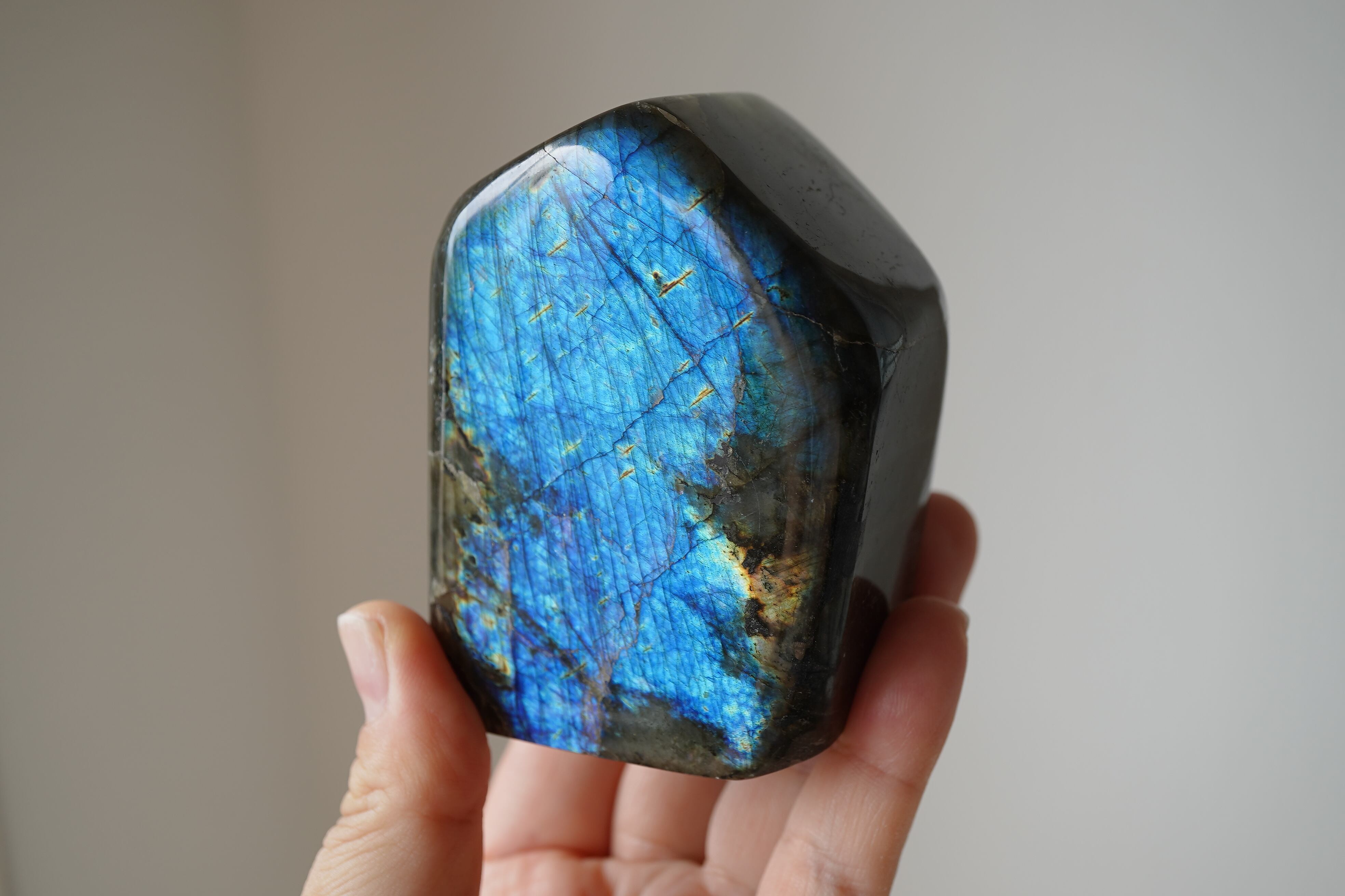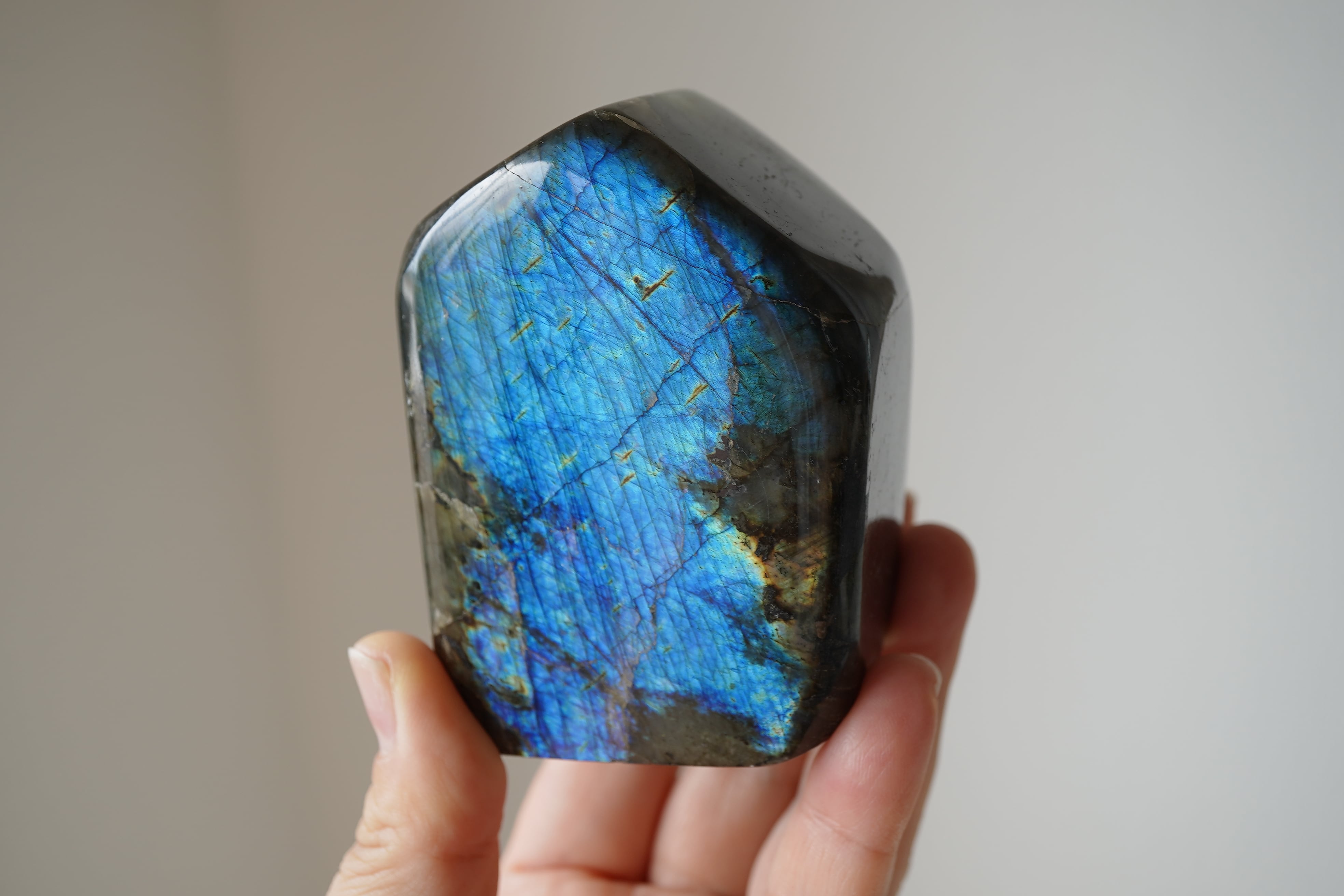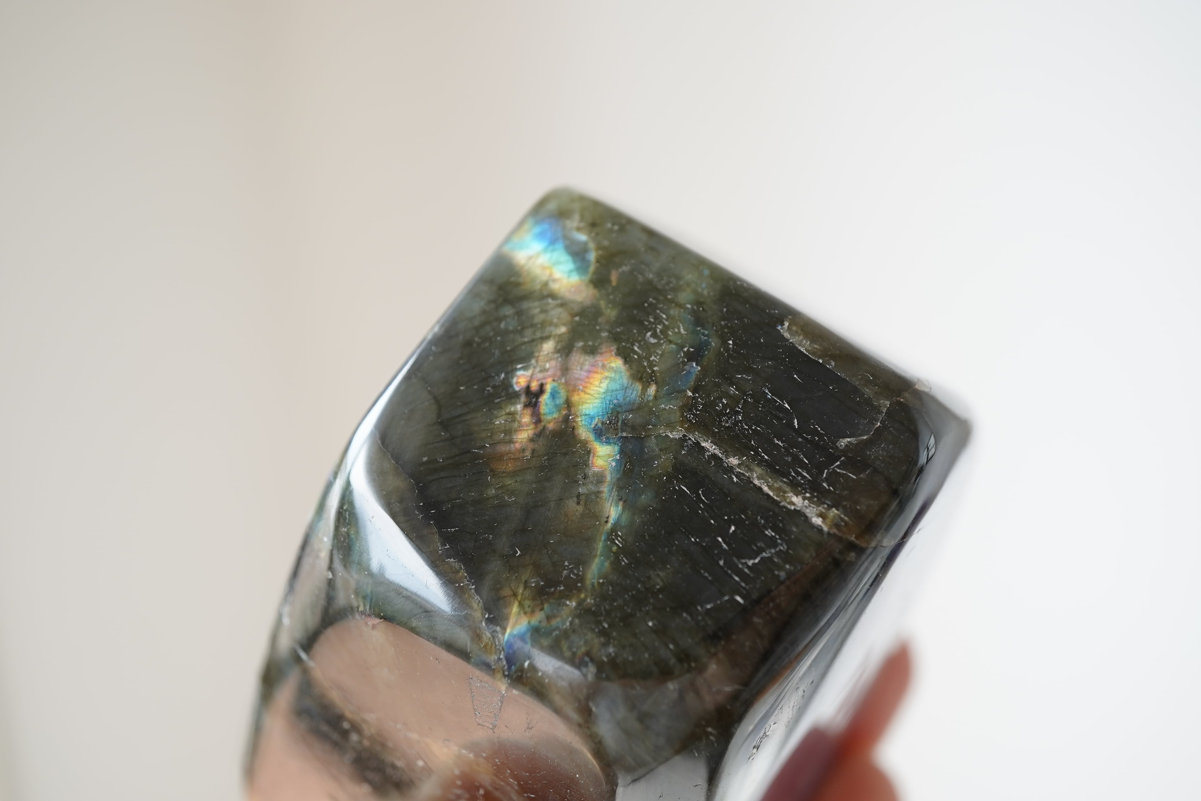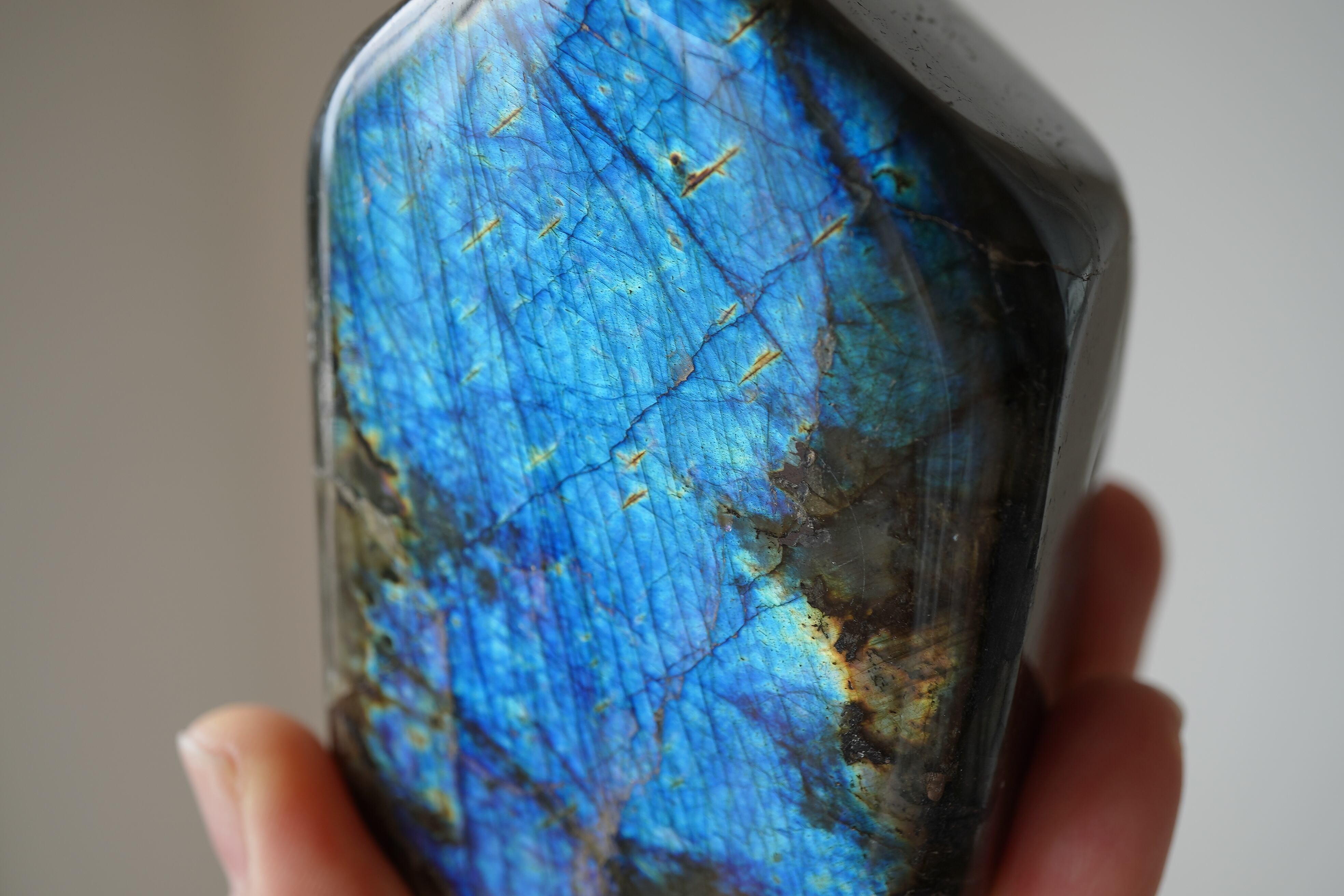 青い輝きがまぶしい卓上ラブラドライト。どっしりと重みと厚みがあります。真正面から見てもほんのり青いのがわかります。角度を少し動かせばたちまちシラーが輝きます。