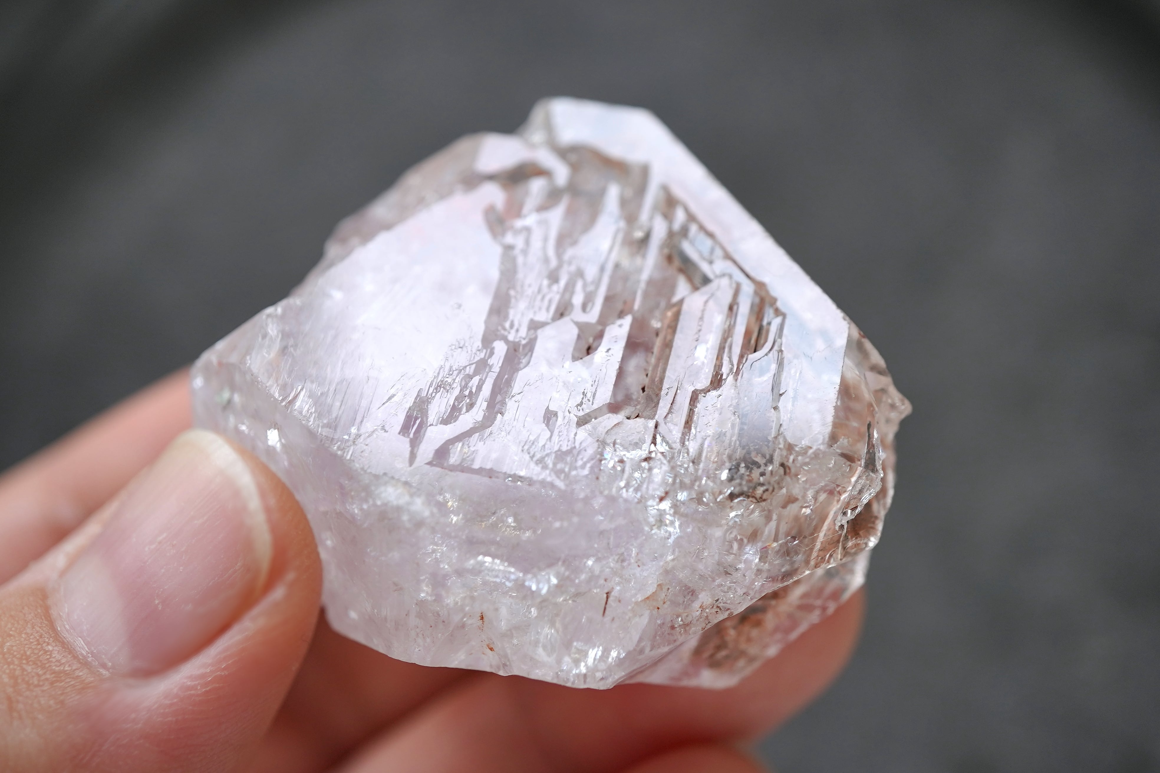 ラテライトという赤い泥状の内包物がエレスチャルのレイヤーにそって入っているのがかっこいい。中心部はうっすらとアメジストになっています。同じ山からはオイル入りも産出されていて、近年注目を浴びた水晶の一つです。表面がガラス光沢で幅広に育ったちょっとユニークな形をしています。