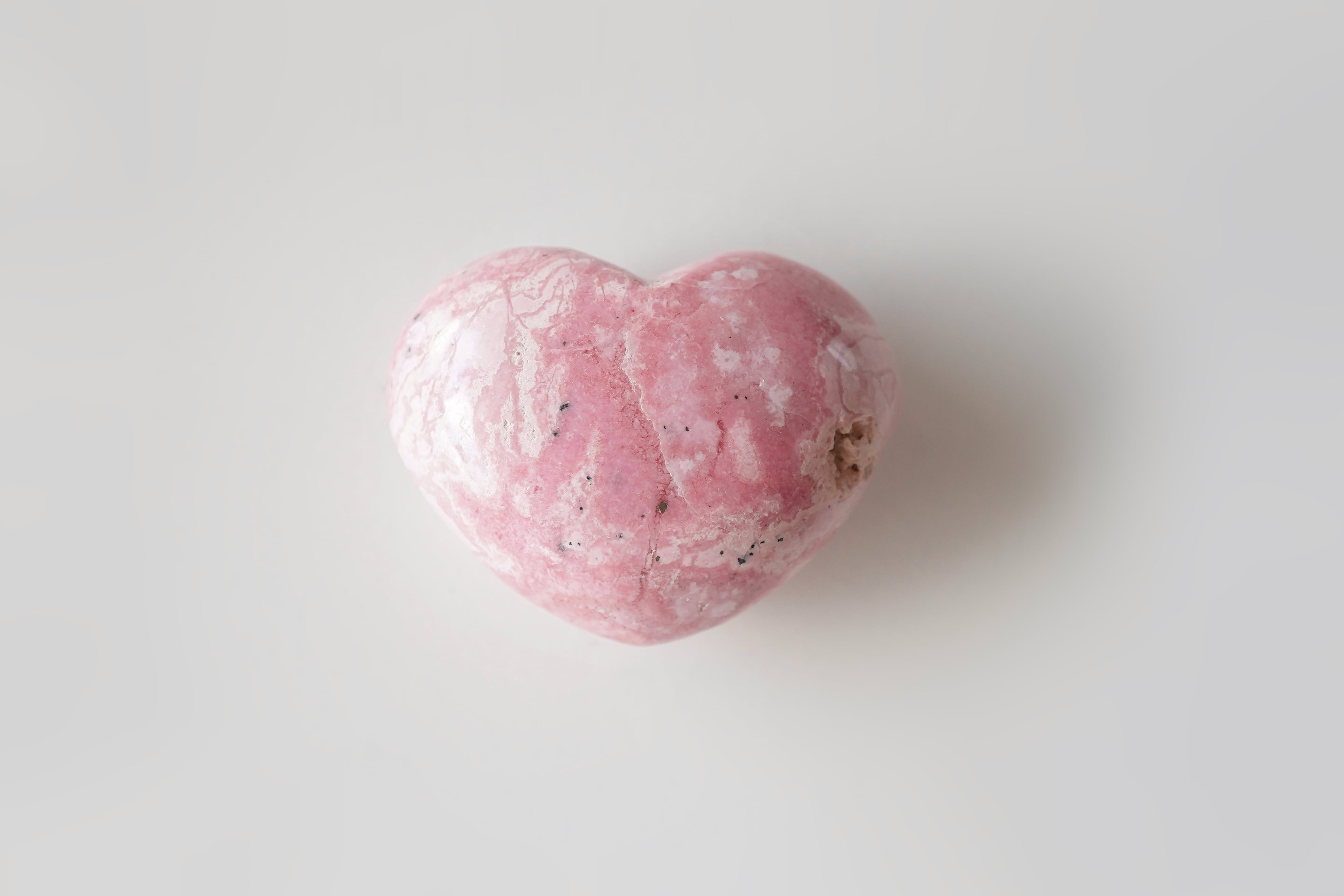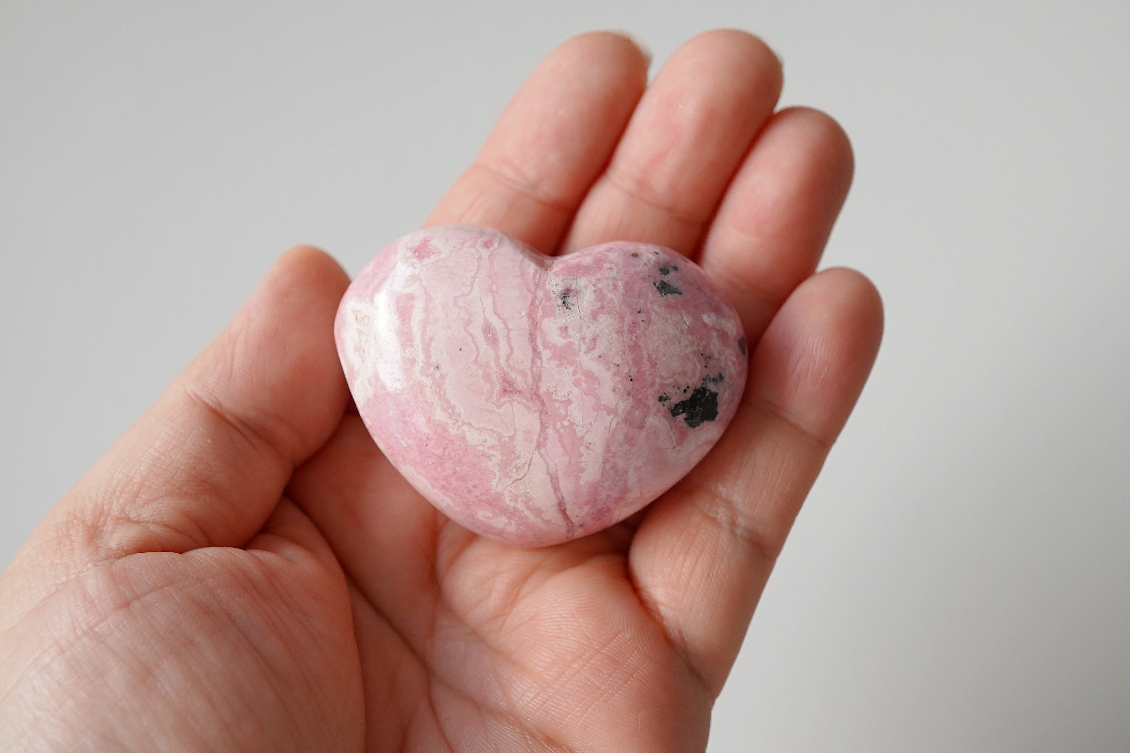 ぷっくりしたロードナイトのハート。ジュディ・ーホール著『クリスタルバイブル』によりますと、『情緒のバランスをとる働きがあり、愛を育み、人類の兄弟愛を促進します。』とありました。人類の兄弟愛!ウィーアーファミリーです。ハートの側面には窪みがあります(写真3と5枚目)。小さな小さなパイライトがハートの中心部より少し下にポツン。
