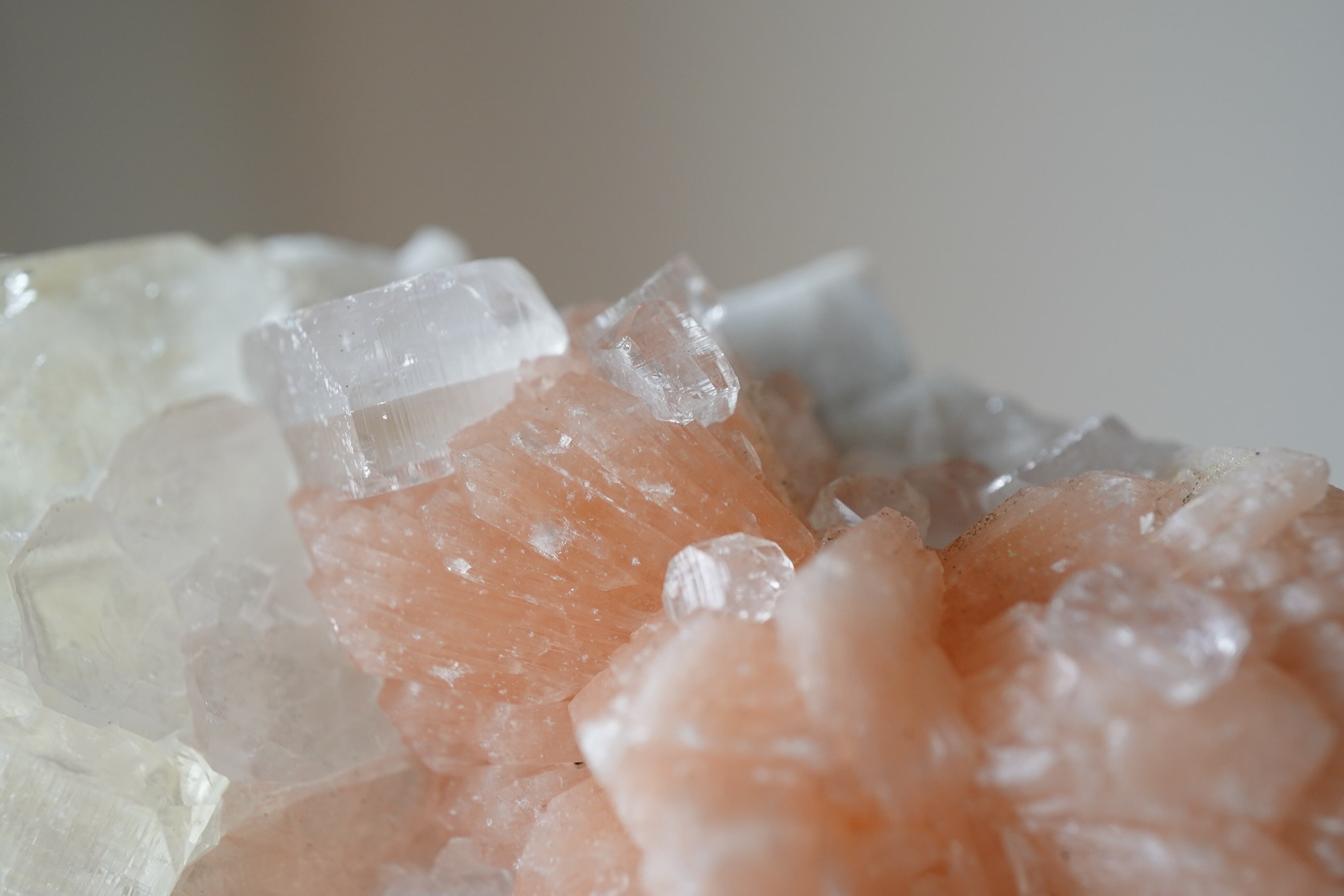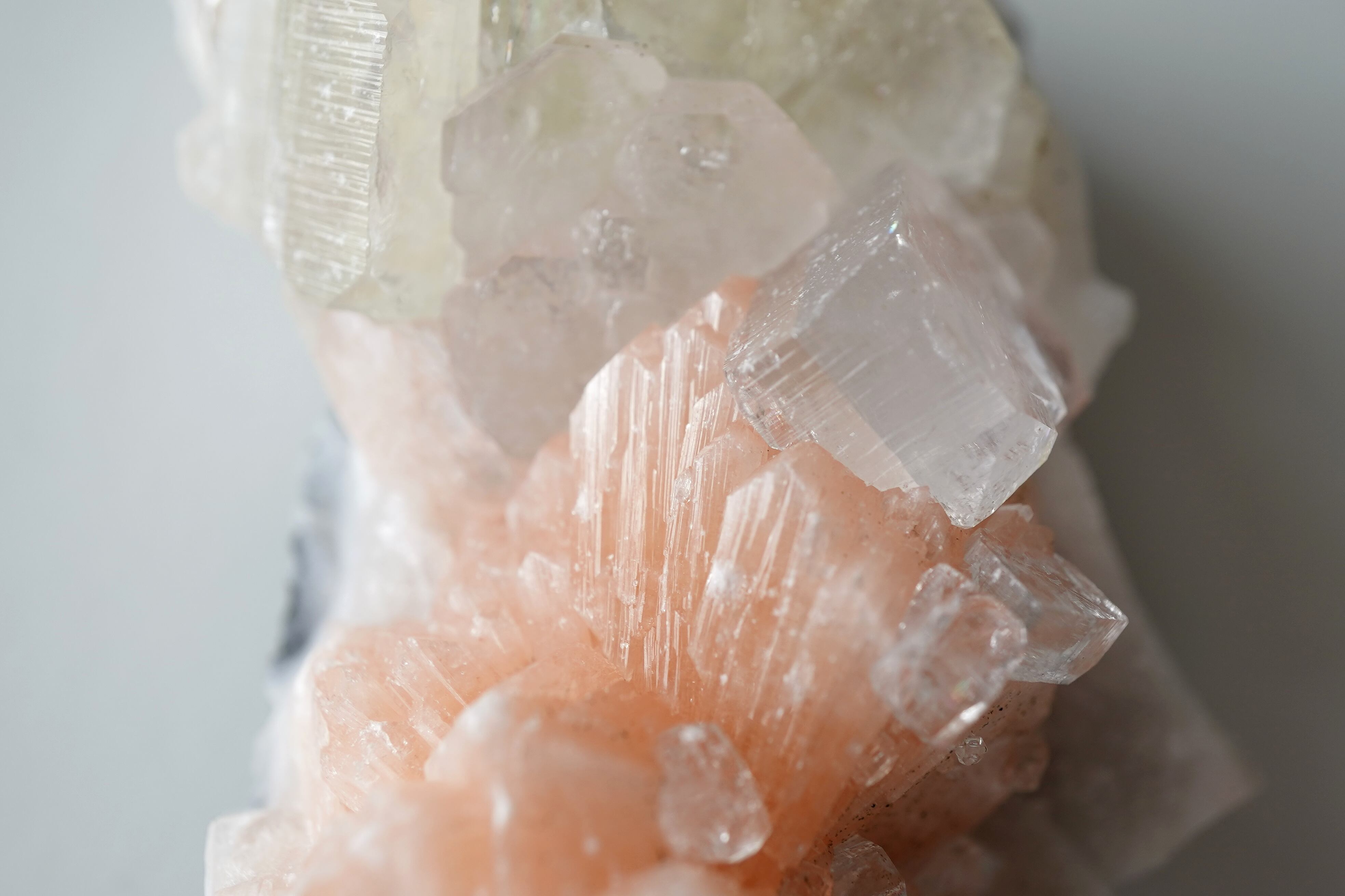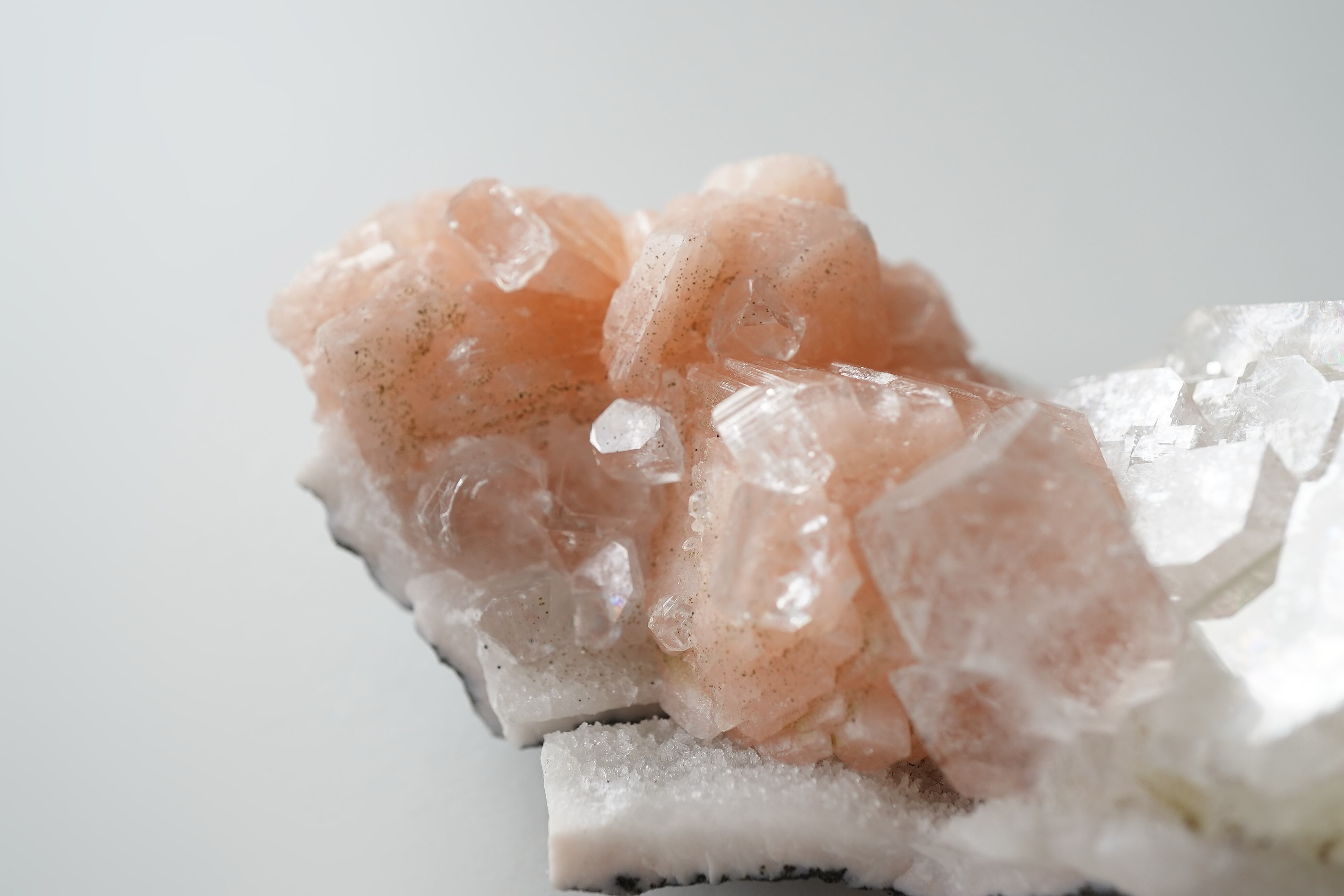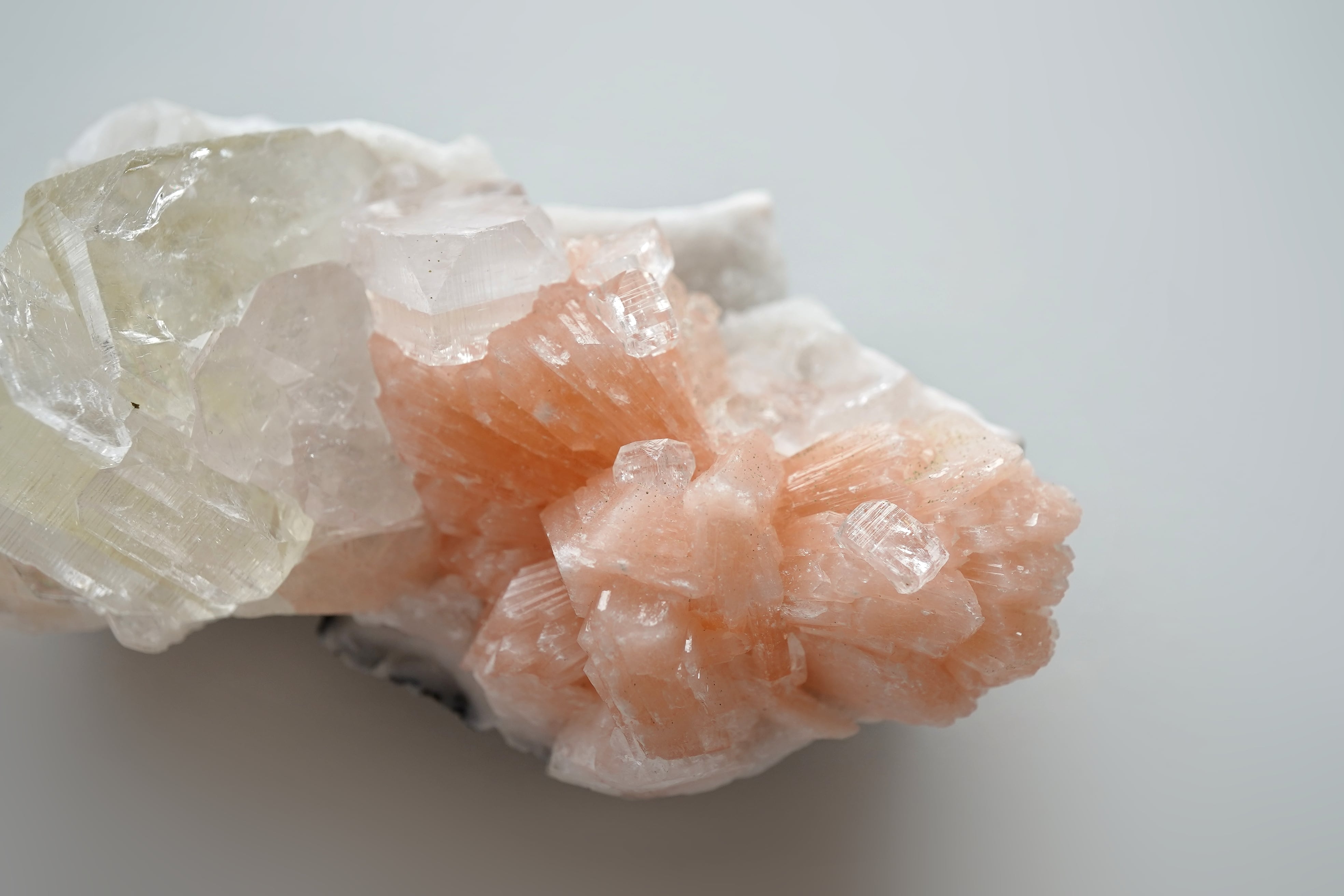 オレンジのスティルバイトとかすかに薄いグリーンがかかったアポフィライトの共生。スティルバイトの上にもアポフィライトがくっついていて可愛い。