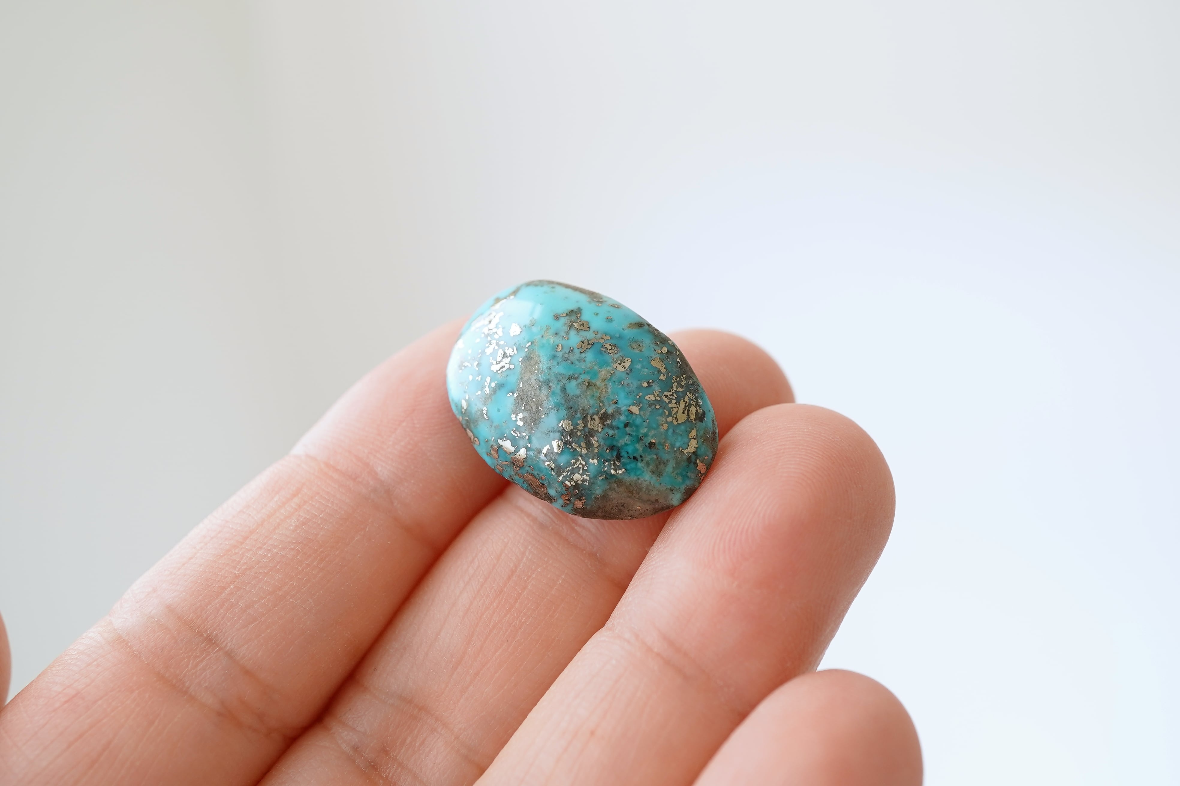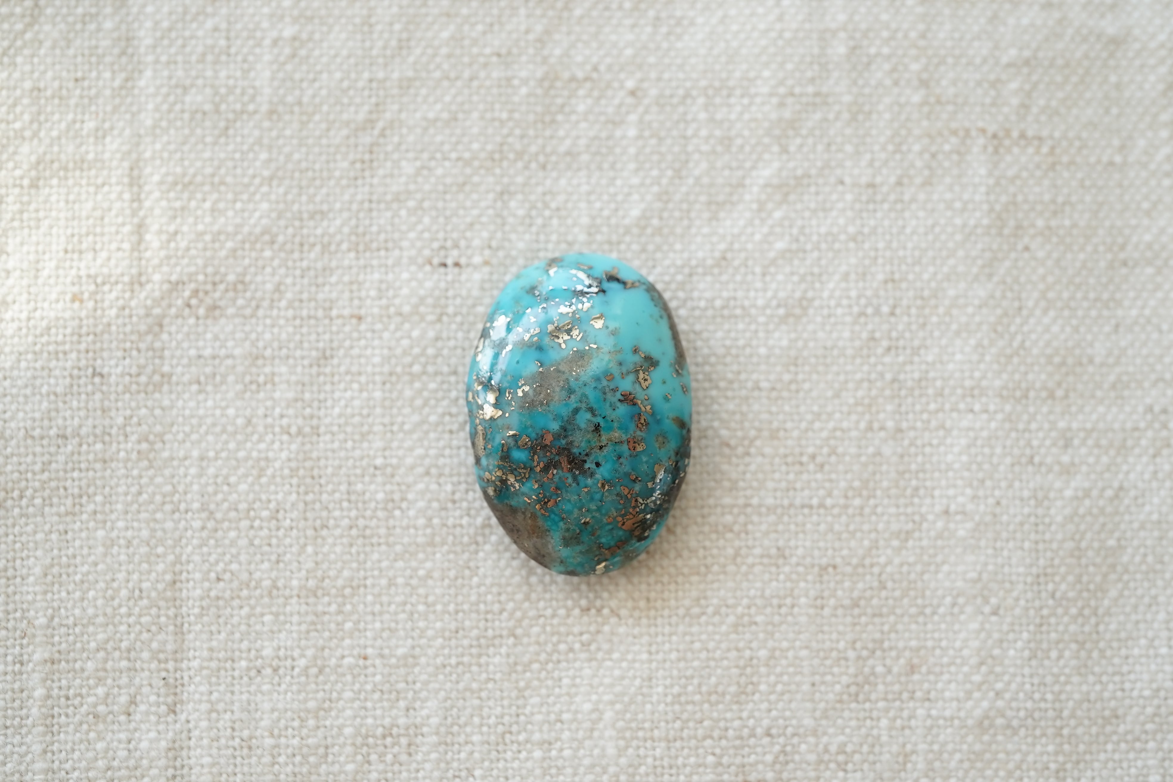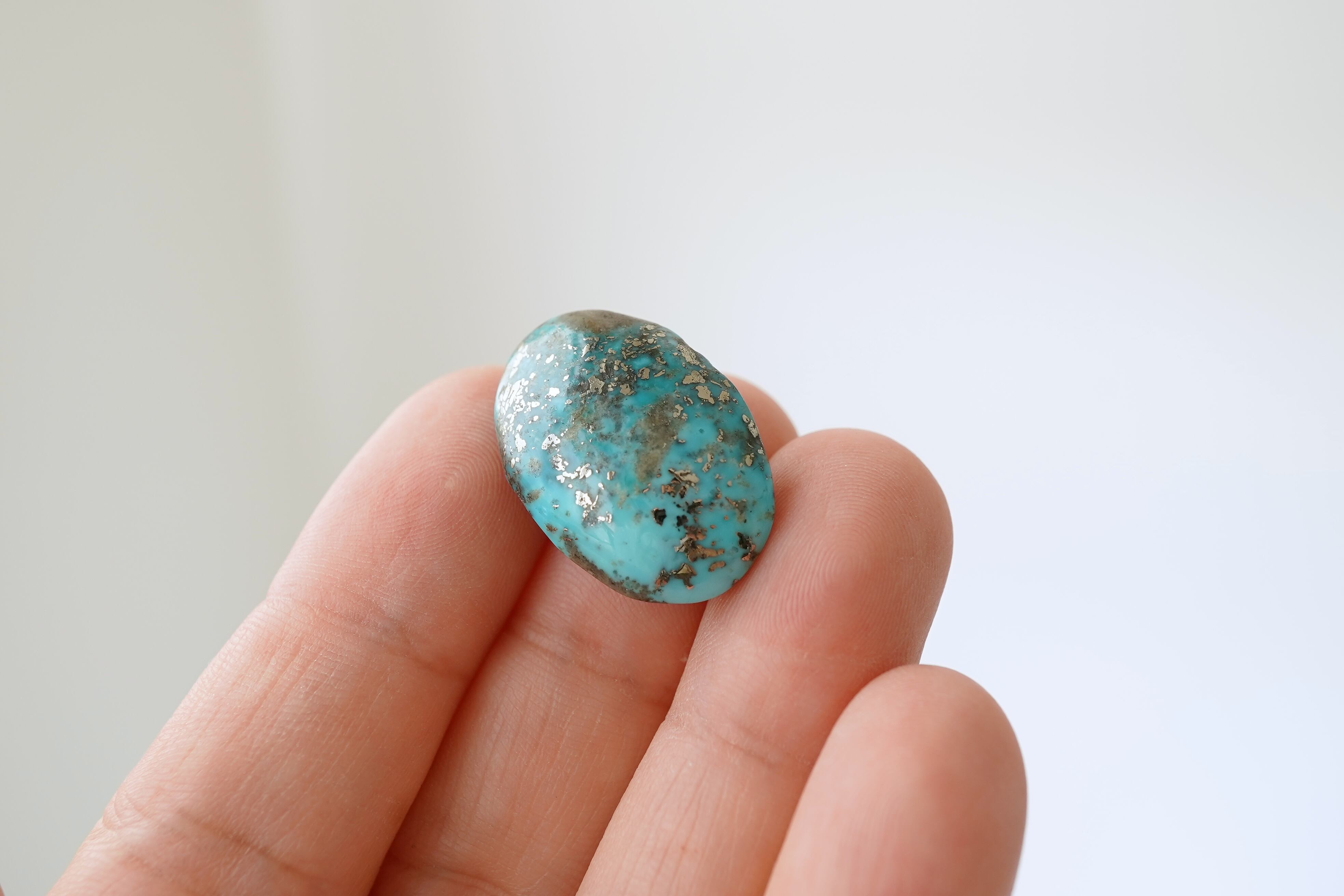 イラン・ケルマン州で産出された美しいブルーのターコイズ。カボションになっていますので、背面は平らです。若干グラデーションぽく色の濃淡が見られます。そして散りばめられたパイライトがキラリ。