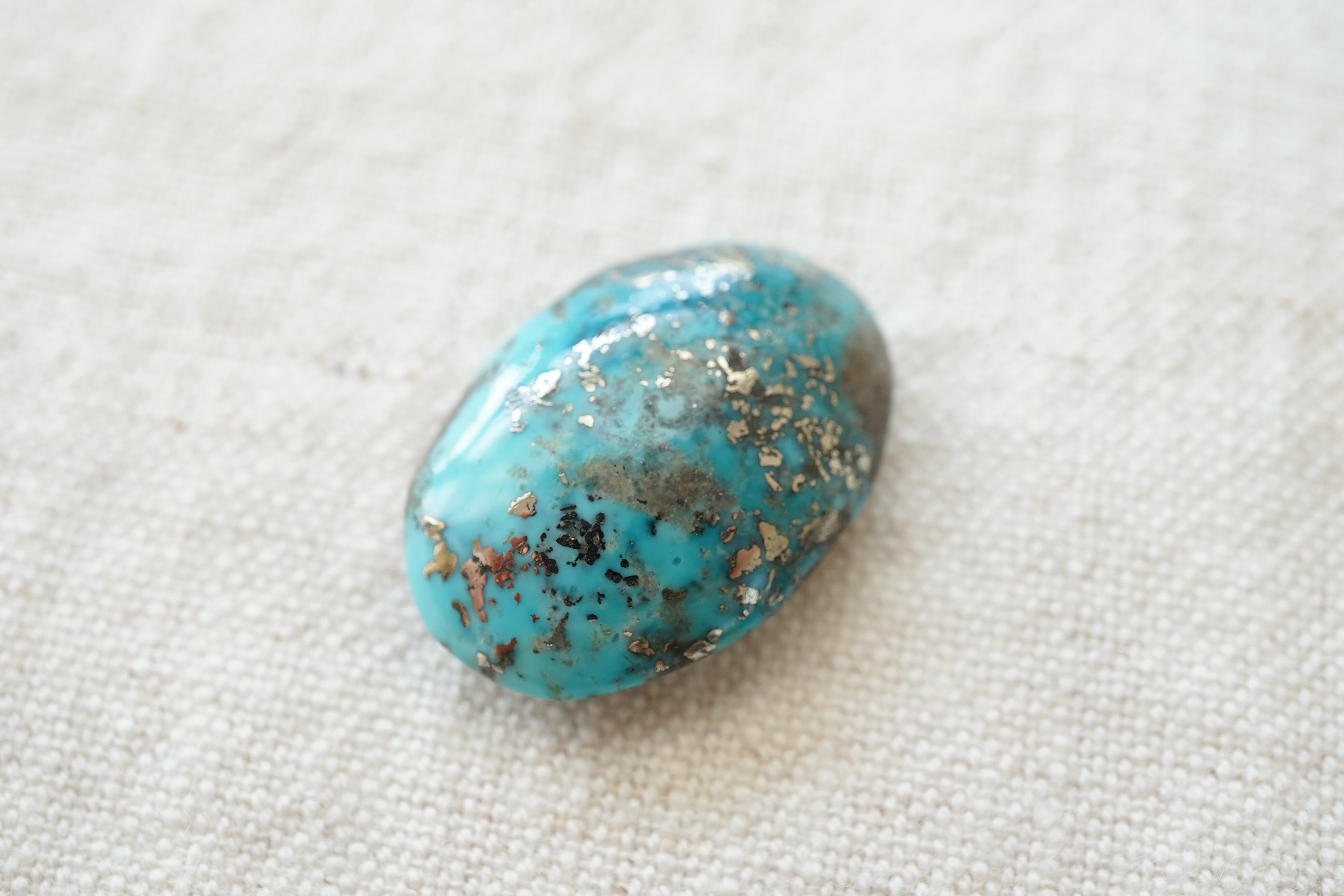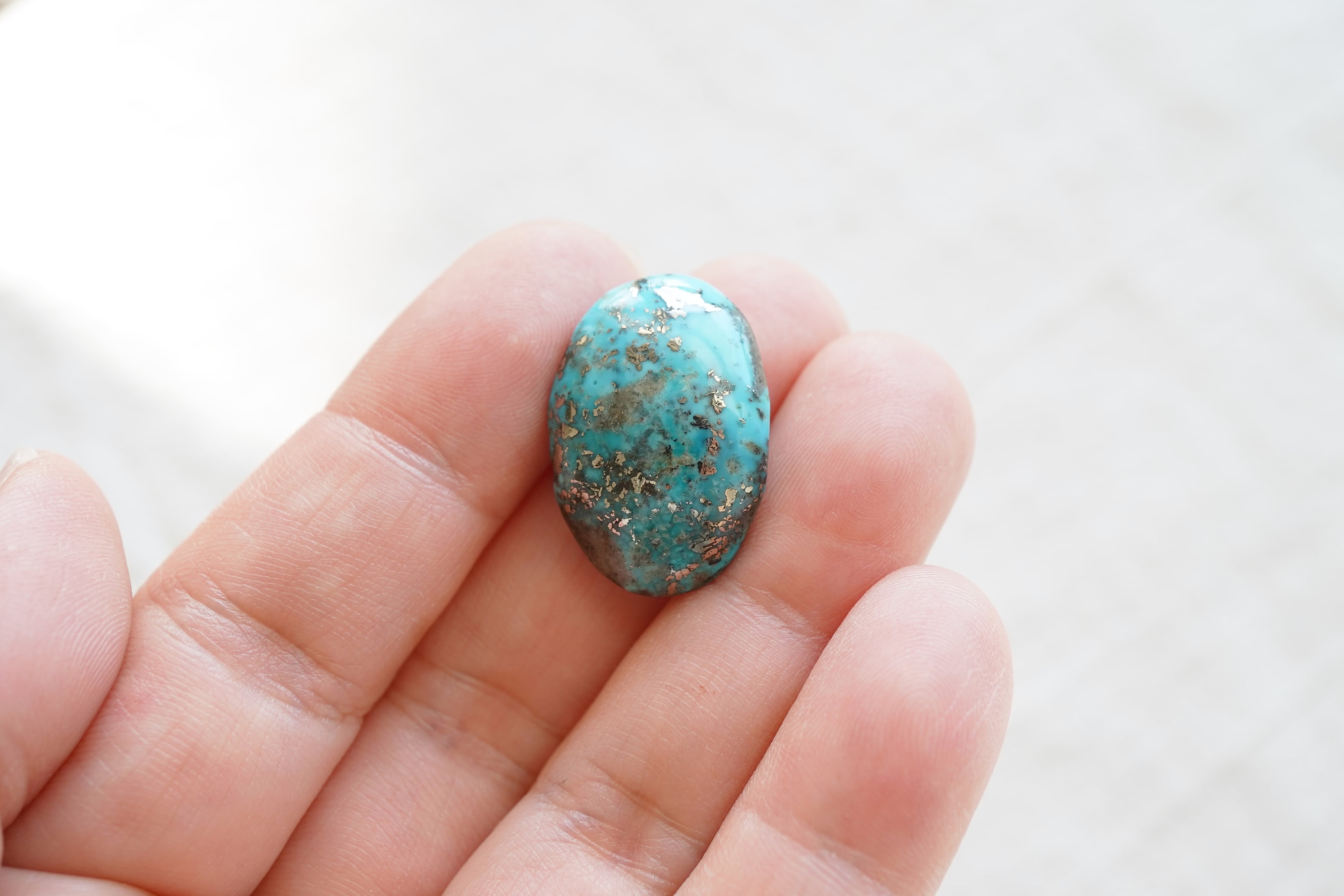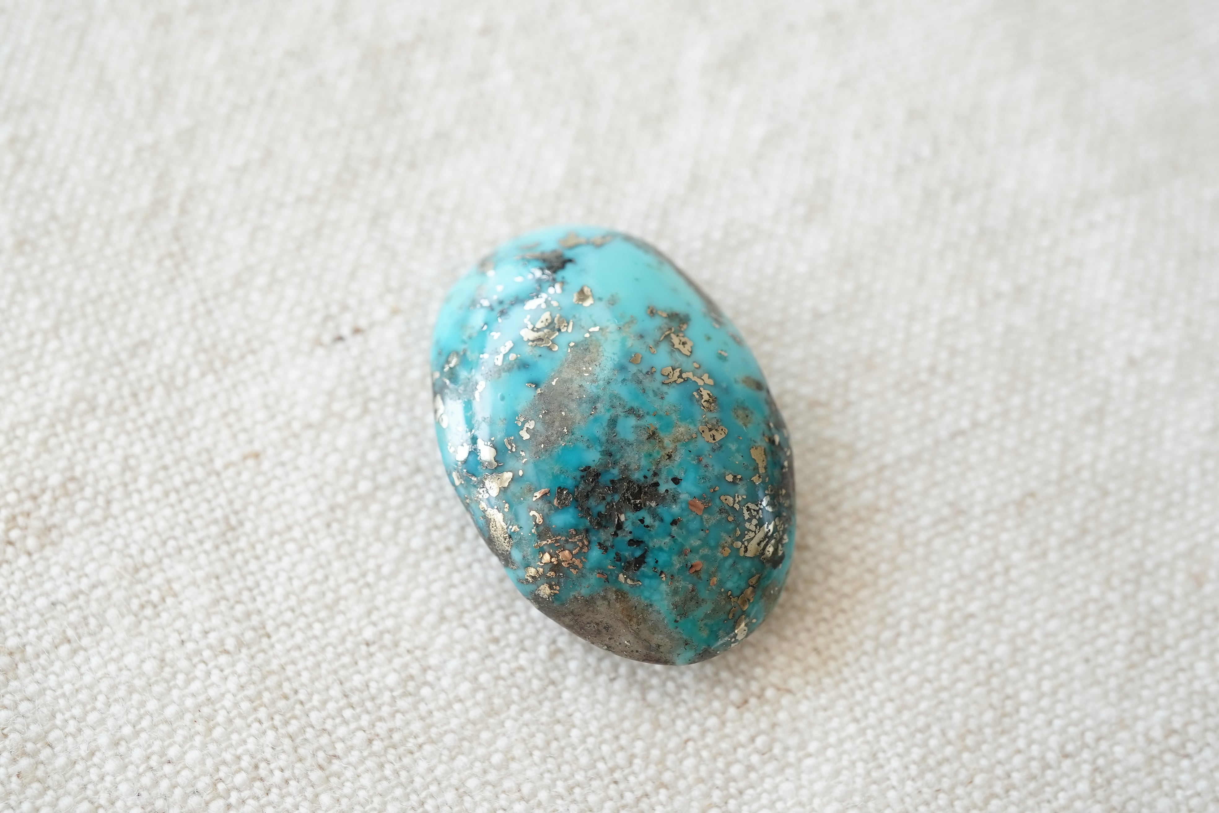 イラン・ケルマン州で産出された美しいブルーのターコイズ。カボションになっていますので、背面は平らです。若干グラデーションぽく色の濃淡が見られます。そして散りばめられたパイライトがキラリ。