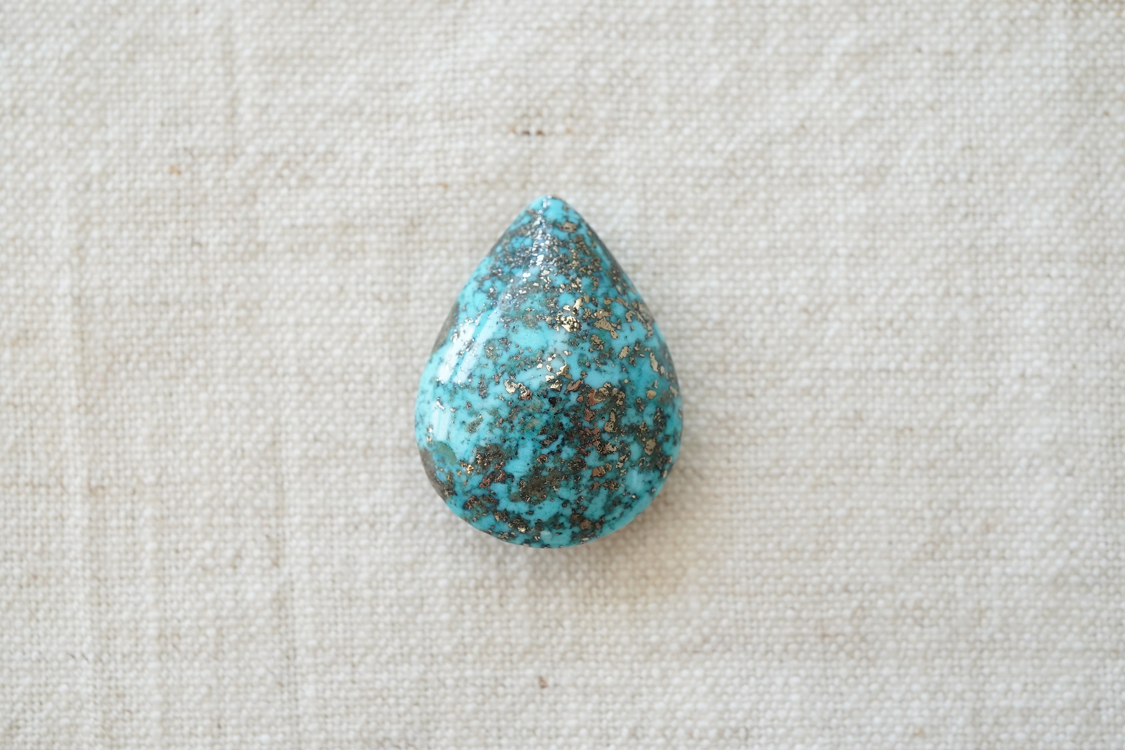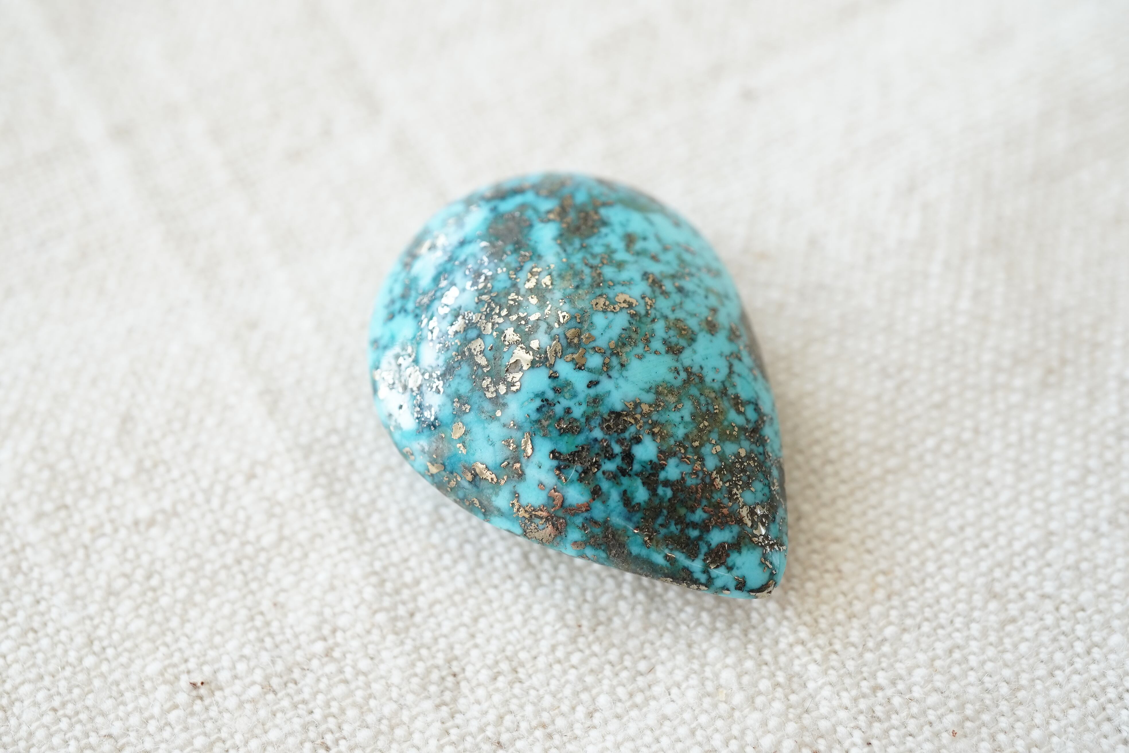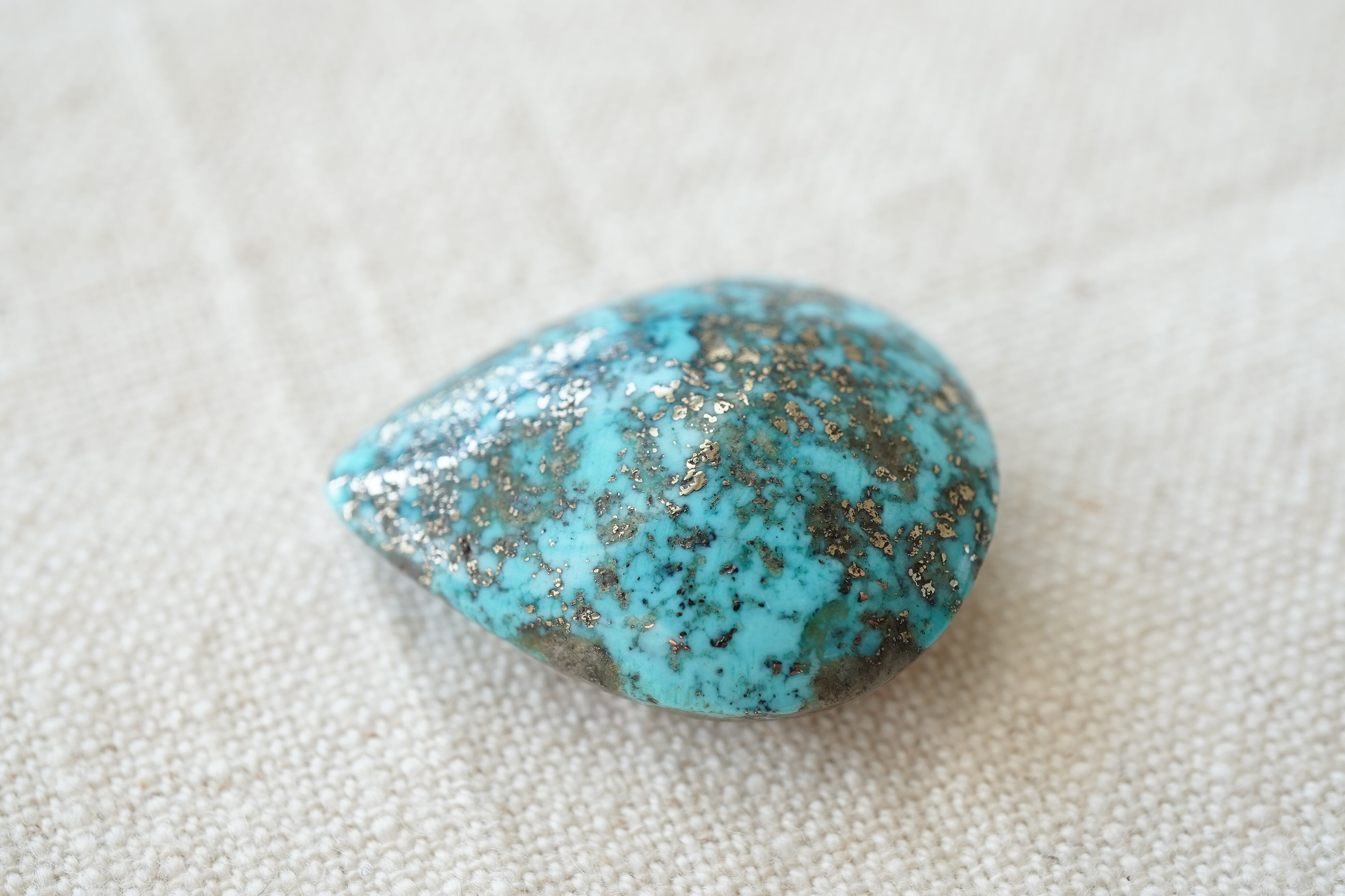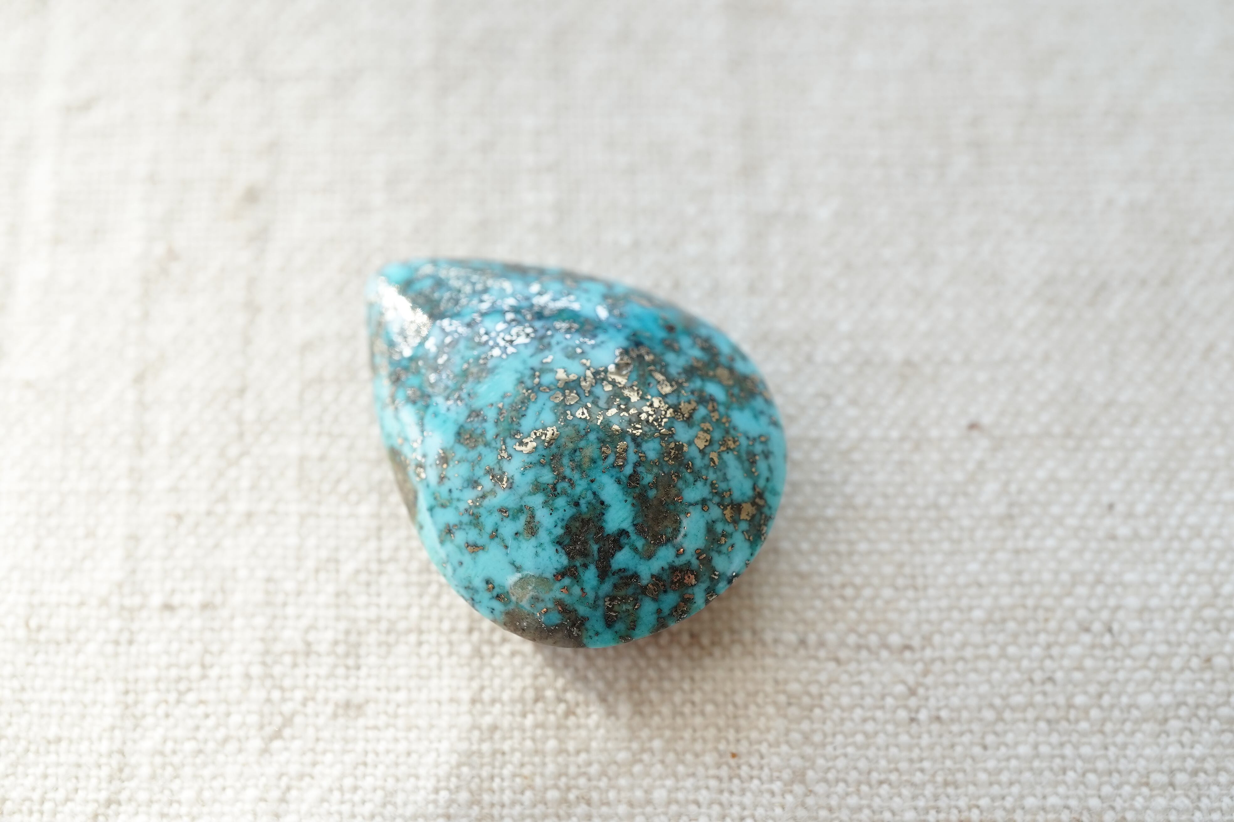 イラン・ケルマン州で産出された美しいブルーのターコイズ。カボションになっていますので、背面は平らです。こちらは涙型で全体満遍なくパイライトが入っています。ブルーとパイライトのコントラストが素敵です。