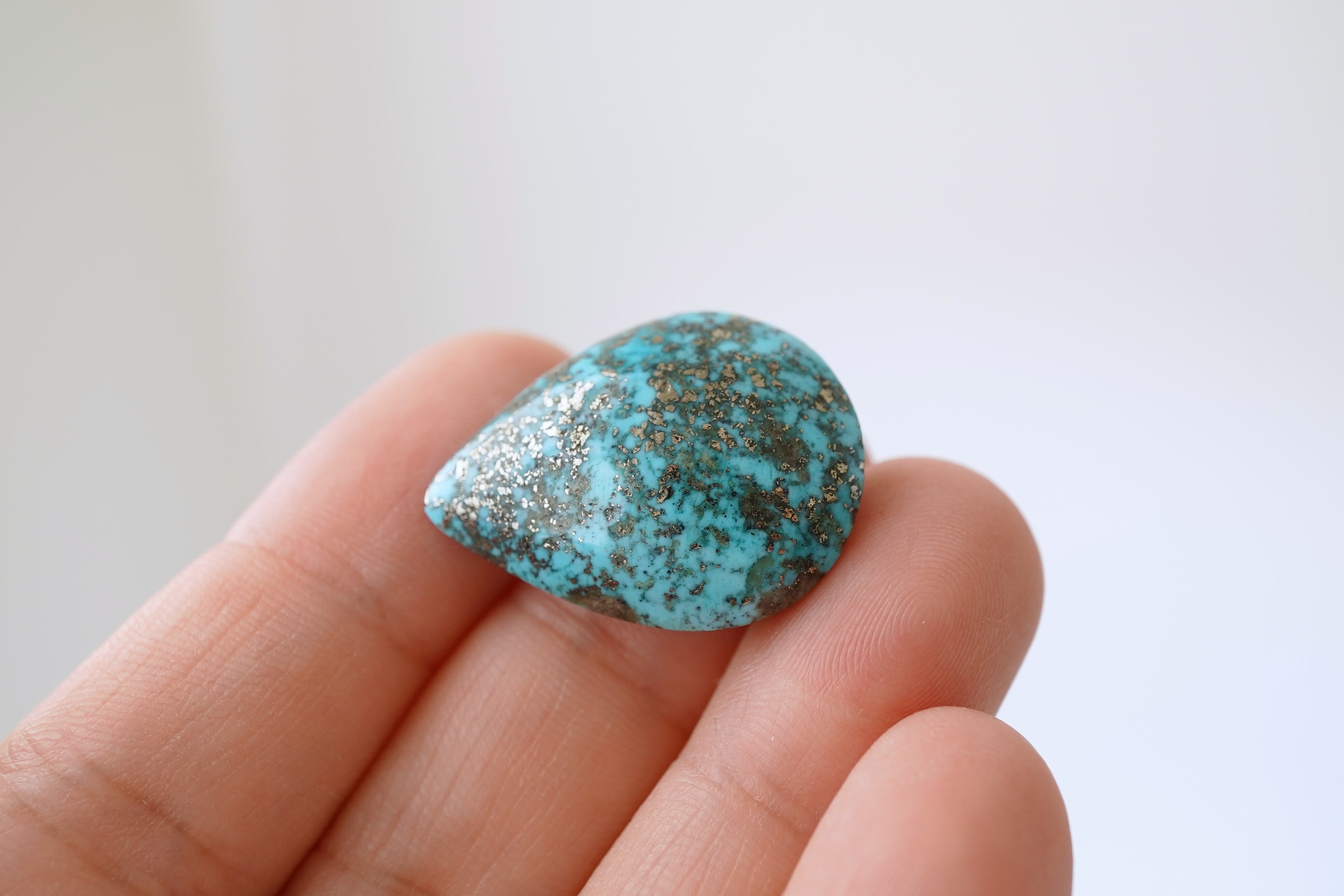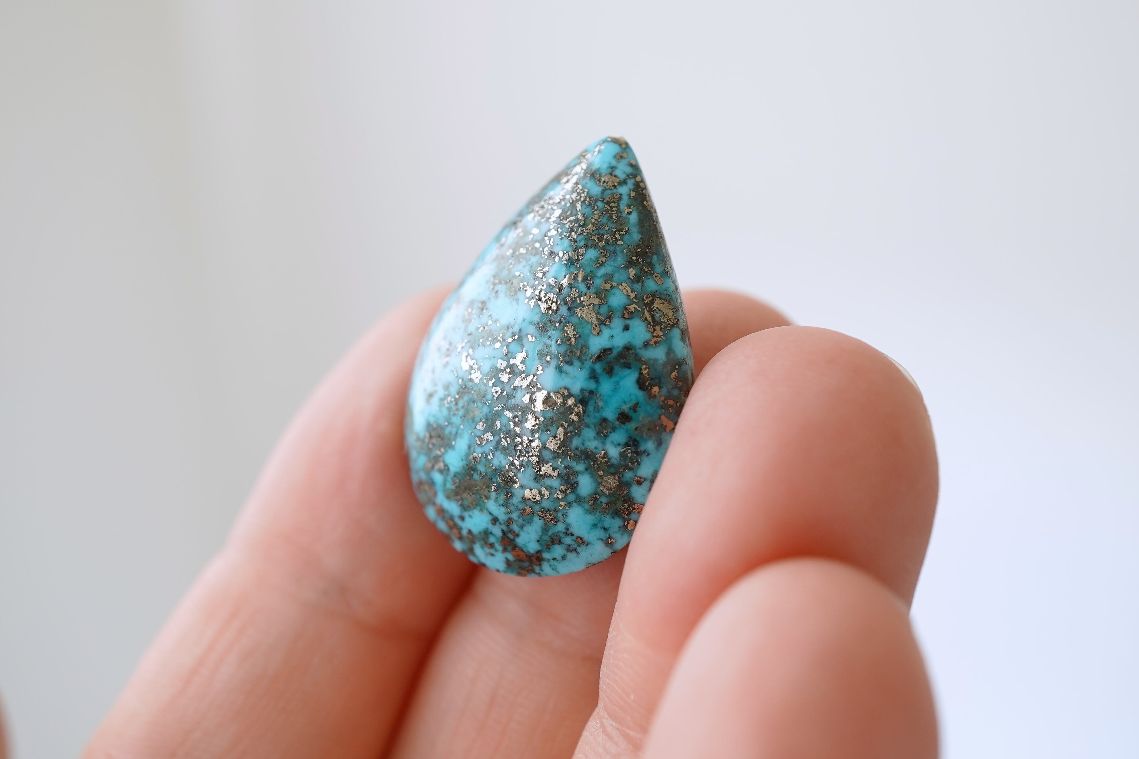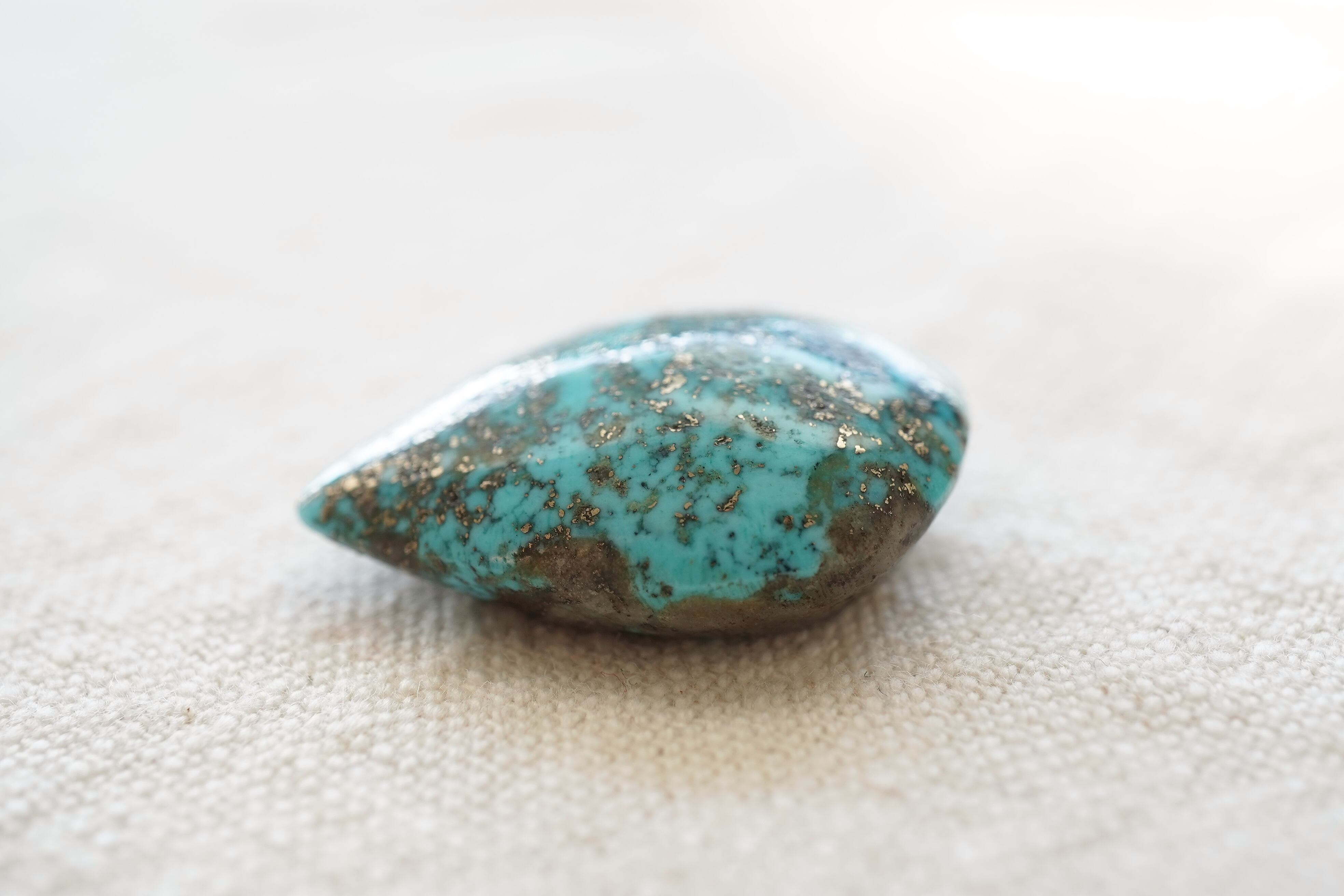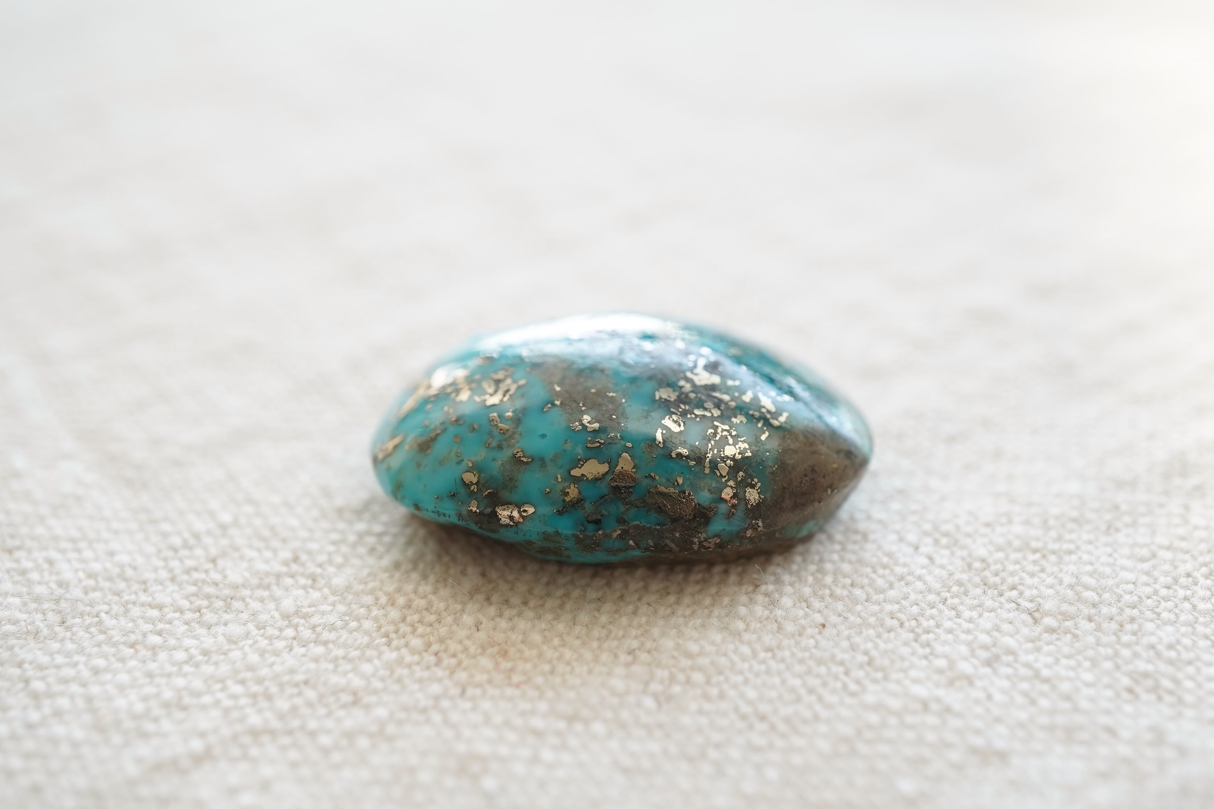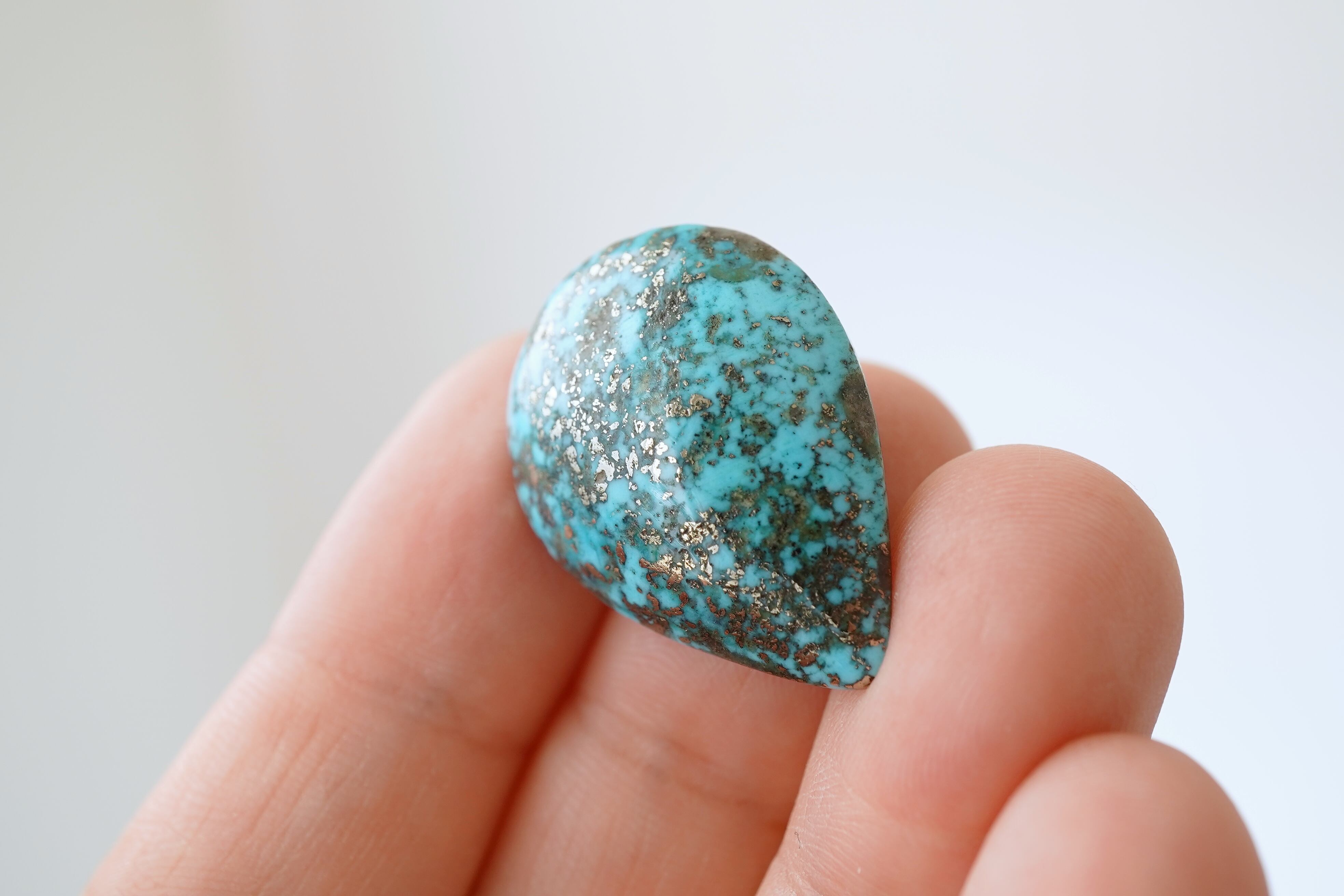 イラン・ケルマン州で産出された美しいブルーのターコイズ。カボションになっていますので、背面は平らです。こちらは涙型で全体満遍なくパイライトが入っています。ブルーとパイライトのコントラストが素敵です。