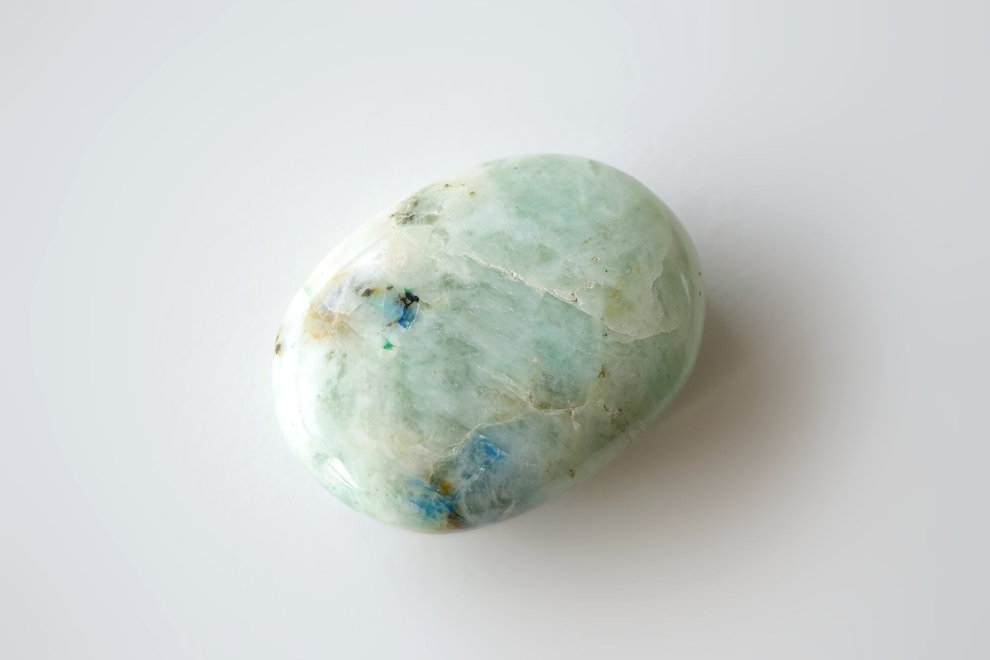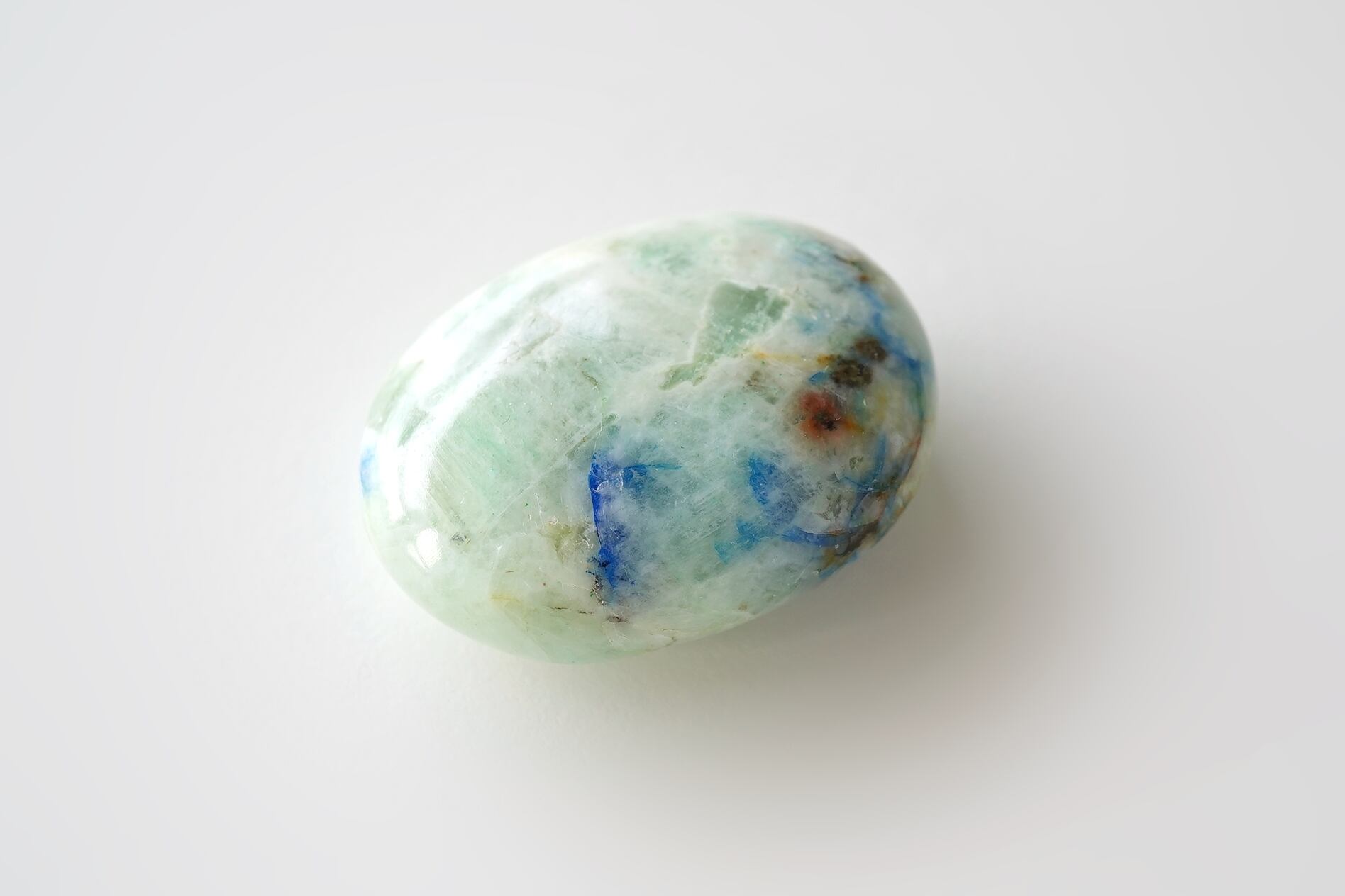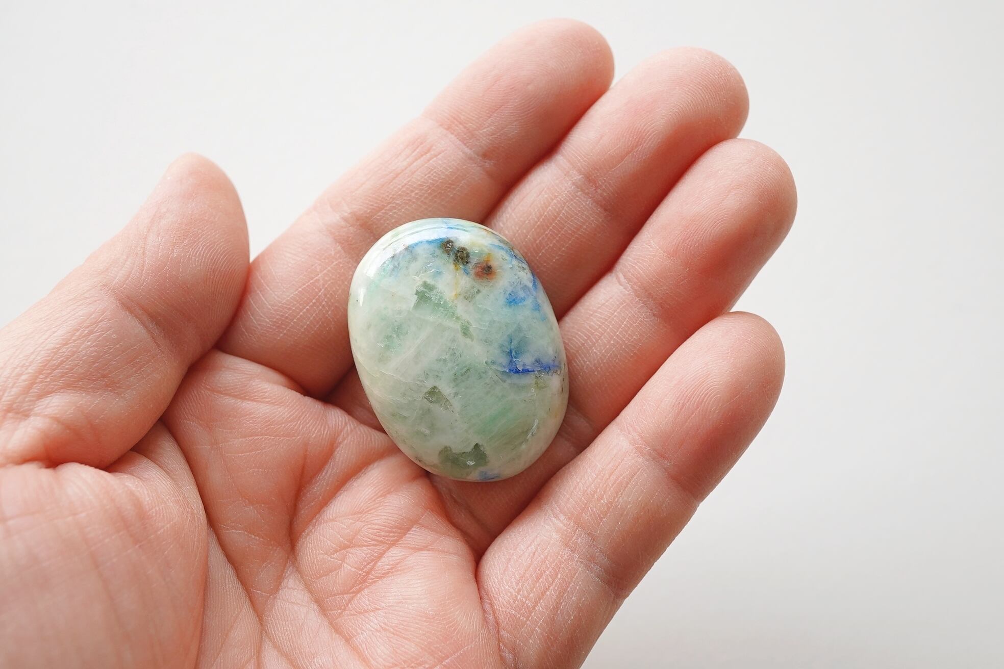 なんだか不思議な組み合わせだけども自然の創造物には毎度驚かされます。グリーンムーンストーンに入り込んだアズライトのブルー。グリーンムーンストーンは通称ガー二エライトとも呼ばれています。
