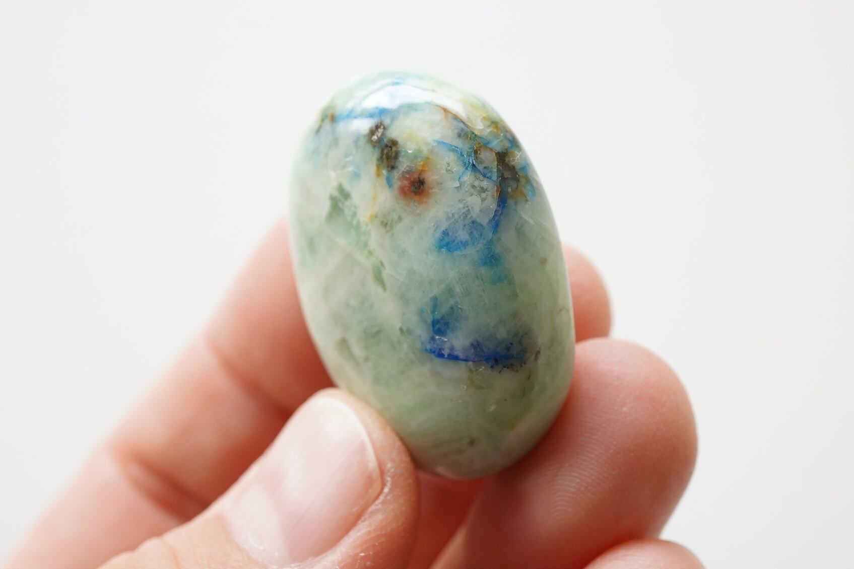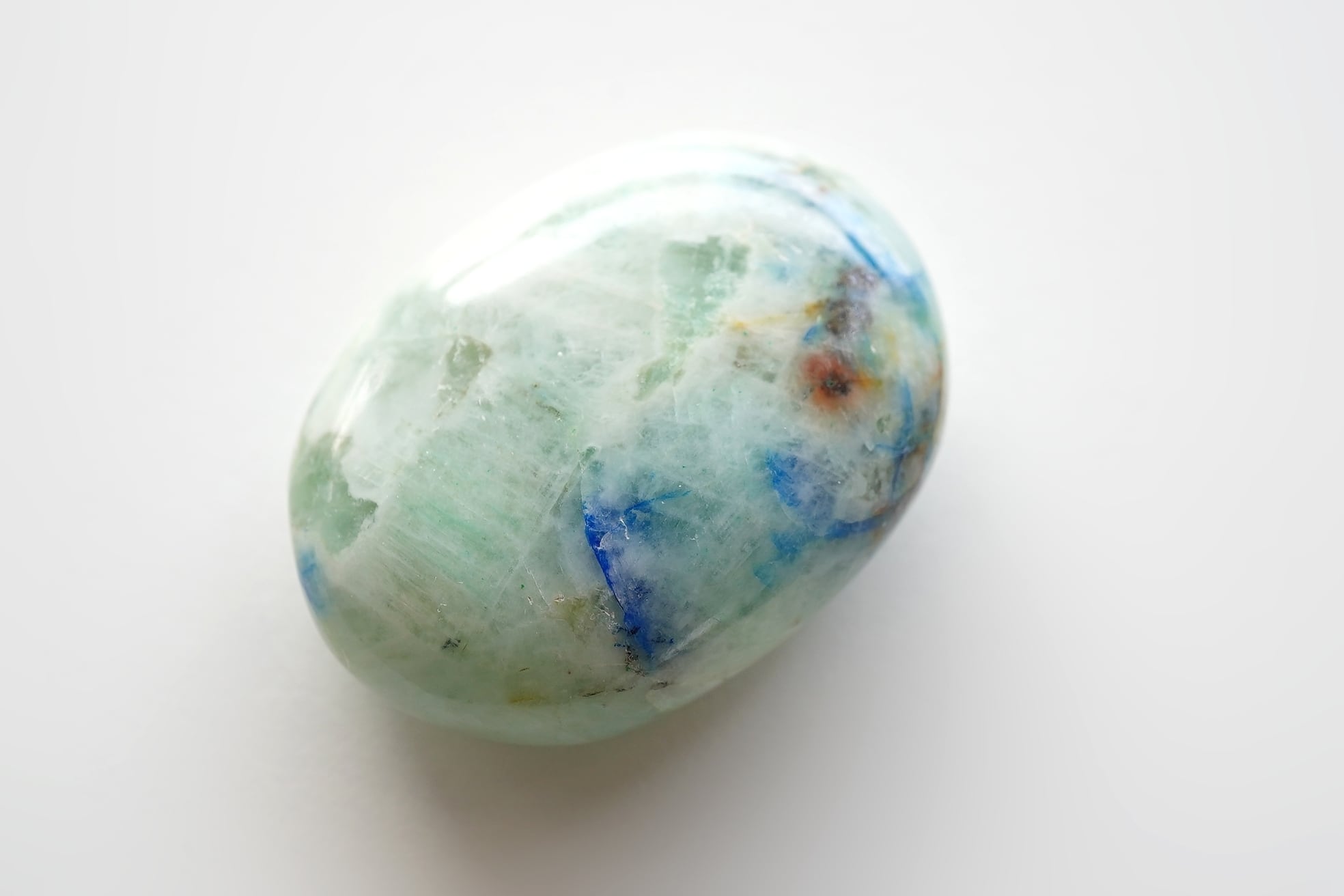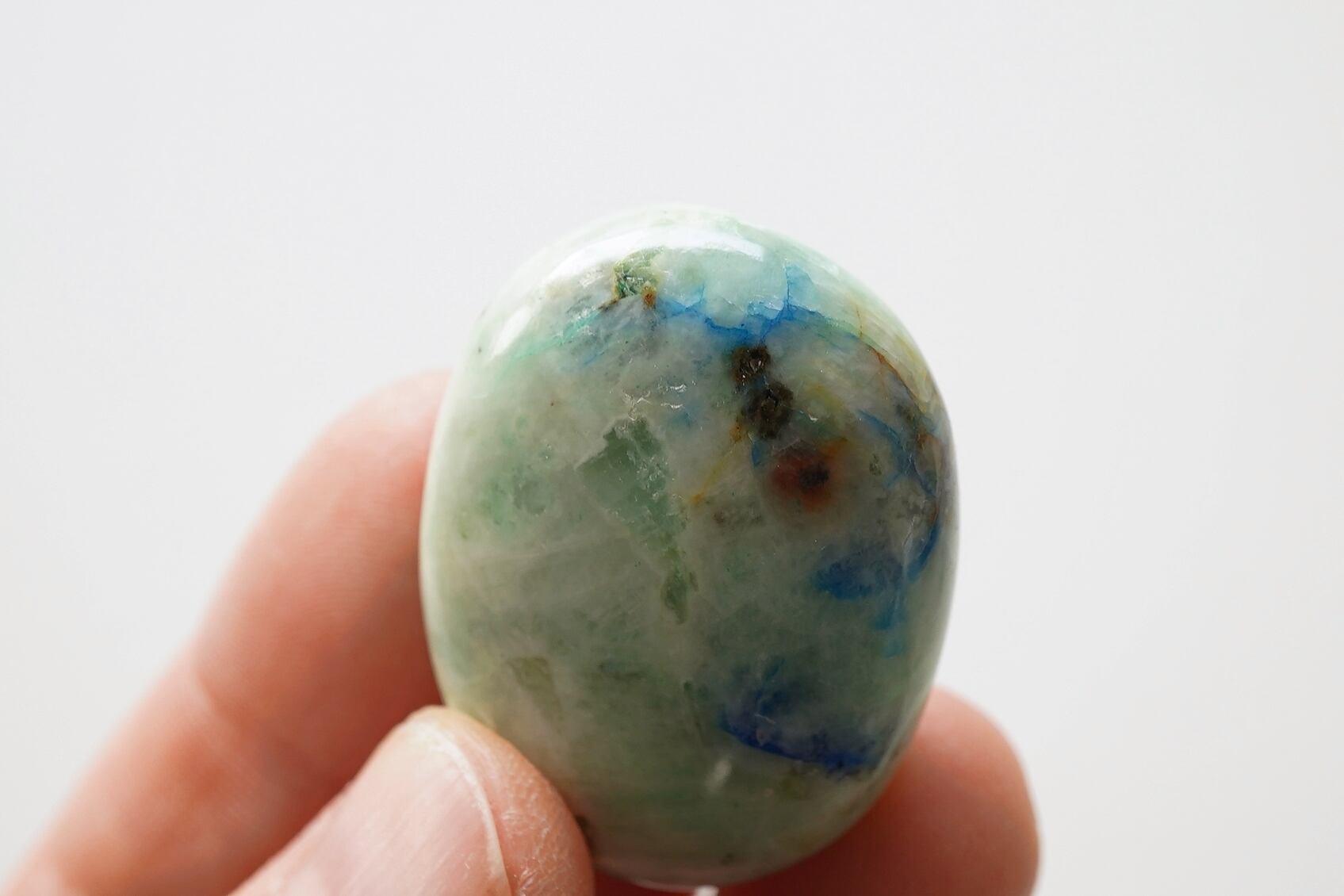 なんだか不思議な組み合わせだけども自然の創造物には毎度驚かされます。グリーンムーンストーンに入り込んだアズライトのブルー。グリーンムーンストーンは通称ガー二エライトとも呼ばれています。