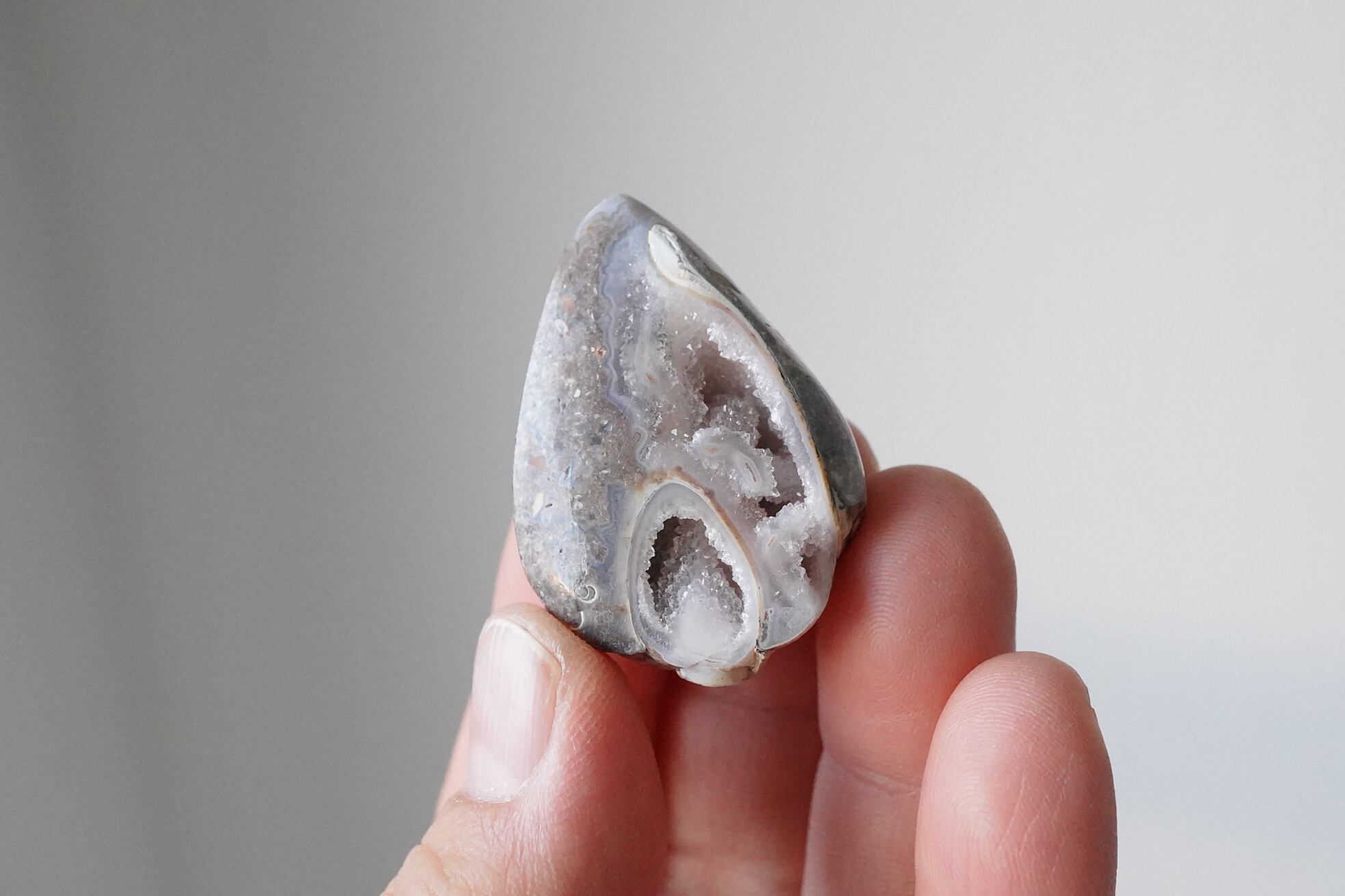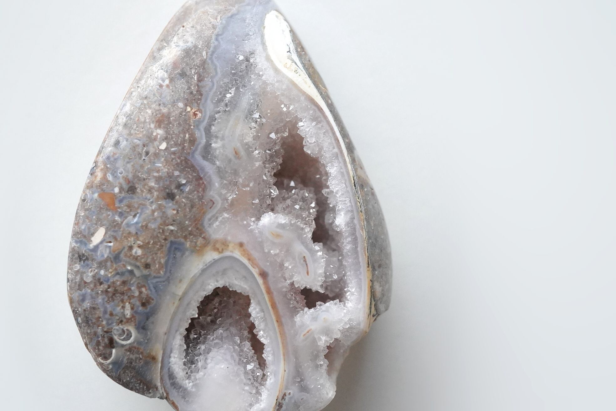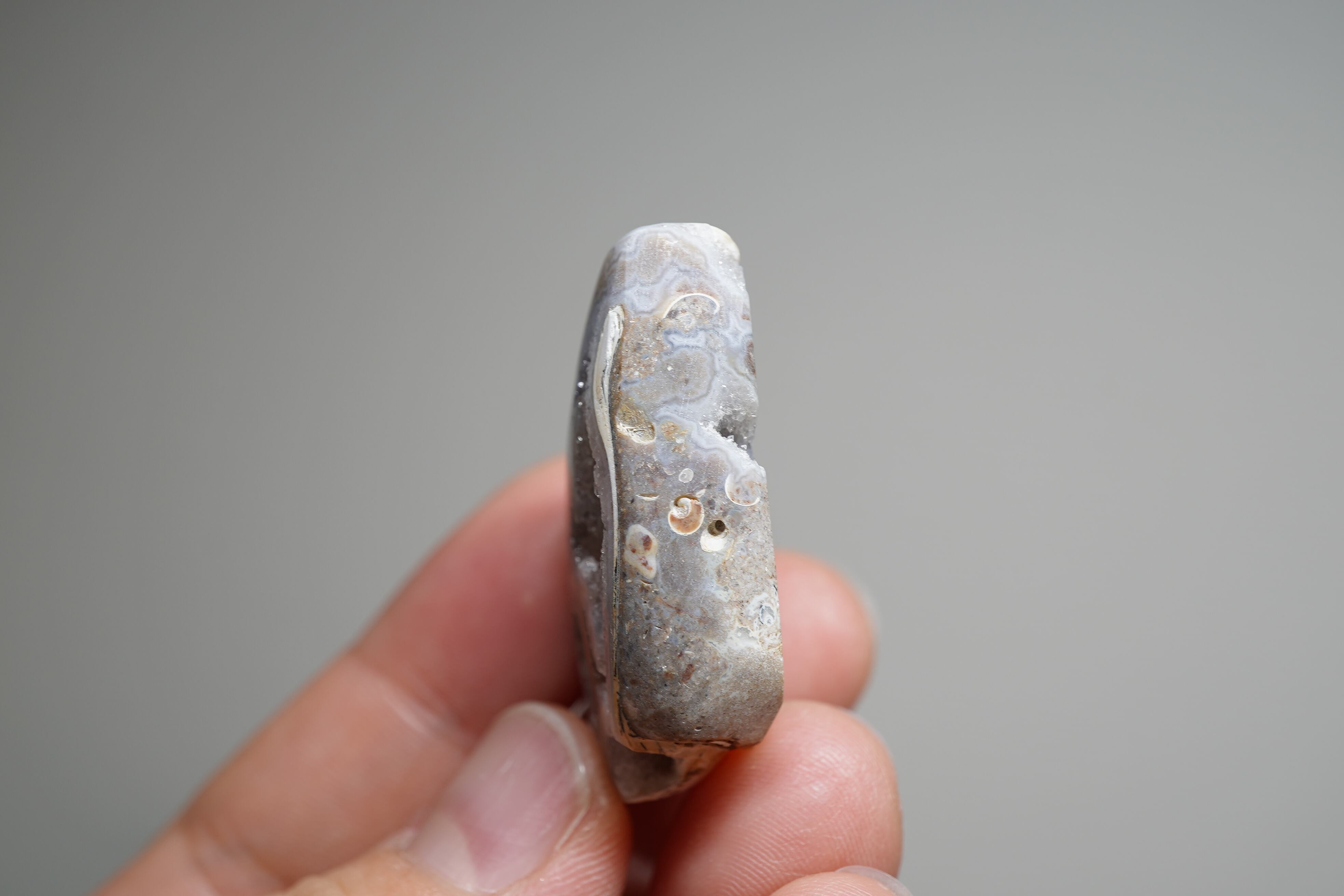 見かけは貝、中身は石英、名探偵スパイラライト。外側は貝の姿を残したまま時がたち。とても珍しい鉱物界隈で言うところの「仮晶」と呼ばれるとても珍しい現象です。一応カボションぽく背面はフラットになっています。鉱物 and 化石Loversに親しみが持てる一つではないでしょうか。中はドゥルージー状になっており、細かな水晶が見られます。表の面にはアゲート状になっているのがわかります。貝の茶色い部分とアゲートの部分とがうまく混ざり合っていてとても神秘的です。
