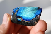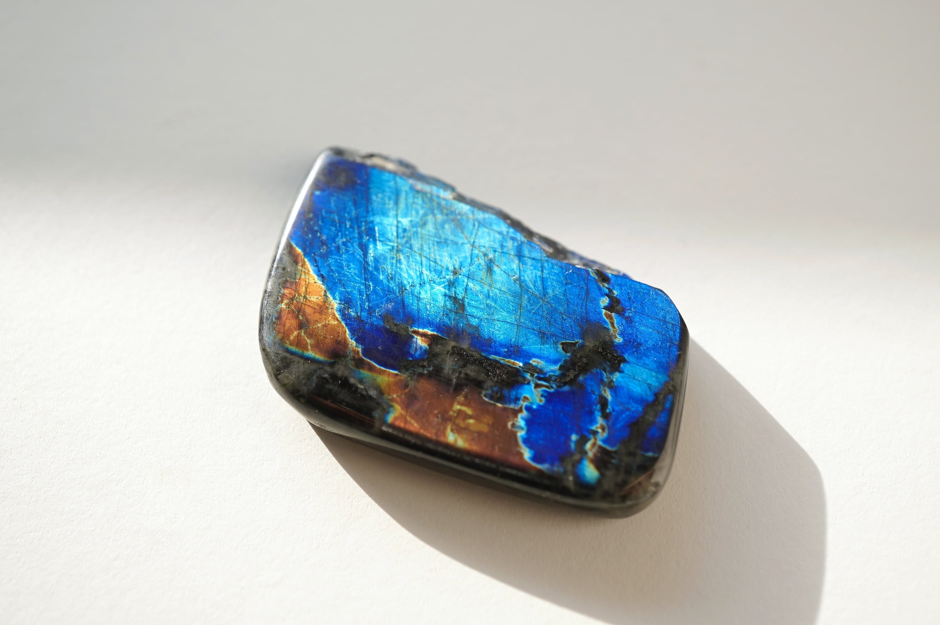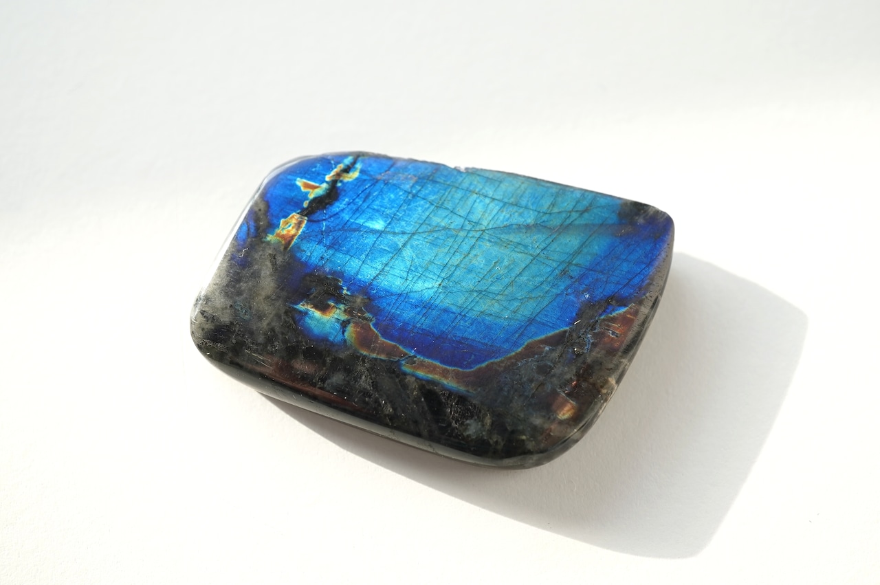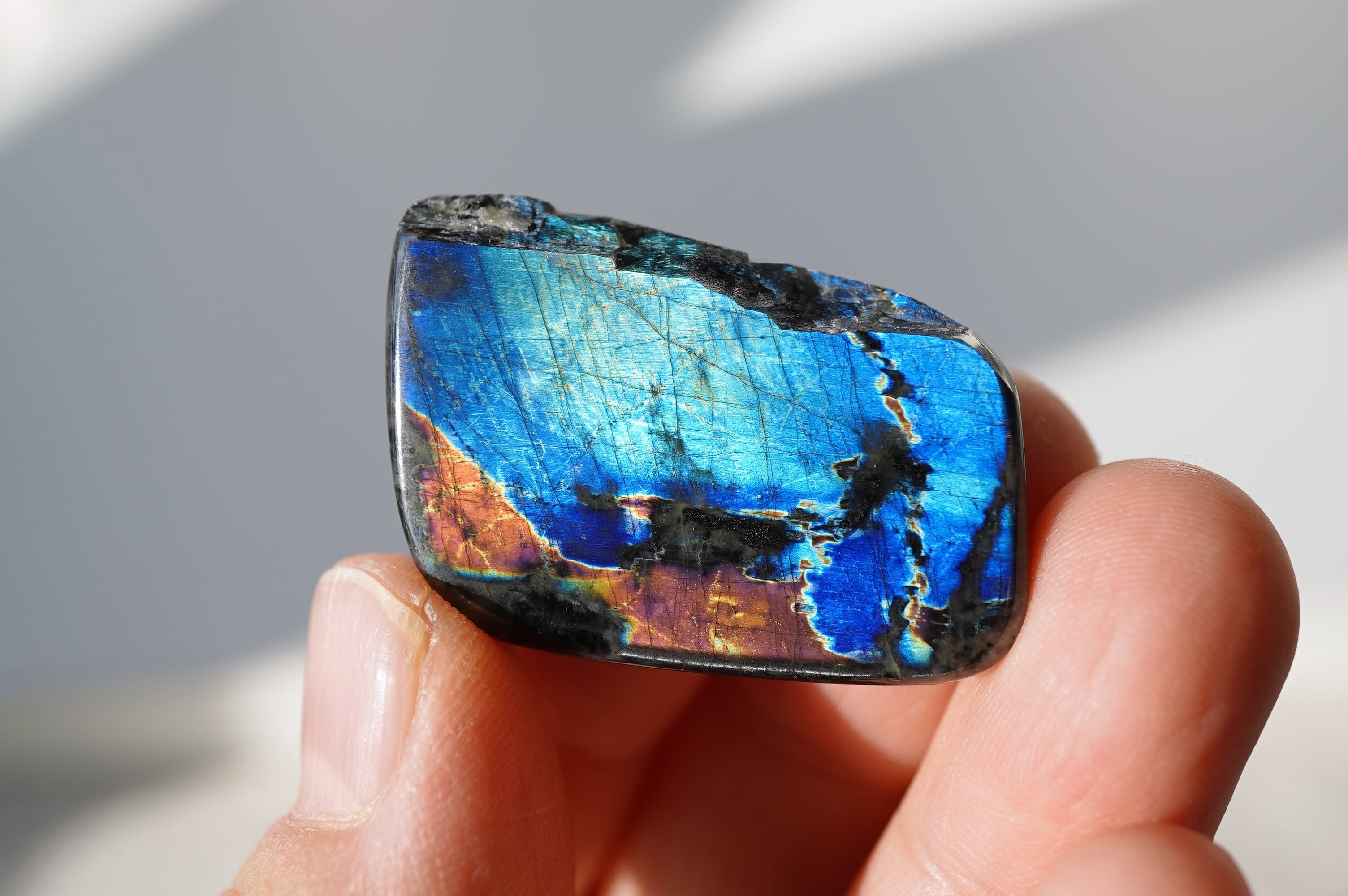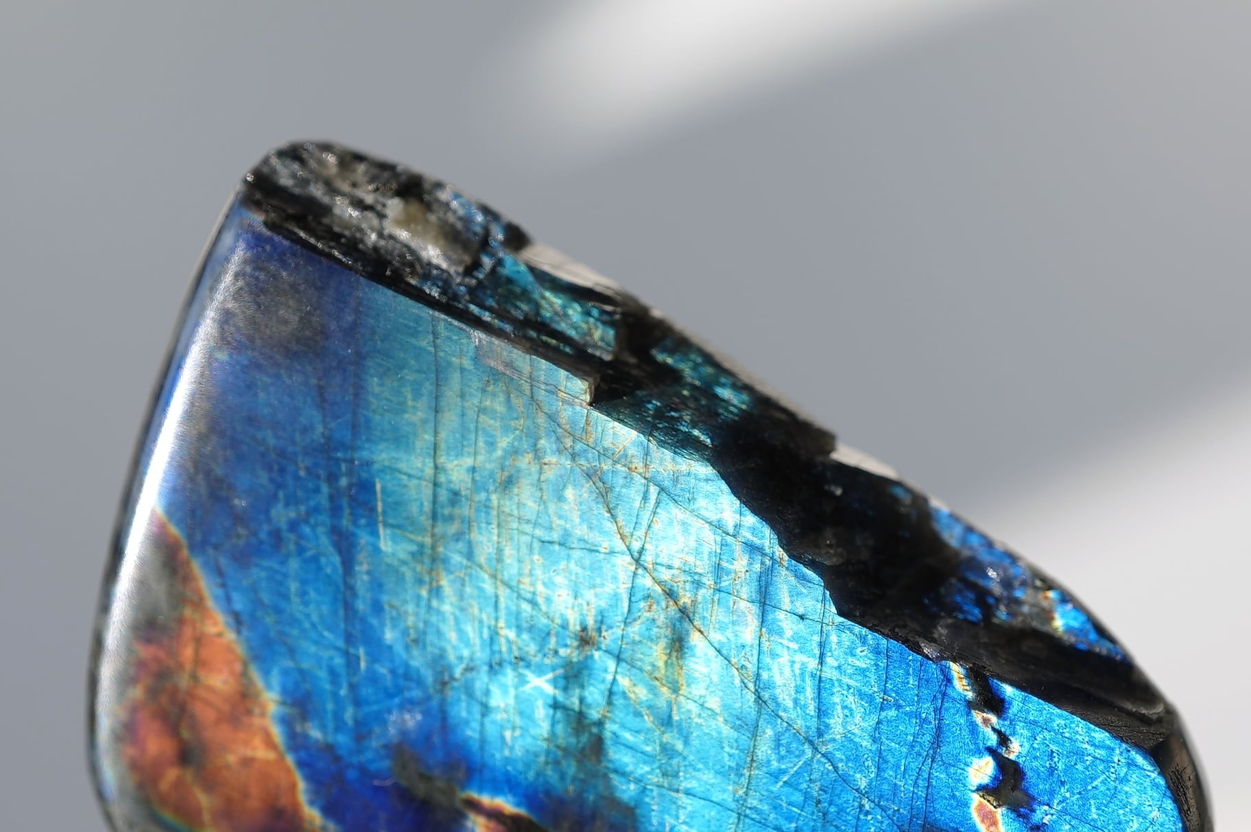 ラブラドライトと同じ成分ではあるのにどこか違う雰囲気を持つ石。そしてフィンランドで採れたものだけが”スペクトロライト”と呼ばれます。店主の感覚ですが、スペクトロライトの色はマダガスカル産のラブラドライトに比べて濃ゆい色合いと複雑な模様にあると思っています。まるで幾何学模様のように織り交ぜられた模様や、深い色から眩しいほどの光の閃光。全面磨きでサイドの一部の原石残しをしています。元の質感も楽しんでいただけたらと思います。