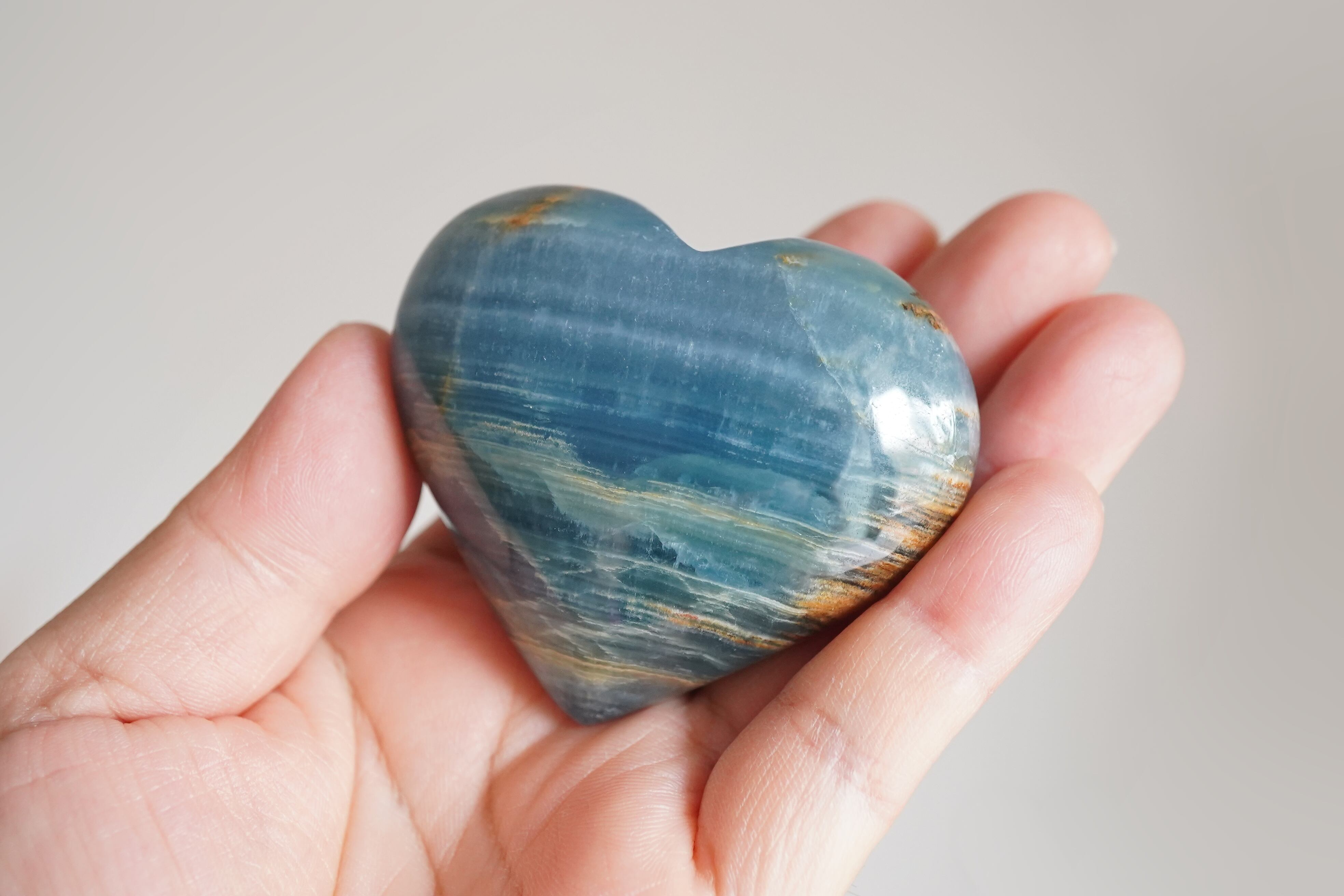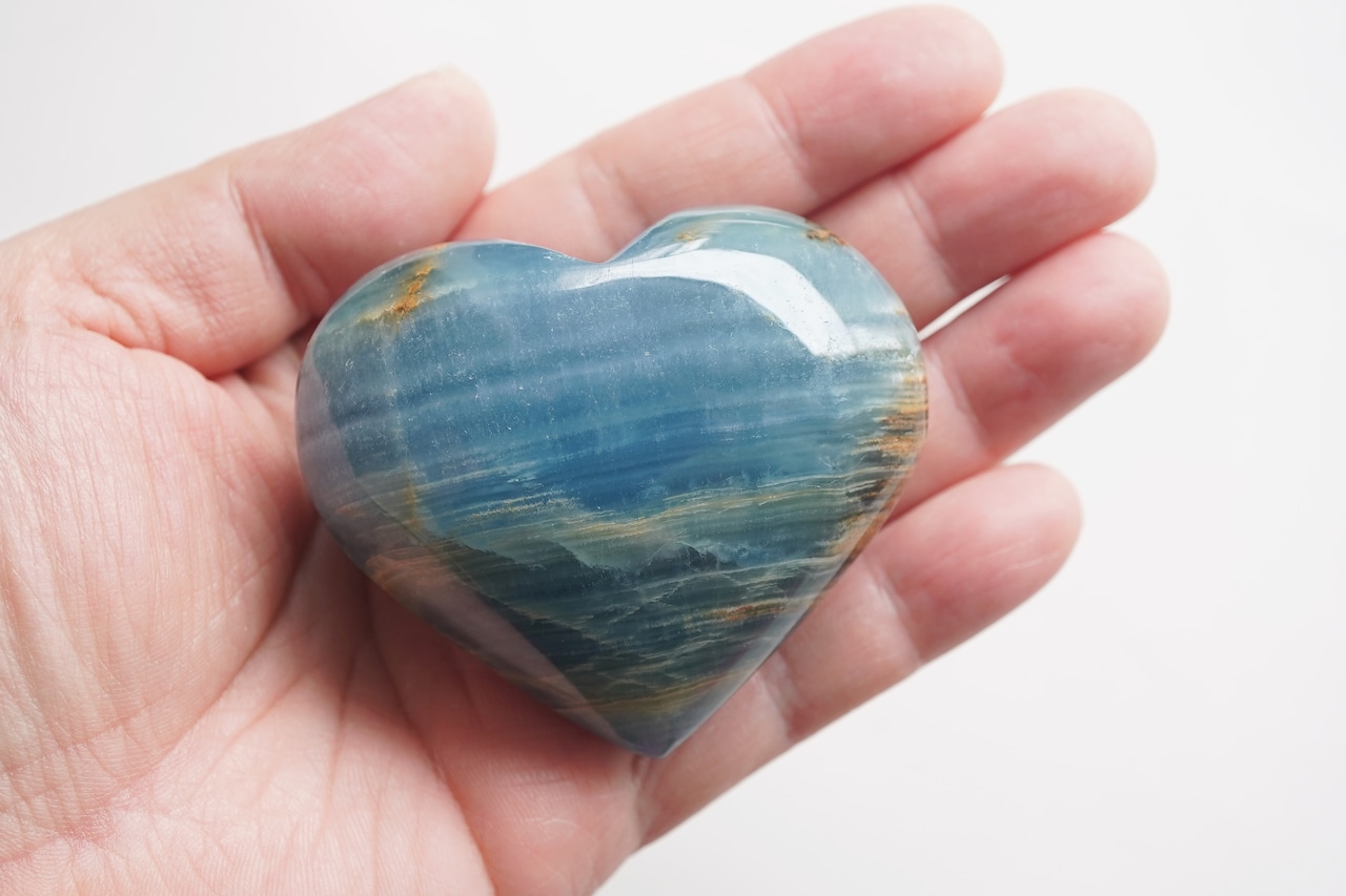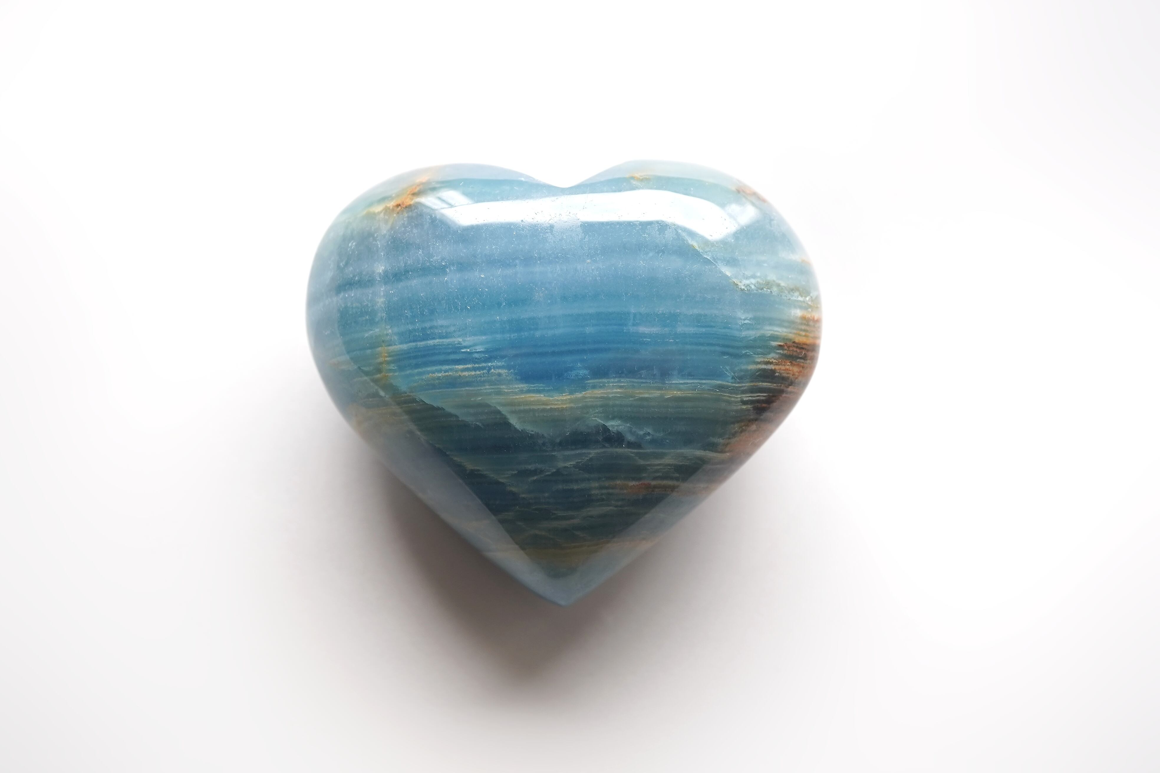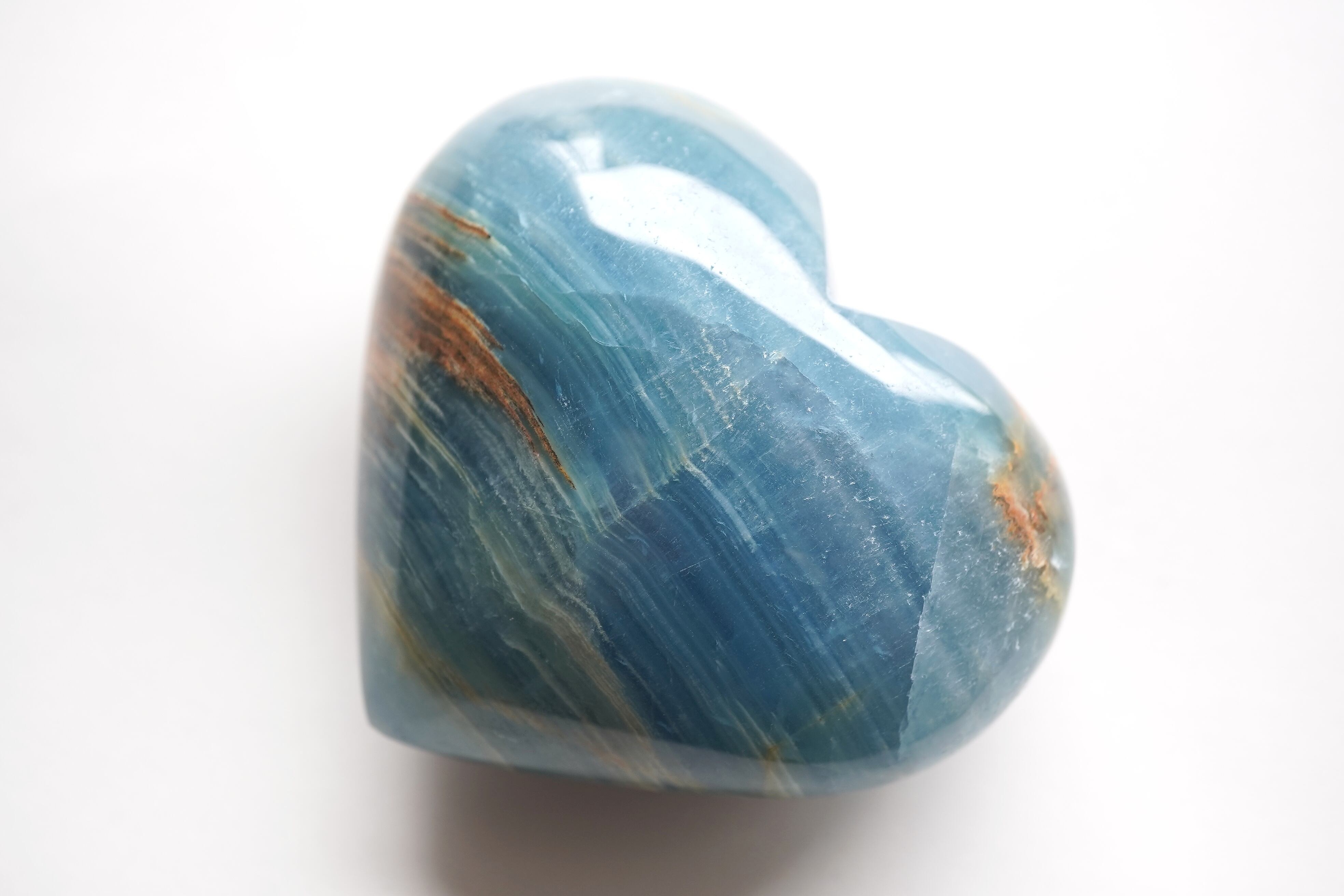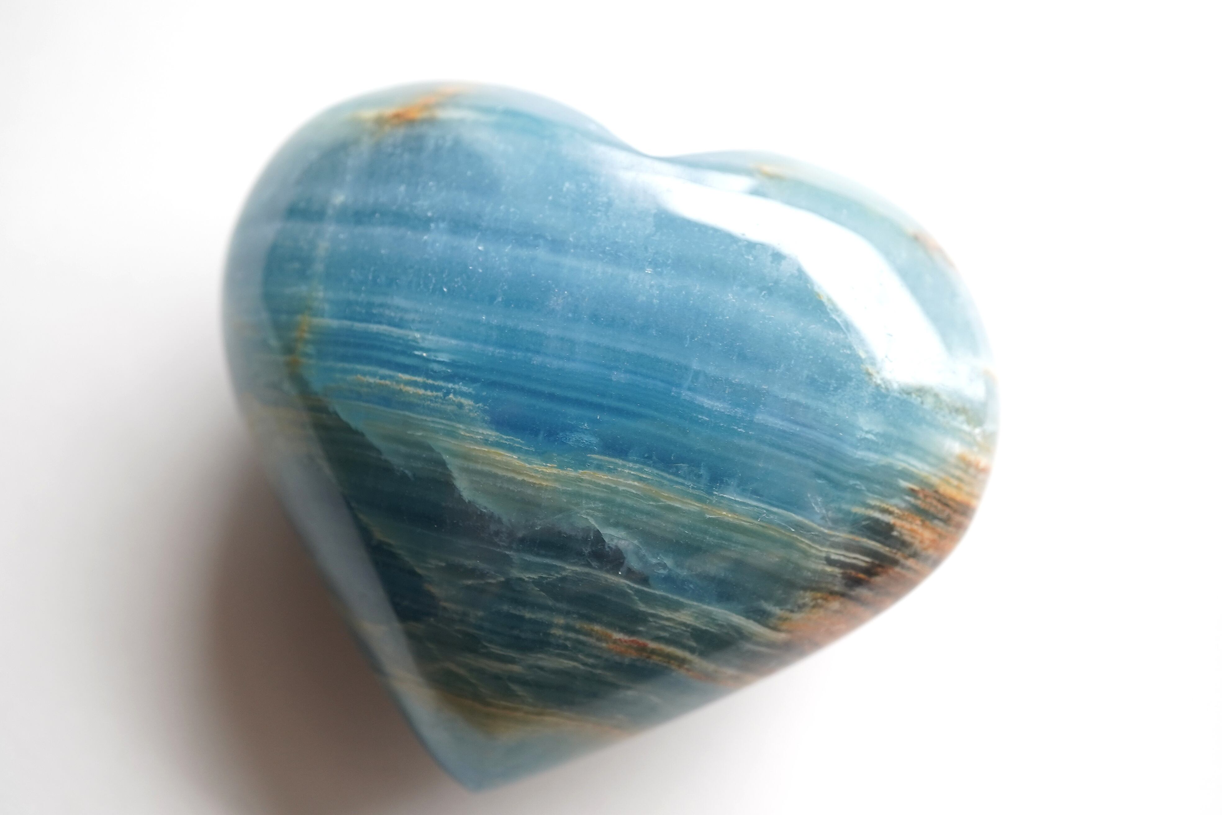 色の濃淡でなんとなく景色に見える時があり、”石の中に景色をみる”と店主が称した石のうちの一つです。石はアルゼンチンのブルーカルサイト。アクアティンカルサイトと言う別名があります。クリスタルワーカーとして知られるロバート・シモンズ氏によりレムリア大陸の水の文明との共鳴からこの名前を付けたとされています。そのほかメノウのような模様があることからブルーオニクス(オニキス)などとも呼ばれていたり。 このブルーは主に生成時に含まれるマンガンや銅などの微量元素によるものです。あなたにはどんな景色が見えたでしょうか。