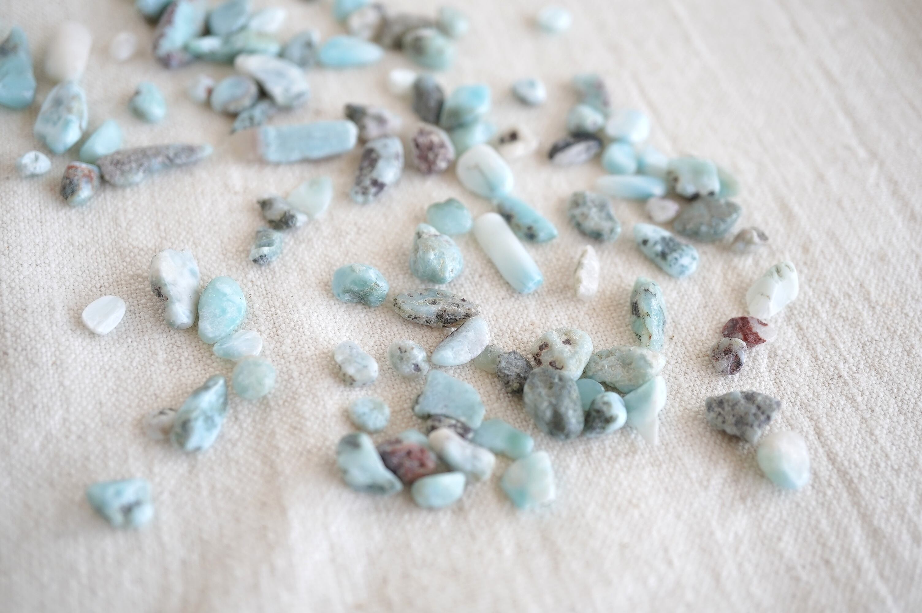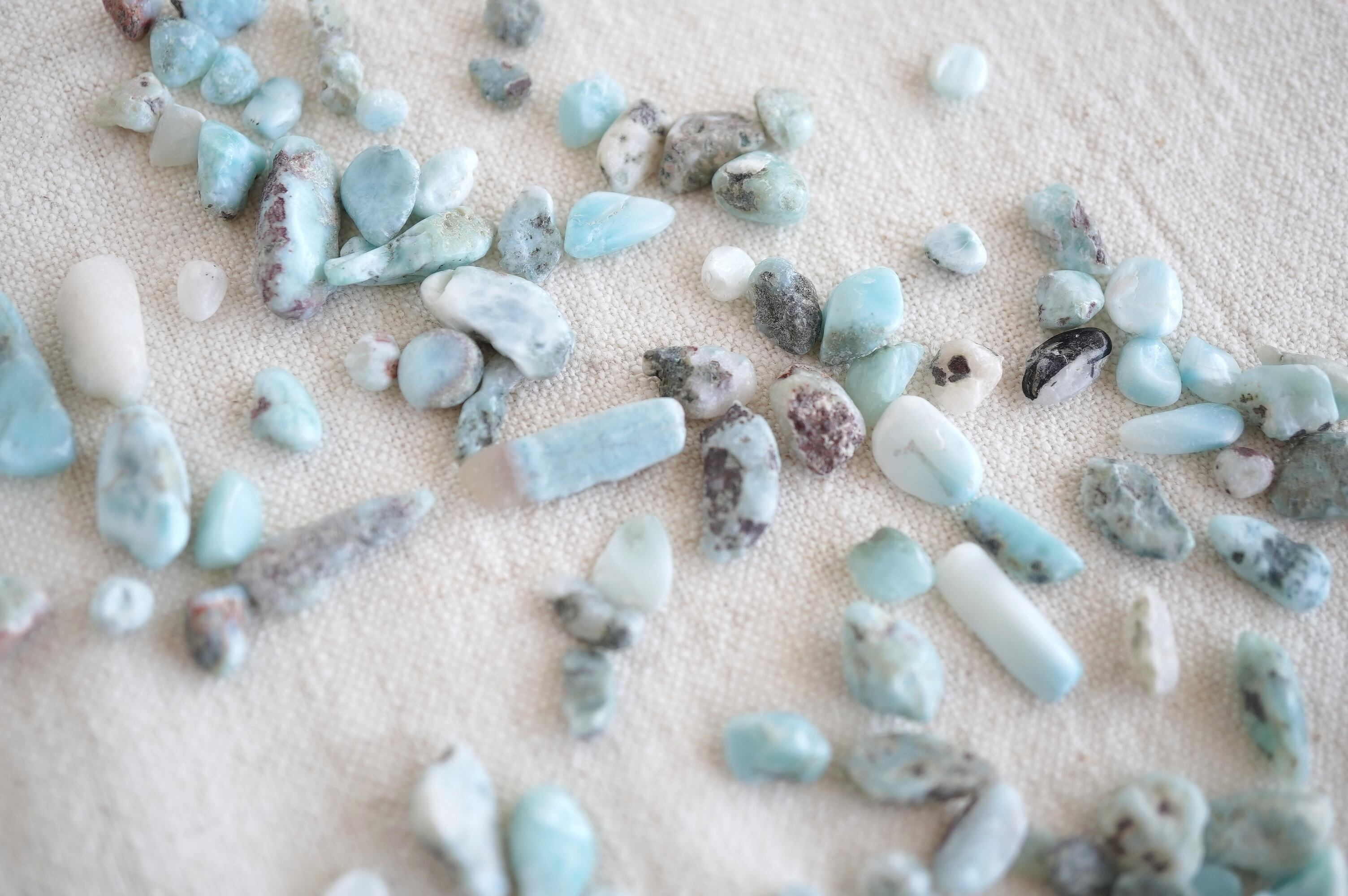端材になってしまったラリマーの破片たち。さざれ石としてデコレーションやインテリアなどにお使いいただけます。不純物も含みます。形は不揃いでランダムな形です。