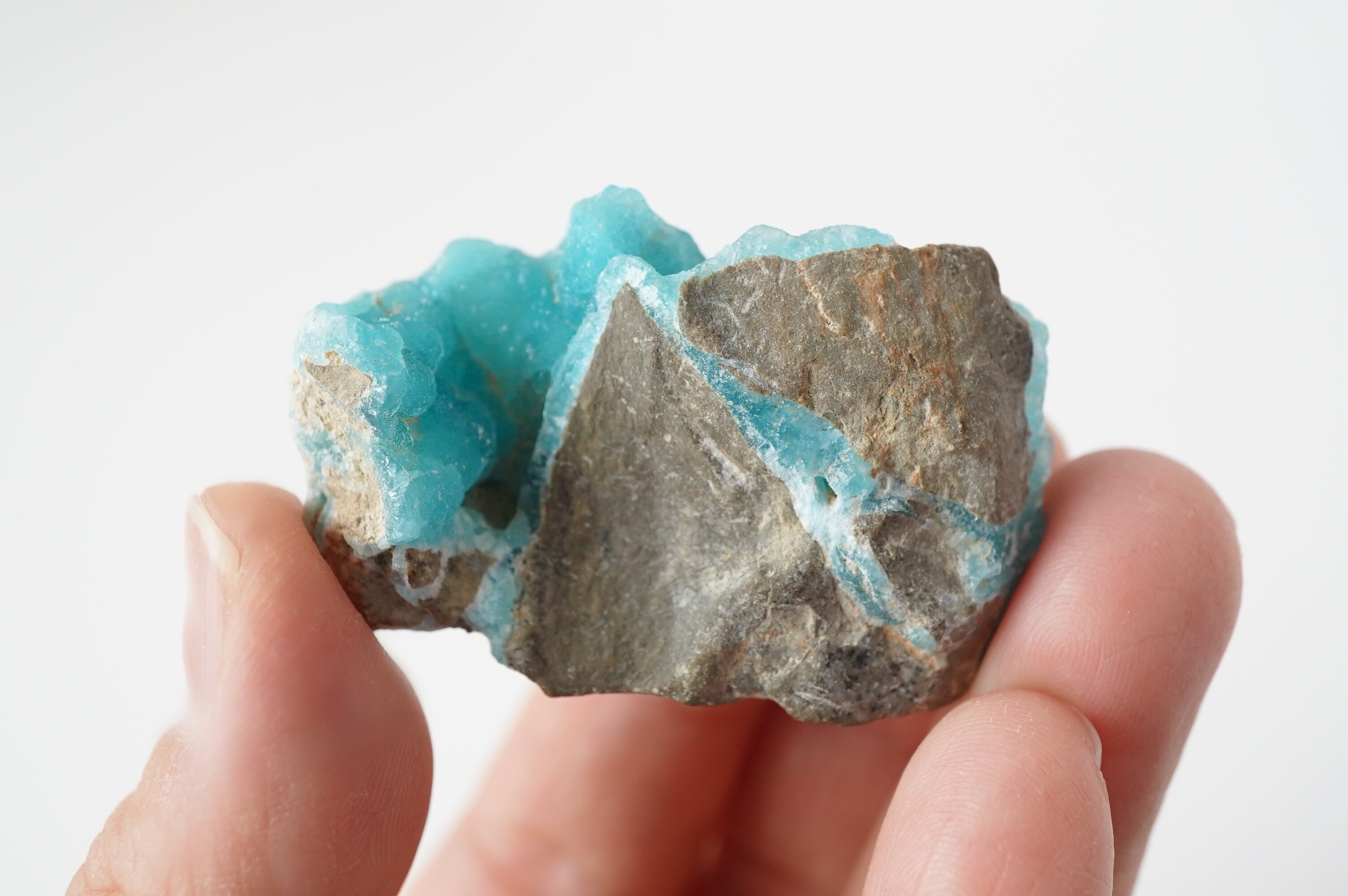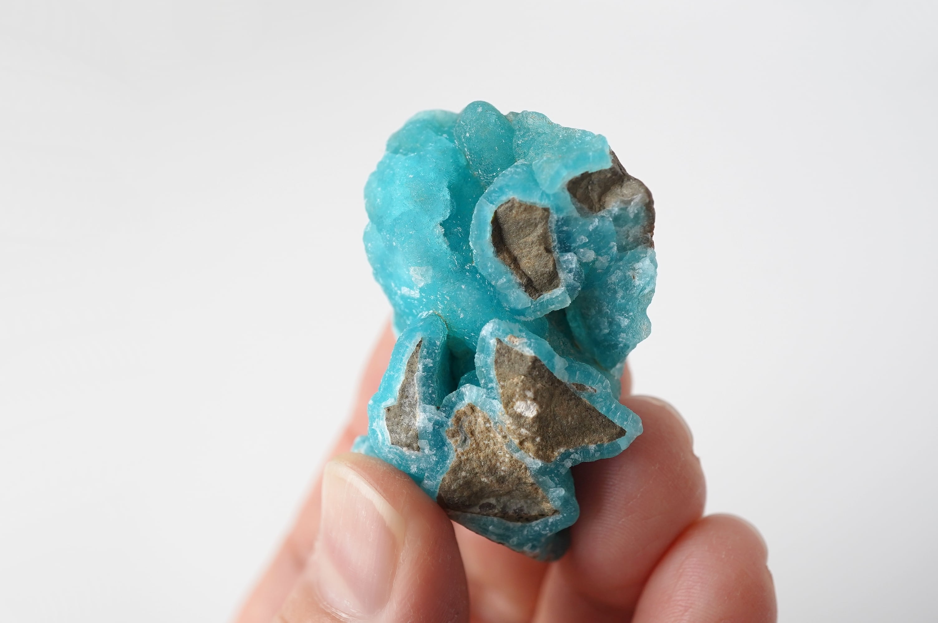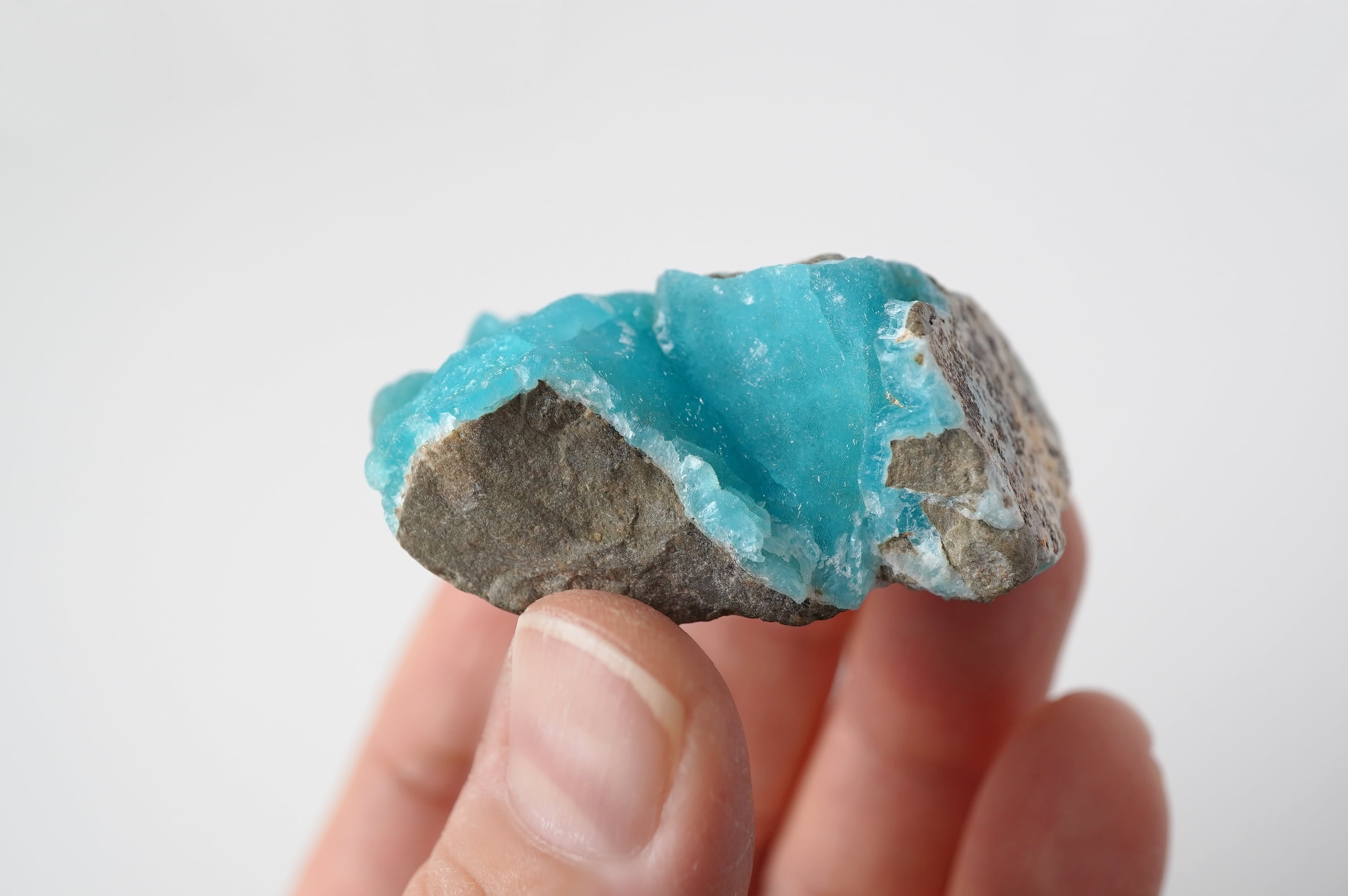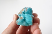 嘘みたいに綺麗なブルーのヘミモルファイトです。母岩の茶色とのコントラストも店主は好きです。写真ではわかりずらいですが、結晶の表面がキラキラとするのがとってもかわいいです。動画でも伝わると良いのですが・・・。