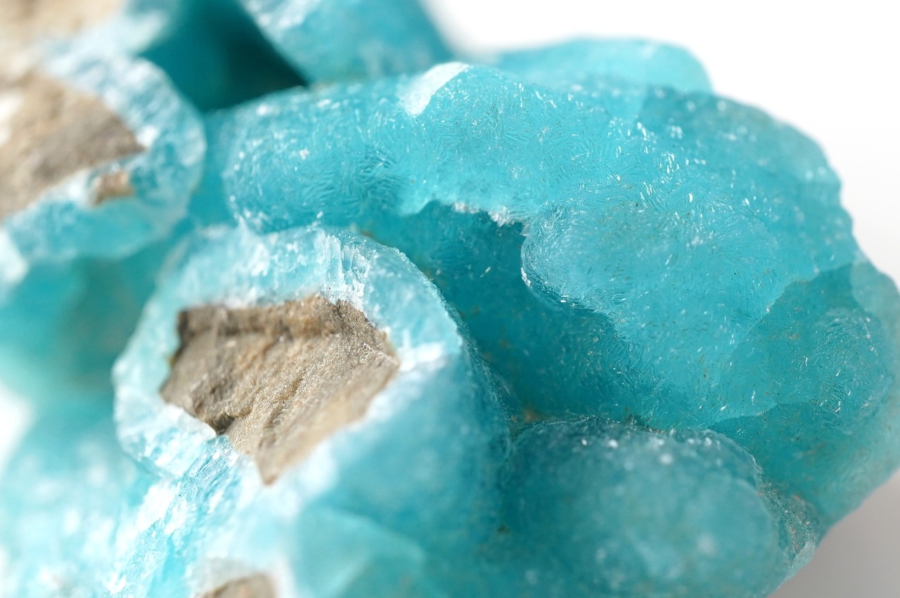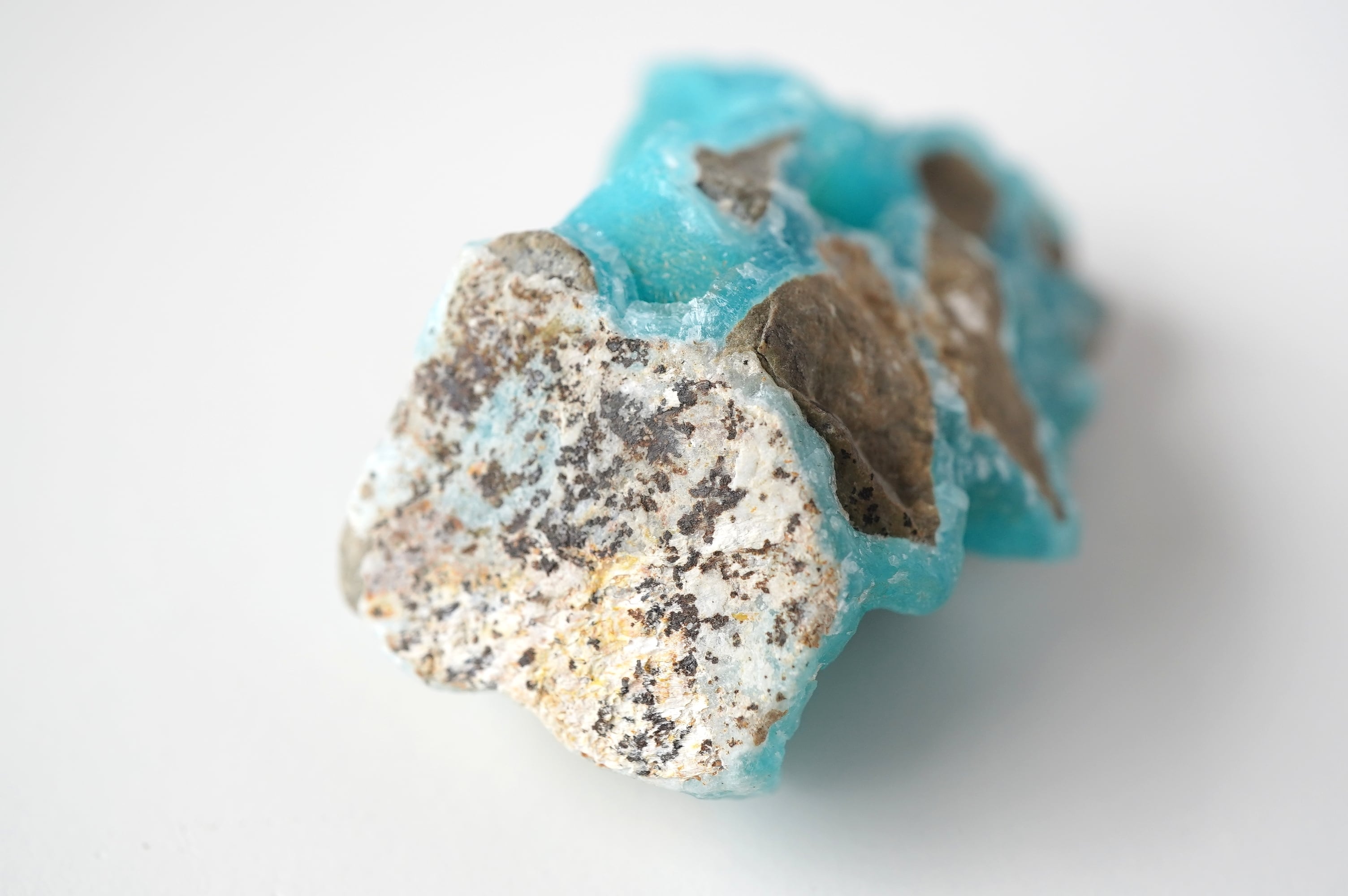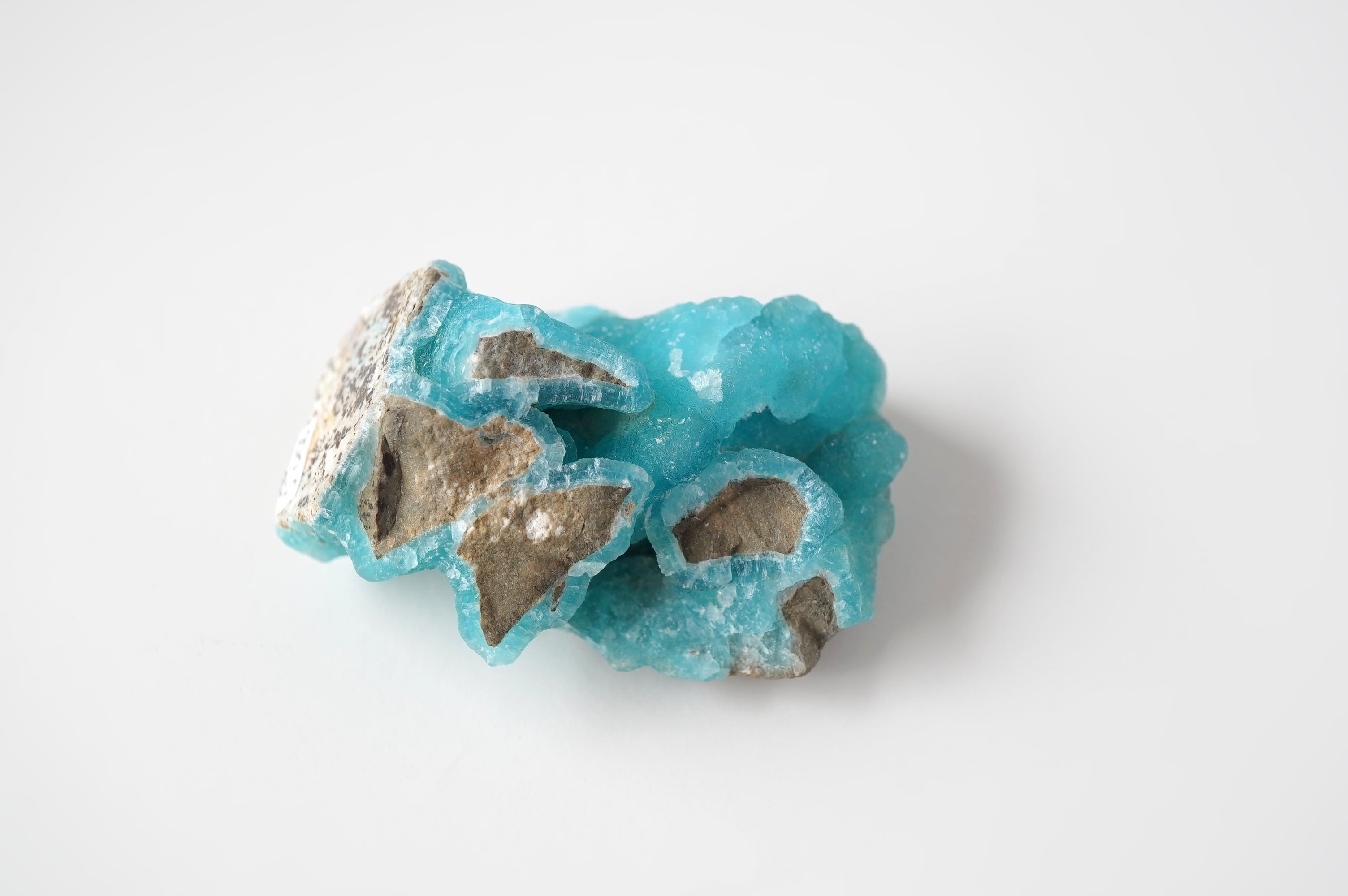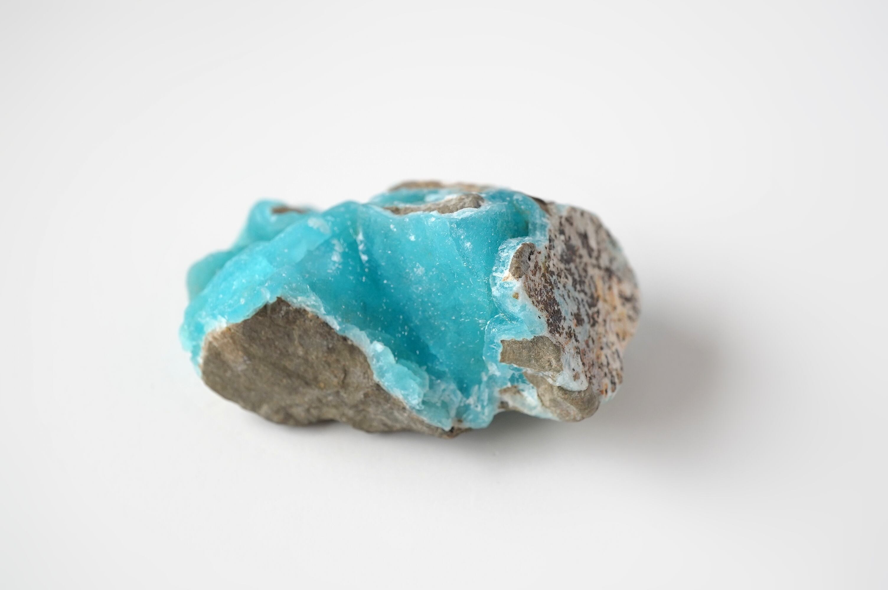 嘘みたいに綺麗なブルーのヘミモルファイトです。母岩の茶色とのコントラストも店主は好きです。写真ではわかりずらいですが、結晶の表面がキラキラとするのがとってもかわいいです。動画でも伝わると良いのですが・・・。