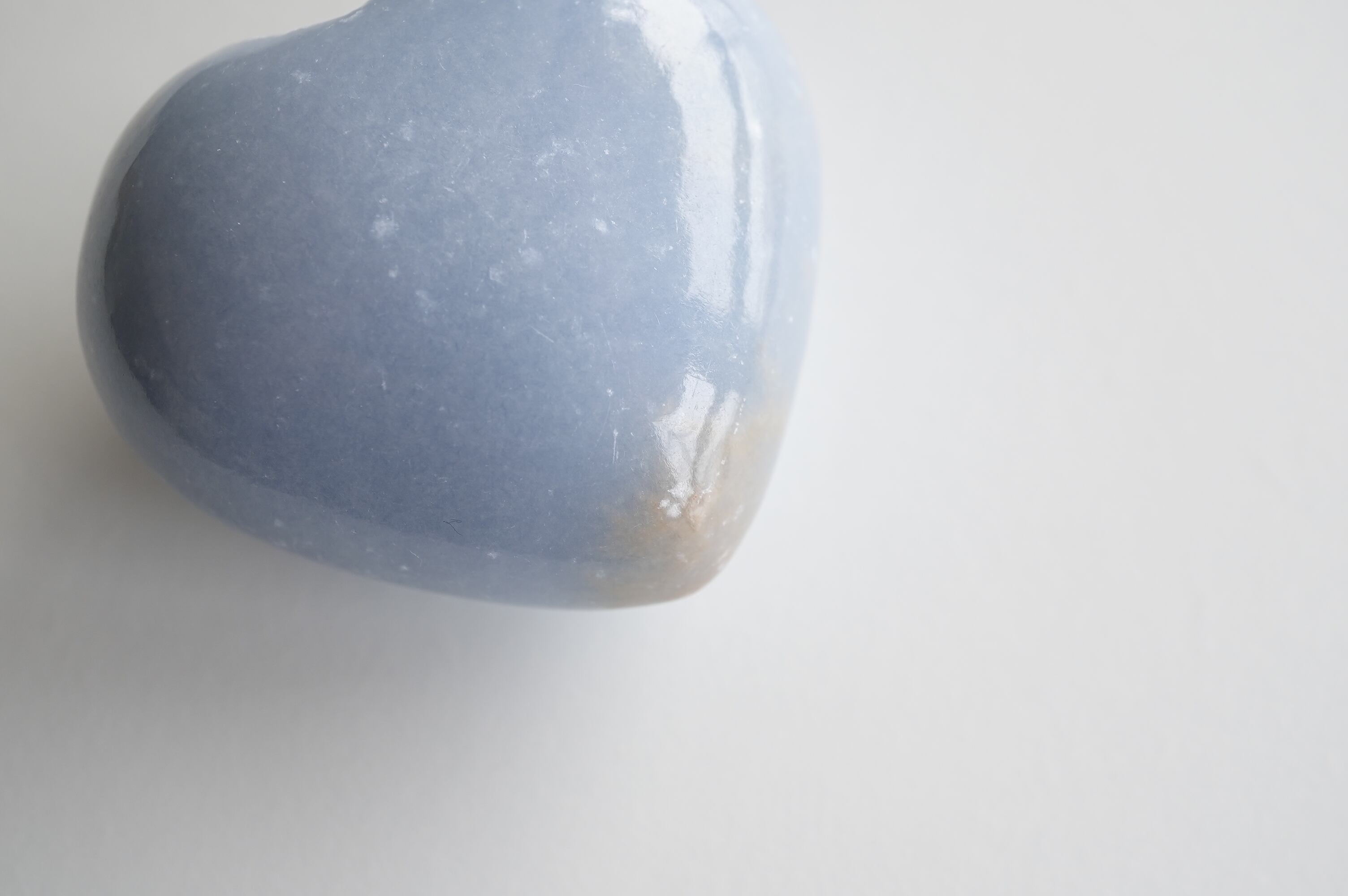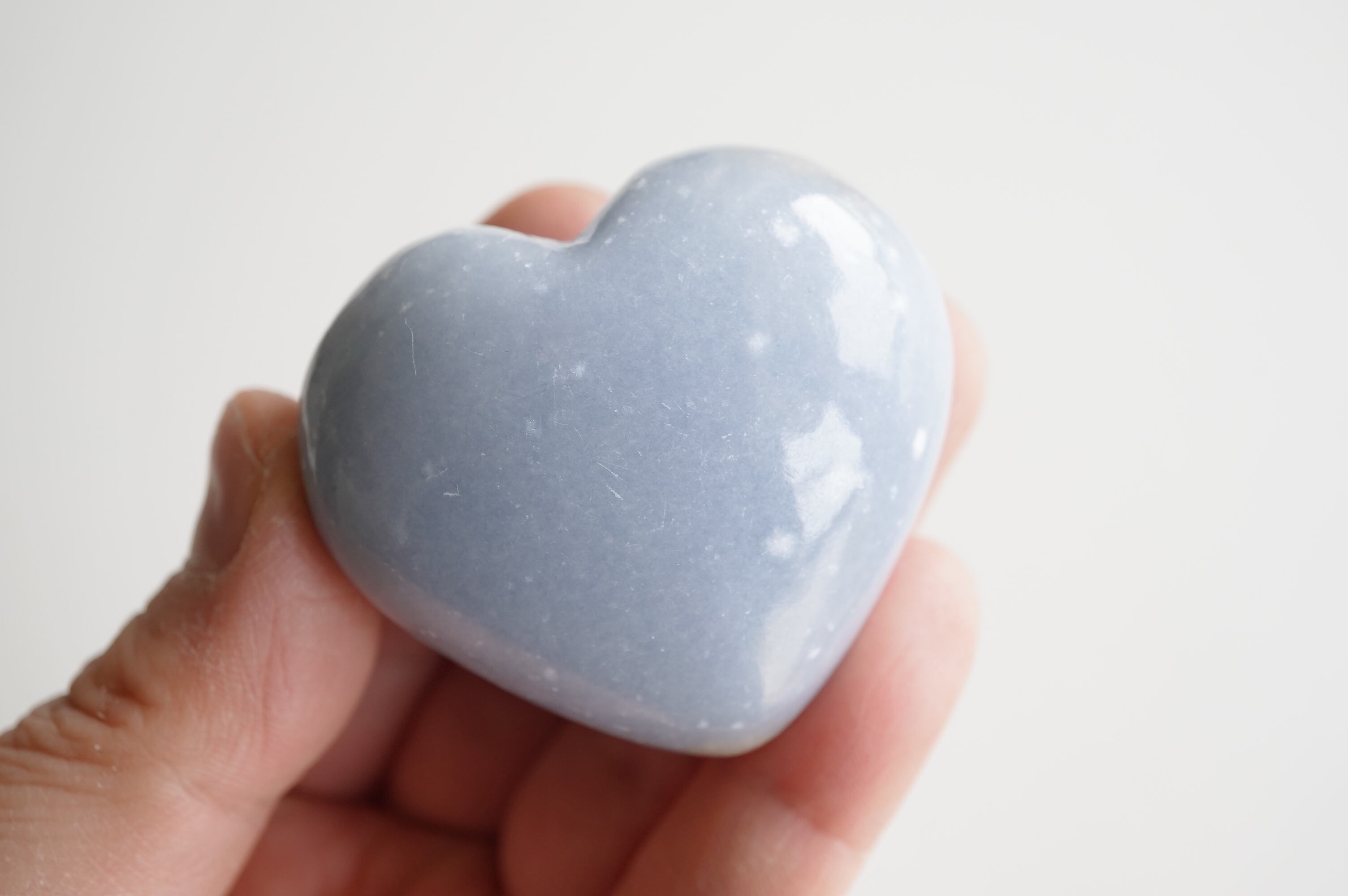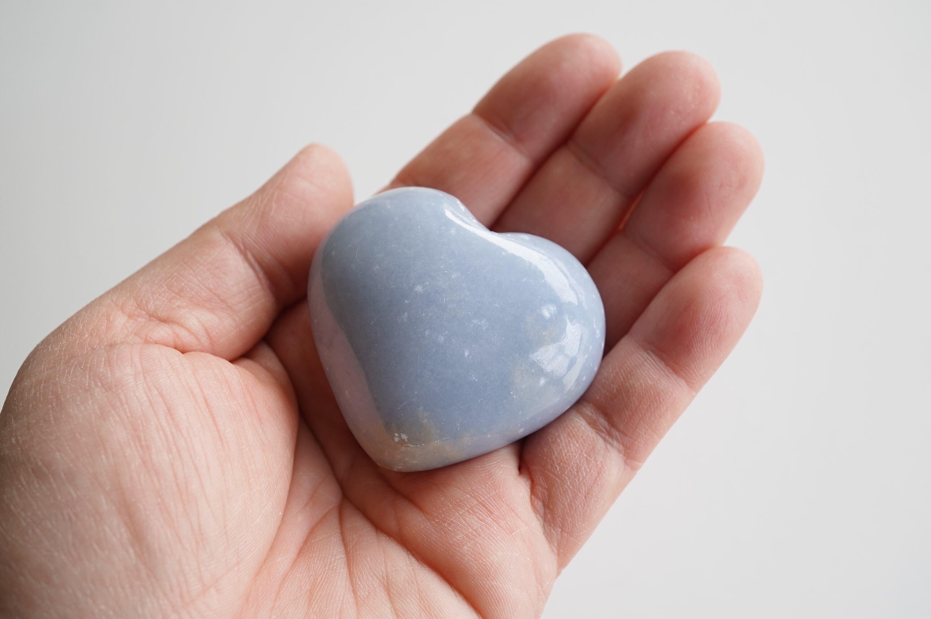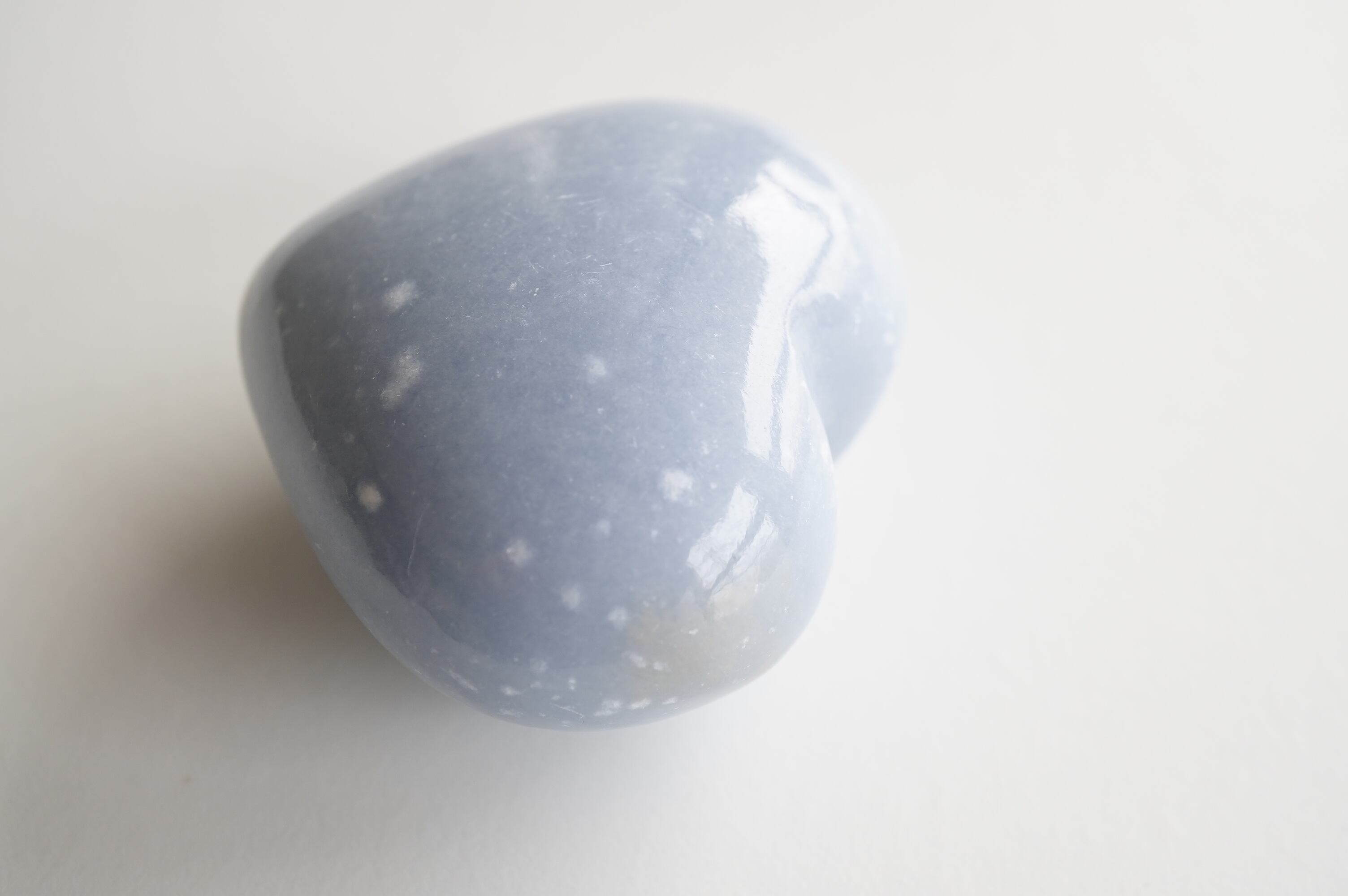 エンジェライトはアンハイドライトと呼ばれる鉱物の仲間でペルーが主な産出国です。結晶を持つことは稀で、多くの場合は塊状や板状などの形状でみつかります。セレスタイトの美しいブルーと同じストロンチウムという成分が含まれています。優しいミルキーなブルーが癒しの色ですね。