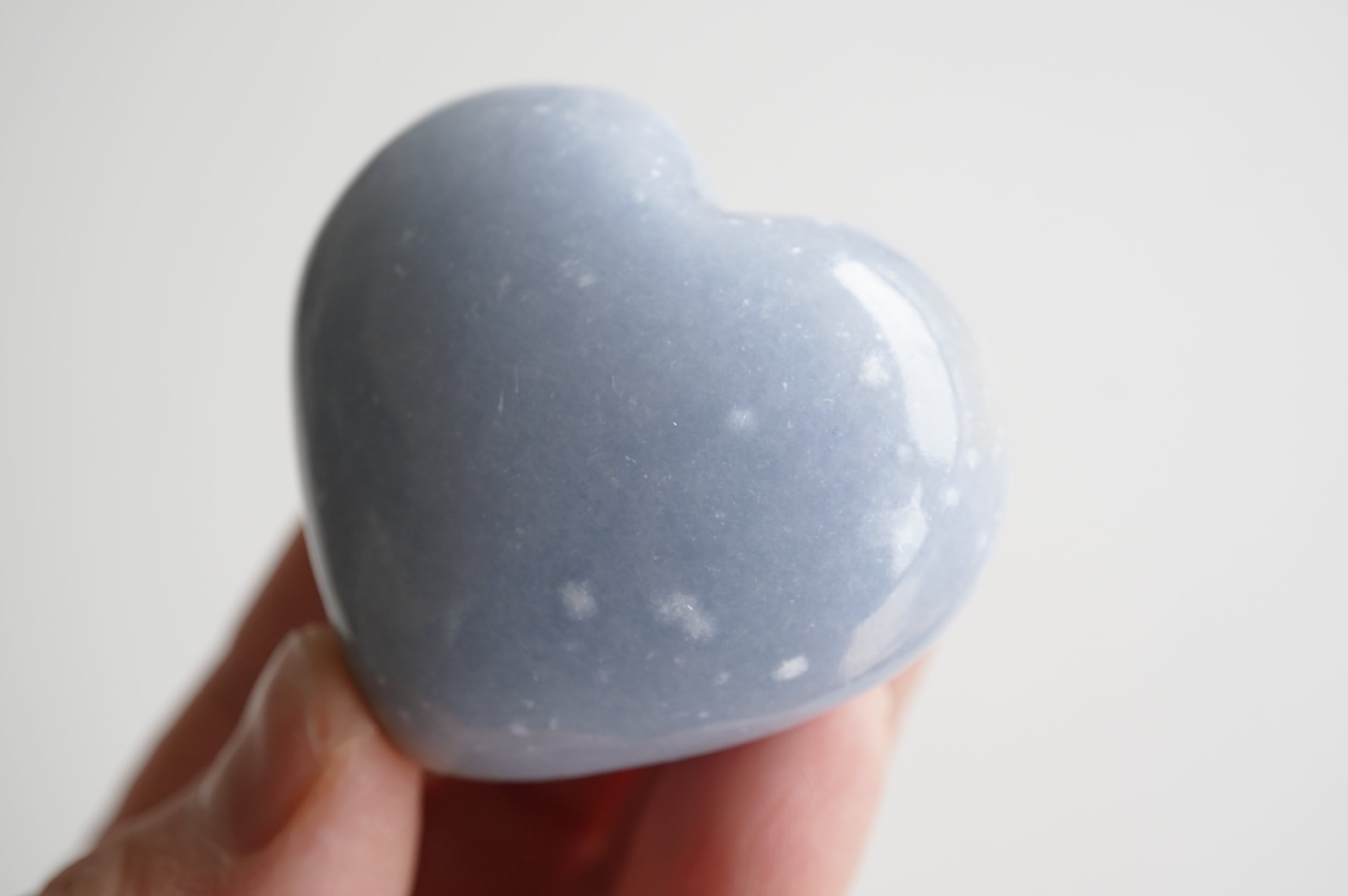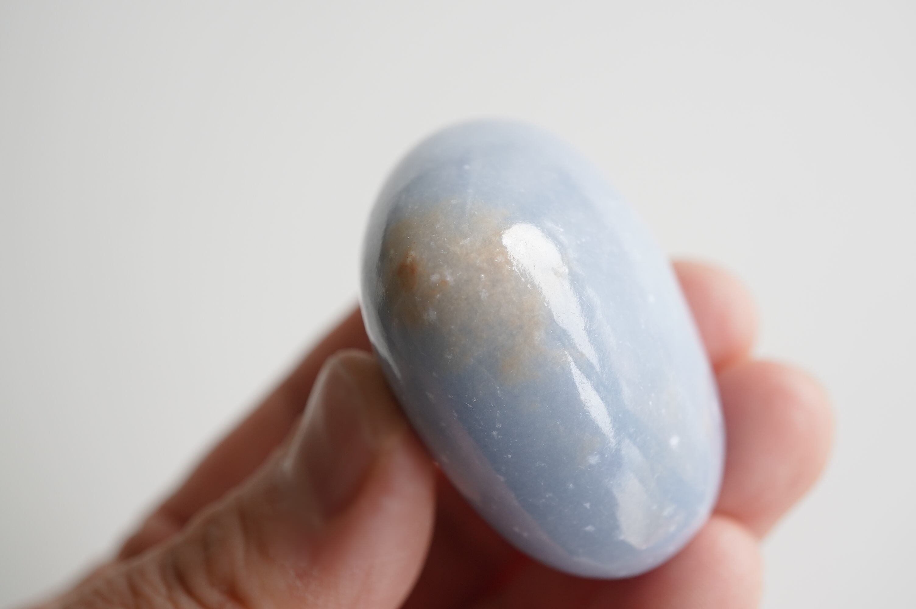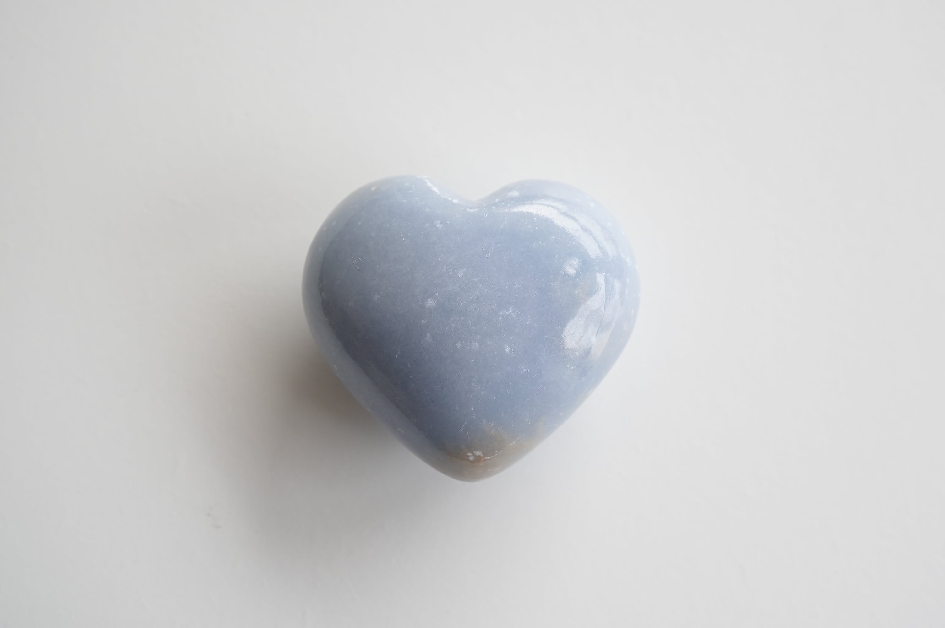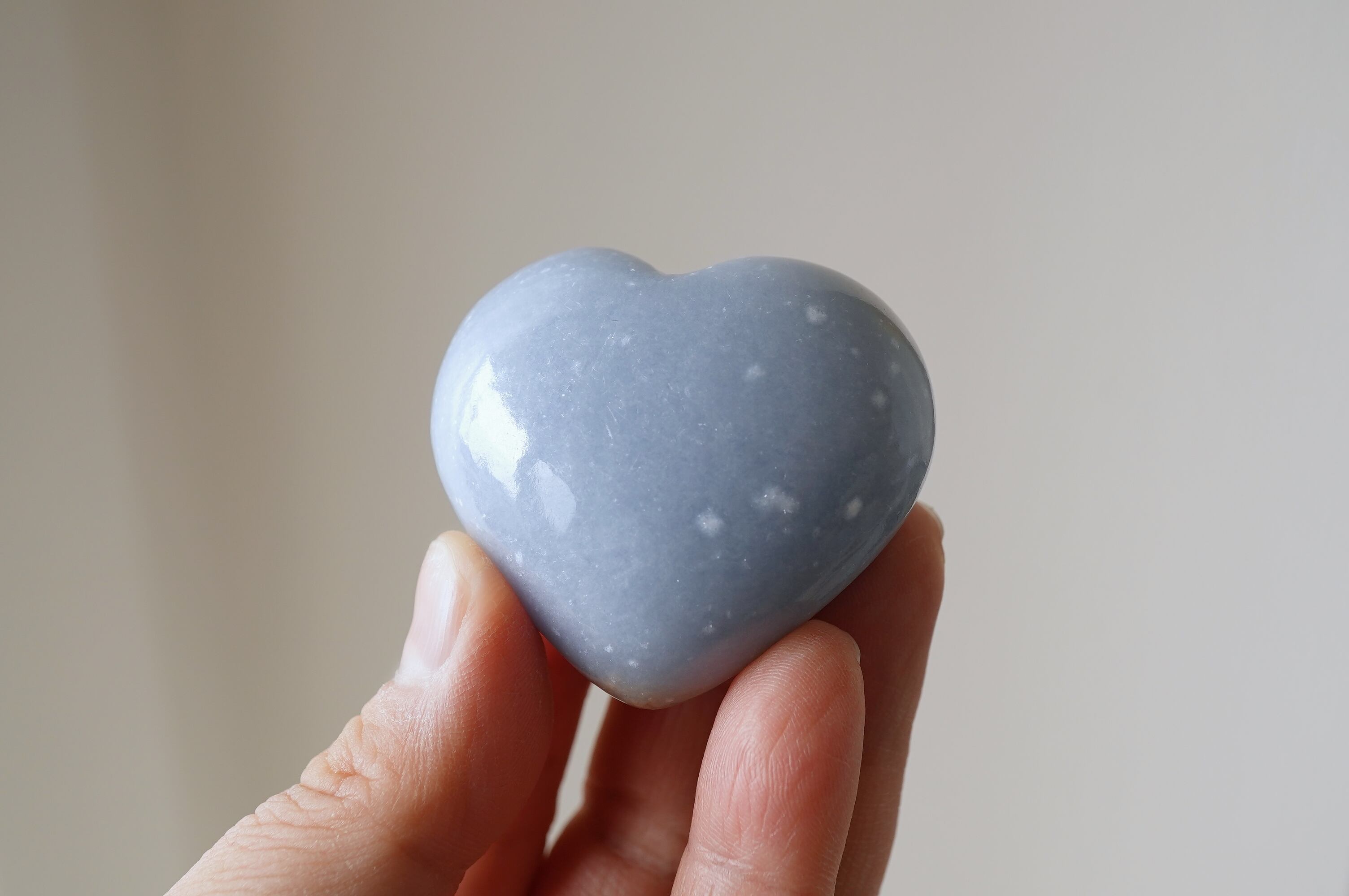 エンジェライトはアンハイドライトと呼ばれる鉱物の仲間でペルーが主な産出国です。結晶を持つことは稀で、多くの場合は塊状や板状などの形状でみつかります。セレスタイトの美しいブルーと同じストロンチウムという成分が含まれています。優しいミルキーなブルーが癒しの色ですね。
