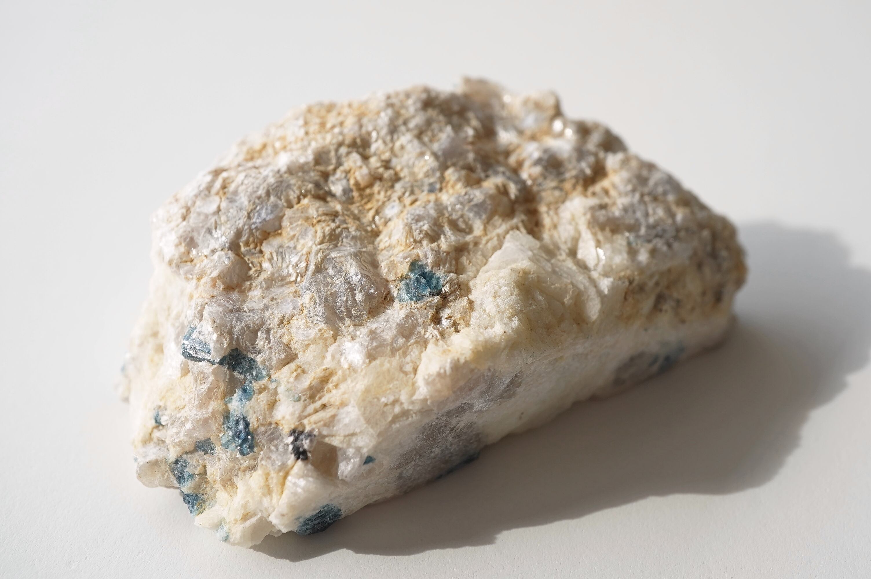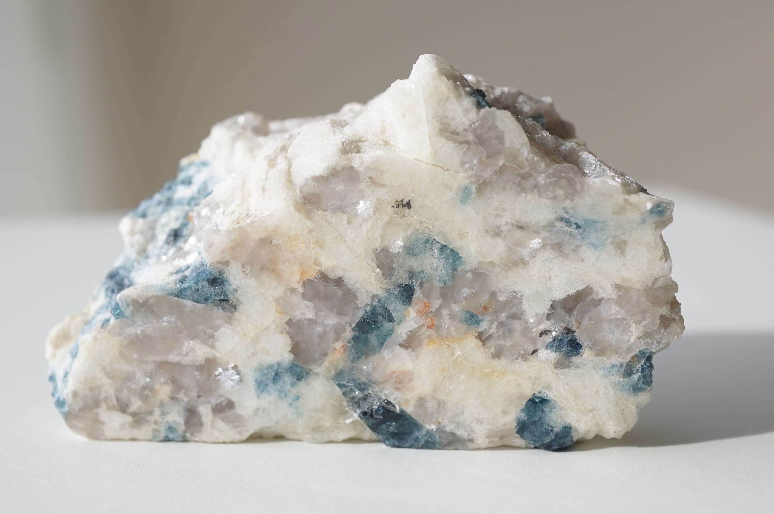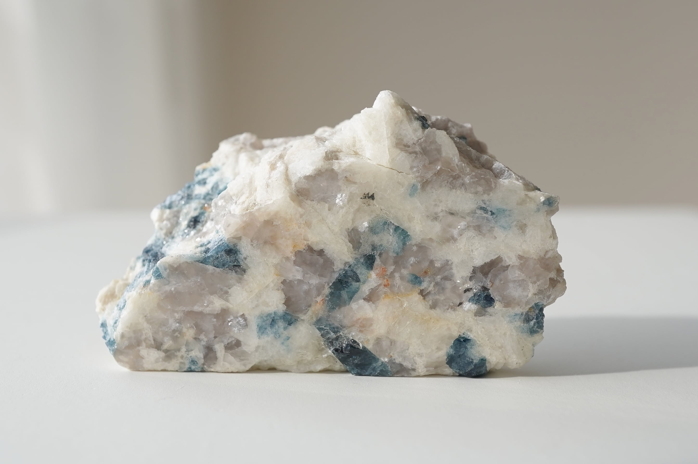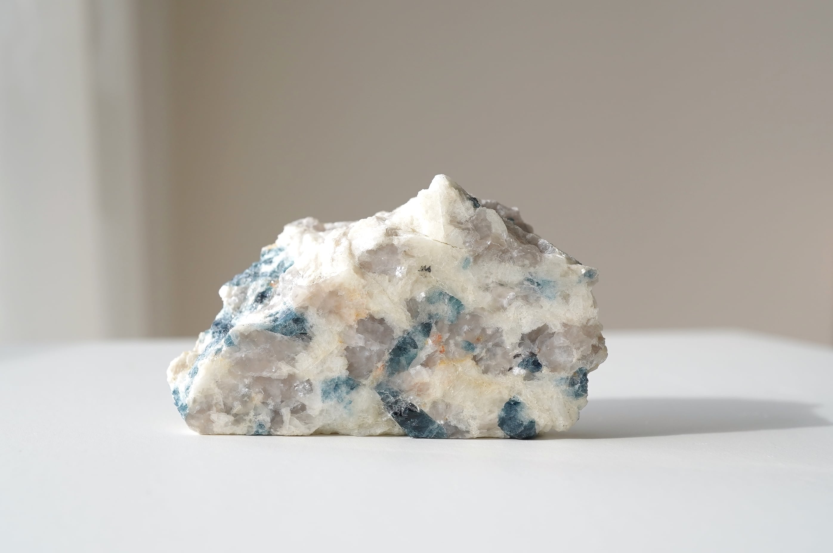 ユーフォラライトはアメリカのサウスダコタ州ブラックヒルズで発見されたリチウムを多く含む鉱物の商標名です。石の年代は28億年と推測されています。雲母、レピドライト、トルマリン、クォーツと一緒に産出されることが多いことで知られています。この個体にはブルーのトルマリン(インディコライト)がたくさん共生しています。スモーキークォーツもところどころに、そしてキラリと雲母が見られます。自立します。