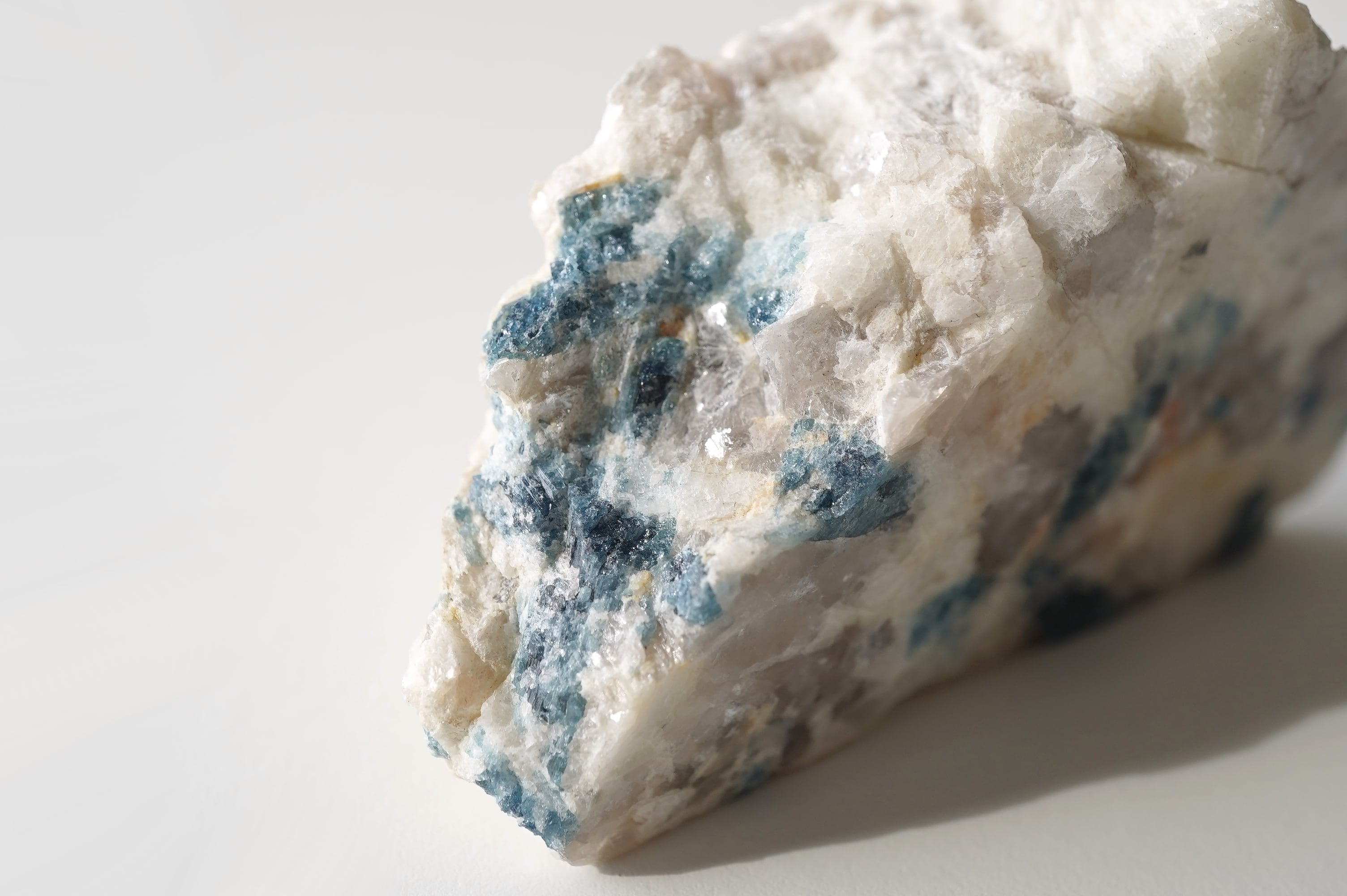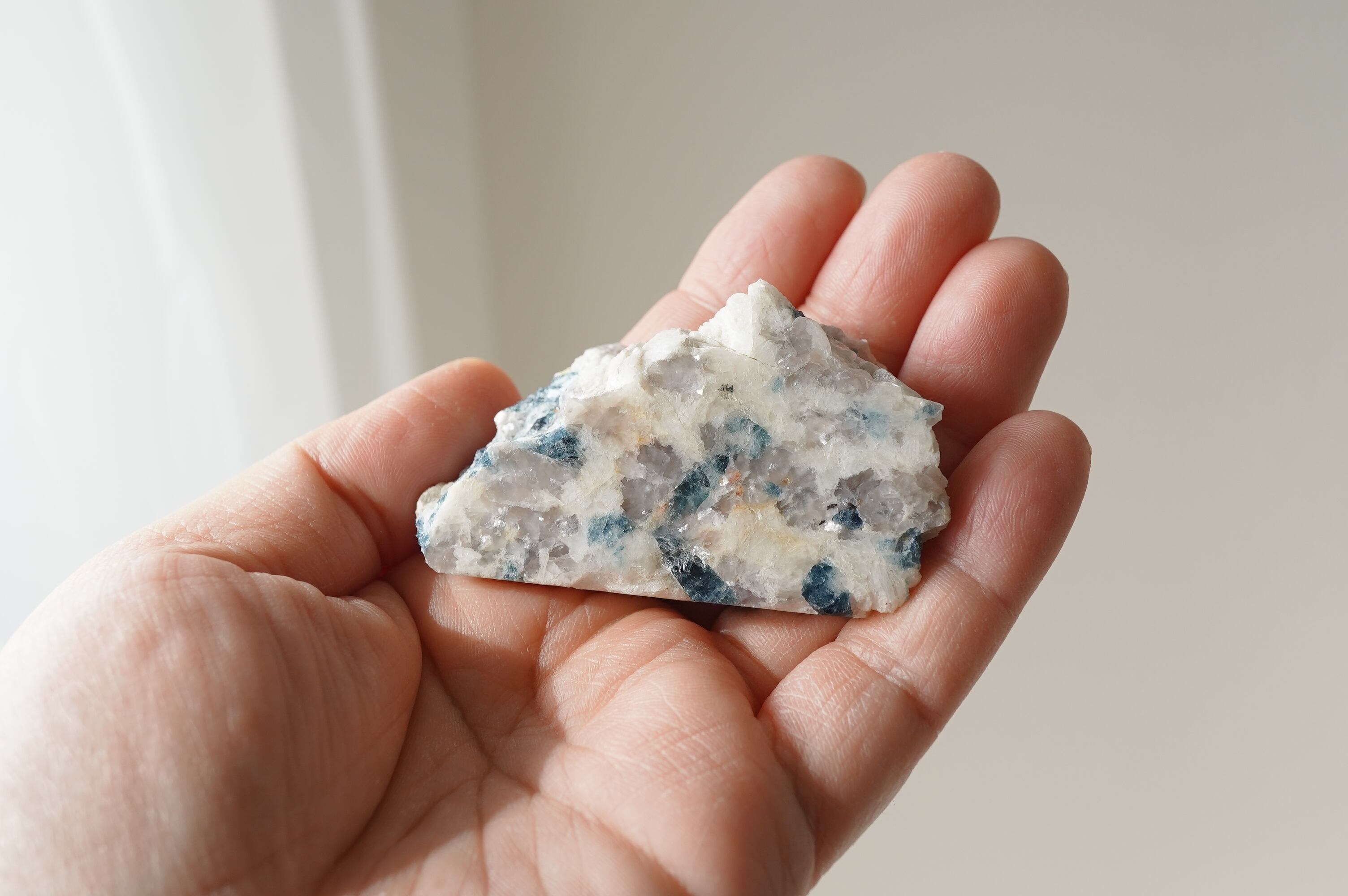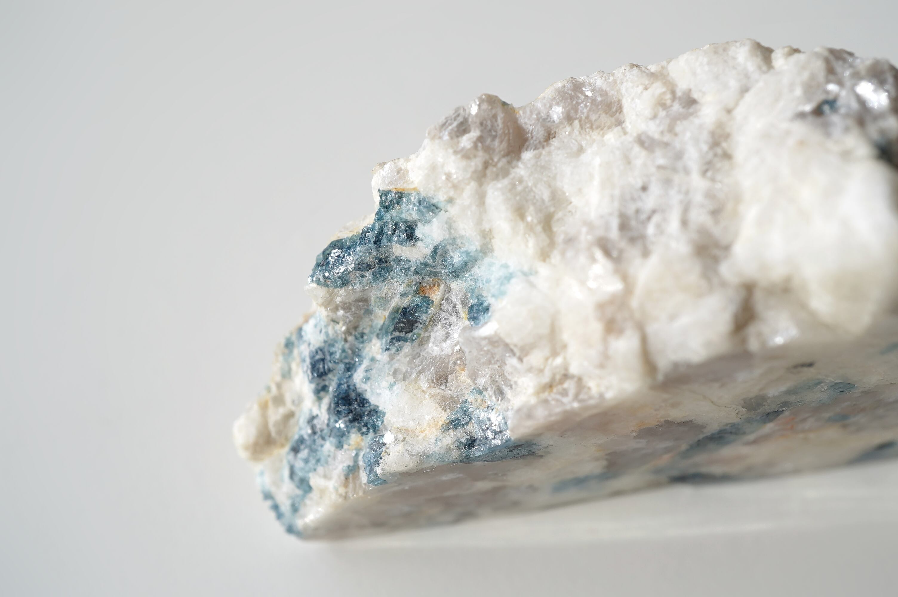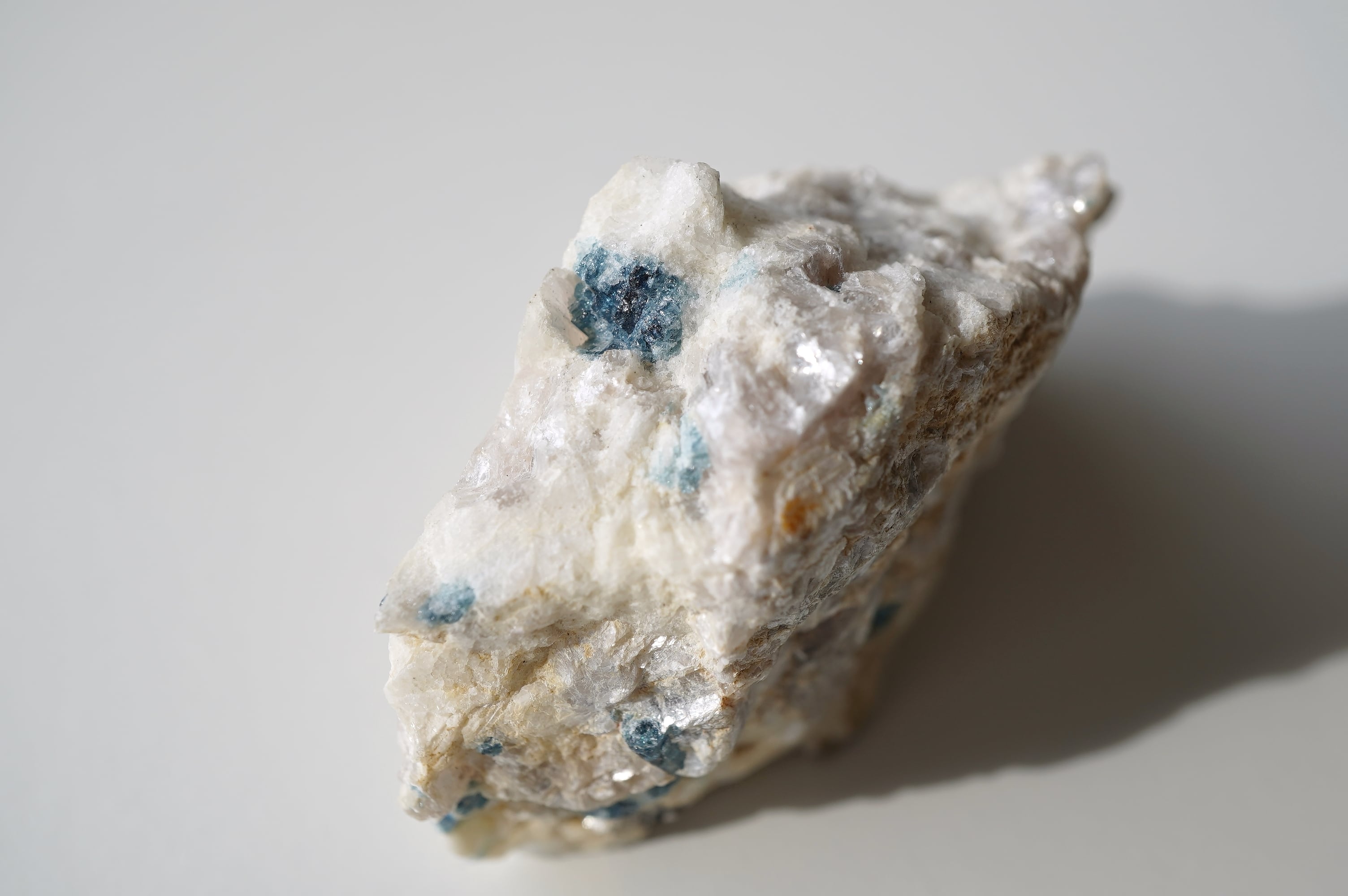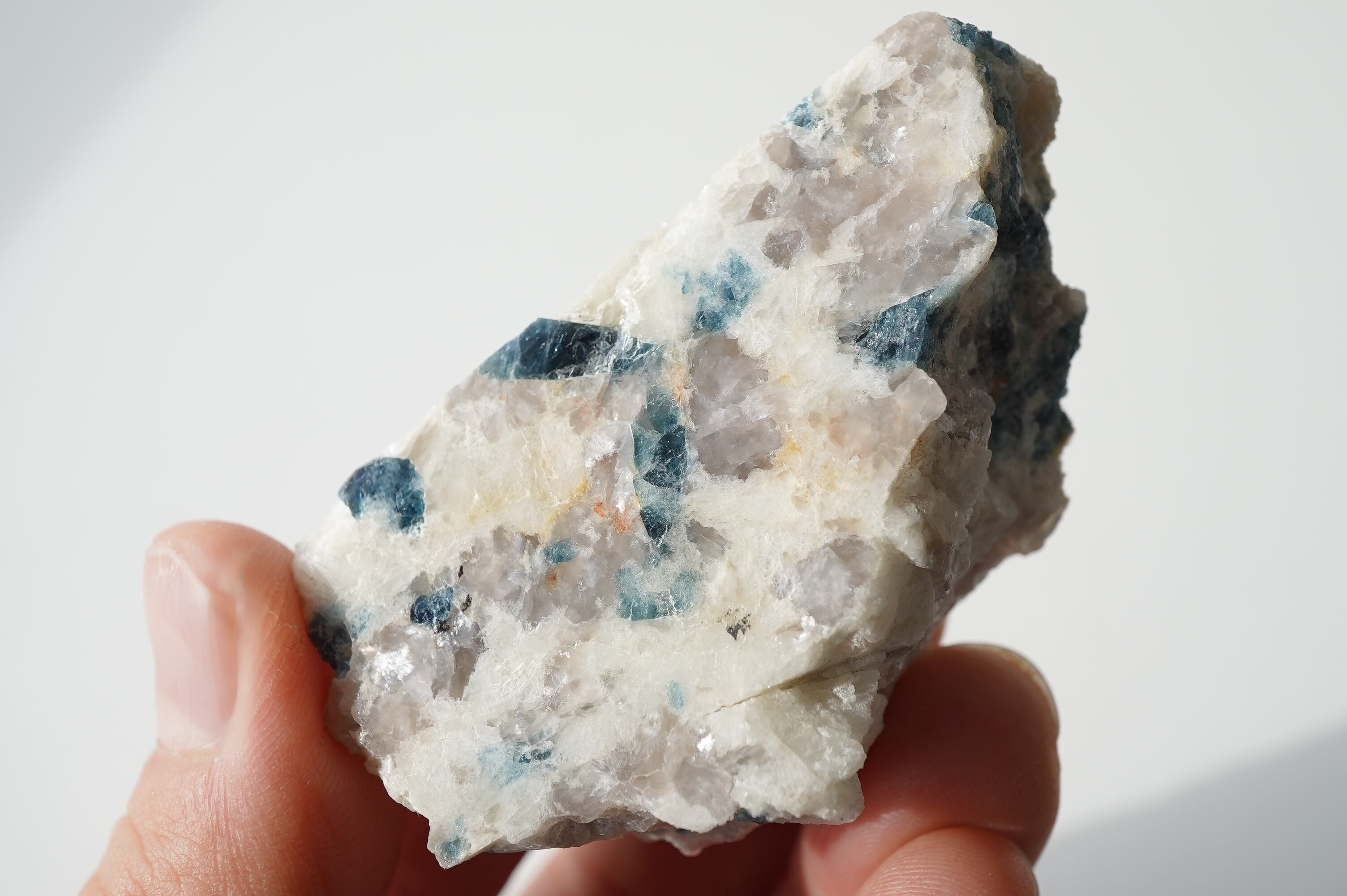 ユーフォラライトはアメリカのサウスダコタ州ブラックヒルズで発見されたリチウムを多く含む鉱物の商標名です。石の年代は28億年と推測されています。雲母、レピドライト、トルマリン、クォーツと一緒に産出されることが多いことで知られています。この個体にはブルーのトルマリン(インディコライト)がたくさん共生しています。スモーキークォーツもところどころに、そしてキラリと雲母が見られます。自立します。