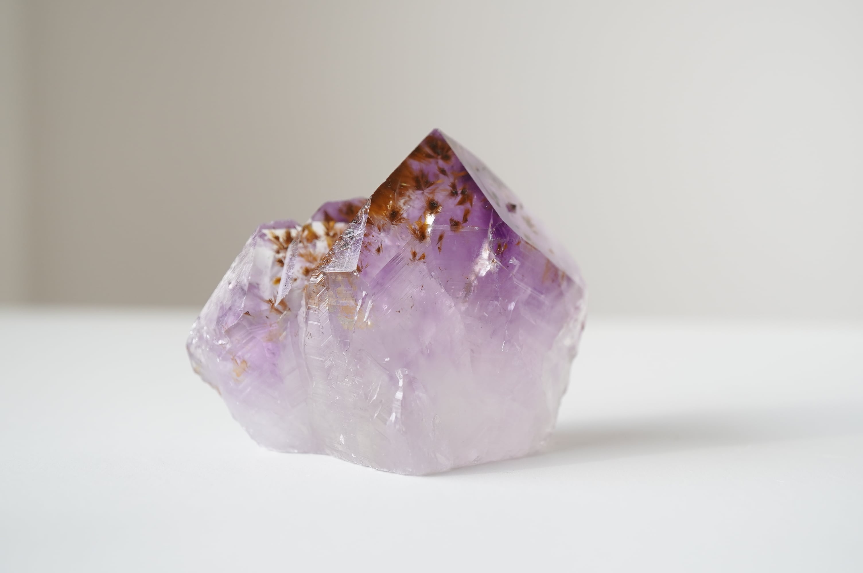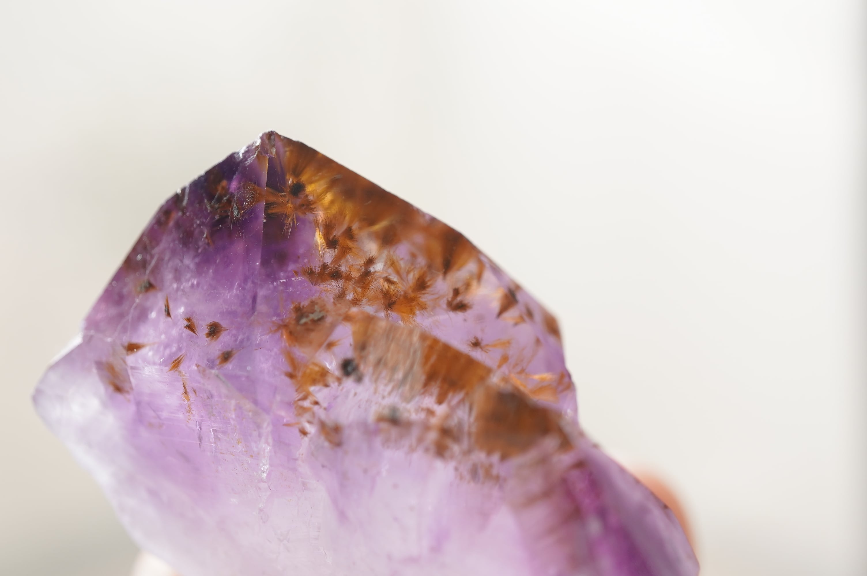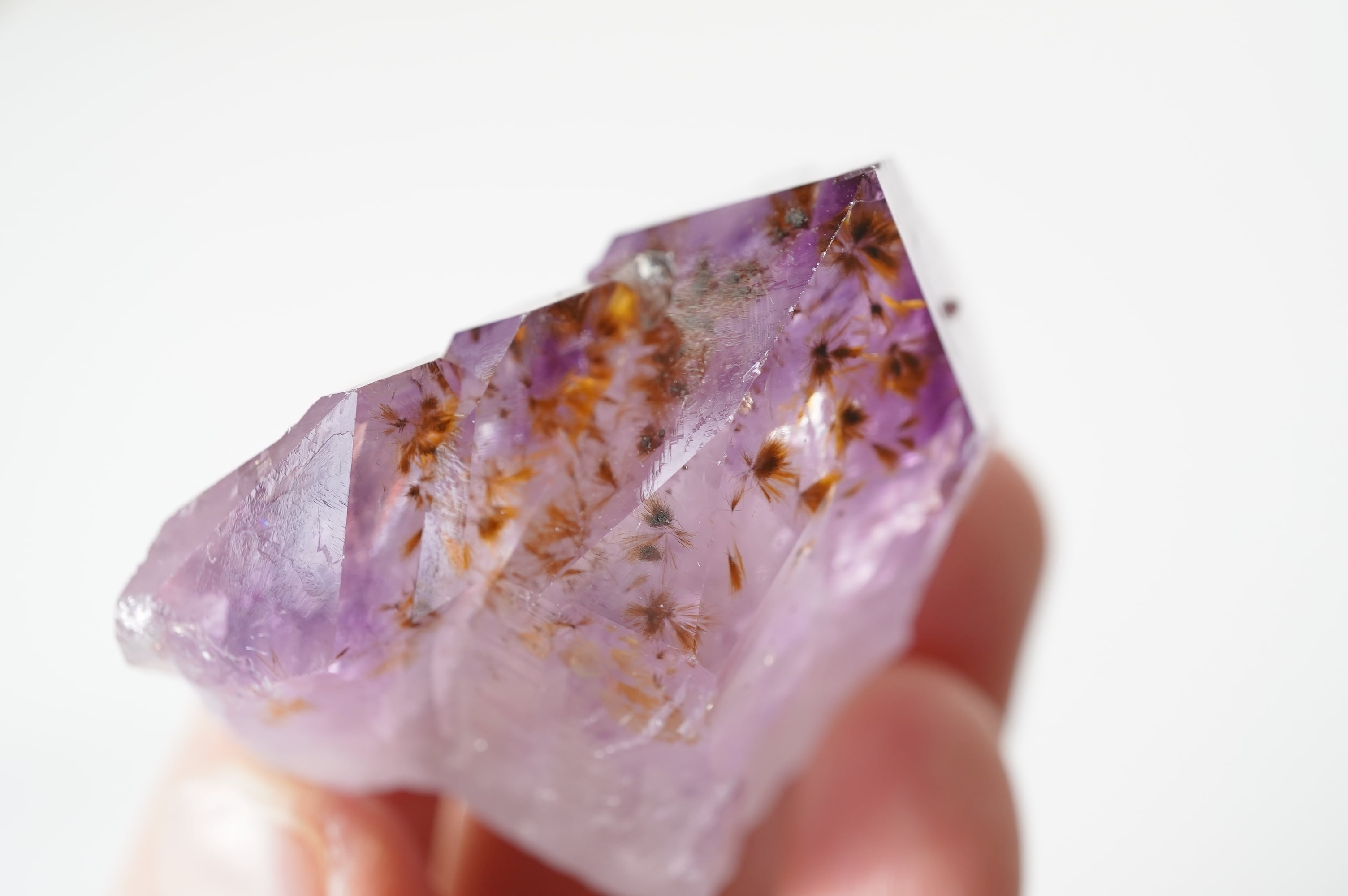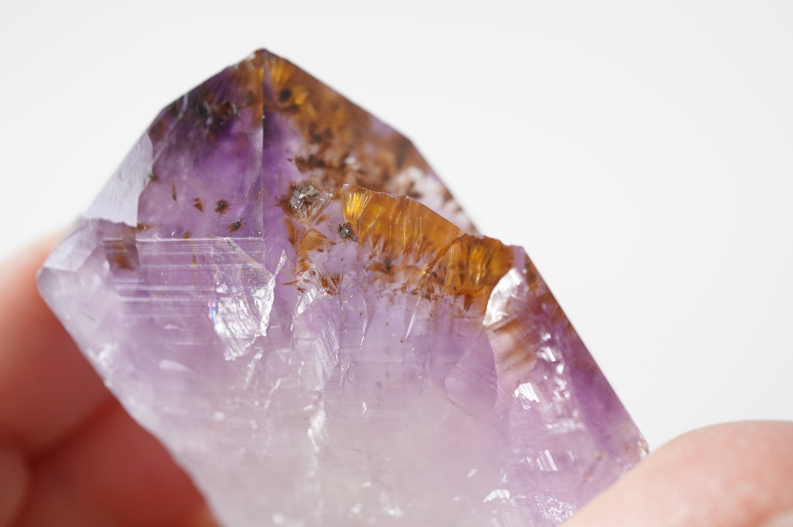 金色に輝くウニ。。。じゃなくてゲーサイトがアメジストに内包されています。全体は原石のままで、底はカットされているため自立します。表面の光沢があり、アメジストのクォリティーも素晴らしいです。