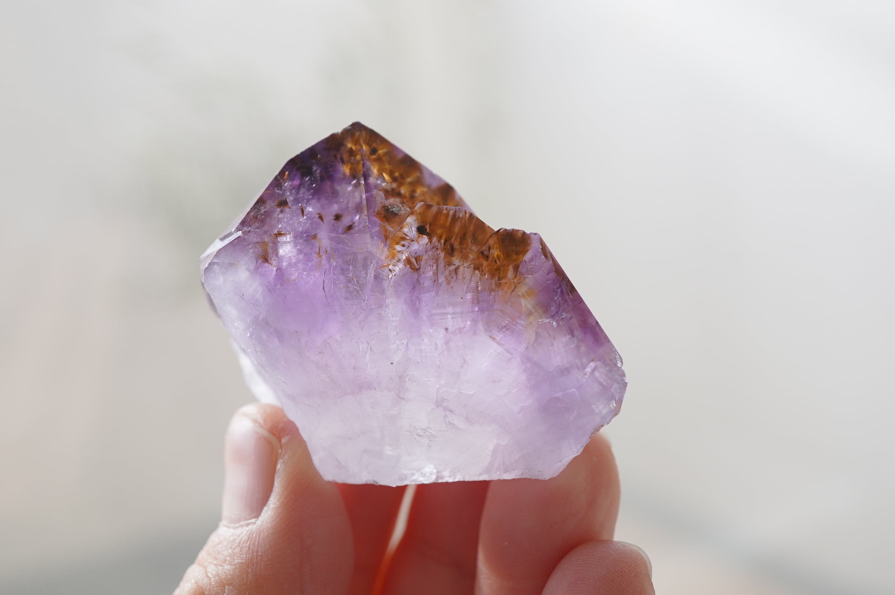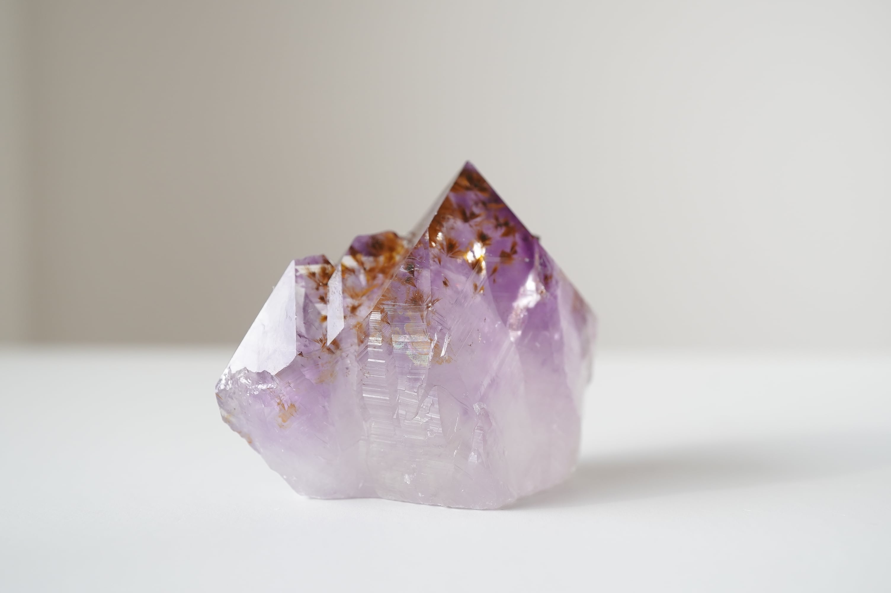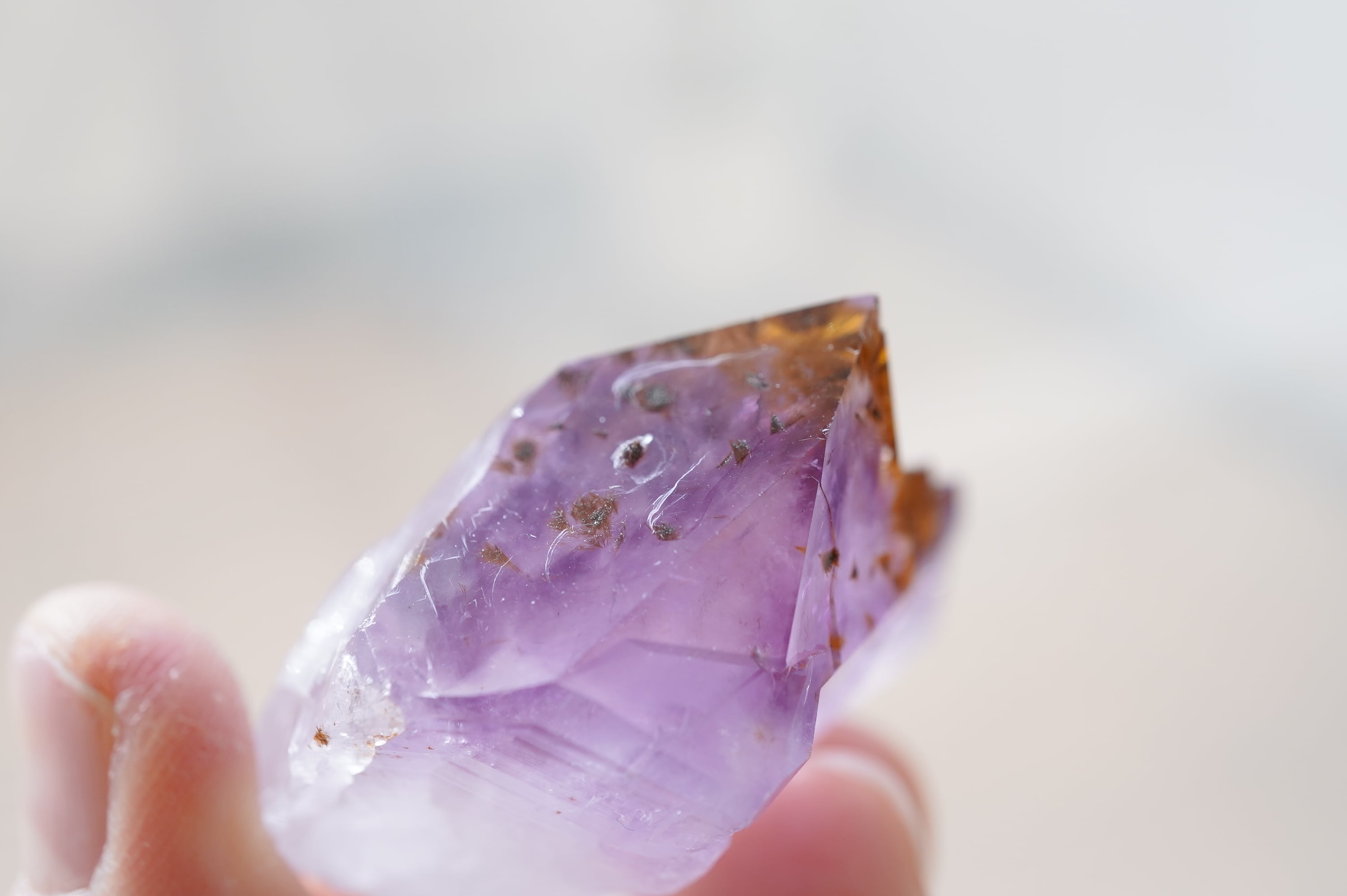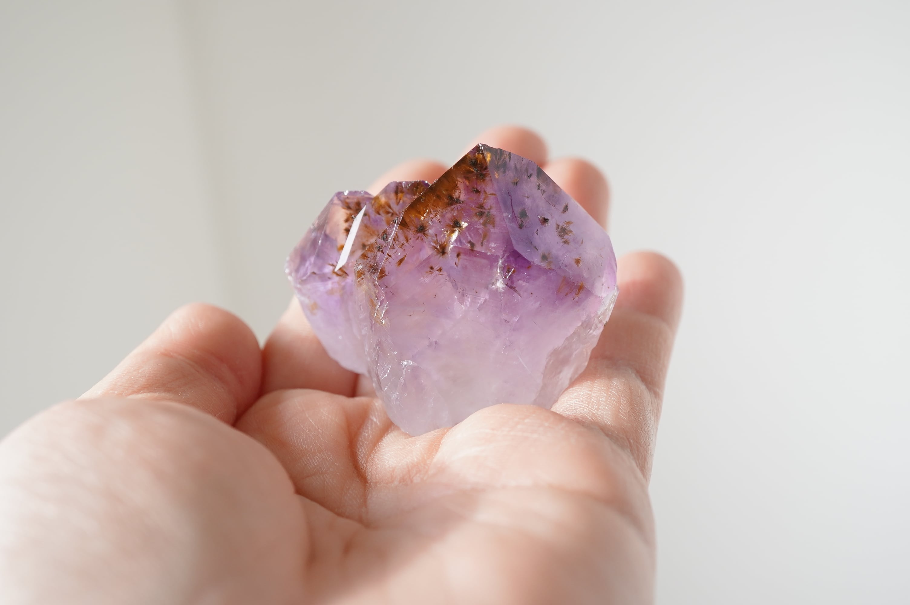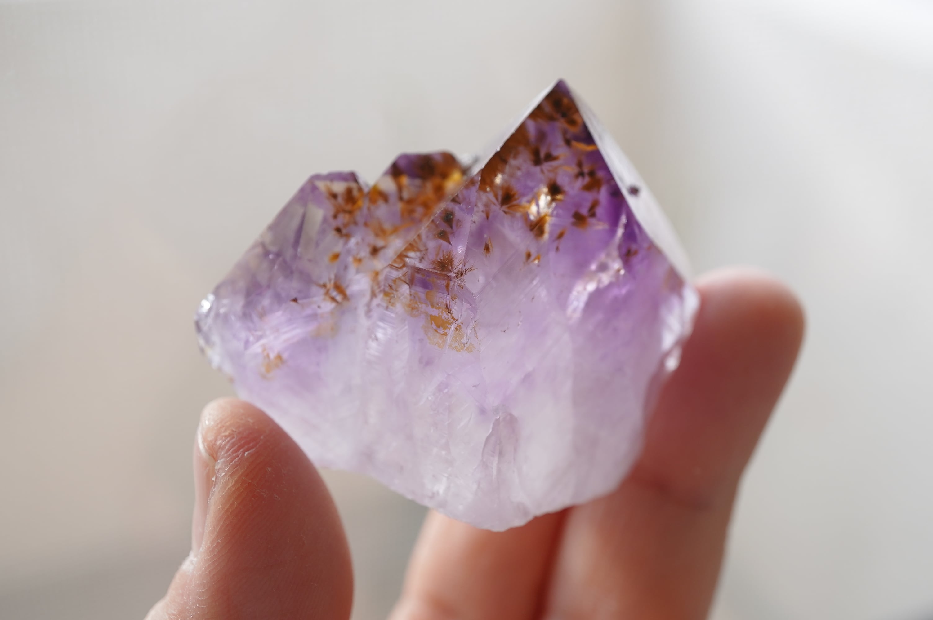 金色に輝くウニ。。。じゃなくてゲーサイトがアメジストに内包されています。全体は原石のままで、底はカットされているため自立します。表面の光沢があり、アメジストのクォリティーも素晴らしいです。