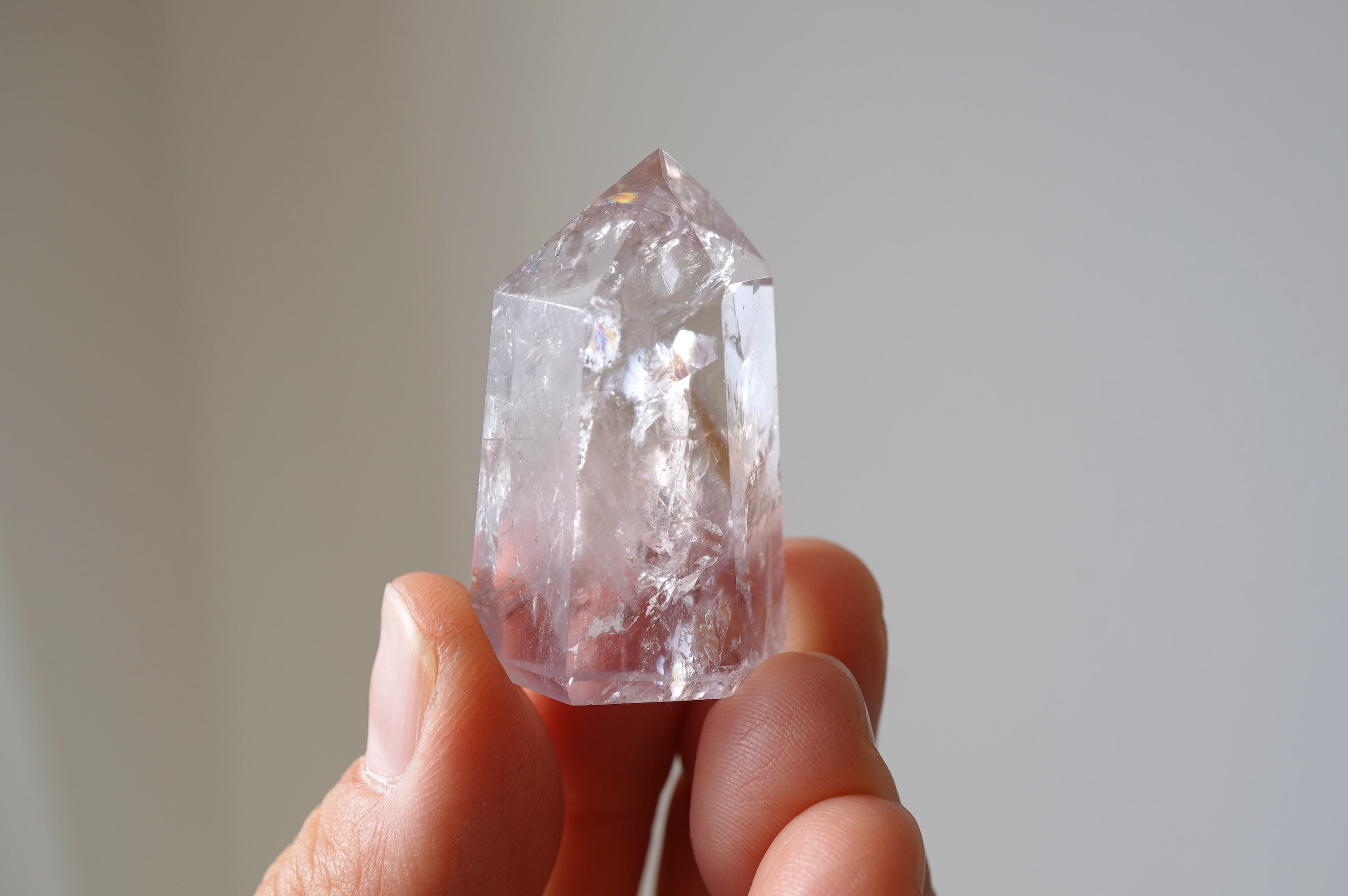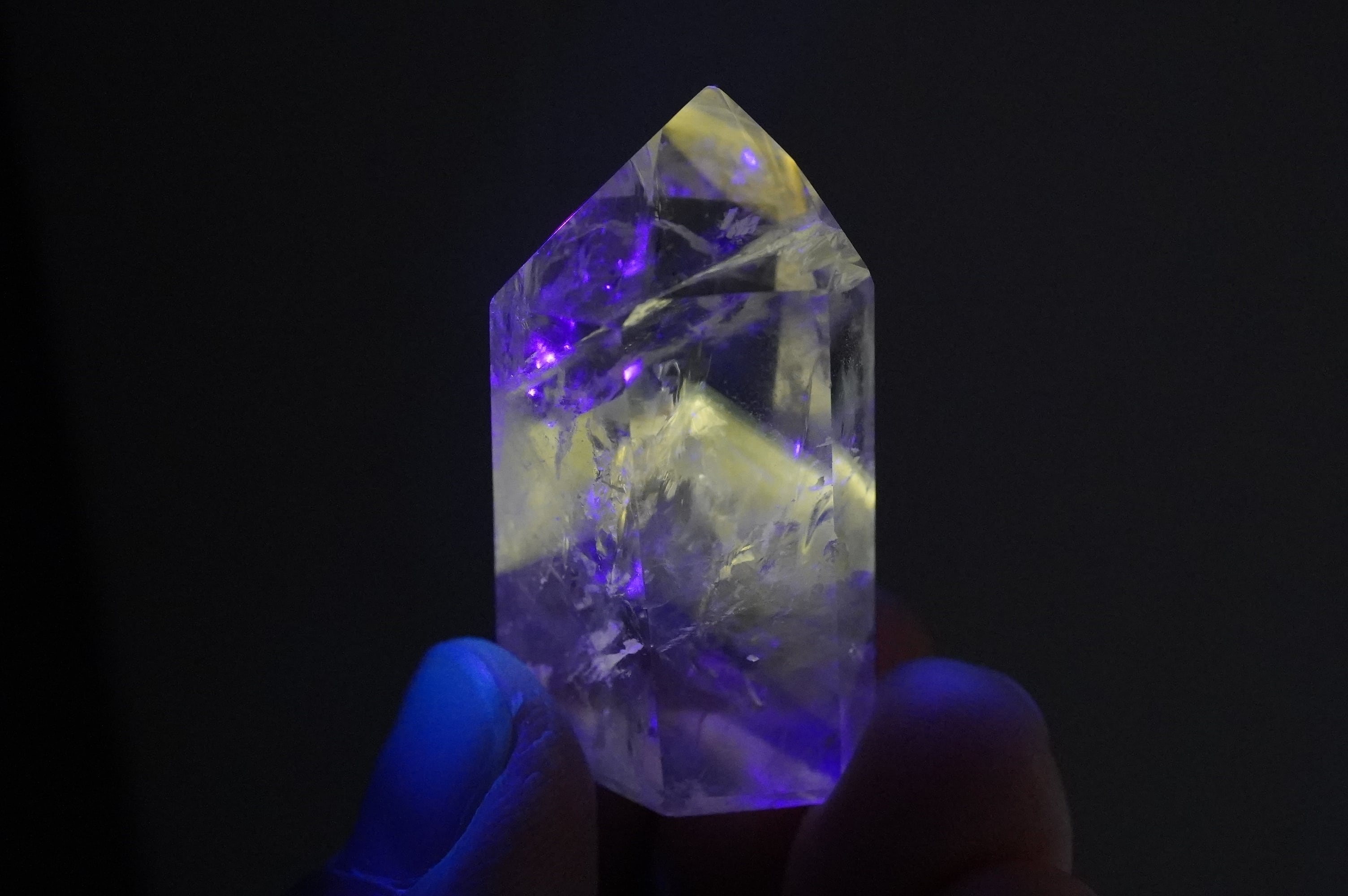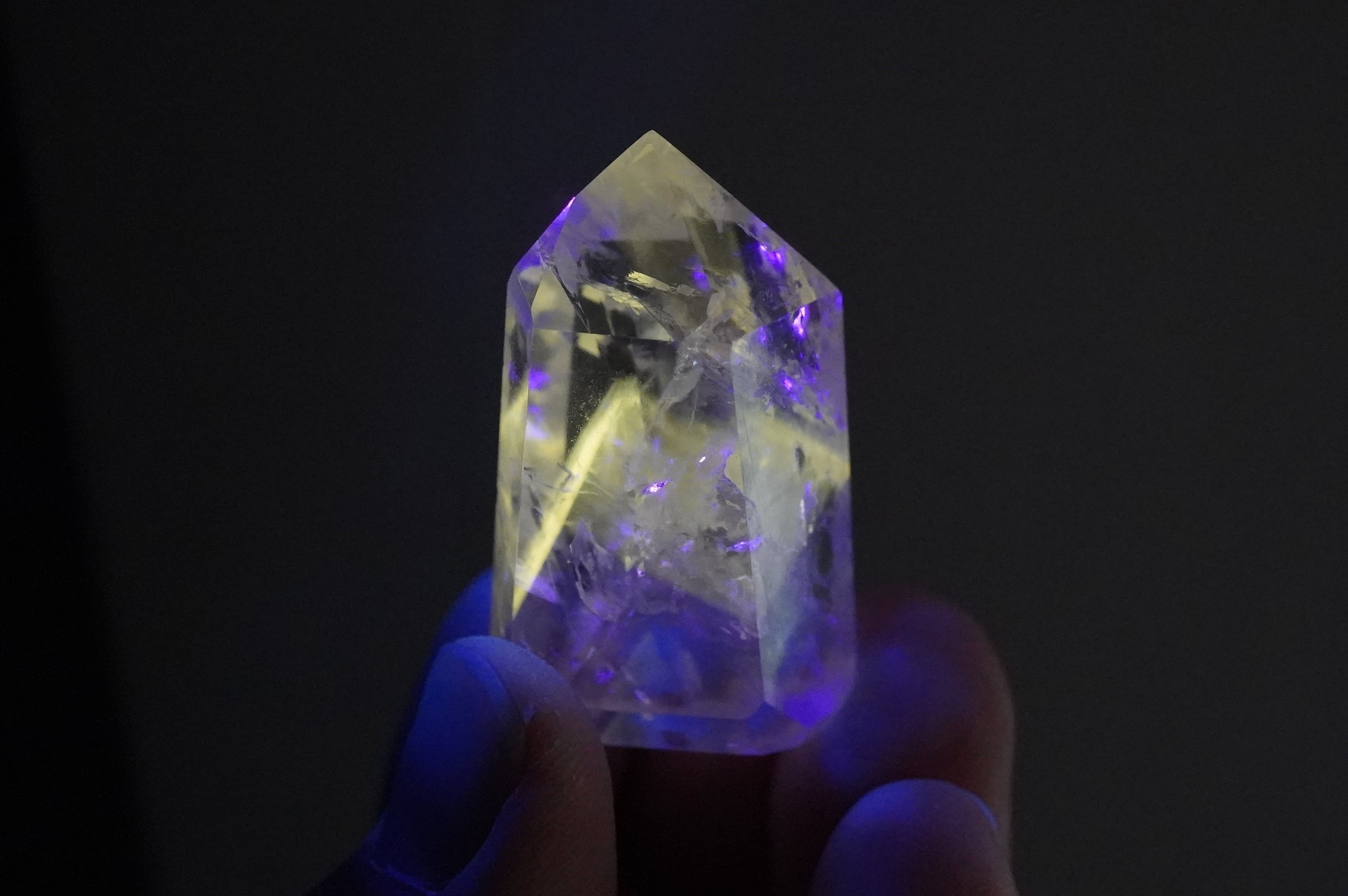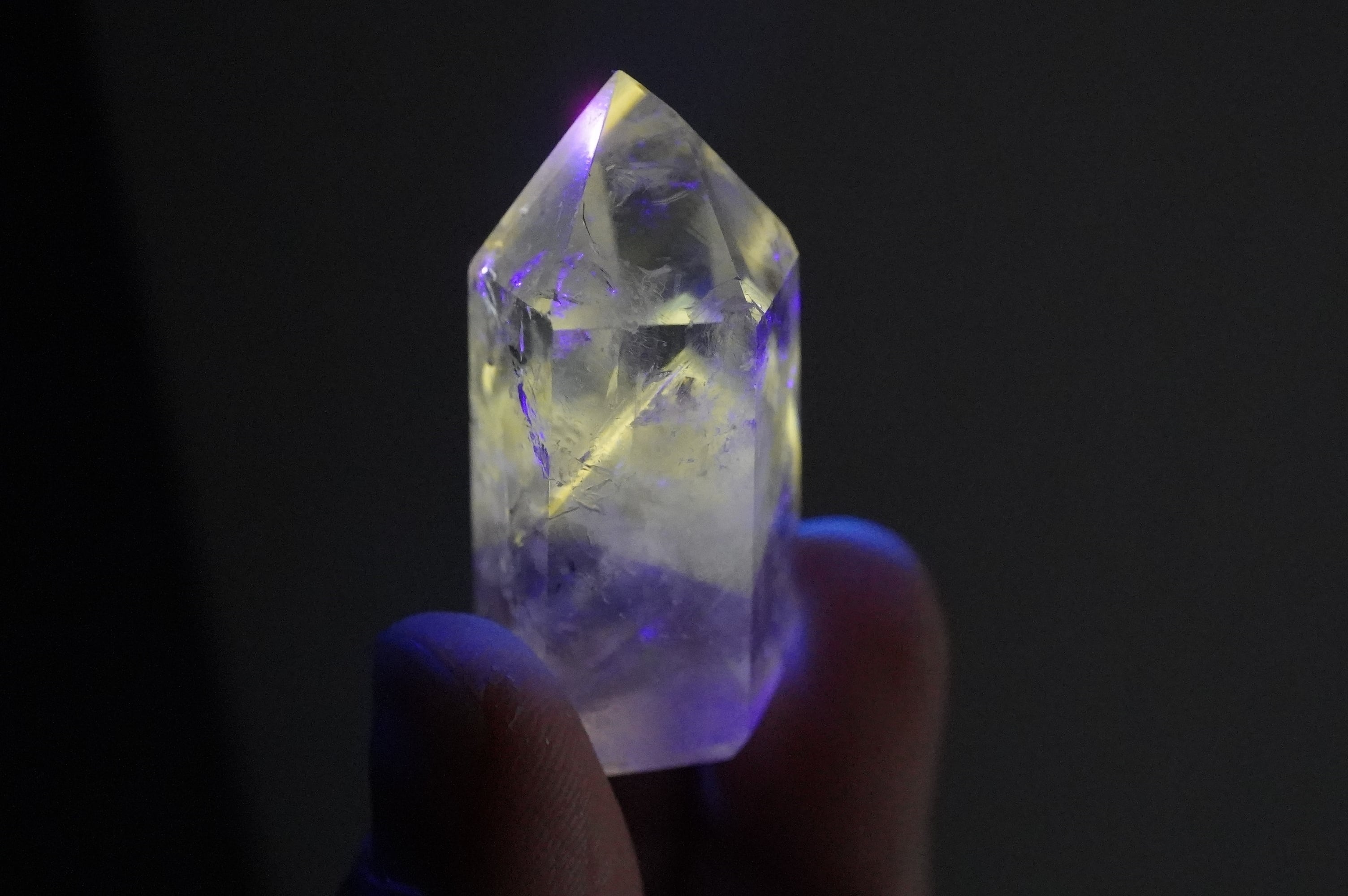 パウエライトはカルシウムとモリブデンを含むタングステン酸塩鉱物とのこと。はてなって感じですが、比較的珍しい鉱物のようです。それがUVライトにあたると黄色く輝きます。この個体はほんのりアメジストになっています。中のクラックが織りなす光の世界、カメラに納めるのが難しい可愛い虹など、眺めていて飽きないです。