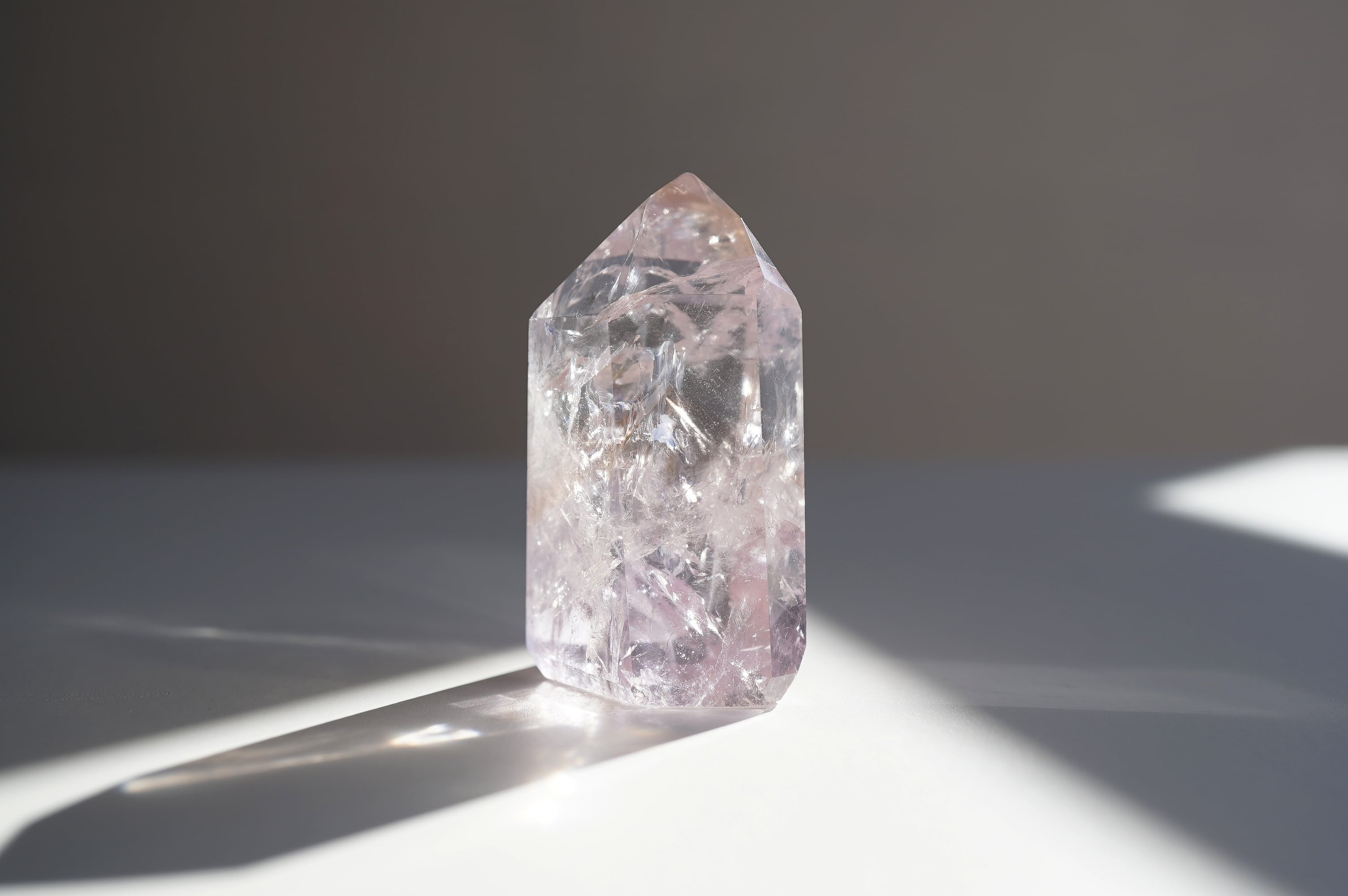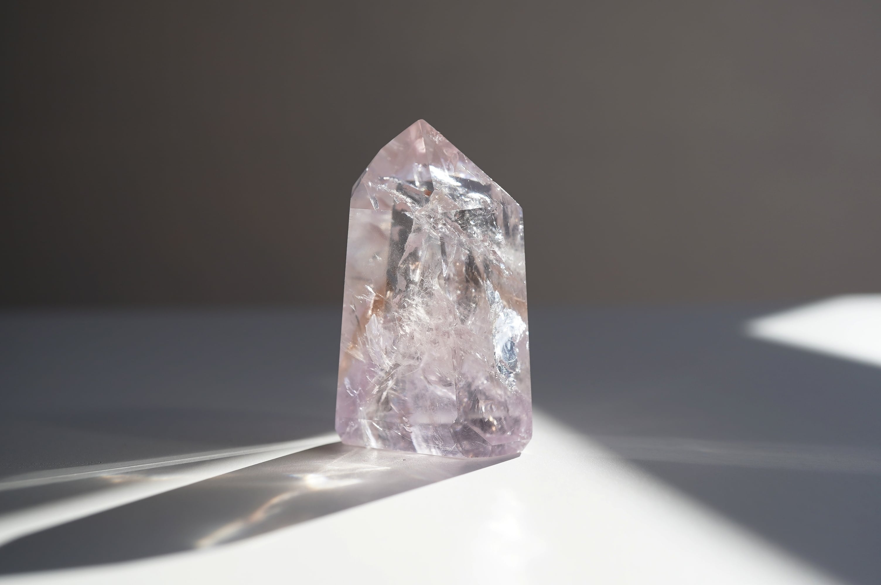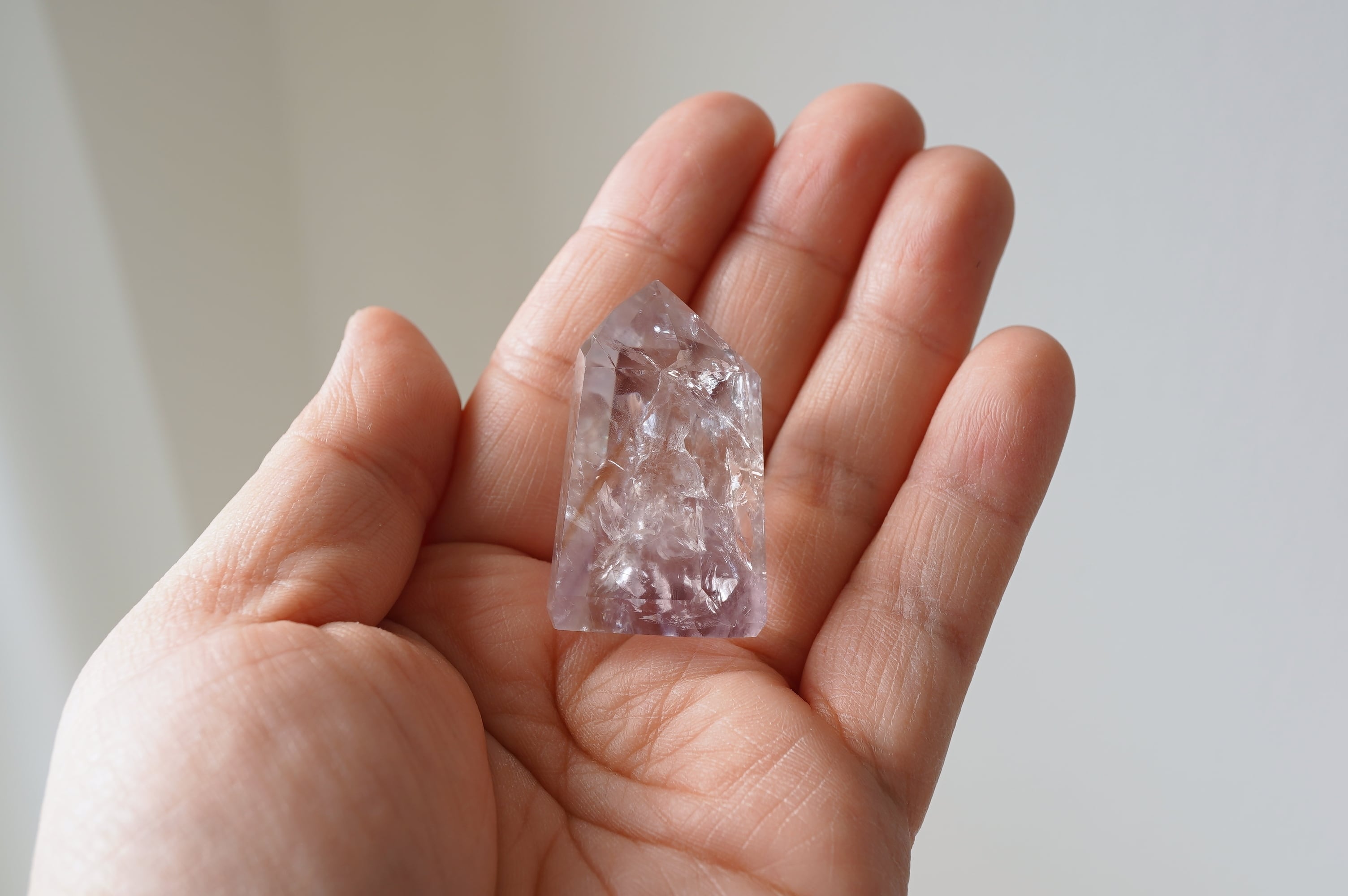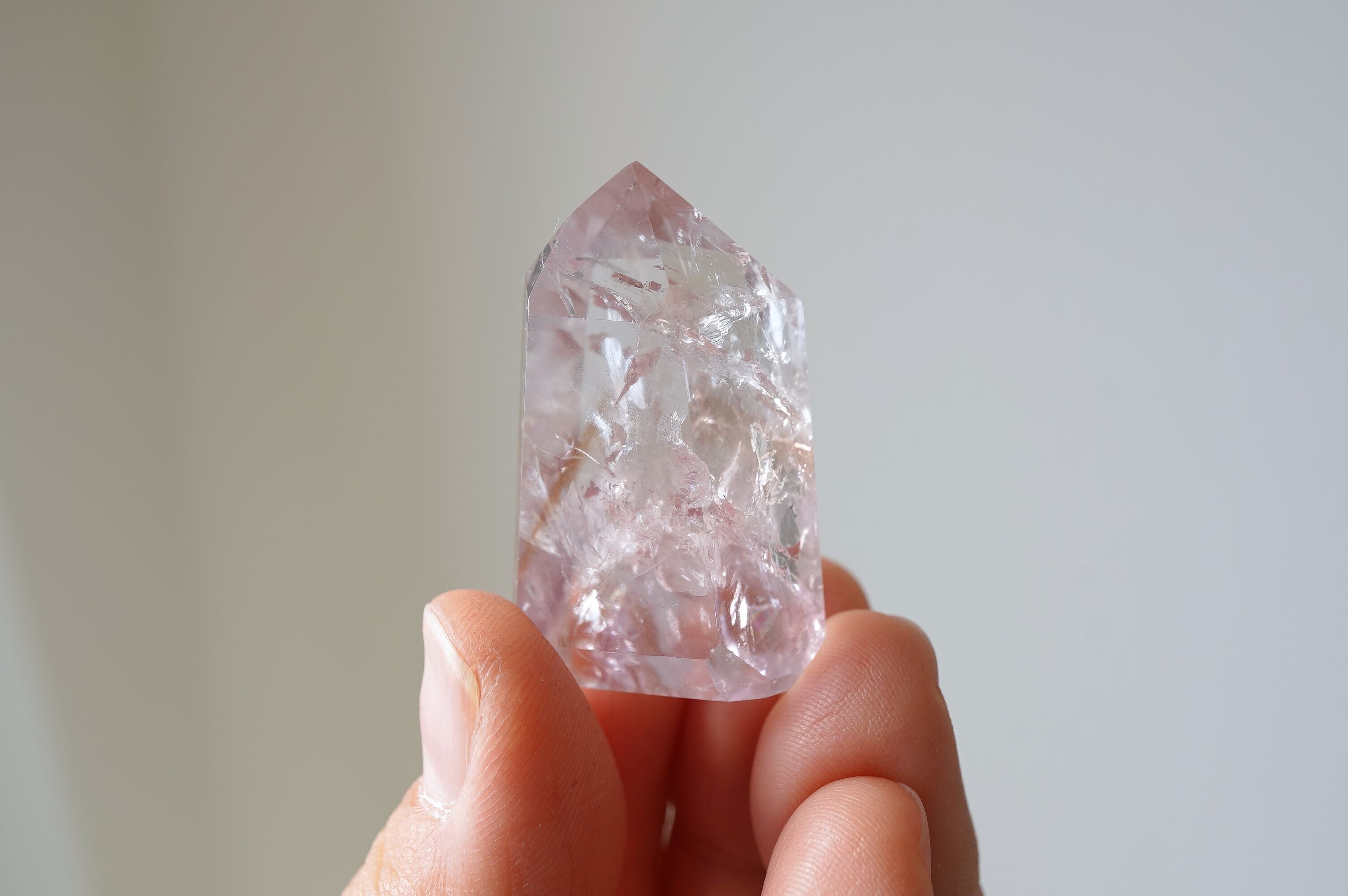 パウエライトはカルシウムとモリブデンを含むタングステン酸塩鉱物とのこと。はてなって感じですが、比較的珍しい鉱物のようです。それがUVライトにあたると黄色く輝きます。この個体はほんのりアメジストになっています。中のクラックが織りなす光の世界、カメラに納めるのが難しい可愛い虹など、眺めていて飽きないです。