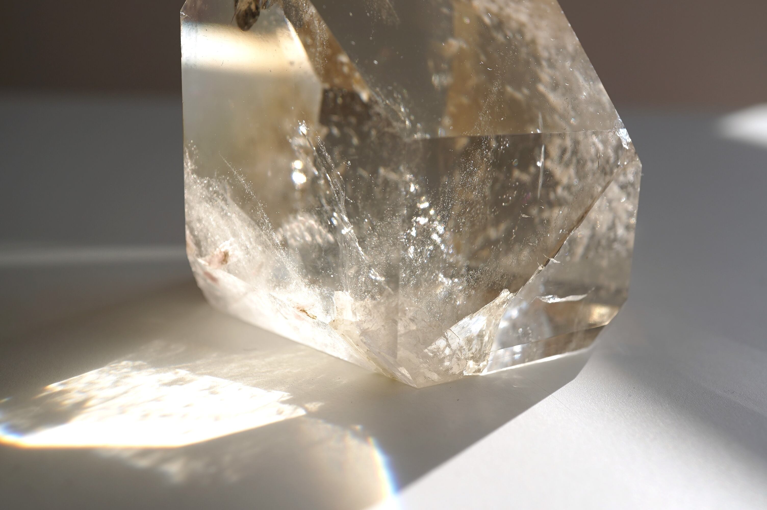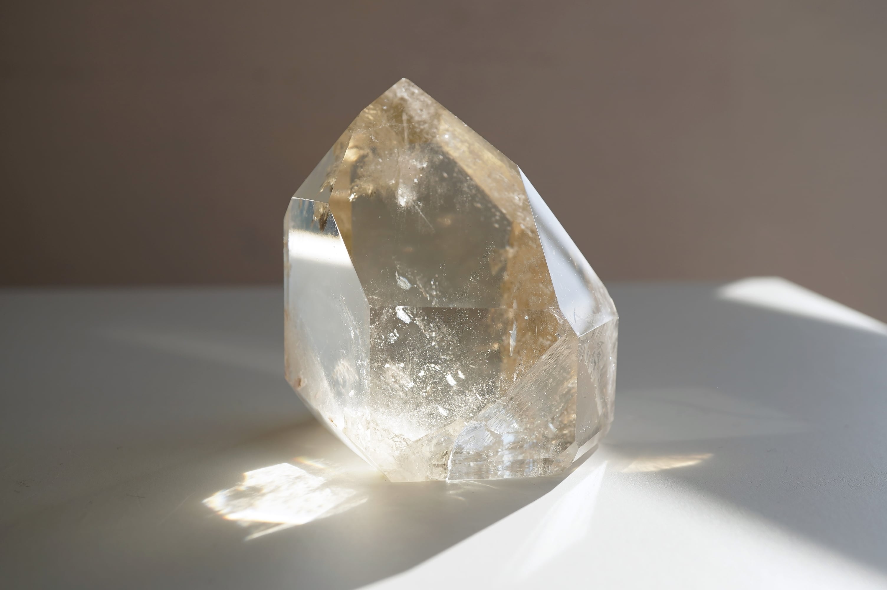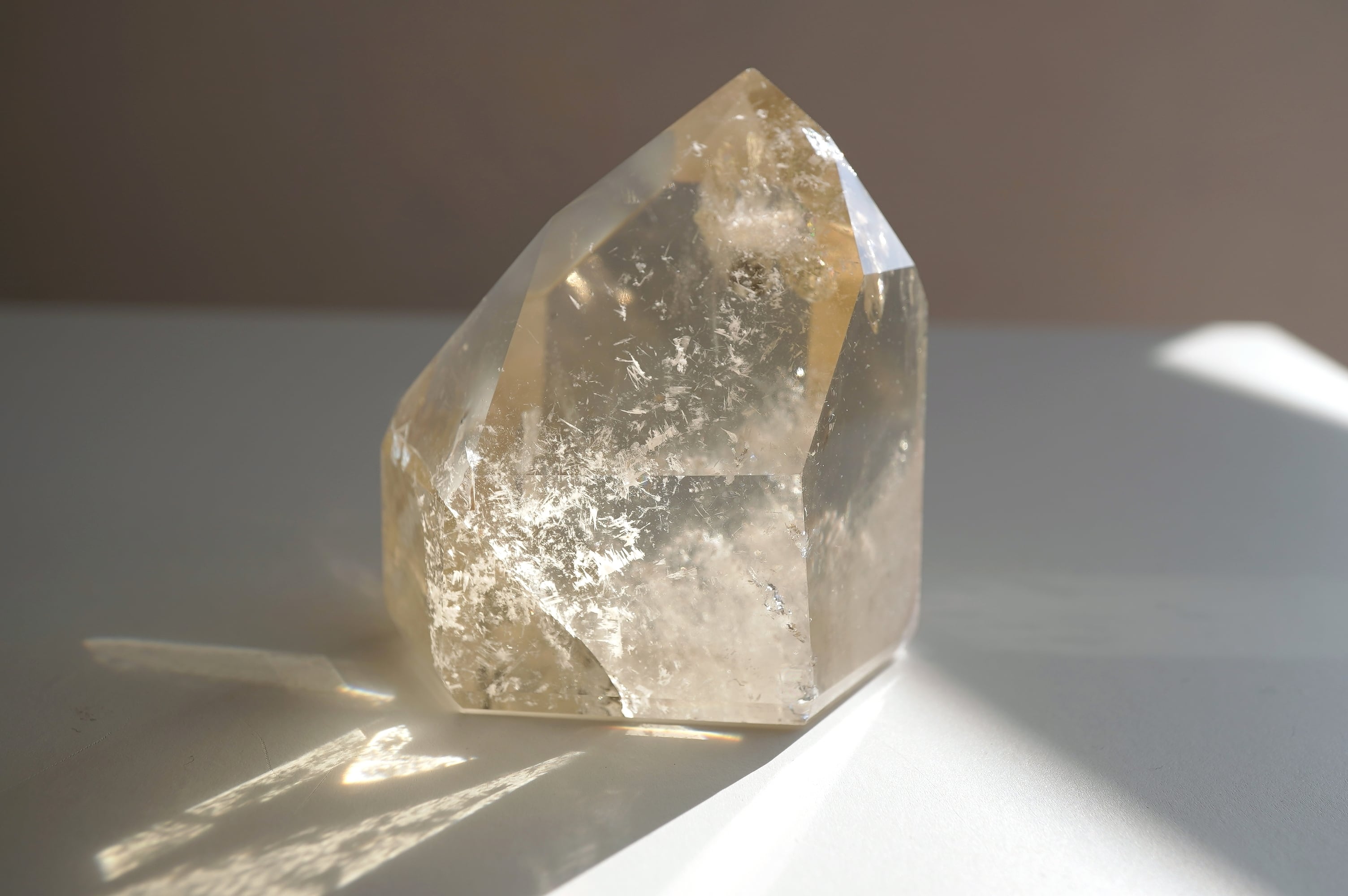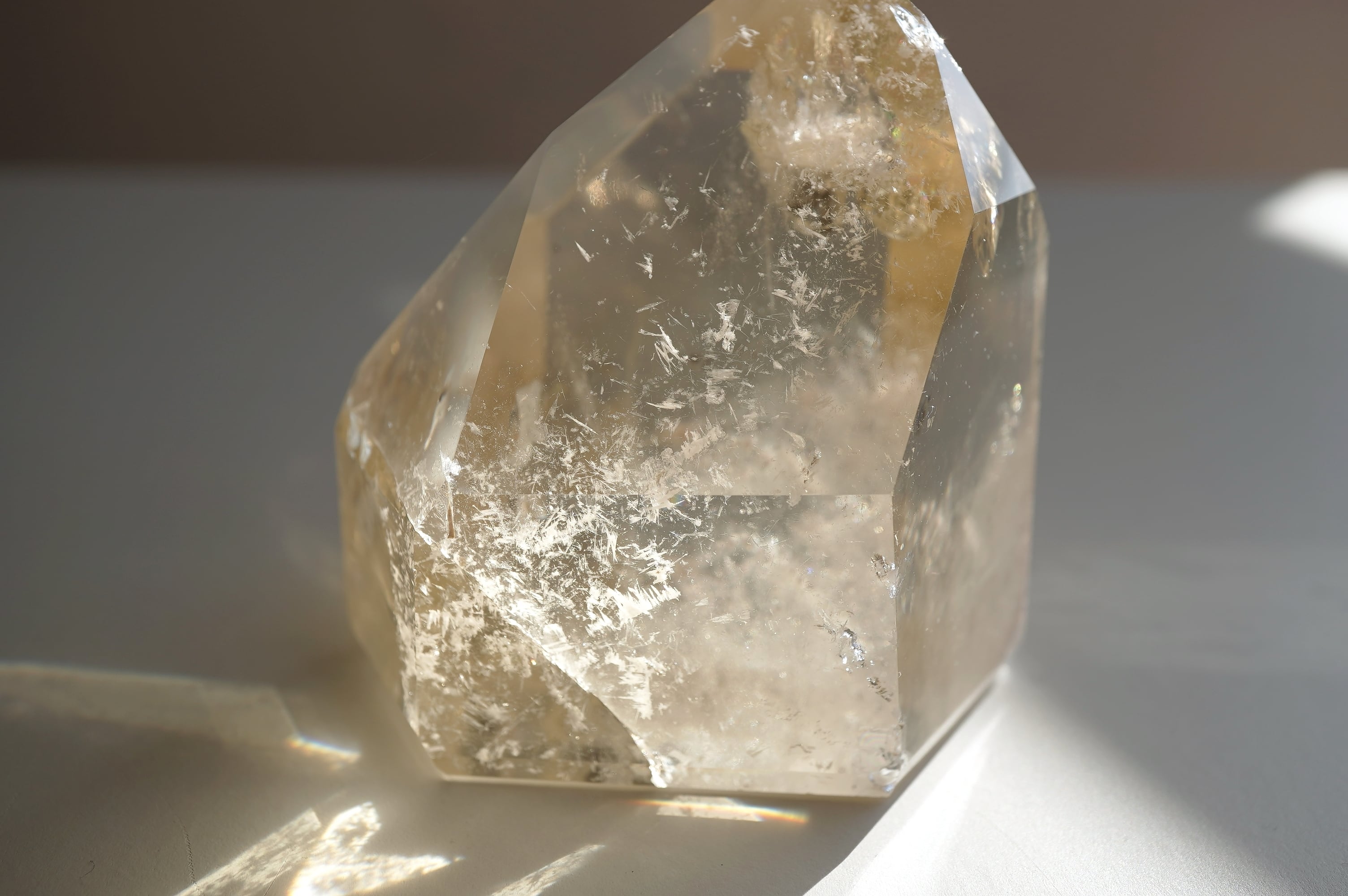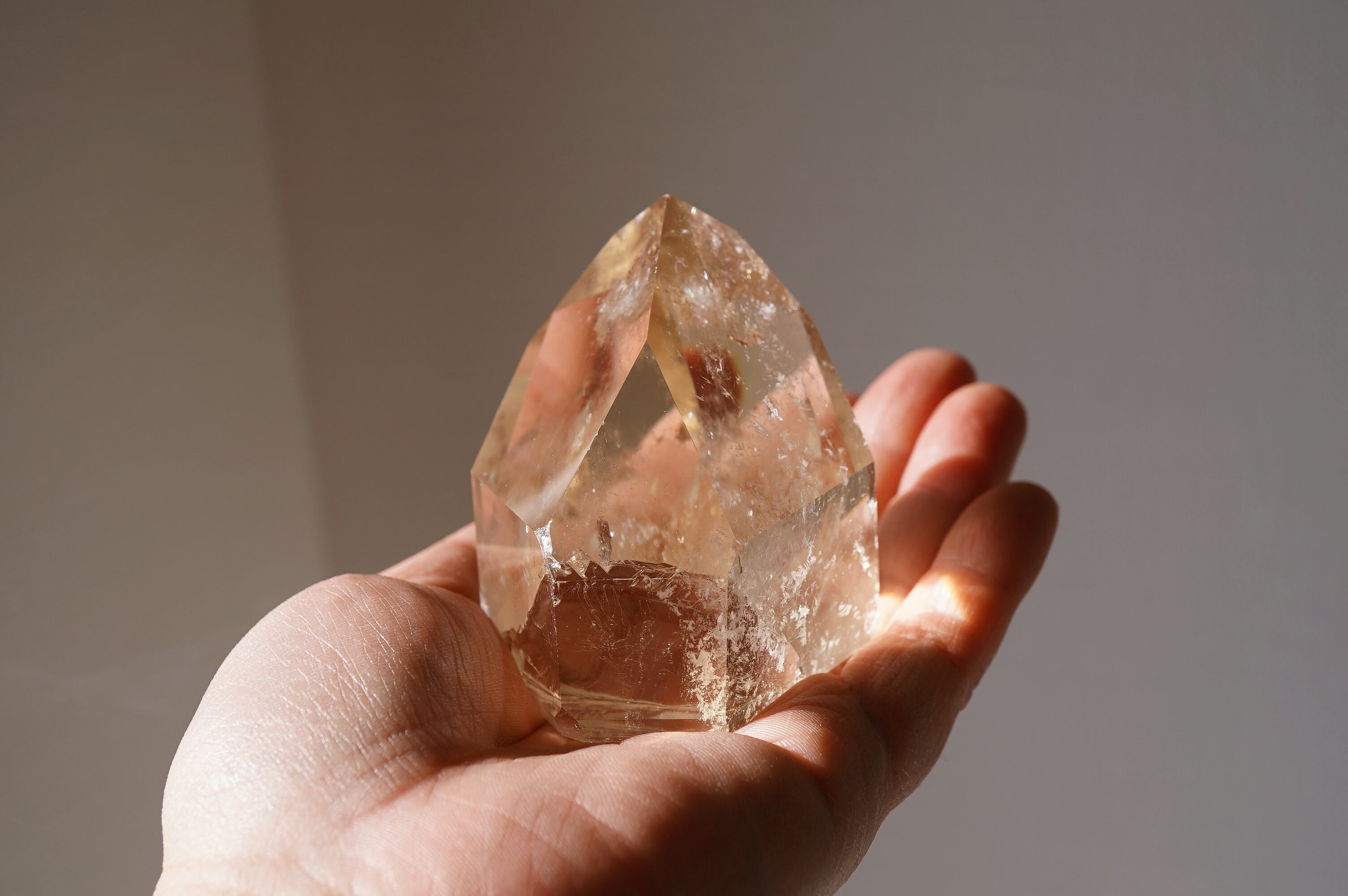 フェルスパー(長石)を内包した全面磨きの天然シトリンです。どしっと重厚感のあるフォルムに透明感のある落ち着いたシトリンカラーがとっても美しいです。数年前にツーソンにて出会った個体です。自然に入った中のクラックが神秘的なのと、店主の好きな泡のようなもやもやが入っているのがとても良きです。