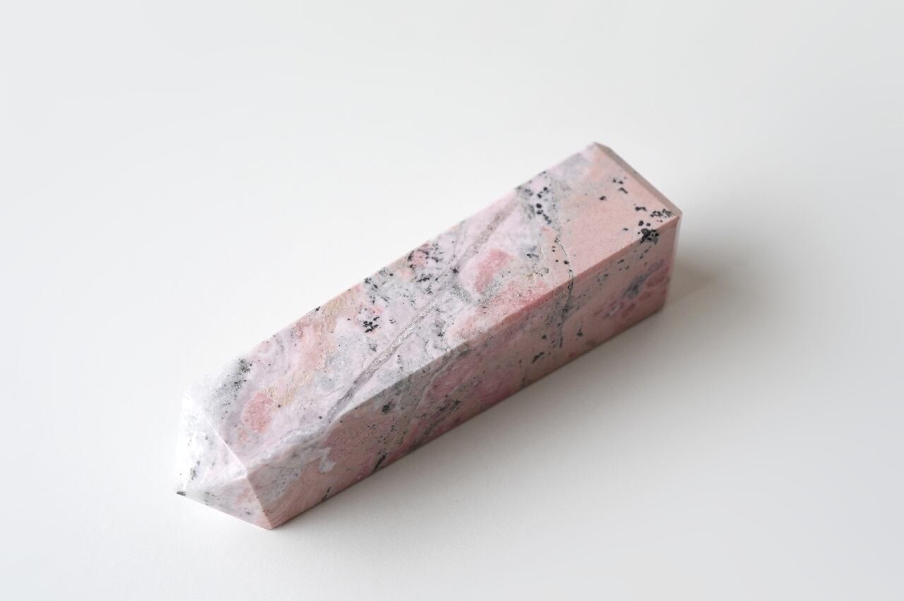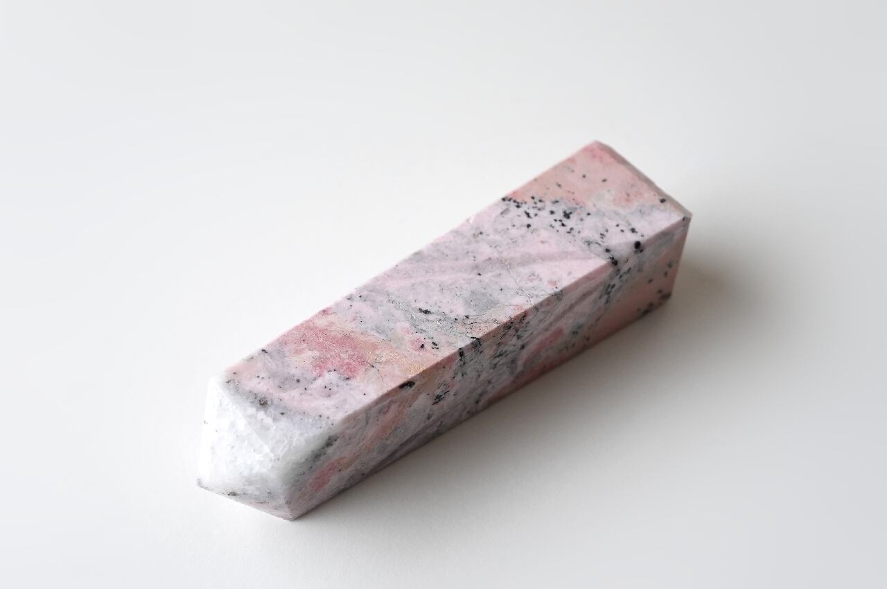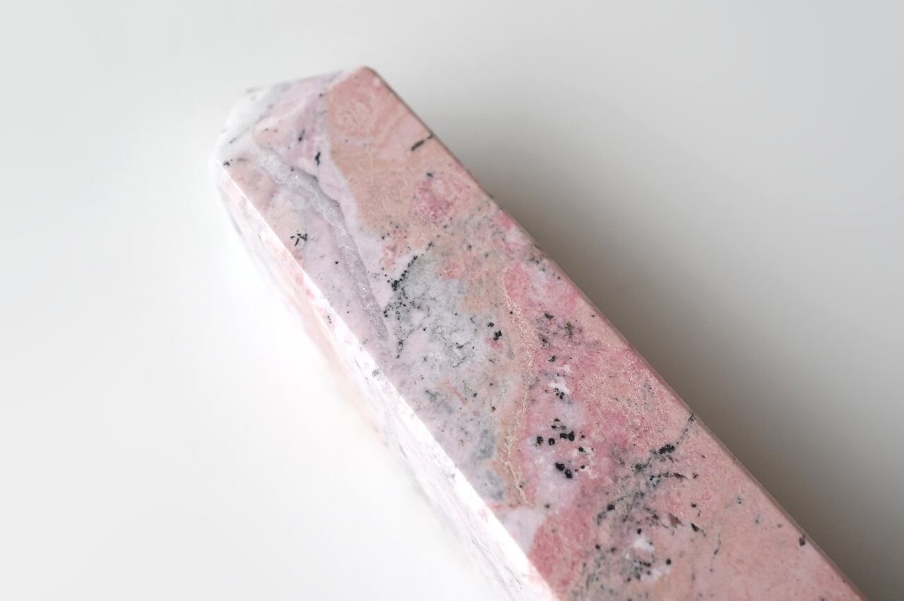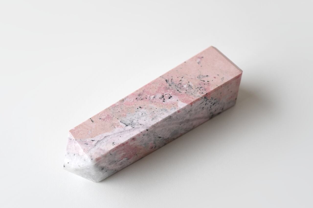白いシリカ(水晶成分)が混ざることでミルキーなピンクになったロードナイト。なんとも言えないマーブルカラーが可愛いですね。