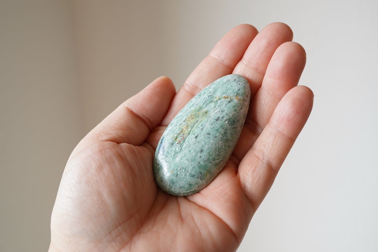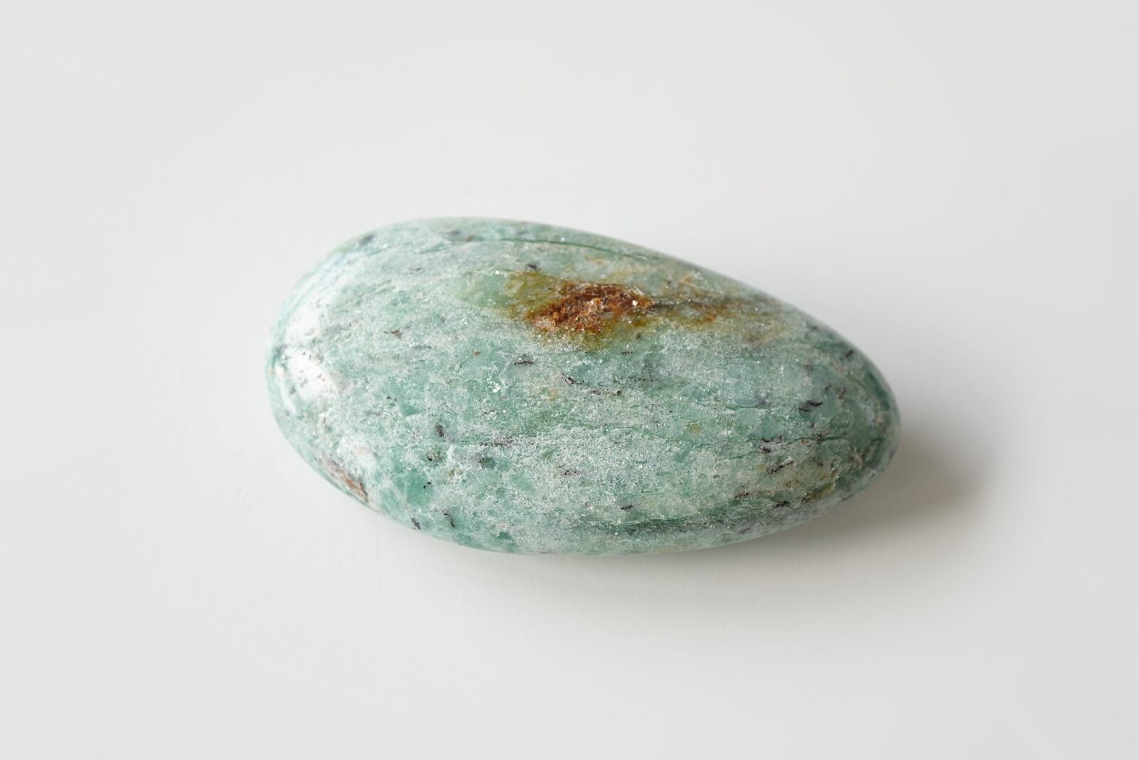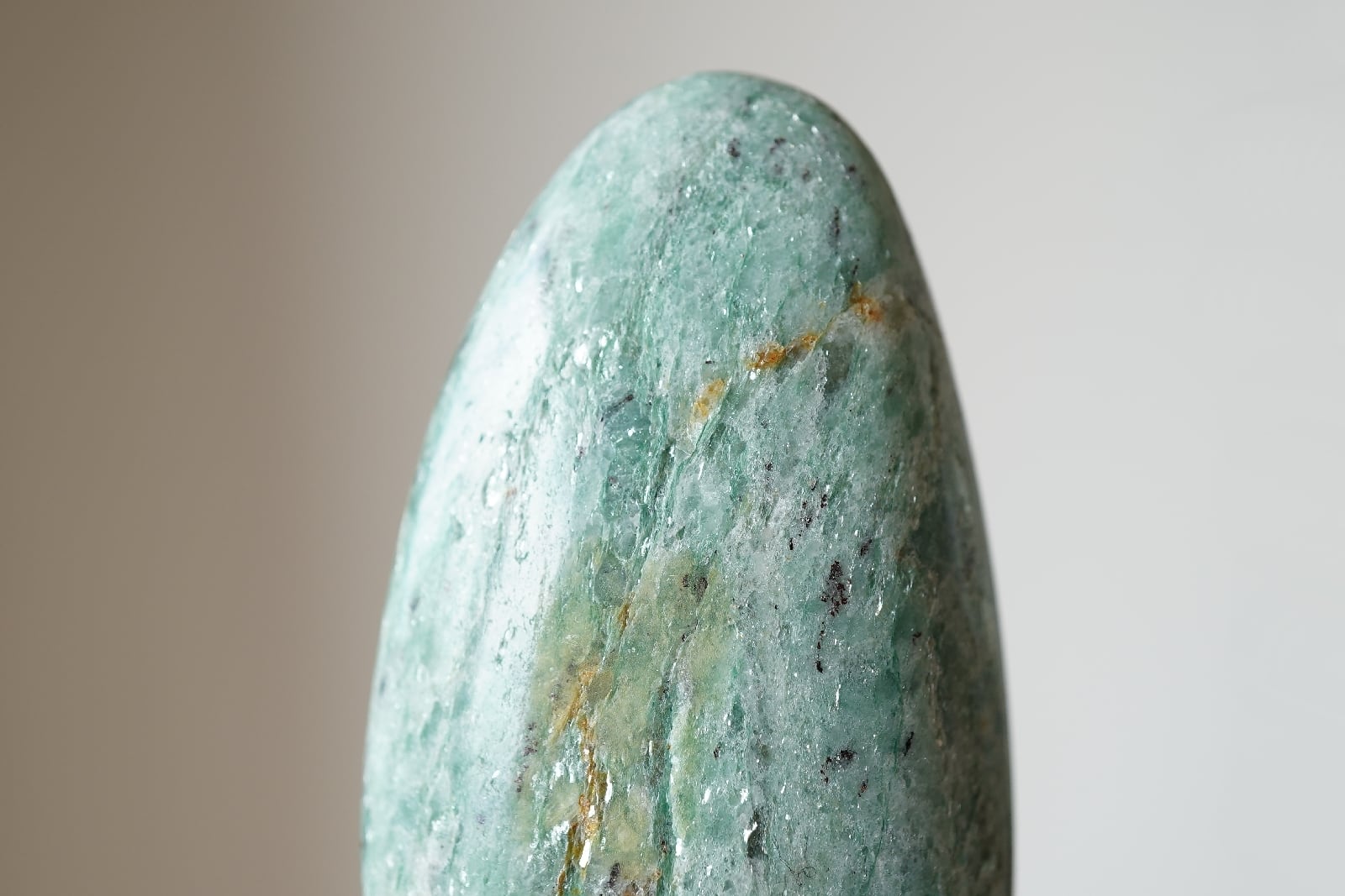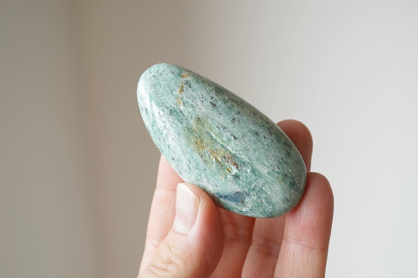フックサイトは緑色のマイカ。その全体の中にちょこっとカイヤナイトがあります。ミントグリーンでキラキラしているのがなんとも爽やか。