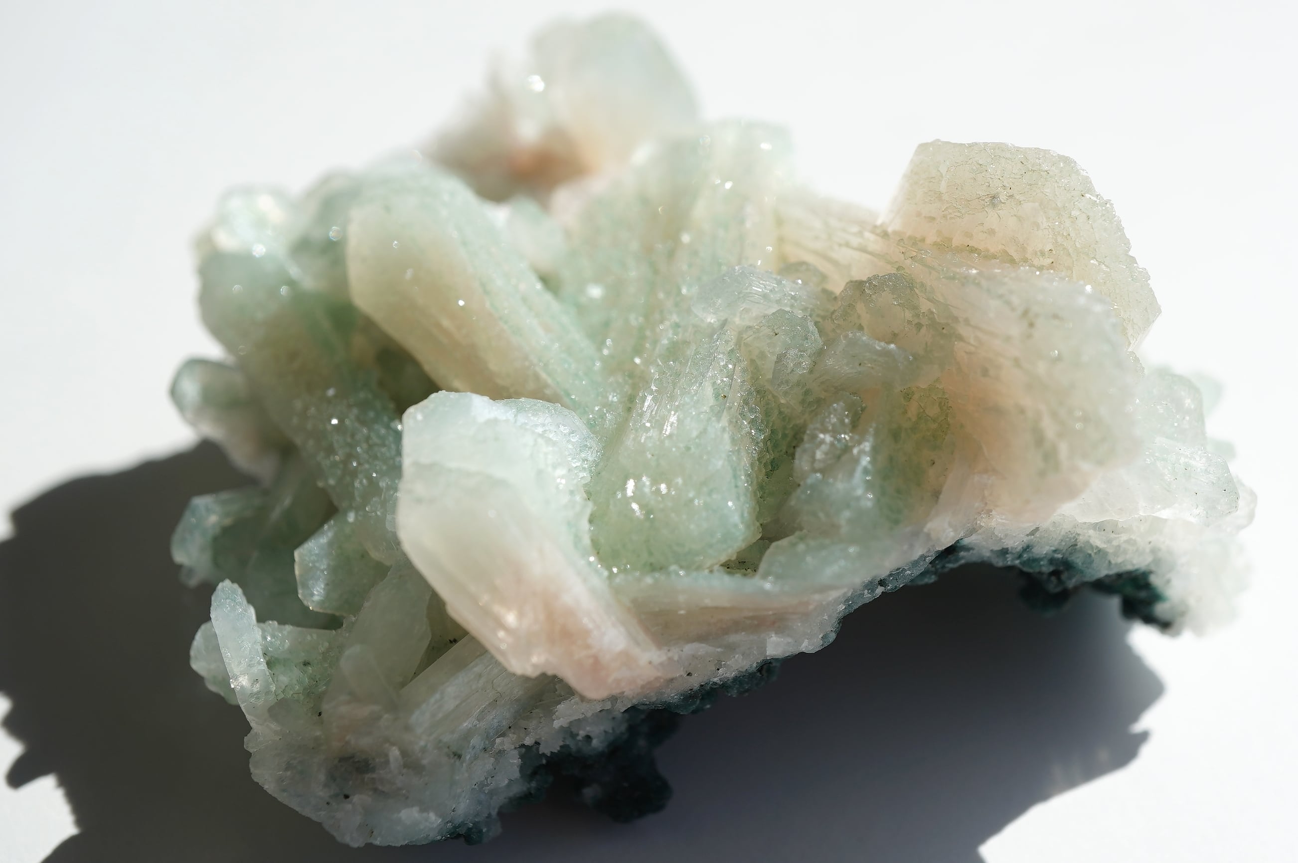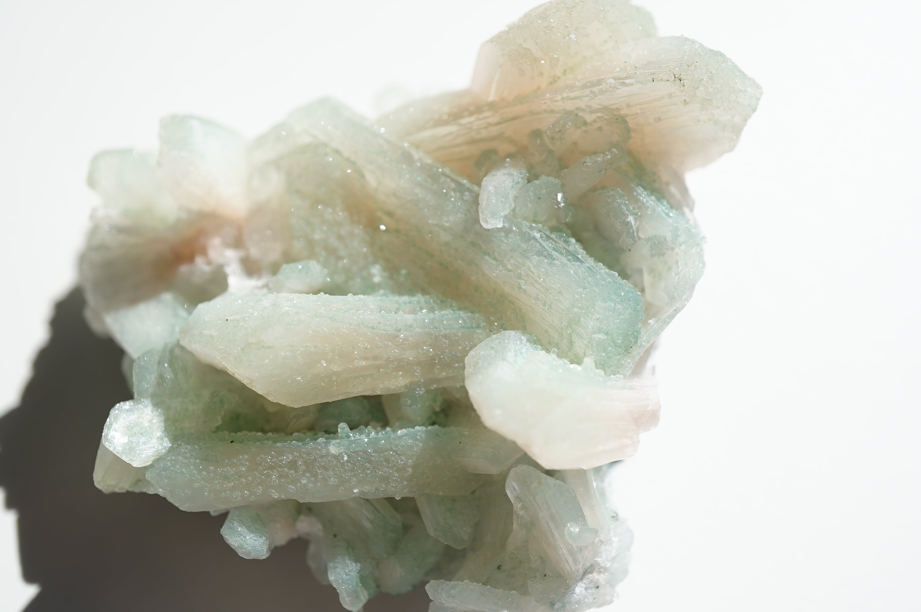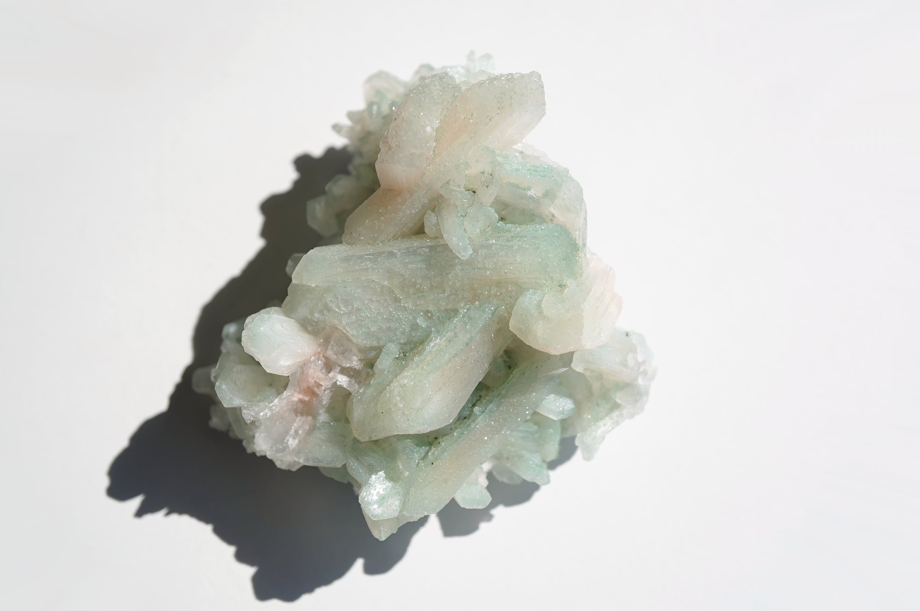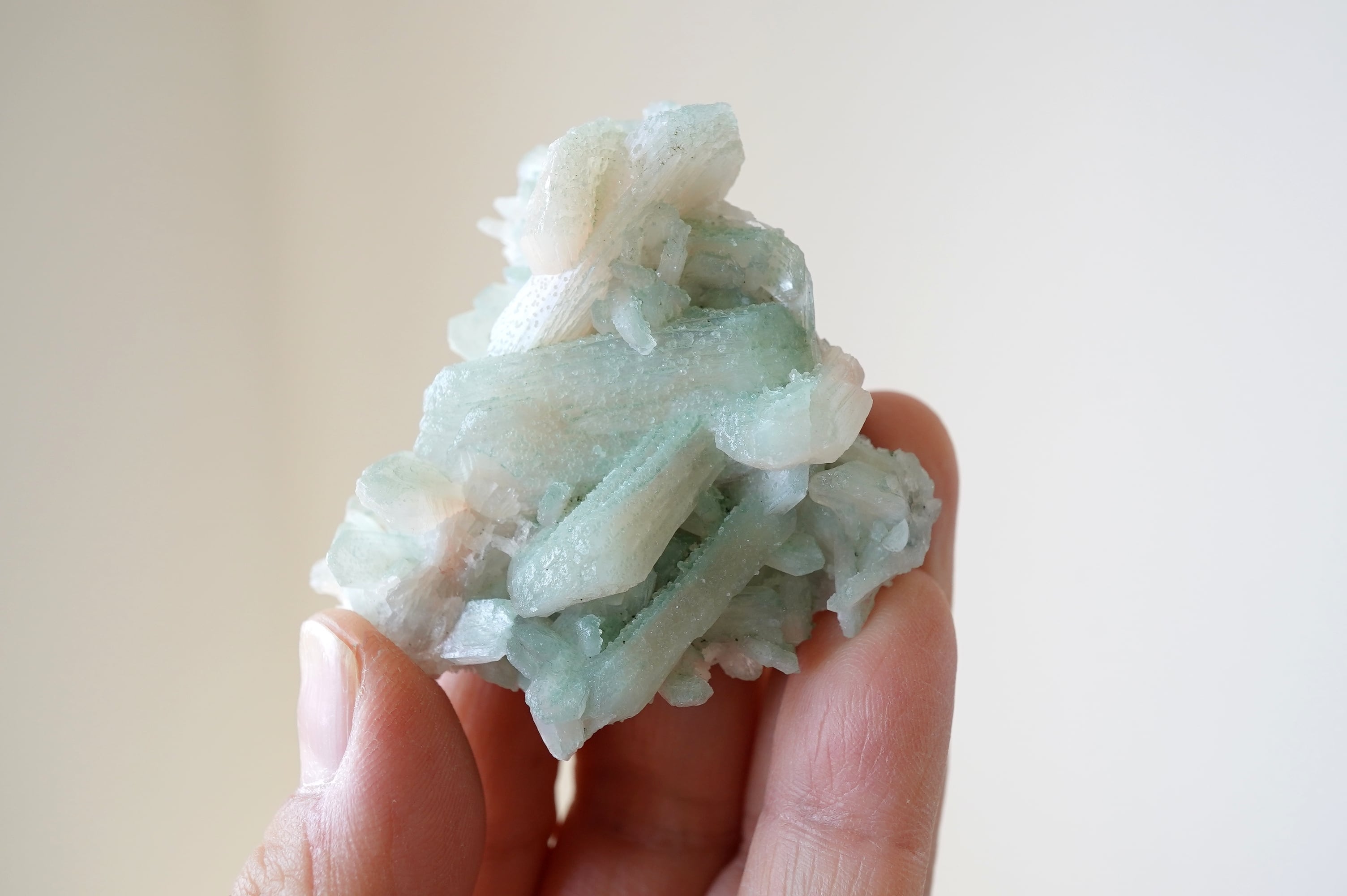 スティルバイトの表面に超微粒なグリーンアポフィライトがくっついています。そのお陰で全体がうっすらグリーンなのがわかります。が、スティルバイトのクリームカラーの可愛さも相まって、主張しすぎず、さりげなく、でも色がわかる、なんならちょっと薄いオレンジも添えて・・・な、もちつもたれずな関係。素敵!アンニュイってやつですかな(あんまり意味わかってない)最後の3枚は明るい屋内で撮影。光がたくさん当たっているとスティルバイトの光沢があって全体的に淡い感じがしますが、直接光があたらない場所ですとよりグリーンが映えます。
