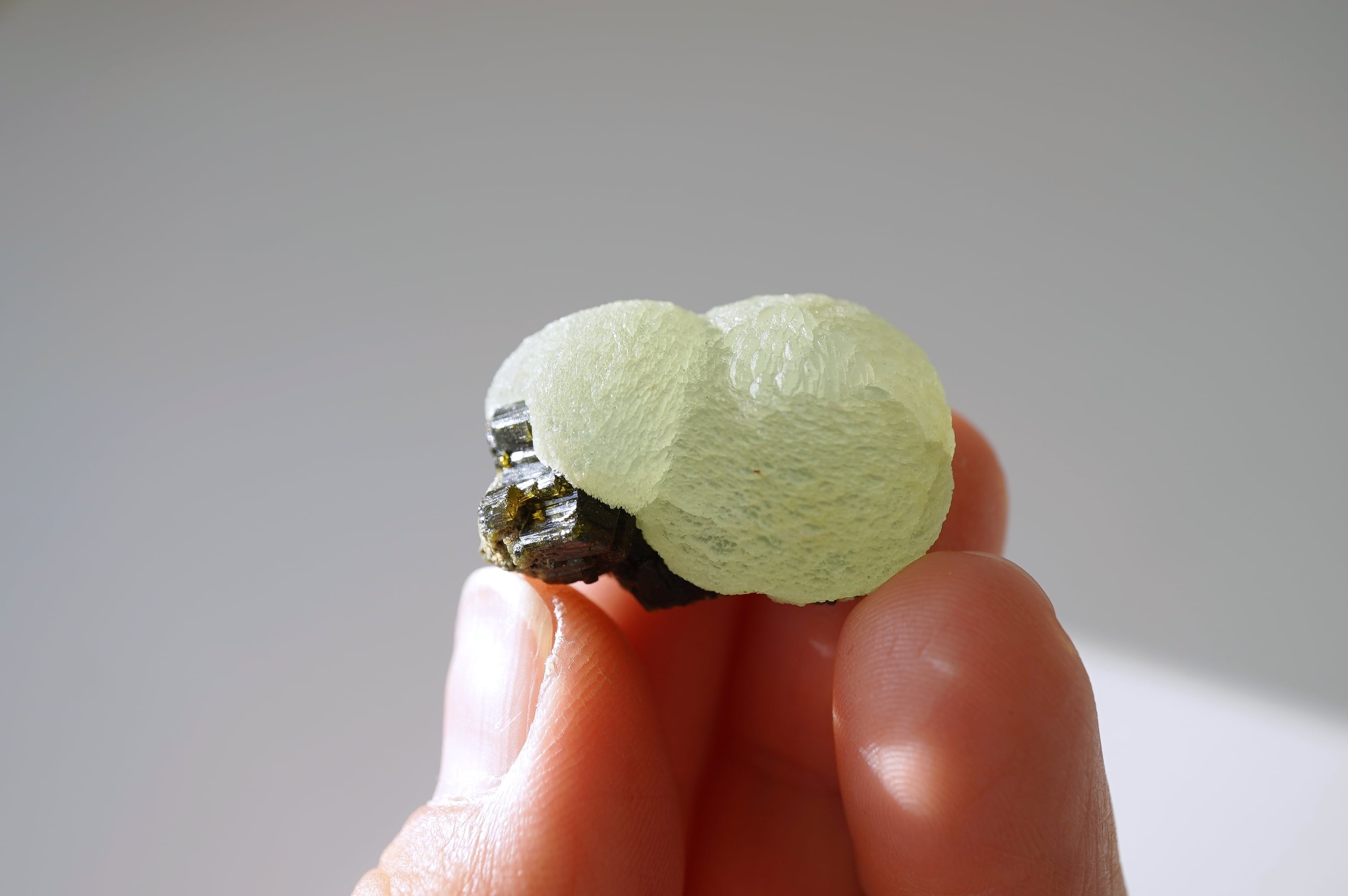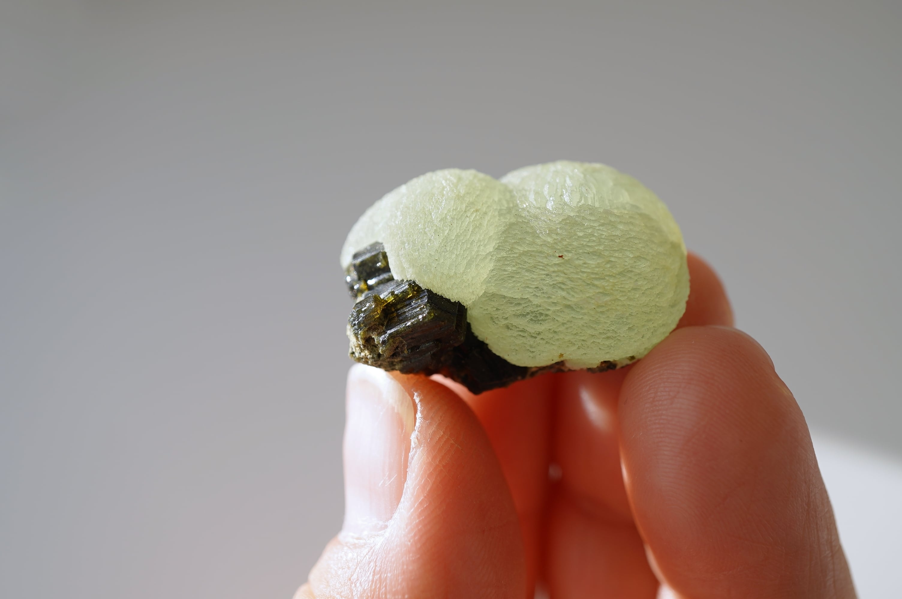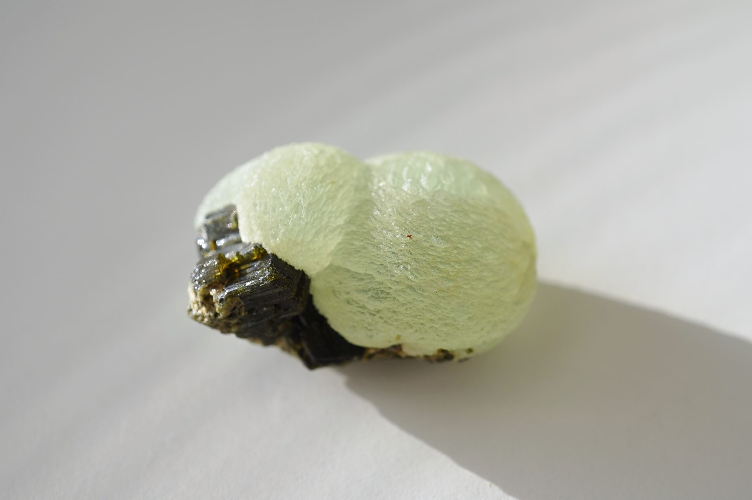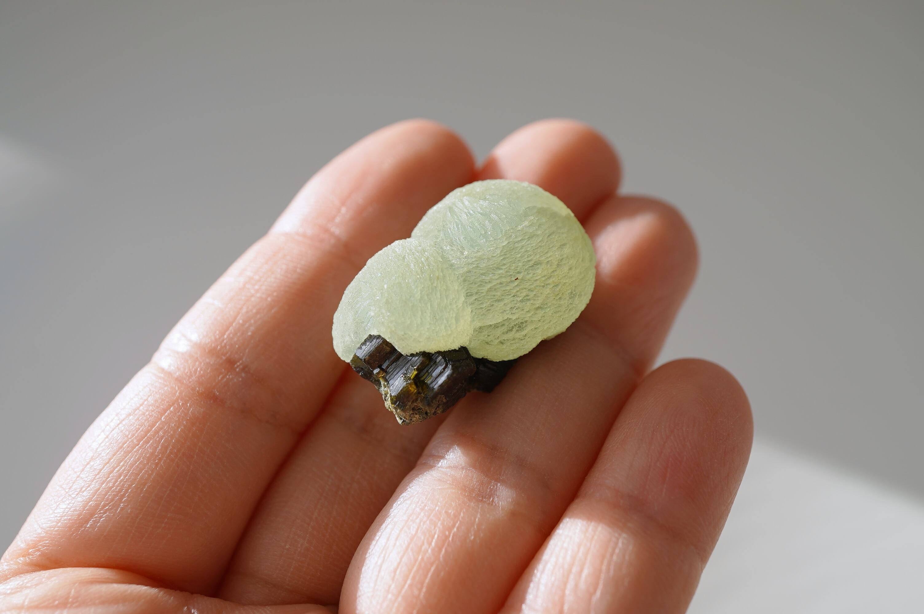 プレナイトのおしりに敷かれたエピドートってところでしょうか。。。プレナイトは和名で葡萄石(ぶどういし)。まさしく、マスカットのような色で葡萄のような結晶だからですね⭐︎ちらりと見えるエピドートもまた可愛いです。
