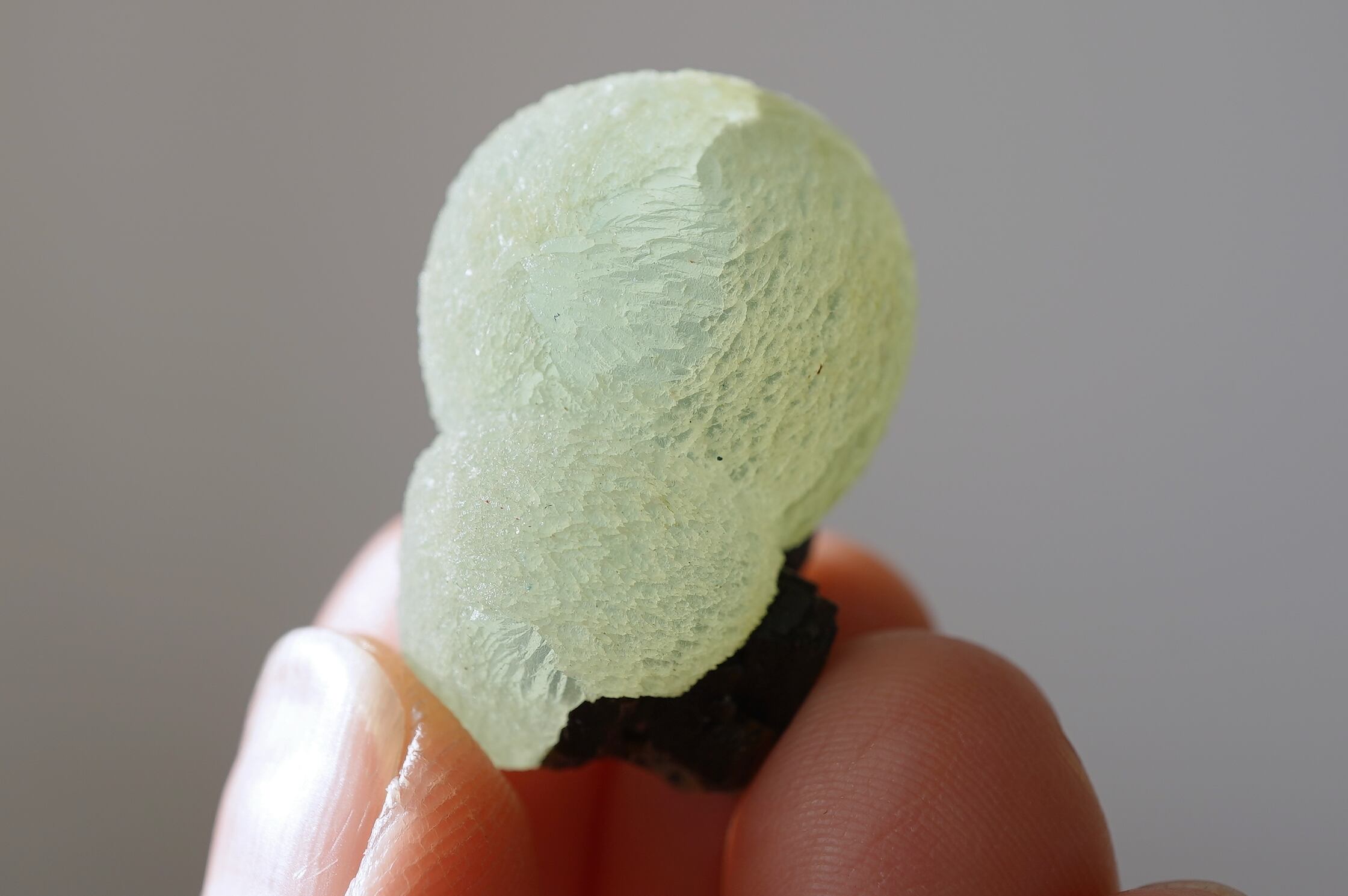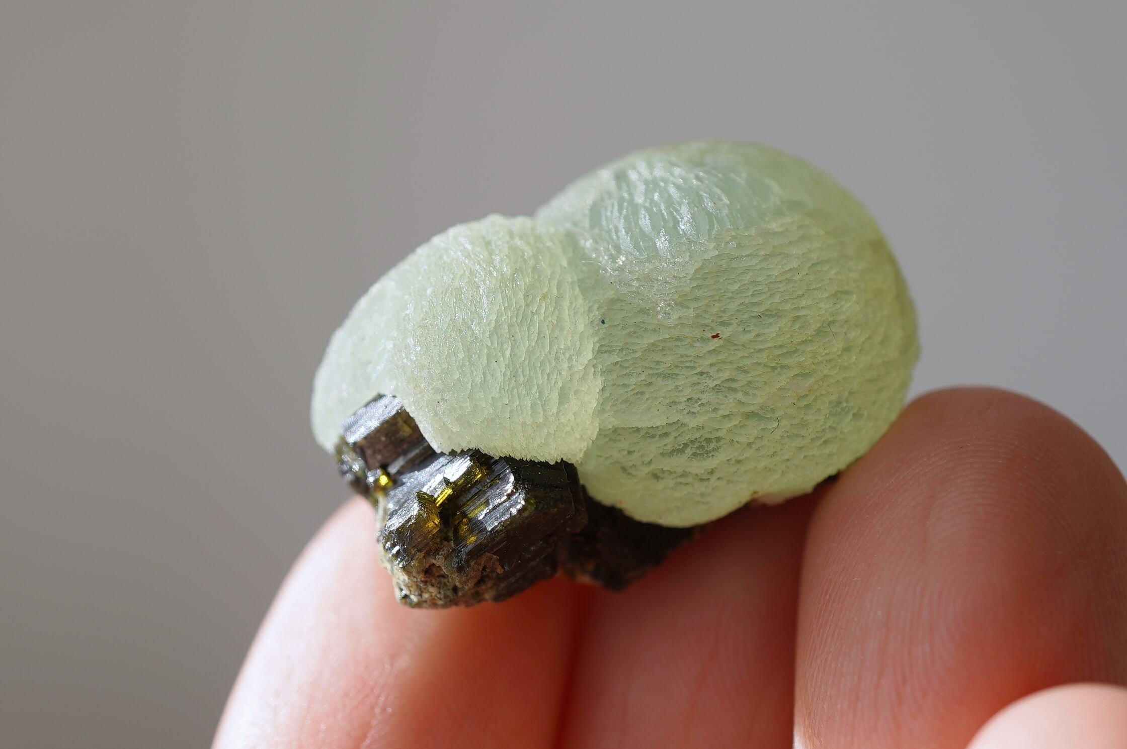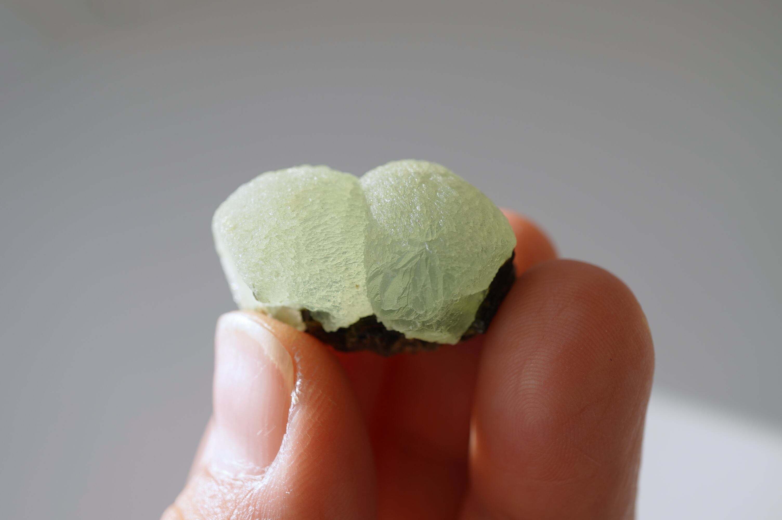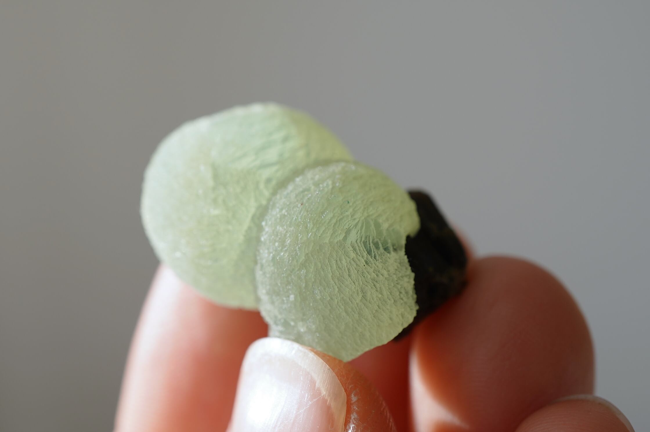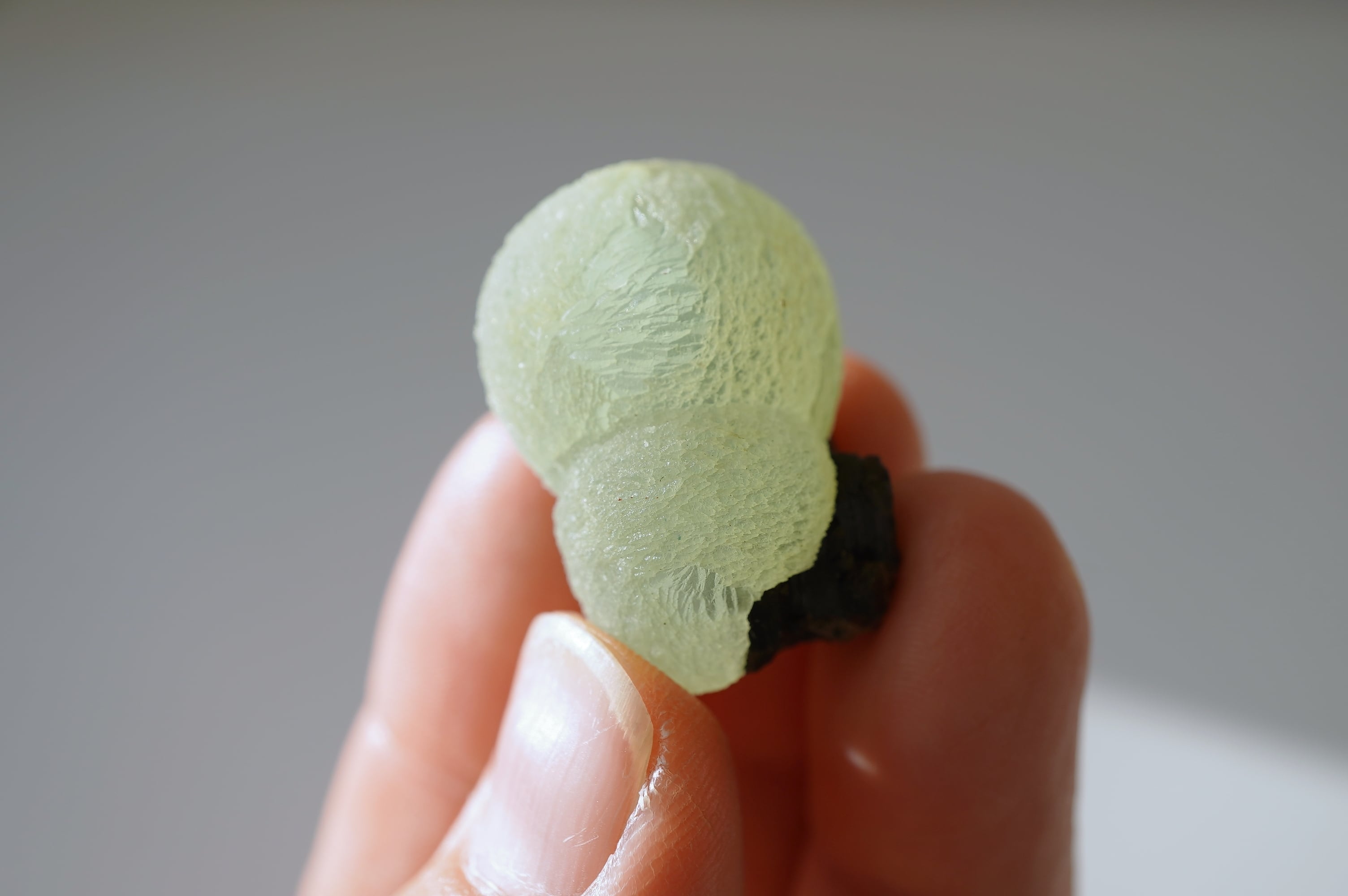 プレナイトのおしりに敷かれたエピドートってところでしょうか。。。プレナイトは和名で葡萄石(ぶどういし)。まさしく、マスカットのような色で葡萄のような結晶だからですね⭐︎ちらりと見えるエピドートもまた可愛いです。