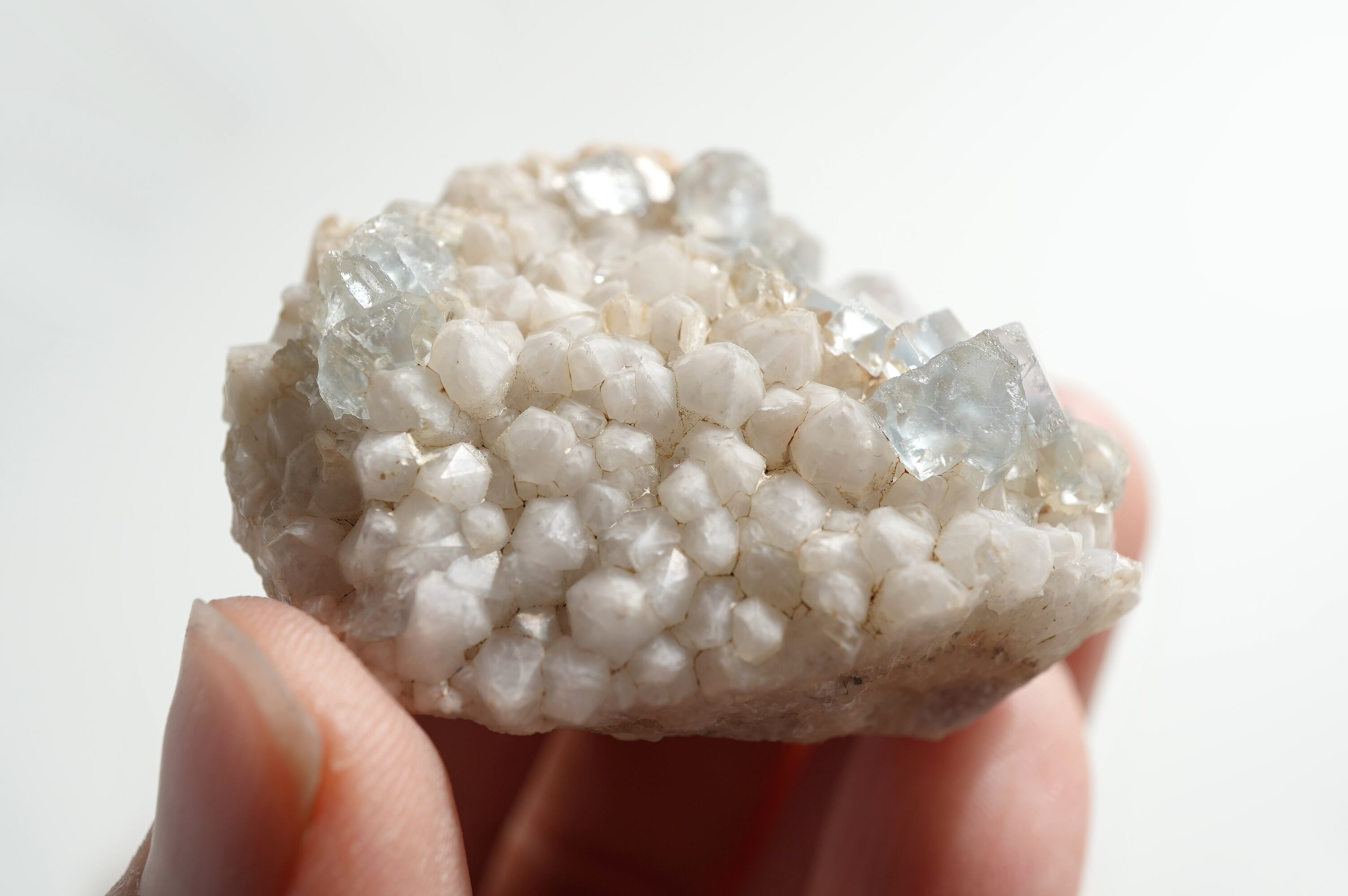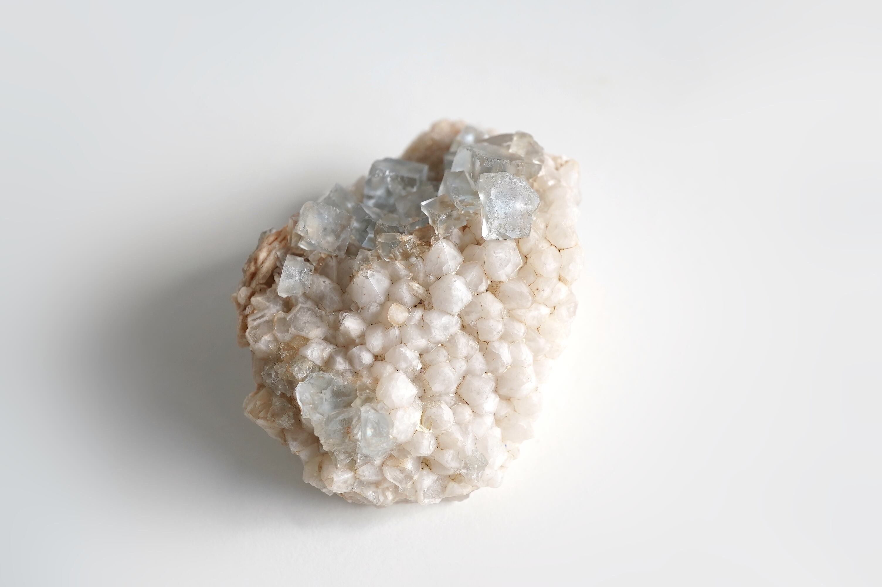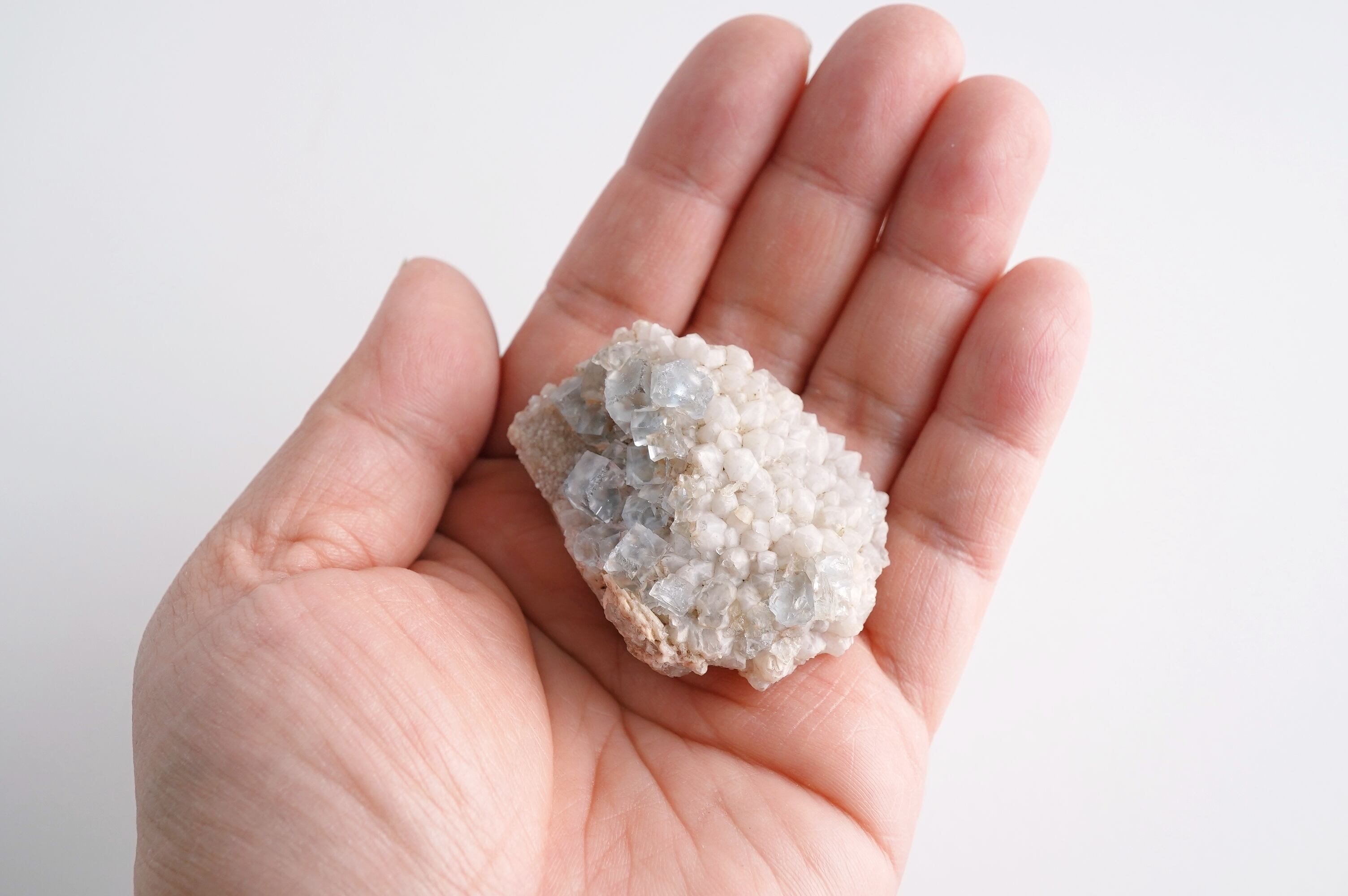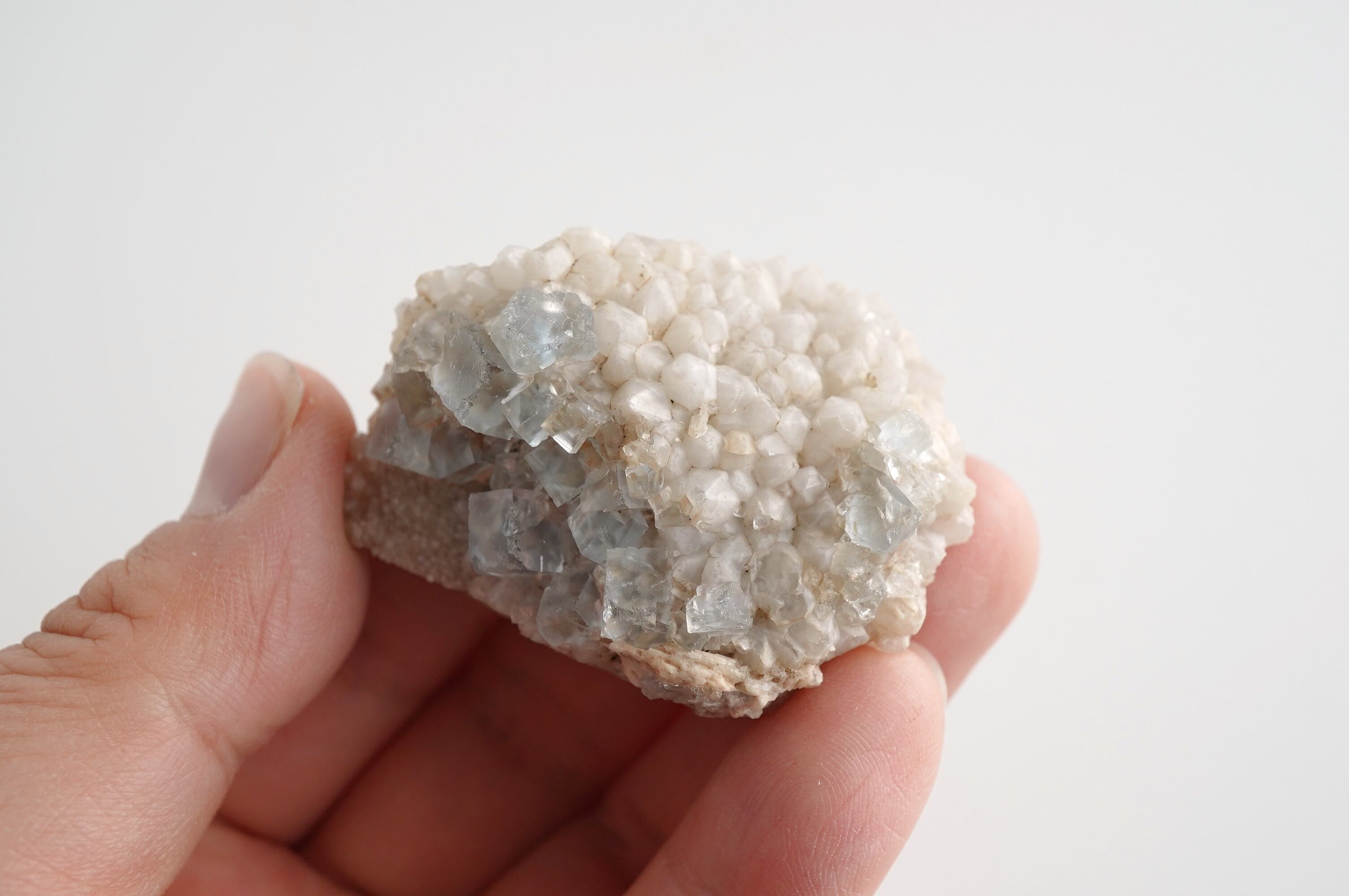 とっても淡いブルーのフローライトにとげとげで白い乳白色の水晶が共生した個体です。