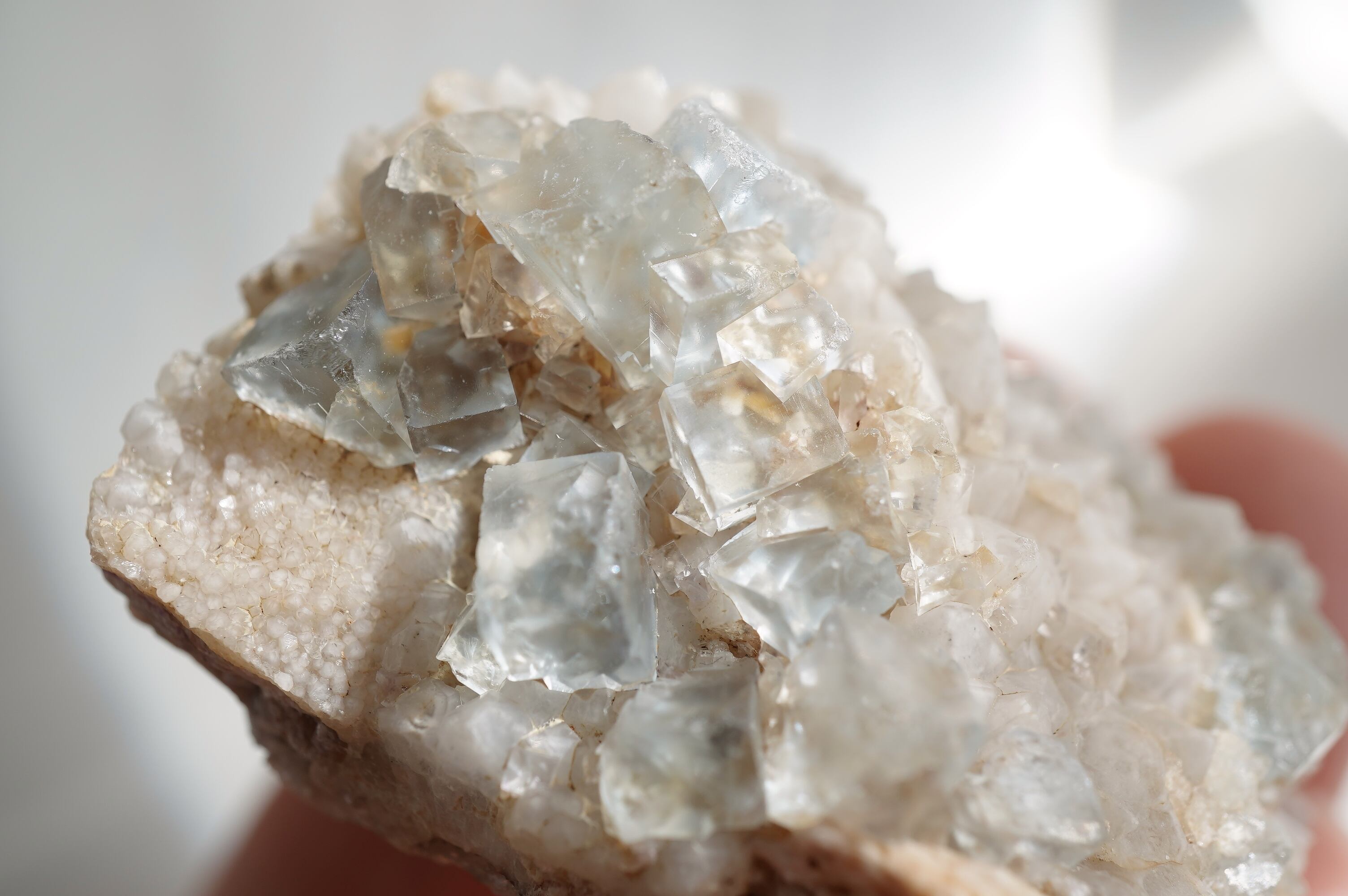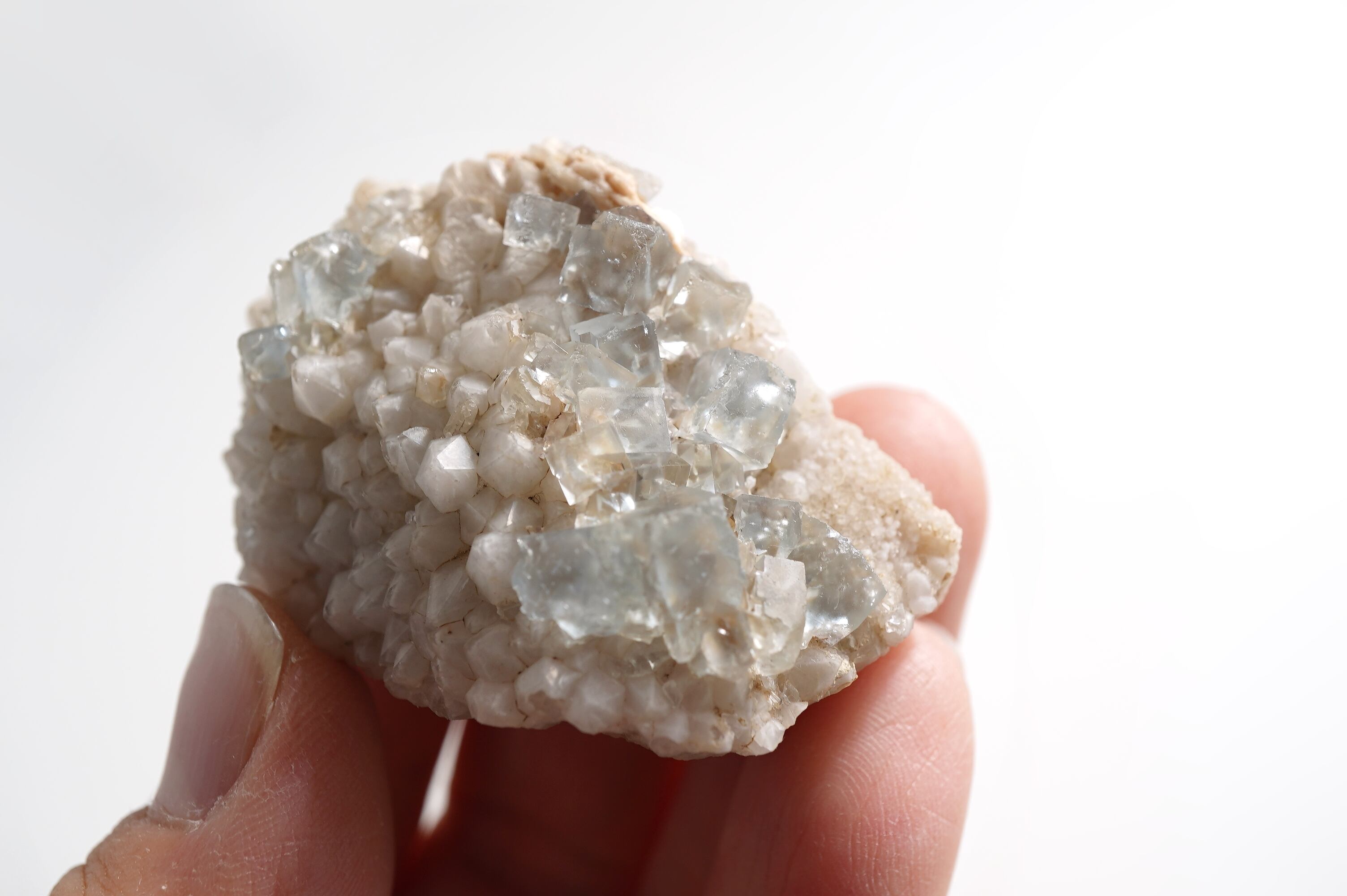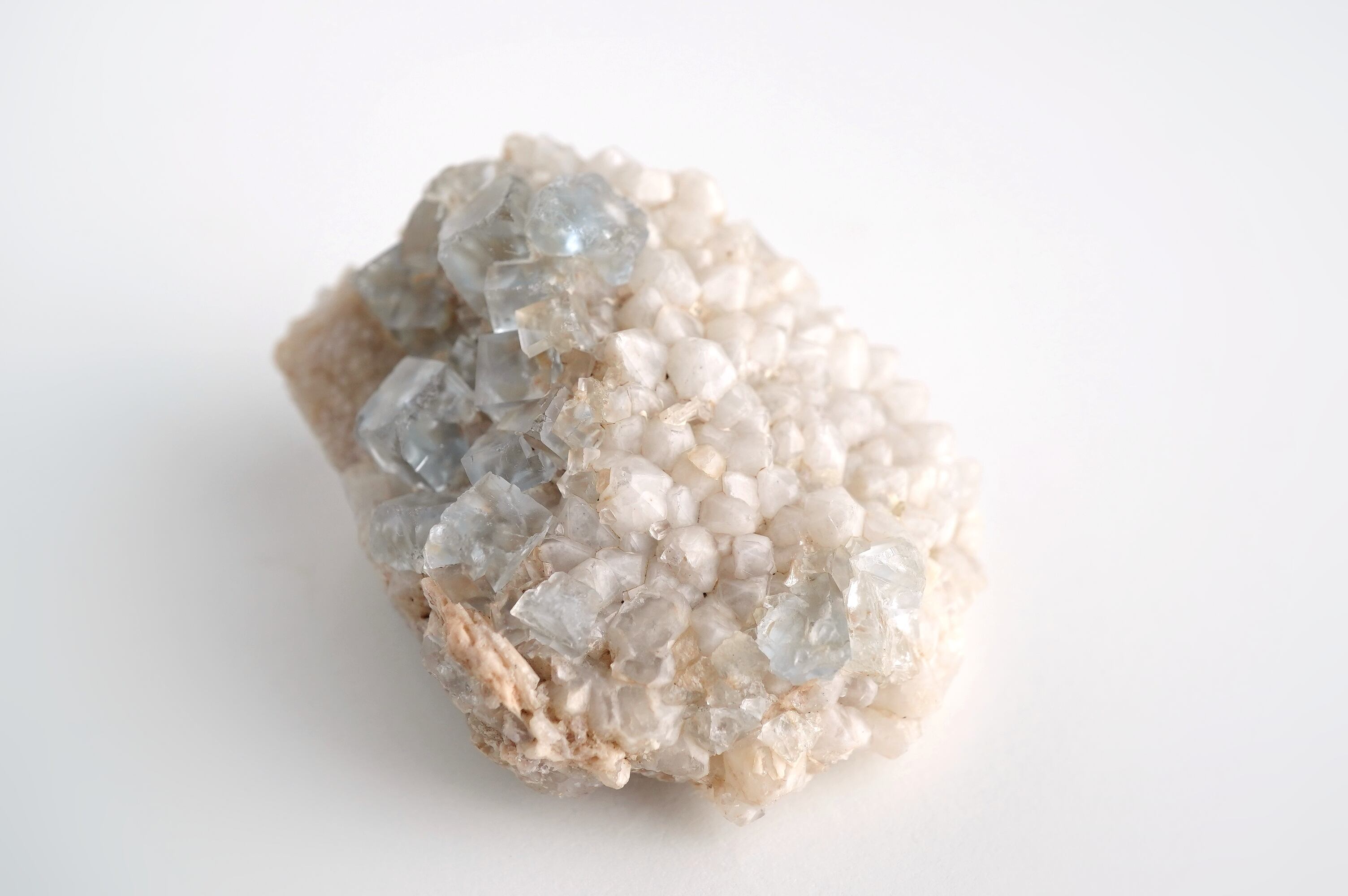 とっても淡いブルーのフローライトにとげとげで白い乳白色の水晶が共生した個体です。